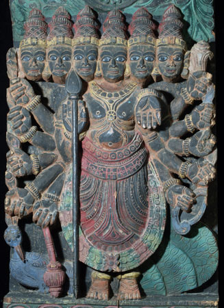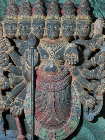 This is a striking and large Indian multi-headed deity. It is deeply carved, and (unlike the majority of this type of piece) retains the majority of its polychrome. I generally do not buy this kind of piece, but I was at an auction house and saw it across the room and found it simply mesmerizing, and bid a significant amount for it. It was probably originally part of a ceremonial cart which was used during religious processions. It is 26.5 inches tall by 14 inches wide by 3.5 inches deep and fairly heavy for a wooden object. Note the expressive faces, the wonderful bird at his feet, and the overall superb composition of the piece. This is the best piece of its type I have ever had the pleasure of owning.