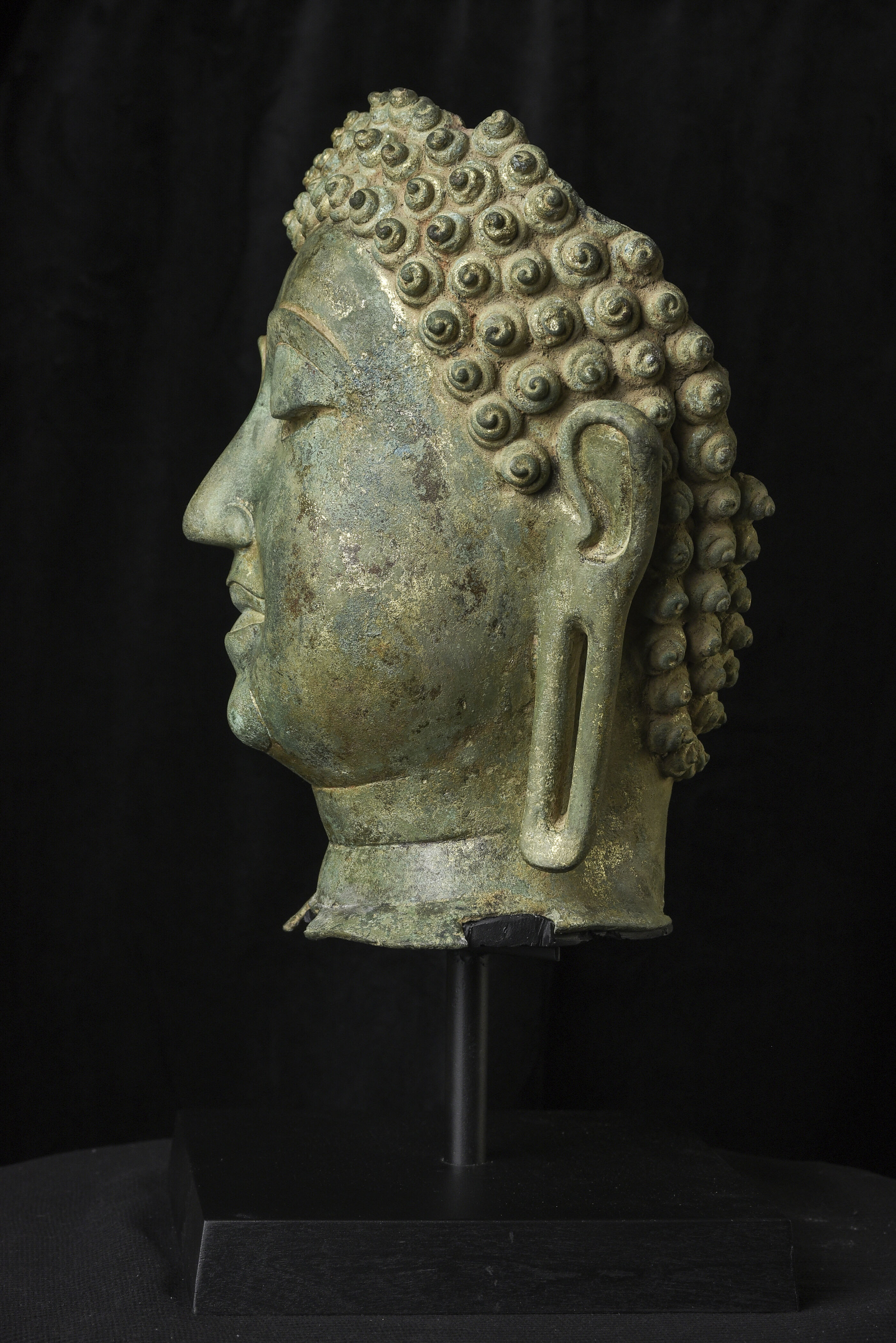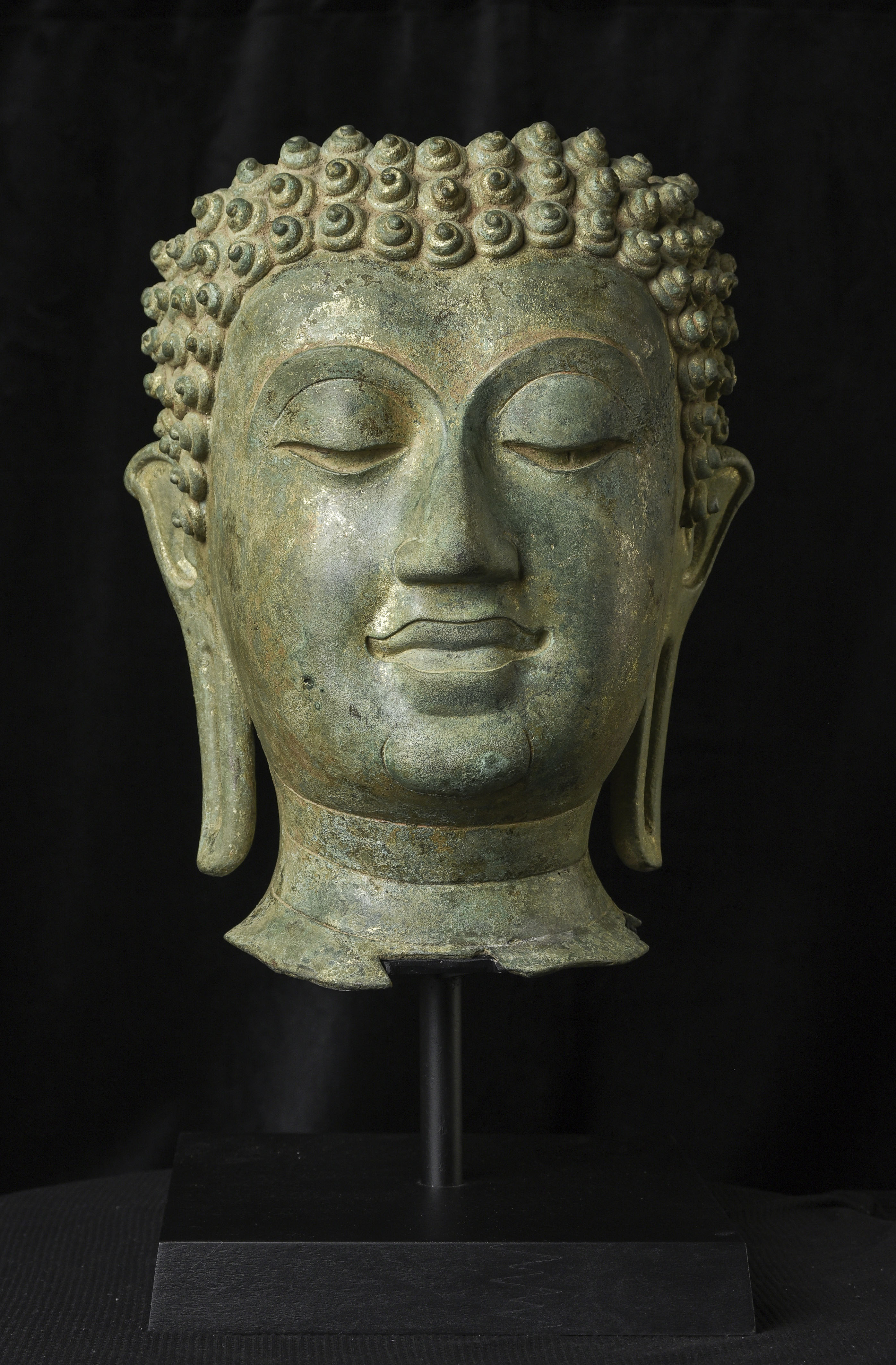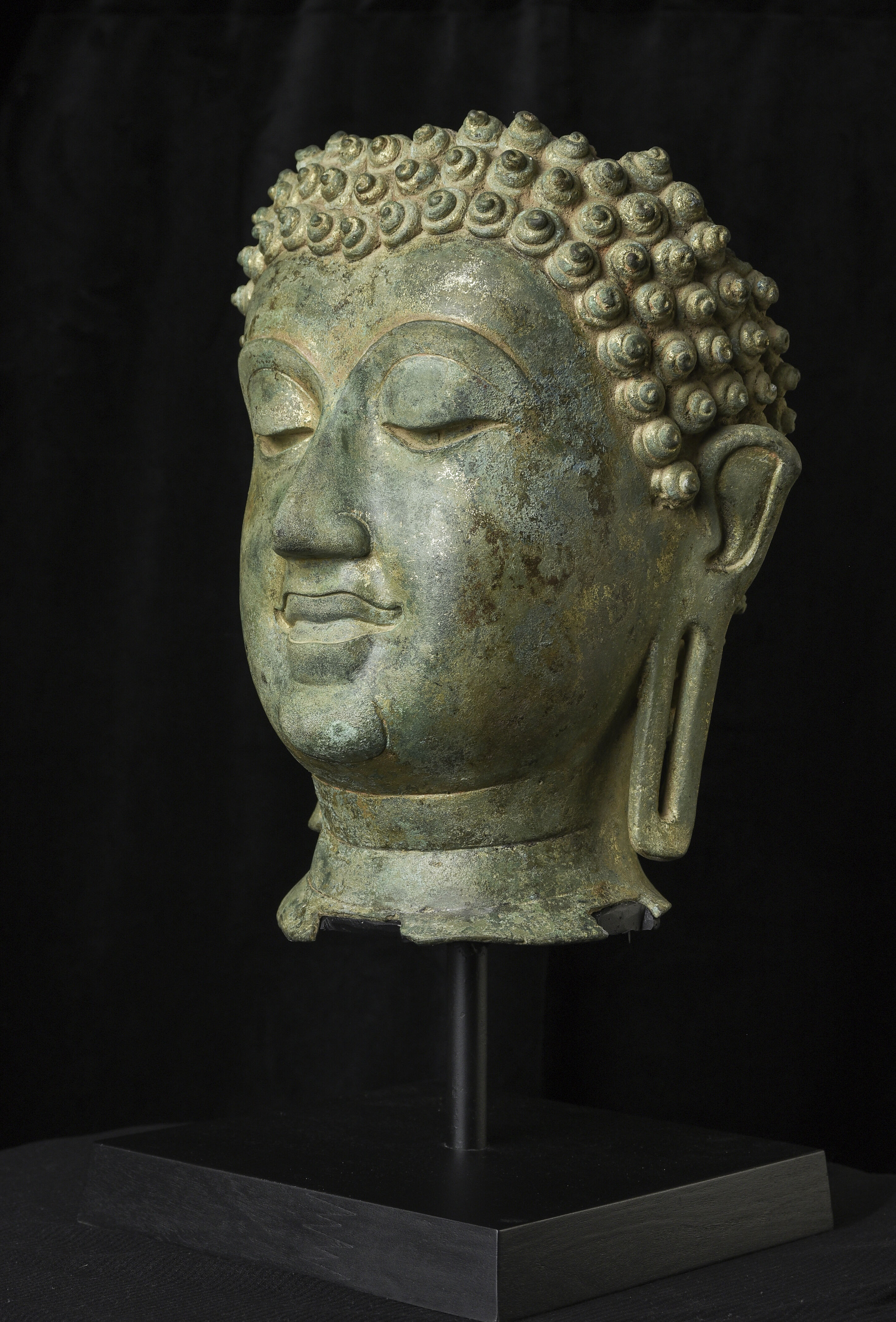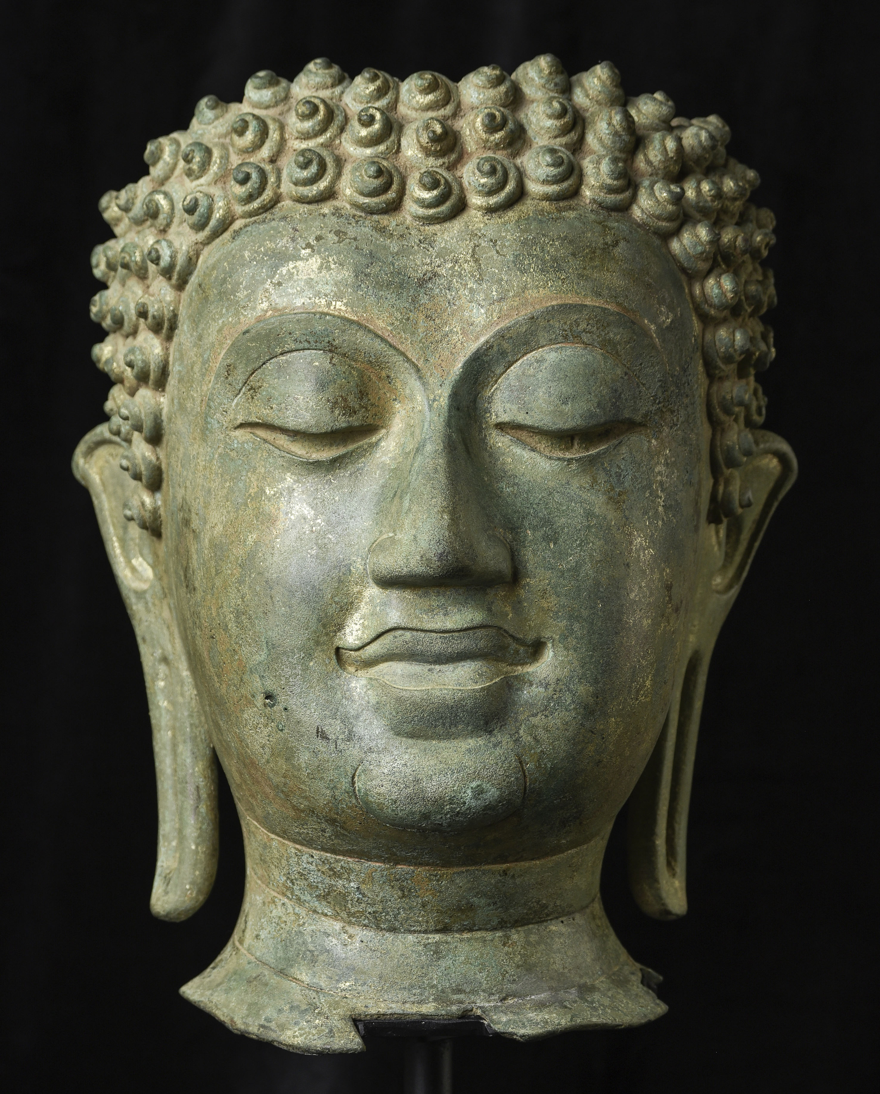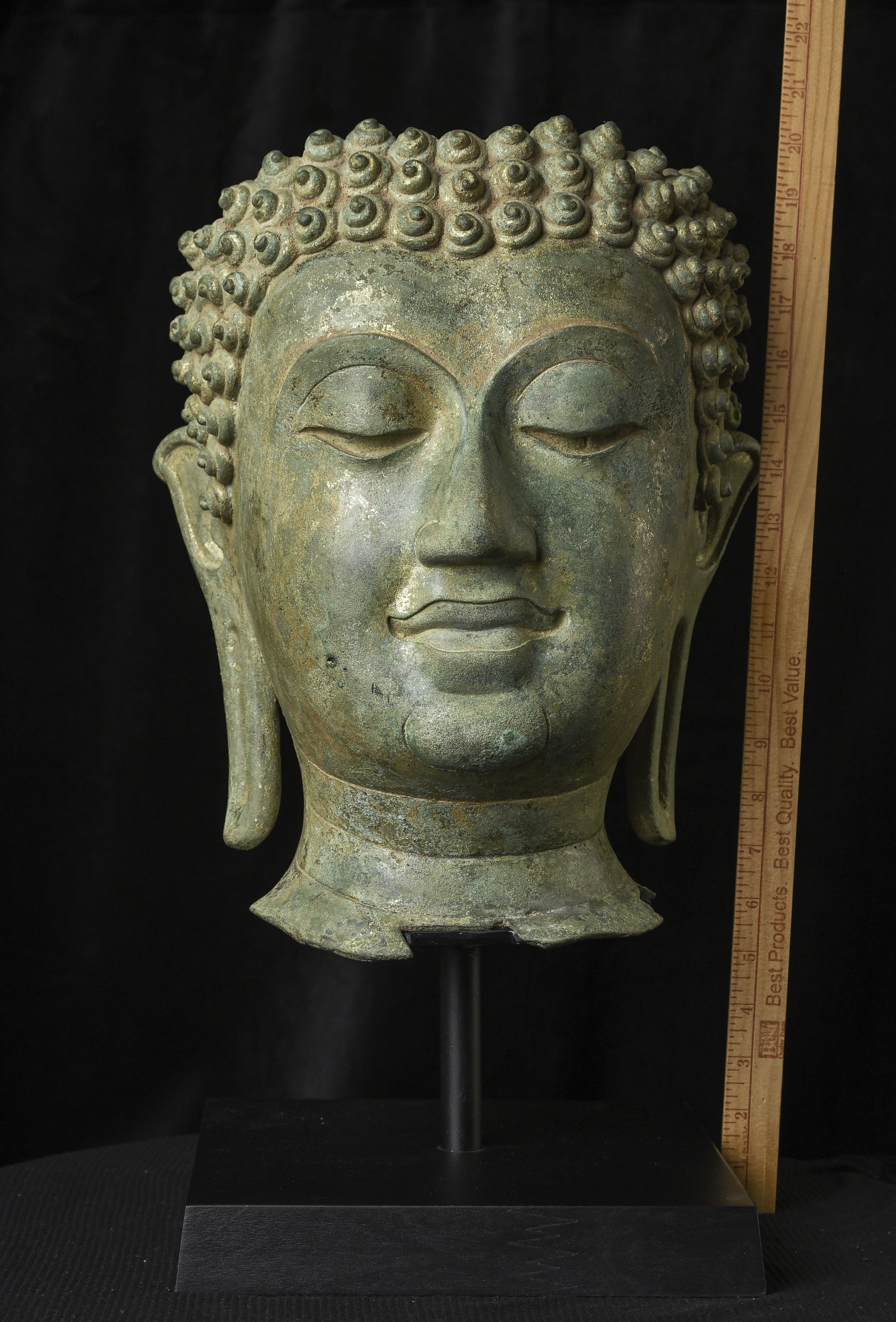 15thC Northern Sukhothai Walking Buddha Head-Museum quality. Near monumental- the full figure would have stood between 7 and 8 feet tall. Very large bronze Buddhas, Especially those of high quality, had to be cast in many parts in order to get the level of detail desired. It was also needed from a sheer logistical standpoint. This piece had the head cast in two parts. This part does not include the top of the head or the finial. It is not that they were broken off, but that they were a completely different section. This part alone for the bronze only is 14 and 1/2 in tall and 11 in wide at the ears. On its custom stand, it stands 20 in tall. It displays well anywhere, but it displays best when sitting in a high place above eye level. The way you can tell that this is the head of a walking Buddha is that the head and the face are not completely symmetrical. You can see this if you look at the eyes and you will notice that they are not completely even and that they are not exactly the same distance from the nose or the sides of the head. This Buddha used to sit above my fireplace looking straight ahead. I absolutely loved it and treasured it as one of the best in my collection, but something looked "off". I took out a tape measure and measured the distance of the different facial features to different Setpoints-I discovered that the head was meant to be set at a slight angle-like that of a walking Buddha. Stylistically I believe it is a form closely related to Sukhothai (actually a smaller kingdom not too far away that was founded by the last king of Sukhothai -called Kamphen Pet. The Kamphen Pet style Is a little more masculine and a little less stylized, But otherwise very similar to the late Sukhothai. -This is the best you will ever find, and as good as what you will find in the best auction houses or museums. It is one of the best pieces I have had in my Personal Collection or on my website ever. At this point, I've said enough and I'll let the photos speak for themselves.