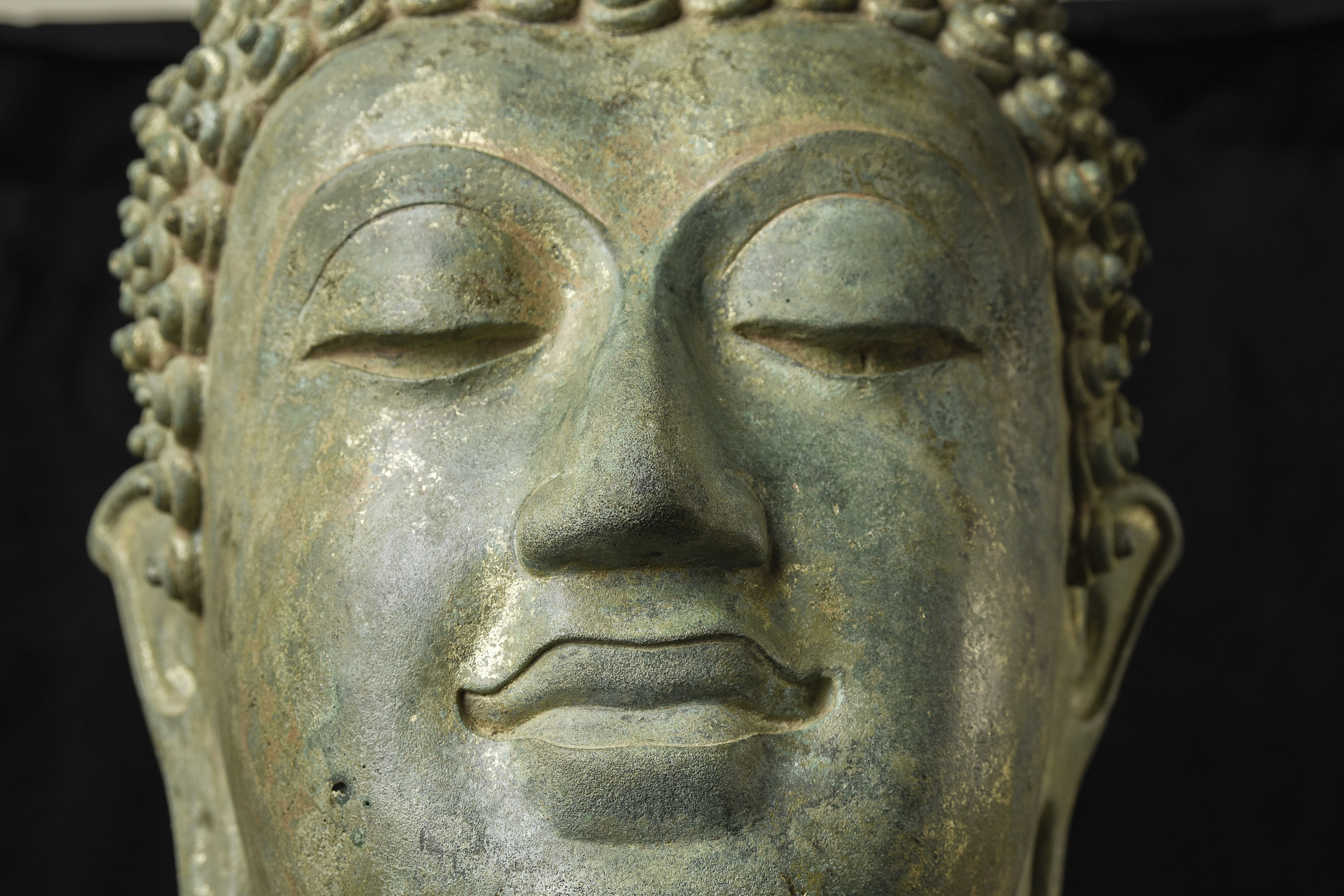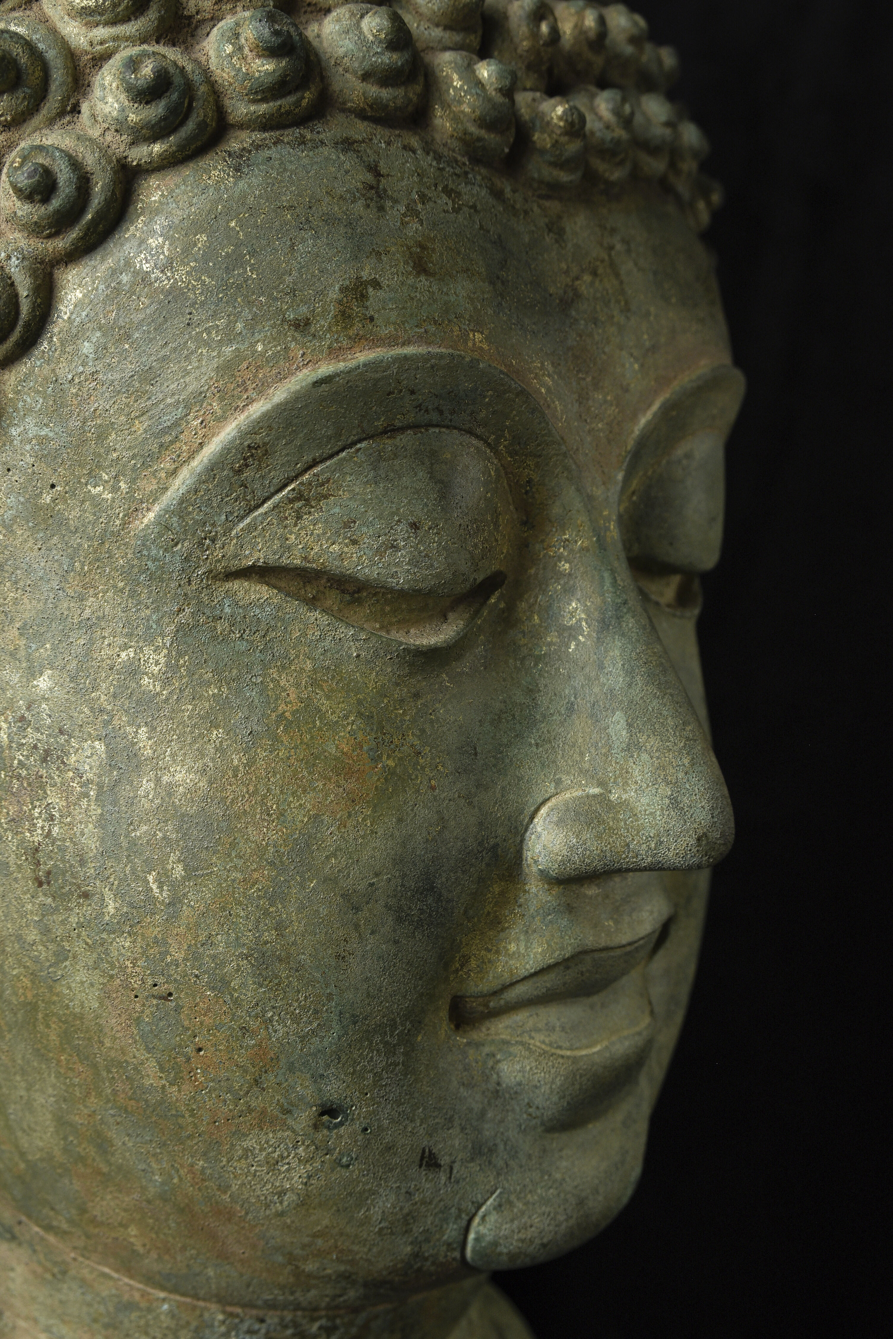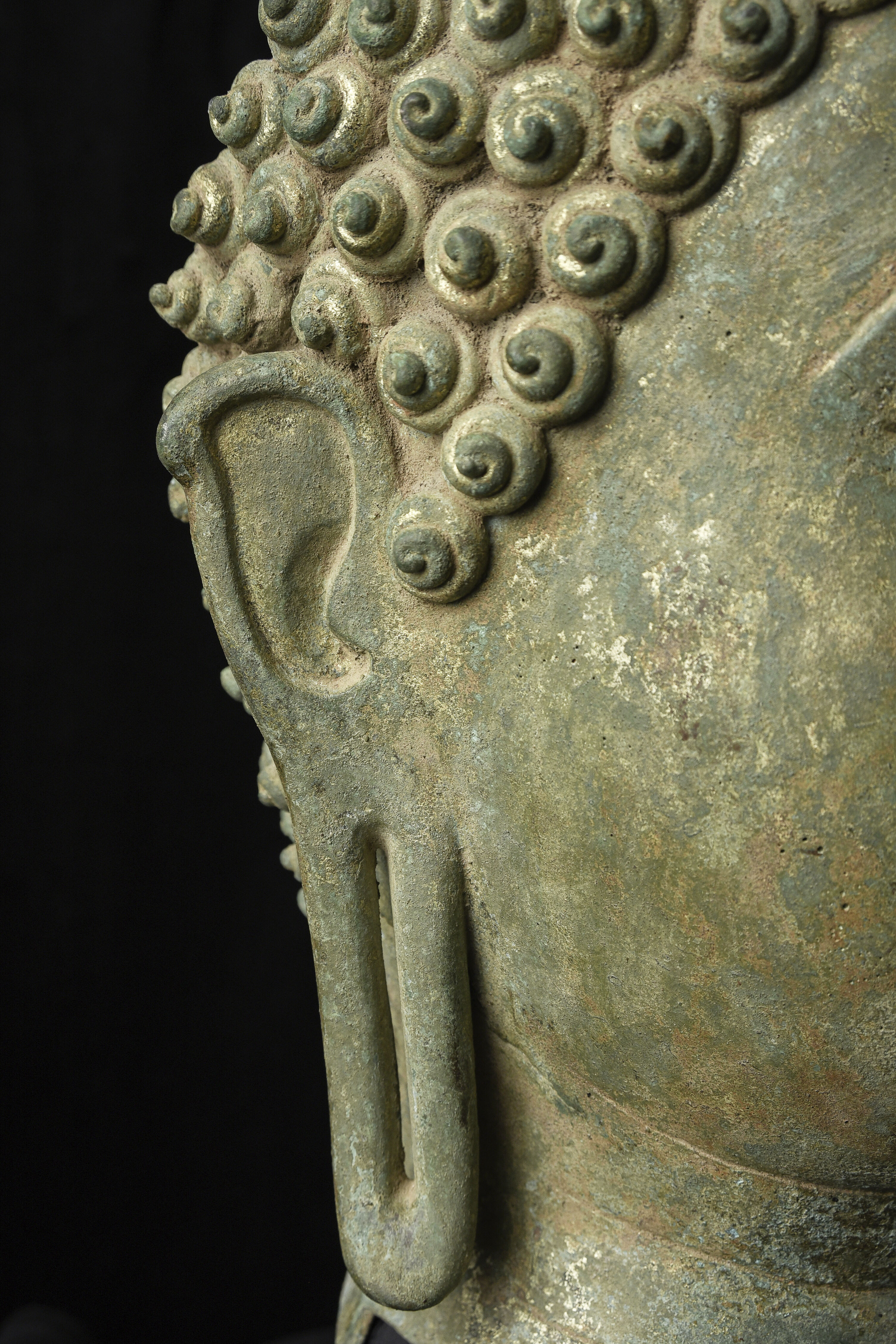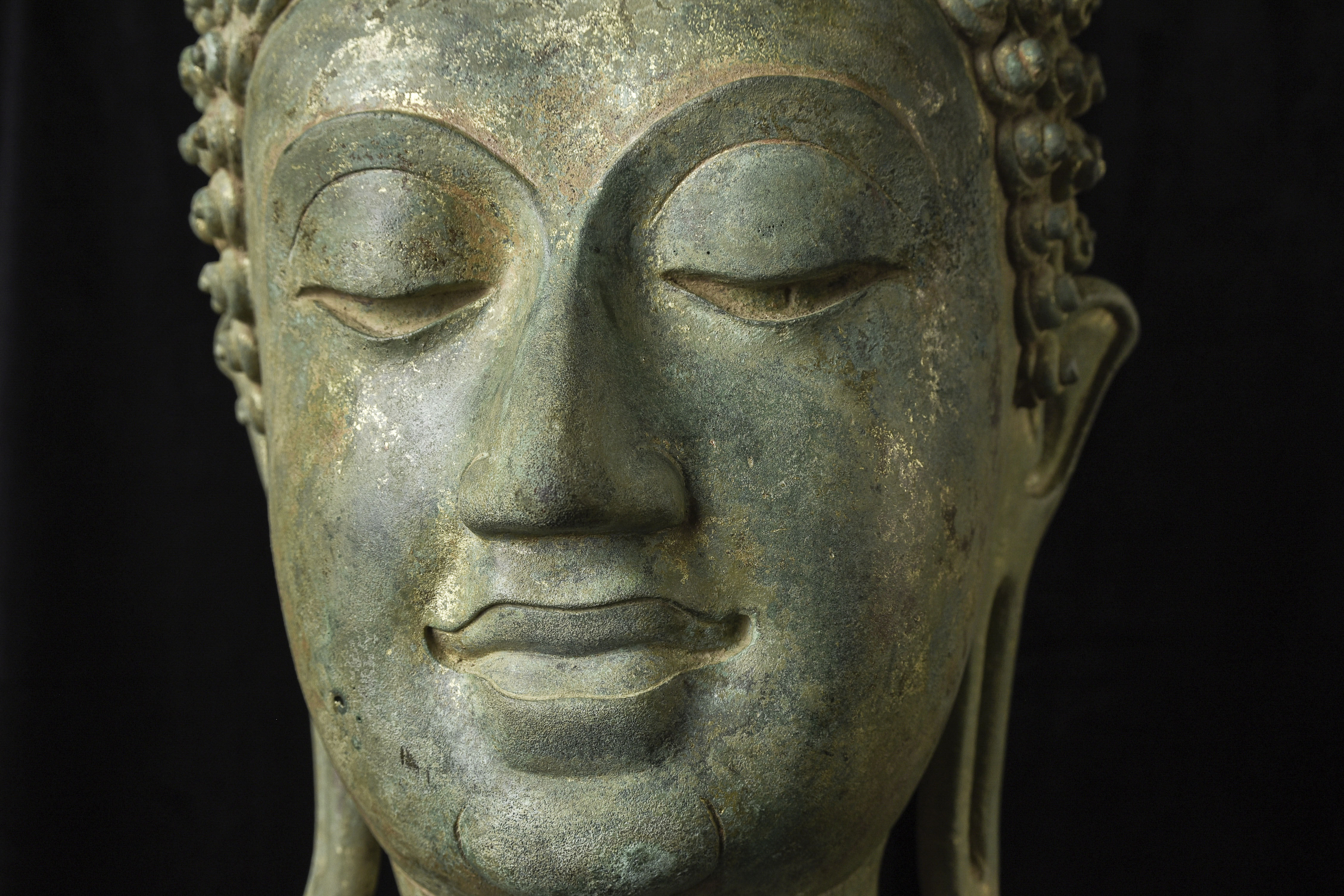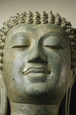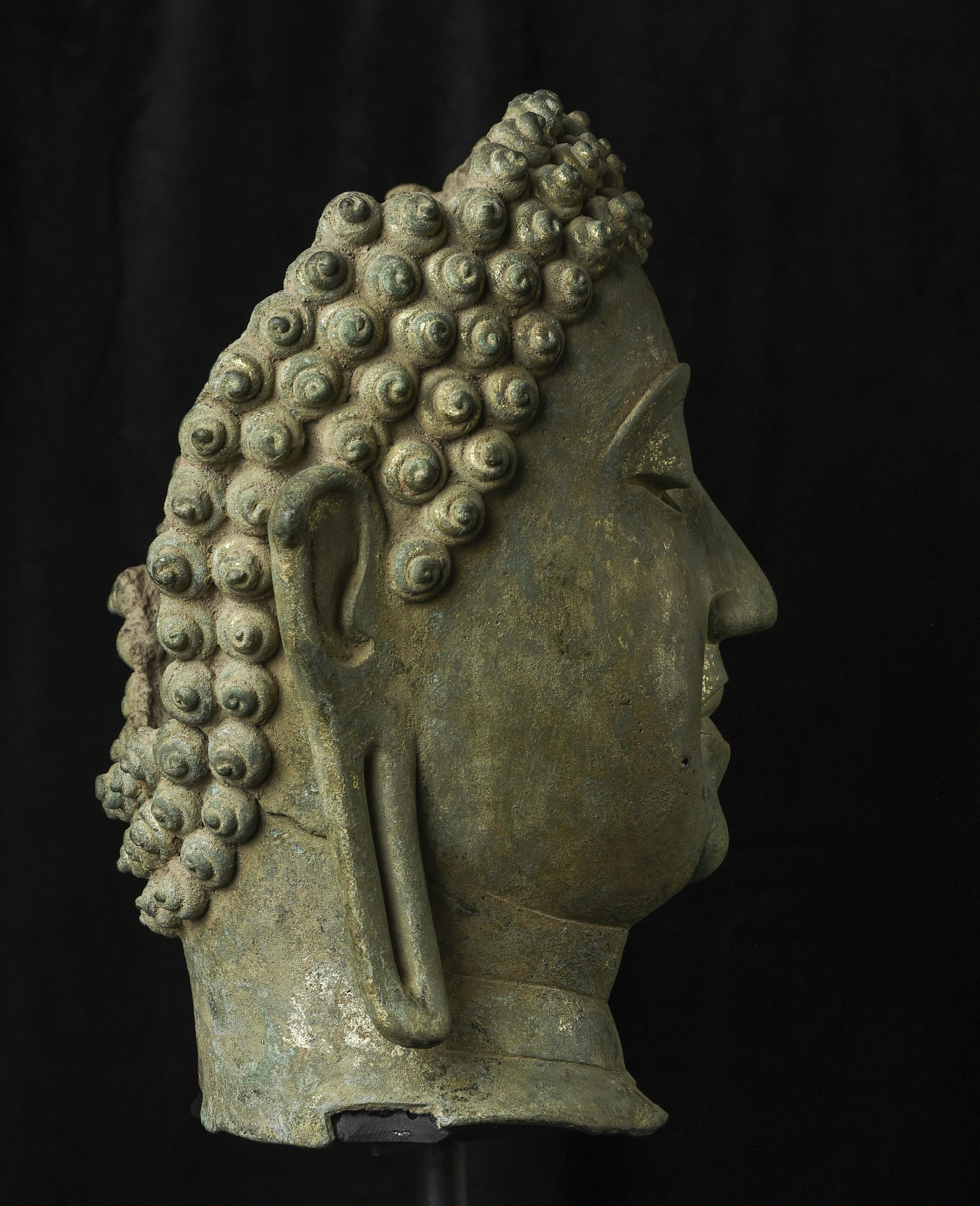 15thC Northern Sukhothai Walking Buddha Head-Museum quality. Near monumental- the full figure would have stood between 7 and 8 feet tall. Very large bronze Buddhas, Especially those of high quality, had to be cast in many parts in order to get the level of detail desired. It was also needed from a sheer logistical standpoint. This piece had the head cast in two parts. This part does not include the top of the head or the finial. It is not that they were broken off, but that they were a completely different section. This part alone for the bronze only is 14 and 1/2 in tall and 11 in wide at the ears. On its custom stand, it stands 20 in tall. It displays well anywhere, but it displays best when sitting in a high place above eye level. The way you can tell that this is the head of a walking Buddha is that the head and the face are not completely symmetrical. You can see this if you look at the eyes and you will notice that they are not completely even and that they are not exactly the same distance from the nose or the sides of the head. This Buddha used to sit above my fireplace looking straight ahead. I absolutely loved it and treasured it as one of the best in my collection, but something looked "off". I took out a tape measure and measured the distance of the different facial features to different Setpoints-I discovered that the head was meant to be set at a slight angle-like that of a walking Buddha. Stylistically I believe it is a form closely related to Sukhothai (actually a smaller kingdom not too far away that was founded by the last king of Sukhothai -called Kamphen Pet. The Kamphen Pet style Is a little more masculine and a little less stylized, But otherwise very similar to the late Sukhothai. -This is the best you will ever find, and as good as what you will find in the best auction houses or museums. It is one of the best pieces I have had in my Personal Collection or on my website ever. At this point, I've said enough and I'll let the photos speak for themselves.