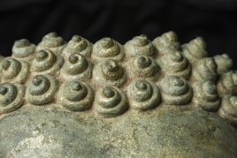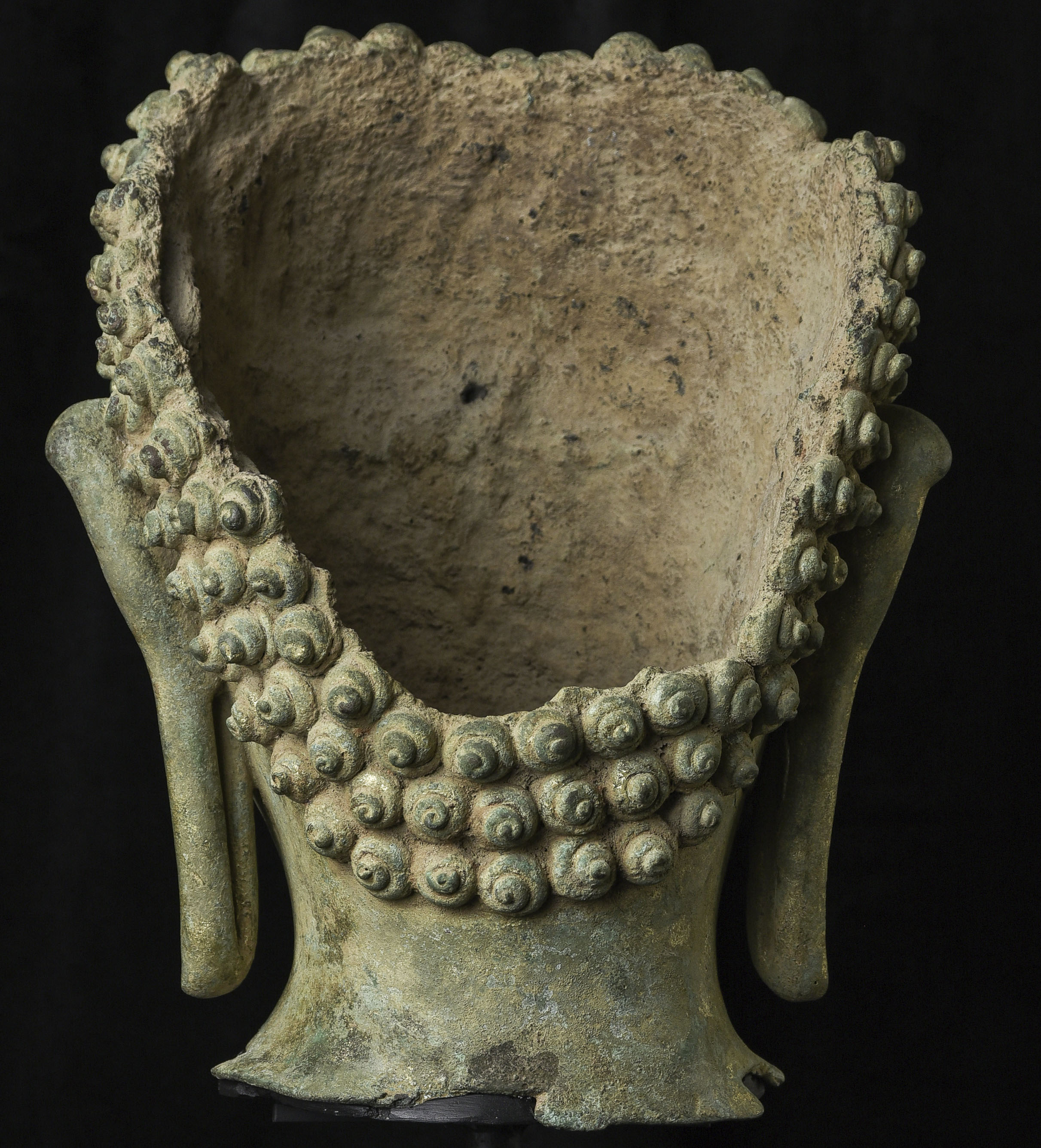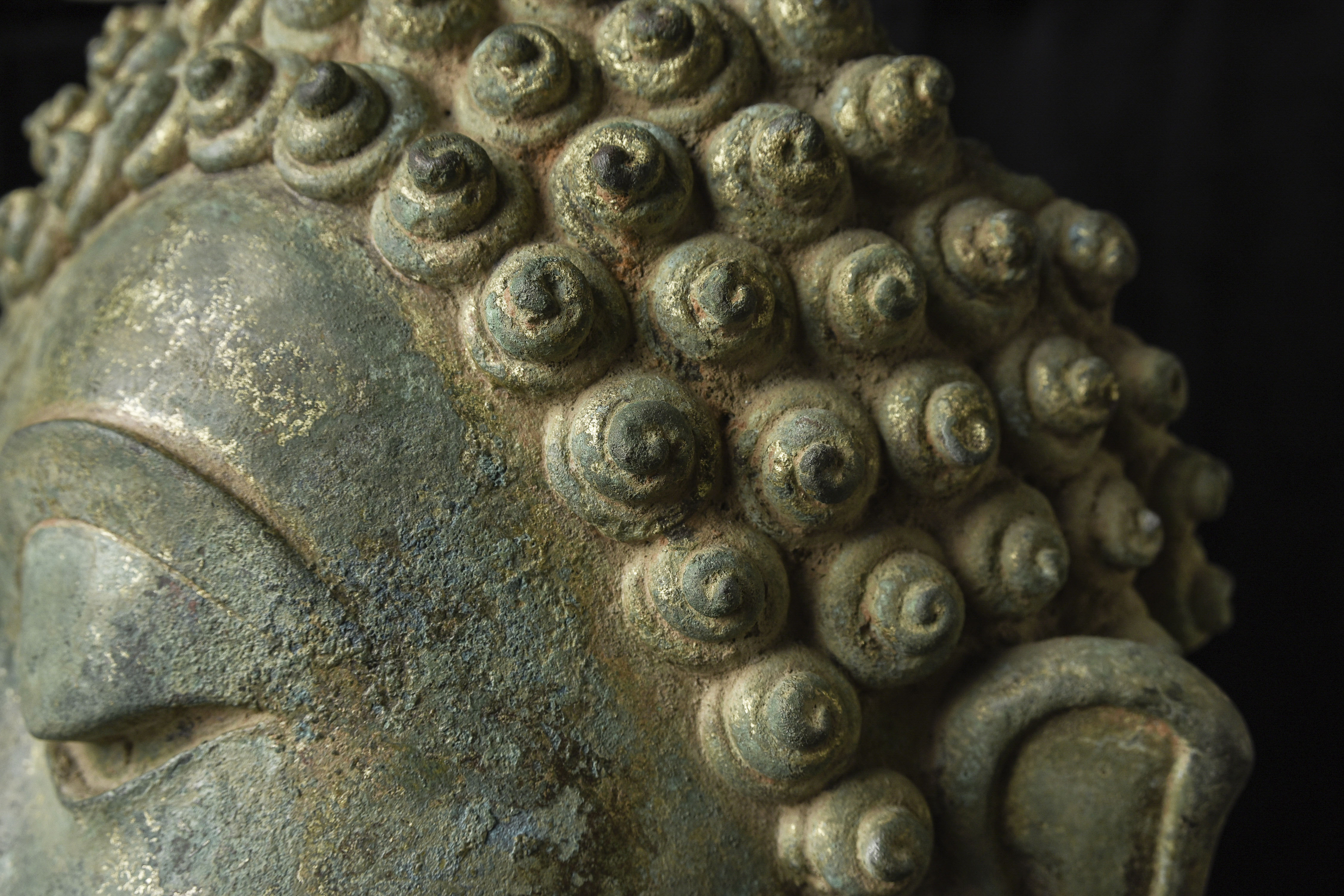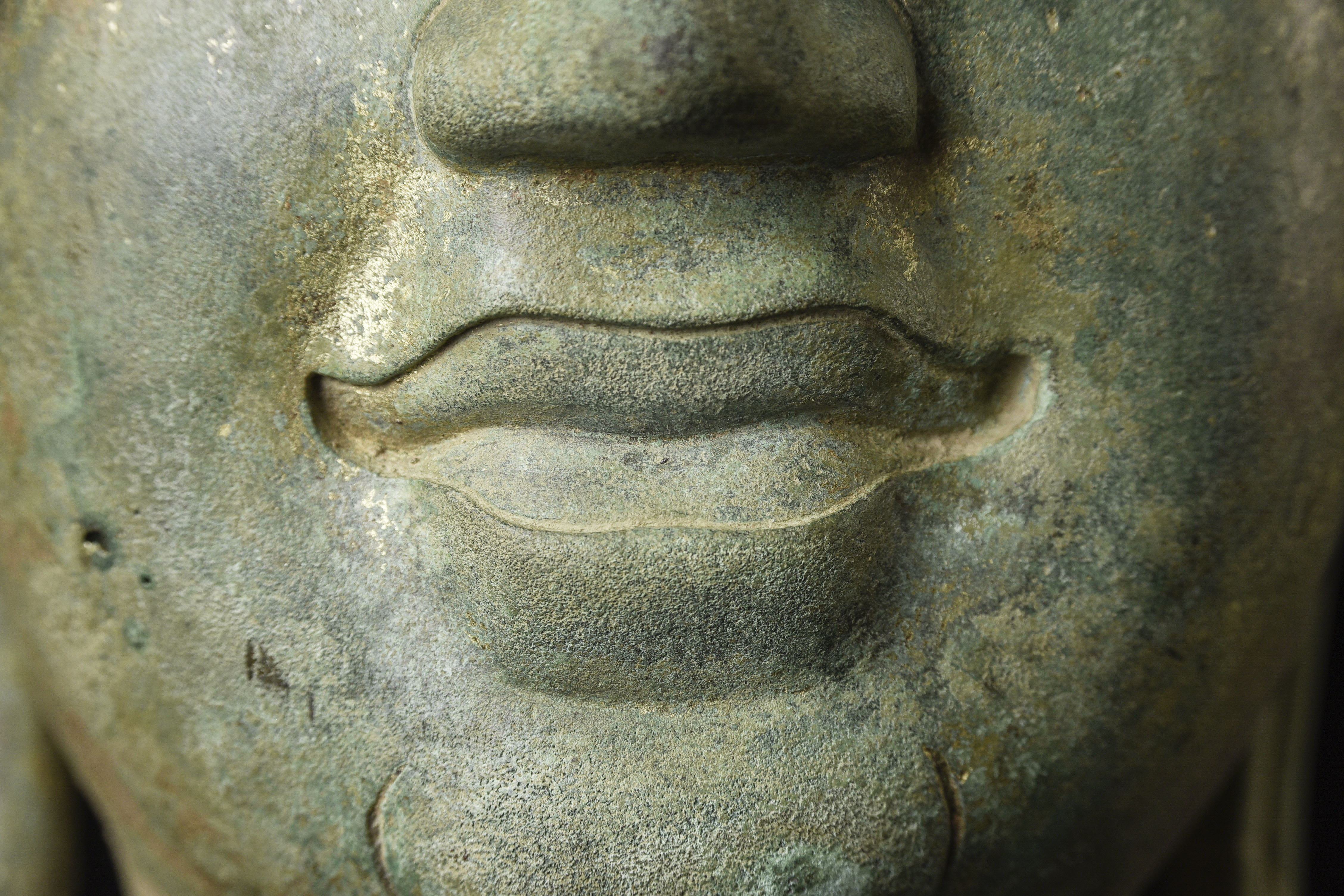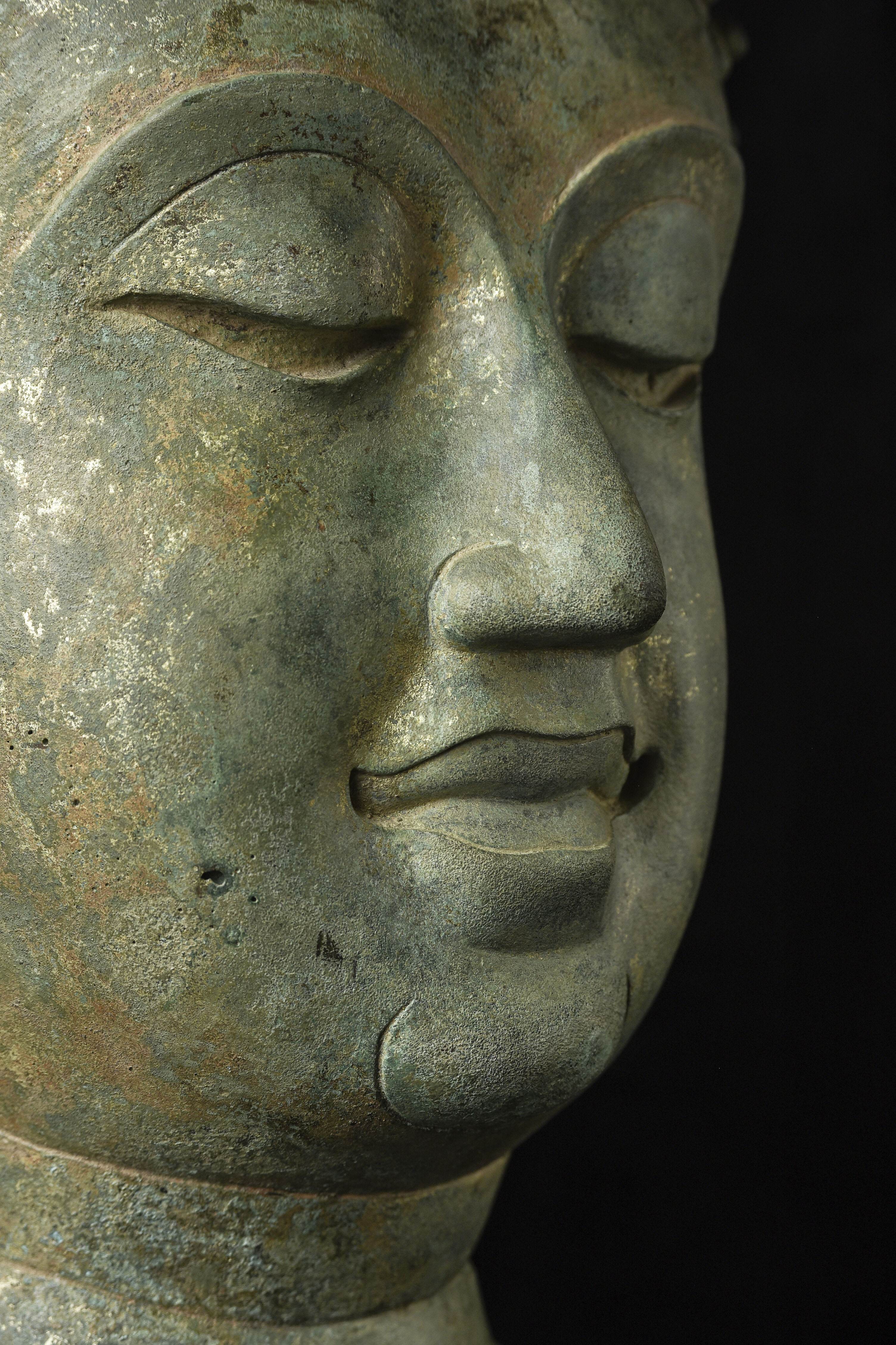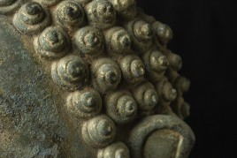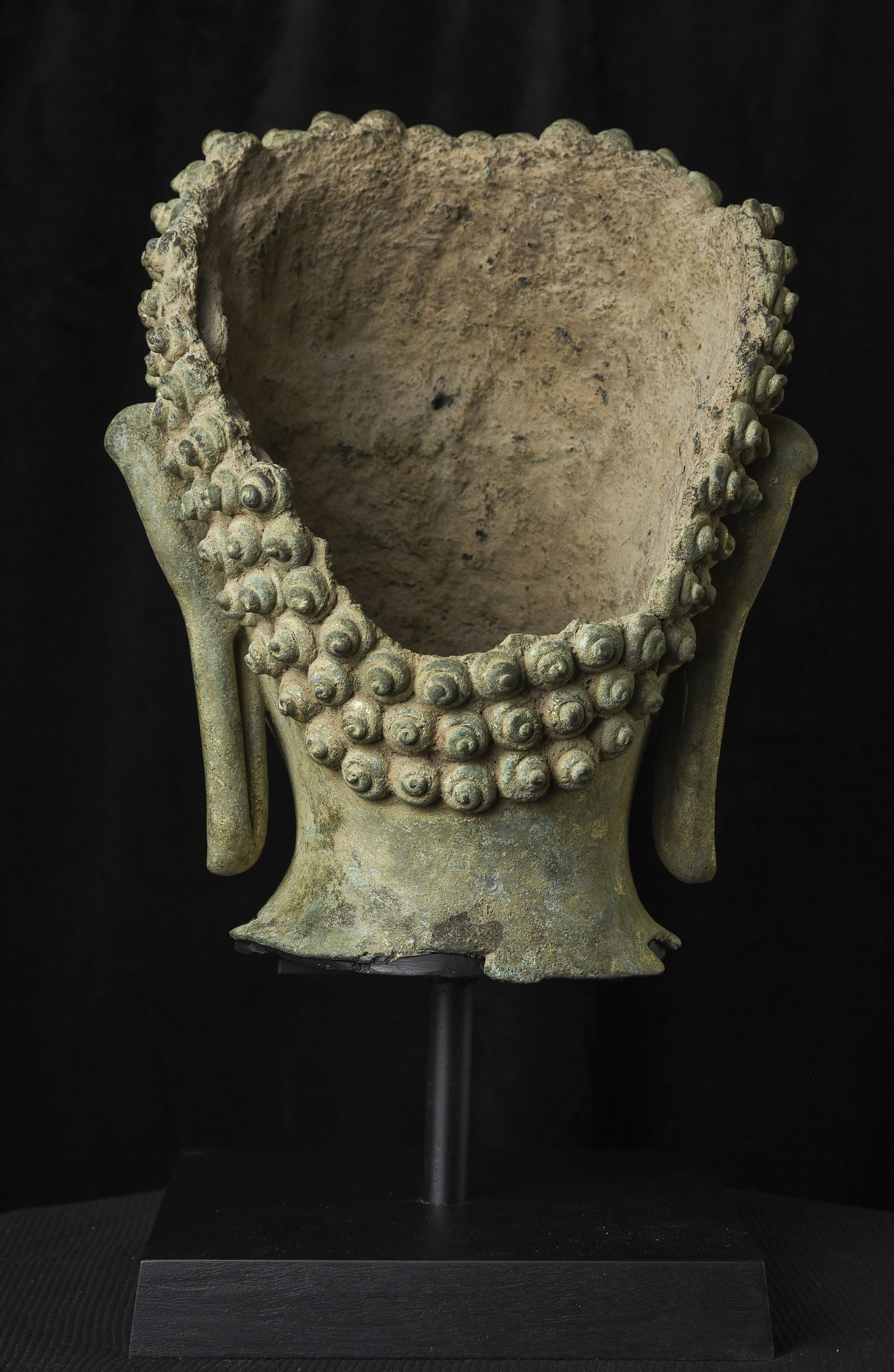 15thC Northern Sukhothai Walking Buddha Head-Museum quality. Near monumental- the full figure would have stood between 7 and 8 feet tall. Very large bronze Buddhas, Especially those of high quality, had to be cast in many parts in order to get the level of detail desired. It was also needed from a sheer logistical standpoint. This piece had the head cast in two parts. This part does not include the top of the head or the finial. It is not that they were broken off, but that they were a completely different section. This part alone for the bronze only is 14 and 1/2 in tall and 11 in wide at the ears. On its custom stand, it stands 20 in tall. It displays well anywhere, but it displays best when sitting in a high place above eye level. The way you can tell that this is the head of a walking Buddha is that the head and the face are not completely symmetrical. You can see this if you look at the eyes and you will notice that they are not completely even and that they are not exactly the same distance from the nose or the sides of the head. This Buddha used to sit above my fireplace looking straight ahead. I absolutely loved it and treasured it as one of the best in my collection, but something looked "off". I took out a tape measure and measured the distance of the different facial features to different Setpoints-I discovered that the head was meant to be set at a slight angle-like that of a walking Buddha. Stylistically I believe it is a form closely related to Sukhothai (actually a smaller kingdom not too far away that was founded by the last king of Sukhothai -called Kamphen Pet. The Kamphen Pet style Is a little more masculine and a little less stylized, But otherwise very similar to the late Sukhothai. -This is the best you will ever find, and as good as what you will find in the best auction houses or museums. It is one of the best pieces I have had in my Personal Collection or on my website ever. At this point, I've said enough and I'll let the photos speak for themselves.