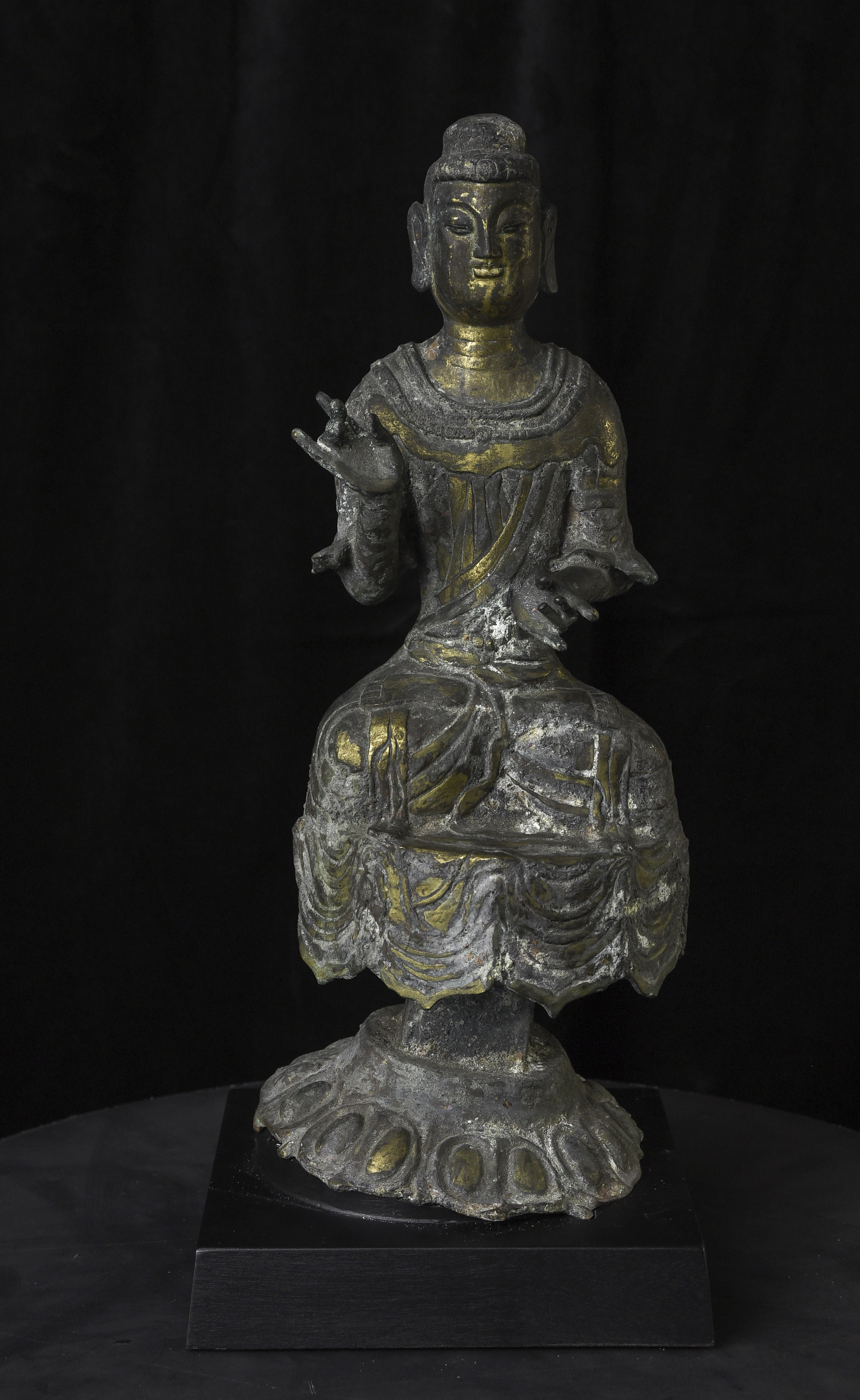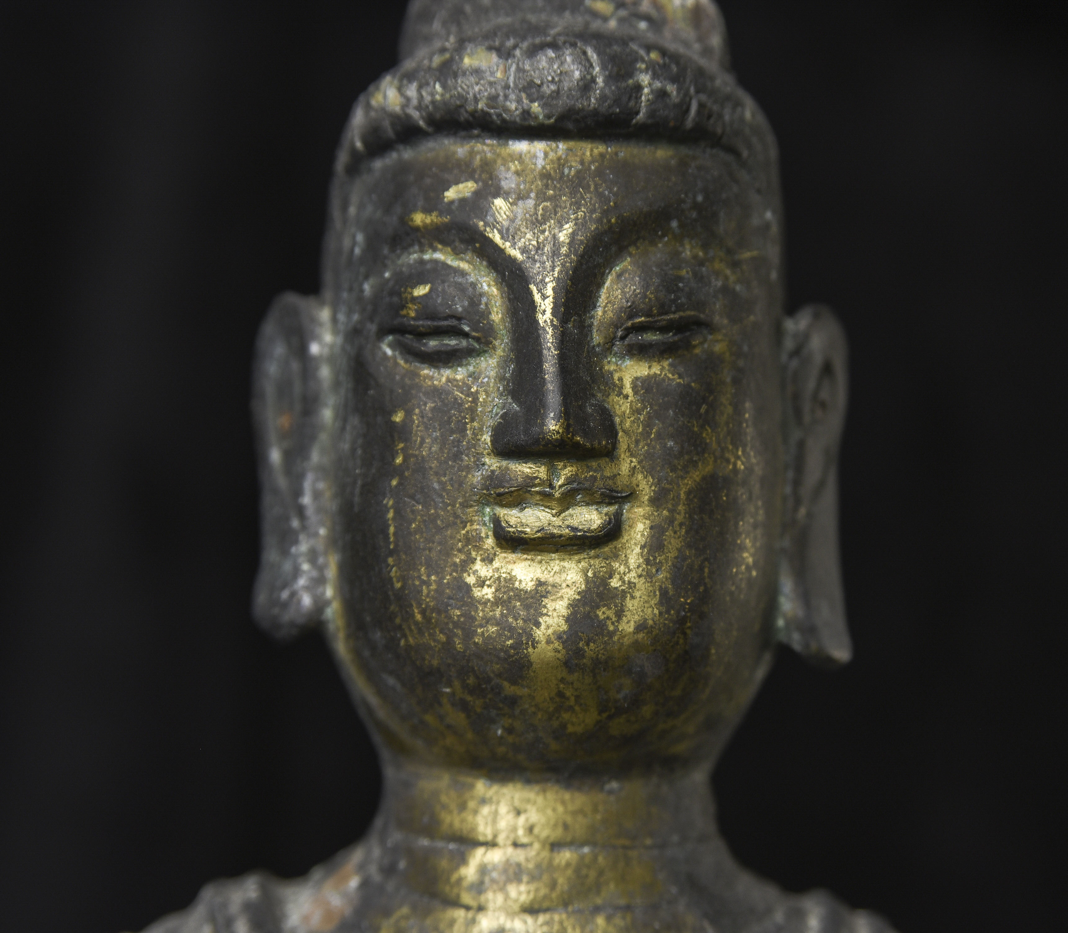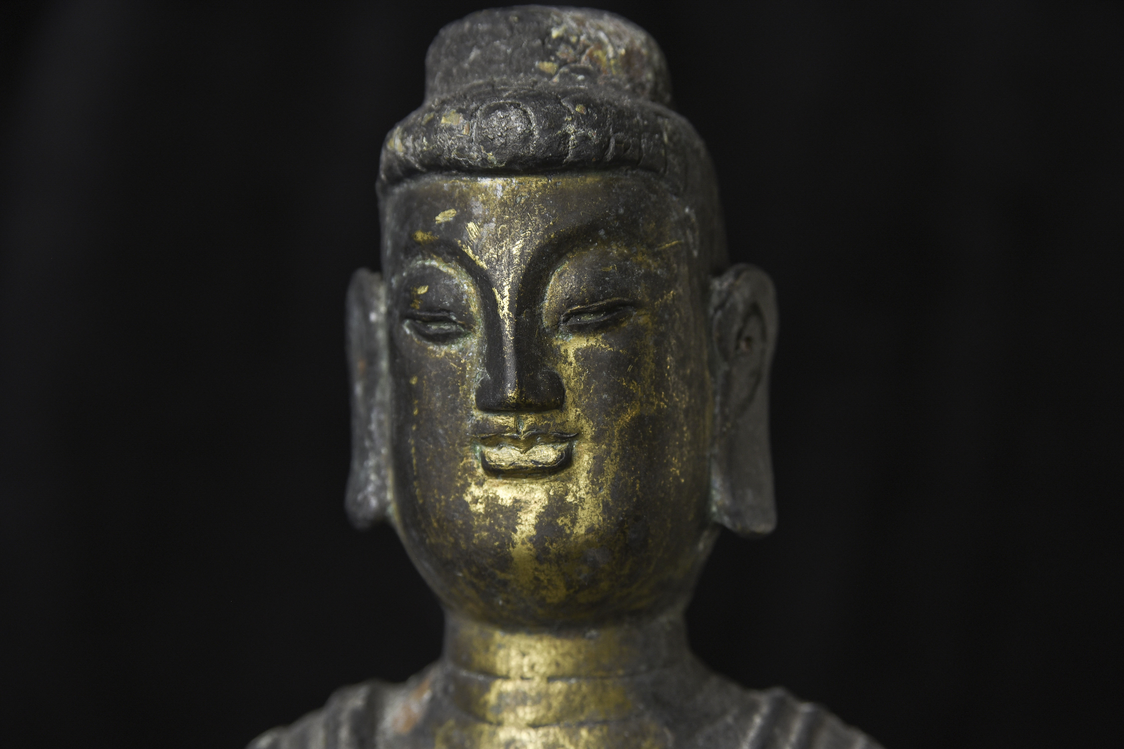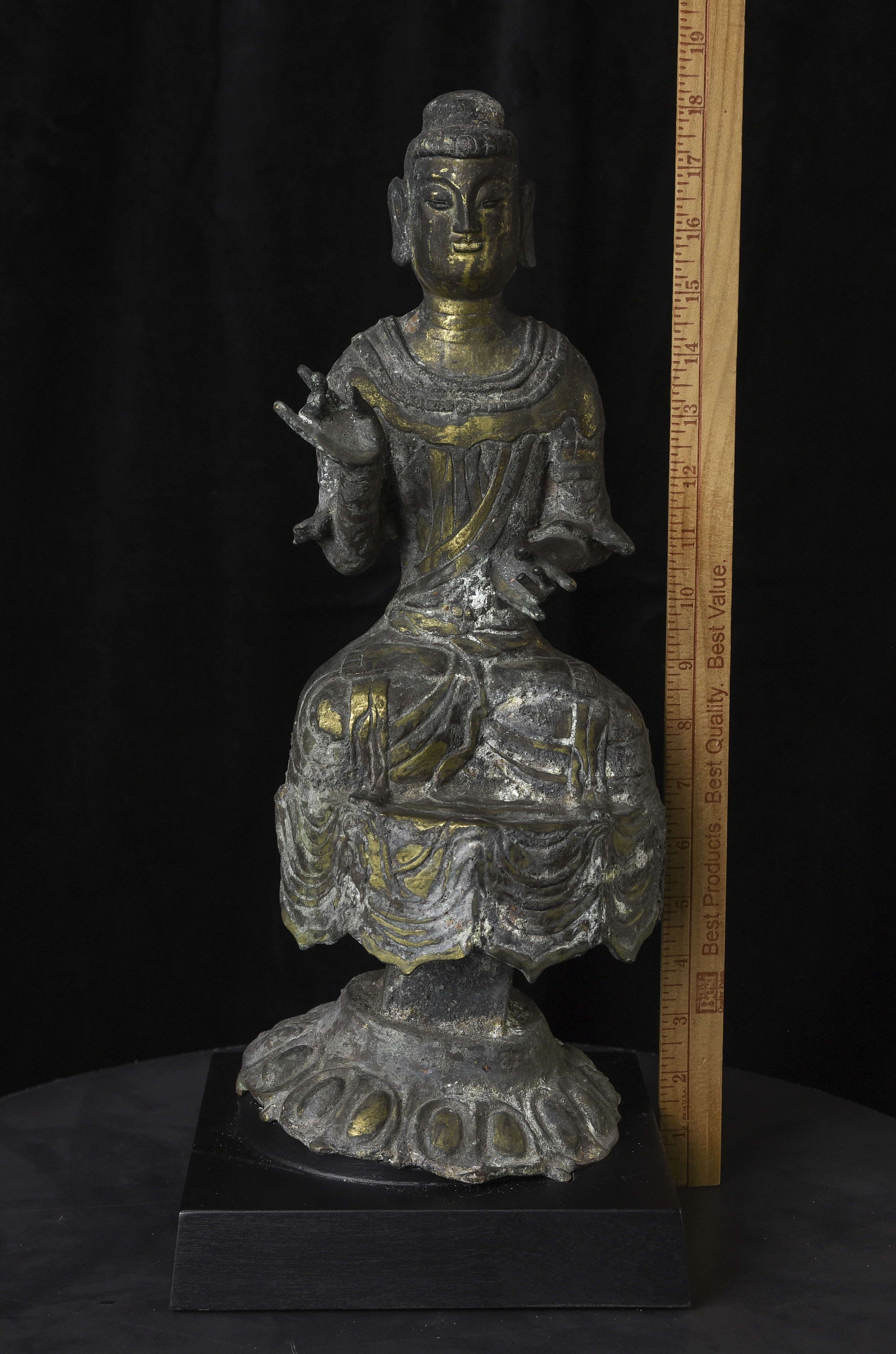 6-9th Century (plus or minus a century or two) Silla Dynasty Buddha. Extremely large for its type at 16.5 INCHES tall. Superb face. Korean national treasure number 79 (from 709 A.D.) has the same form, including the shape of the base, the type of robes, and the bump on top of the head. That one is a classic, extremely fine gilded bronze with an intricate back plate, so at first sight, it looks quite different than this one. Still, when you spend time looking at the two next to each other, you can see how someone during that time period, With deep devotion and love in their heart, but without extensive training in the craft of casting bronze statues, could have easily made this sculpture. It has a Gandharan look to the robes- especially in the way they close around the neck. It is also possible that it is a Silk Road piece that has combined elements of a number of cultures. The style suggests dating as early as the 6th, but the large size and provincial sculpting make it more likely to be late in the Silla Dynasty or possibly afterward. The condition is excellent for such a large early piece. The only issue is that the post that connects the base to the bottom of the base has slowly bent over to the left side I had a custom base made that allows it to sit straight, as you can see in the photos. I did not believe it was a good idea to try and correct this. While the underside looks quite solid and stable, I would not try and mess with it as it is probably brittle given that it likely is 1,000+ years old. It is the incredibly gentle, joy-filled face, the very large size at 16.5 inches tall, and the extremely early dating for a Korean bronze figure that makes this such an extreme rarity for a Korean Bronze Sculpture. Search the internet for comps and you will see what I mean! There is some possibility it is a few hundred years later due to the very large size and provincial nature(but no more than 13/14th at the absolute latest) as a revival piece, though my feeling is that it can be attributed to an earlier date. I've not seen another like it myself. Go onto the internet and try to find any comps-you will discover how rare and special this Buddha is.