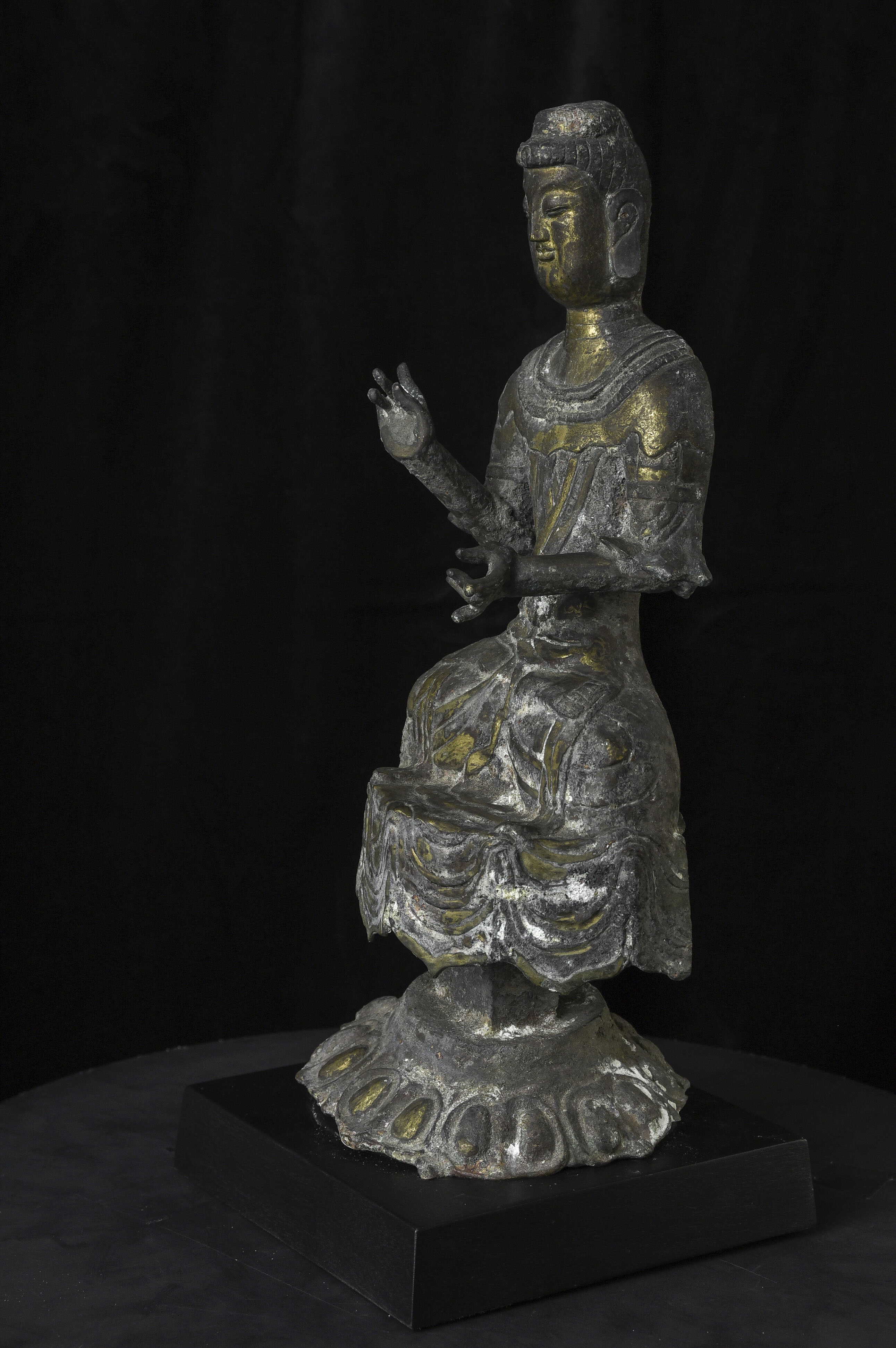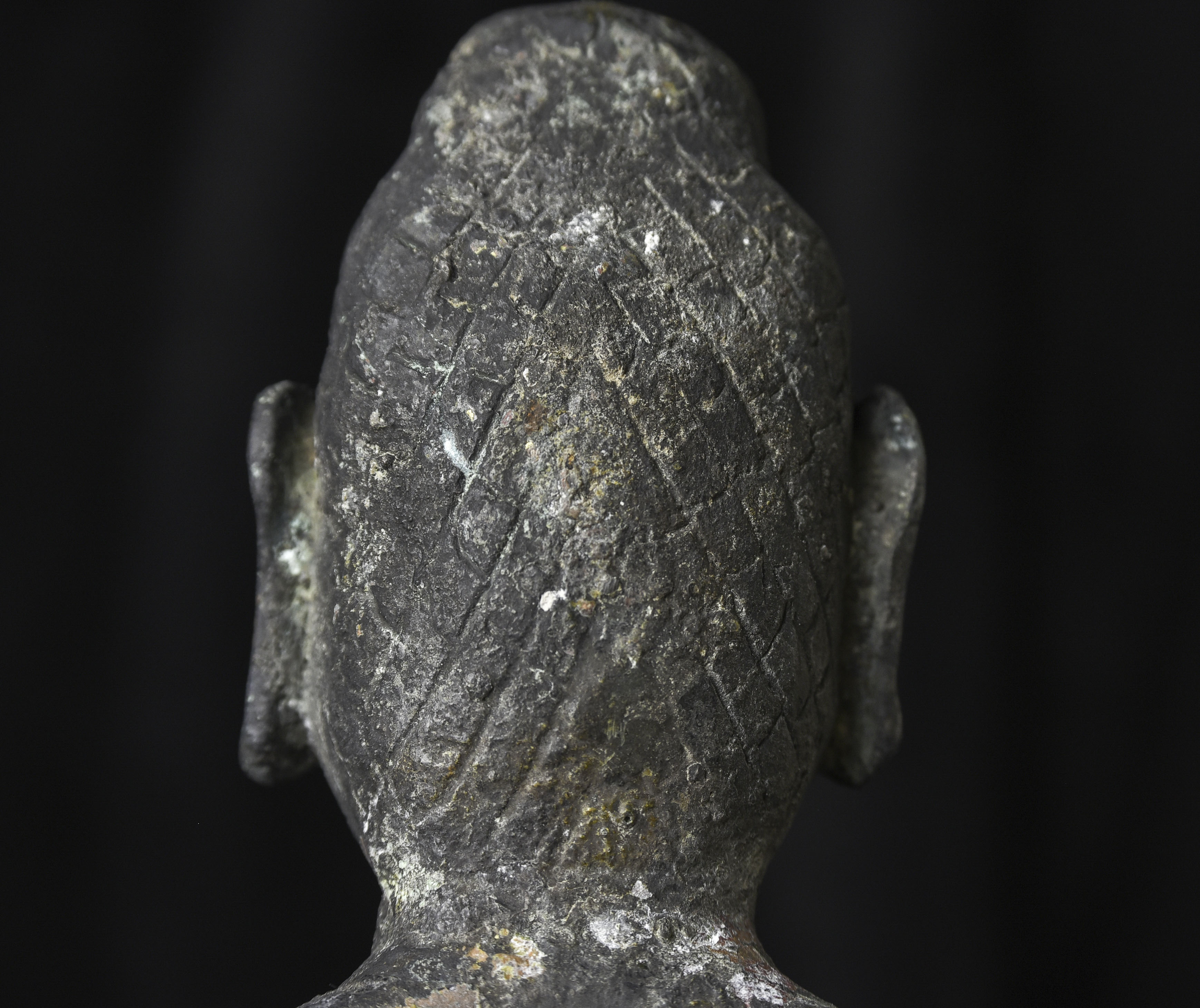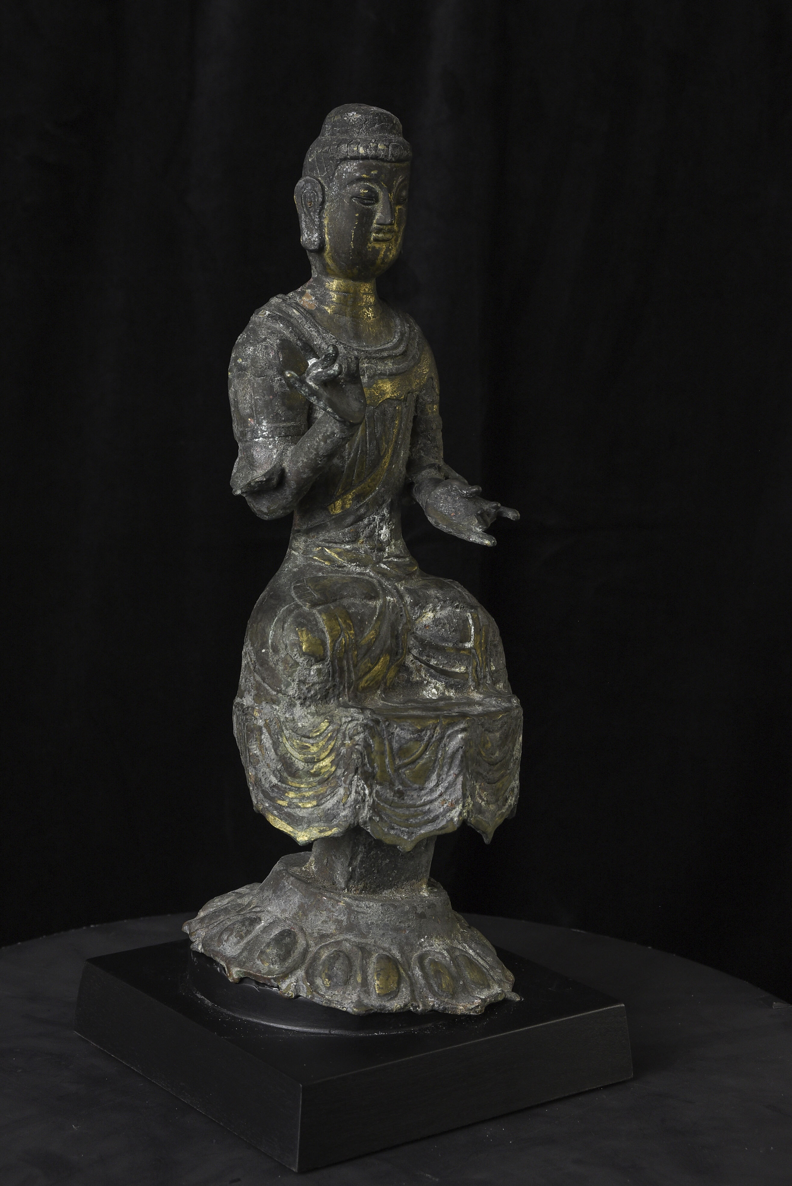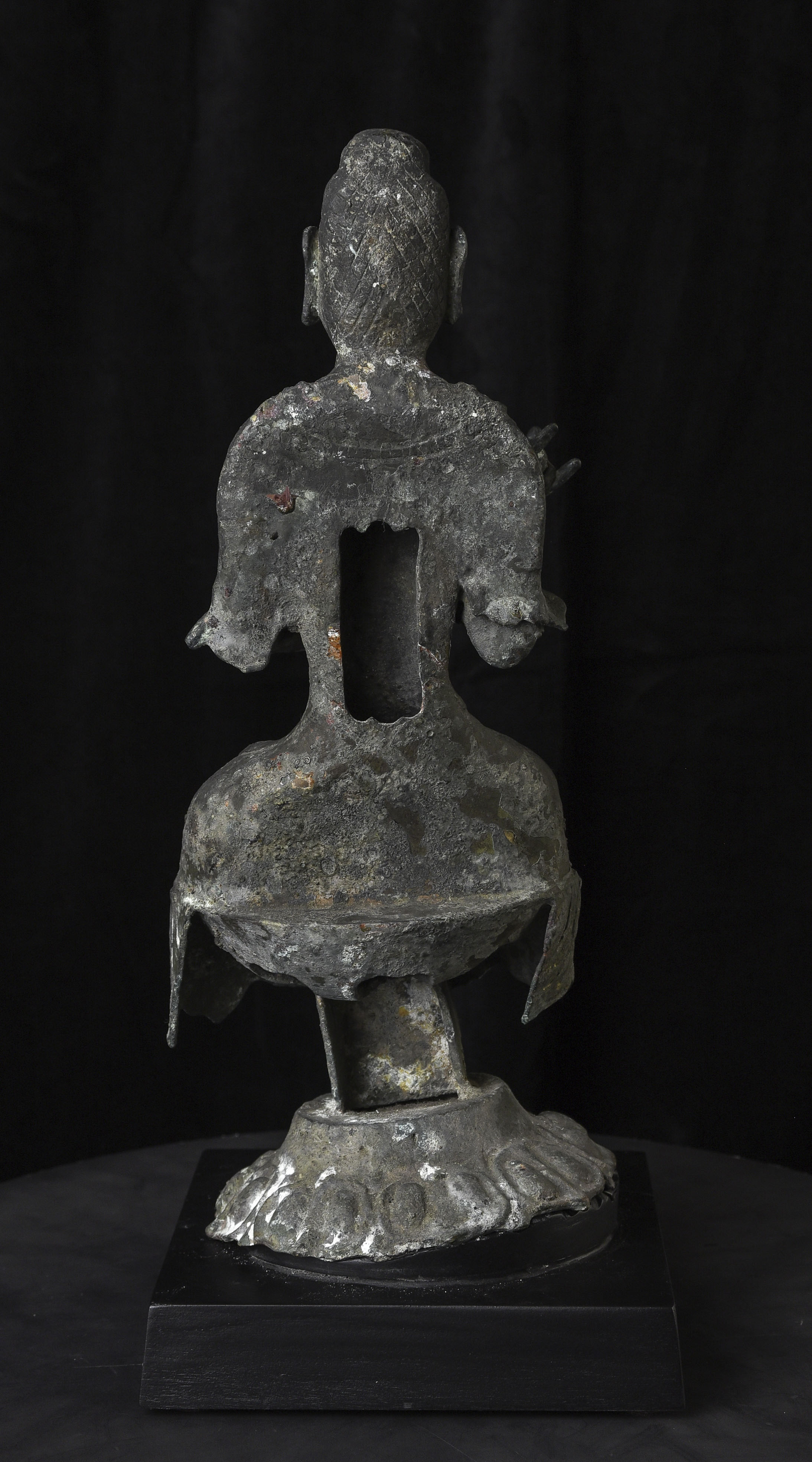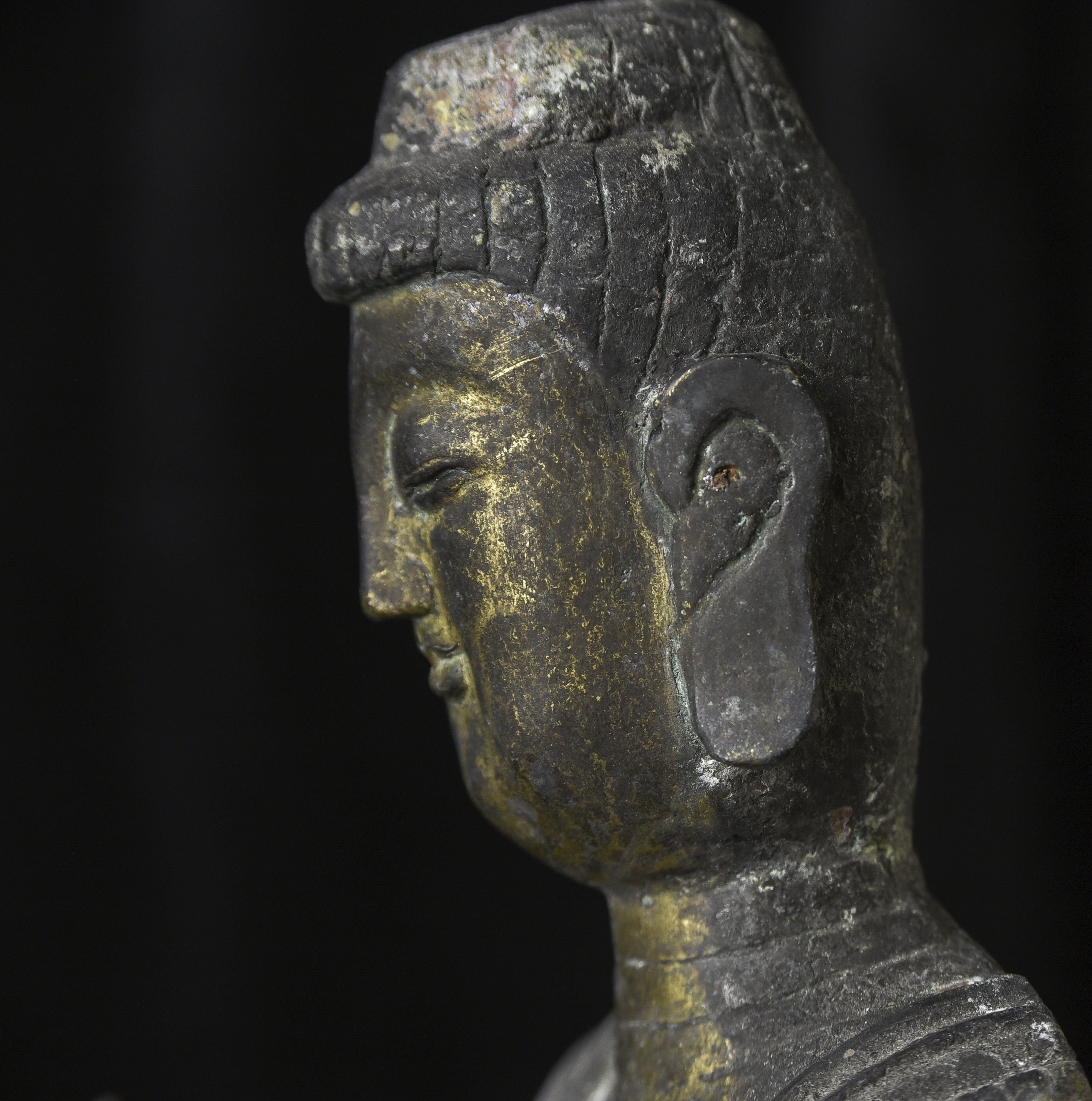 6-9th Century (plus or minus a century or two) Silla Dynasty Buddha. Extremely large for its type at 16.5 INCHES tall. Superb face. Korean national treasure number 79 (from 709 A.D.) has the same form, including the shape of the base, the type of robes, and the bump on top of the head. That one is a classic, extremely fine gilded bronze with an intricate back plate, so at first sight, it looks quite different than this one. Still, when you spend time looking at the two next to each other, you can see how someone during that time period, With deep devotion and love in their heart, but without extensive training in the craft of casting bronze statues, could have easily made this sculpture. It has a Gandharan look to the robes- especially in the way they close around the neck. It is also possible that it is a Silk Road piece that has combined elements of a number of cultures. The style suggests dating as early as the 6th, but the large size and provincial sculpting make it more likely to be late in the Silla Dynasty or possibly afterward. The condition is excellent for such a large early piece. The only issue is that the post that connects the base to the bottom of the base has slowly bent over to the left side I had a custom base made that allows it to sit straight, as you can see in the photos. I did not believe it was a good idea to try and correct this. While the underside looks quite solid and stable, I would not try and mess with it as it is probably brittle given that it likely is 1,000+ years old. It is the incredibly gentle, joy-filled face, the very large size at 16.5 inches tall, and the extremely early dating for a Korean bronze figure that makes this such an extreme rarity for a Korean Bronze Sculpture. Search the internet for comps and you will see what I mean! There is some possibility it is a few hundred years later due to the very large size and provincial nature(but no more than 13/14th at the absolute latest) as a revival piece, though my feeling is that it can be attributed to an earlier date. I've not seen another like it myself. Go onto the internet and try to find any comps-you will discover how rare and special this Buddha is.