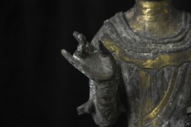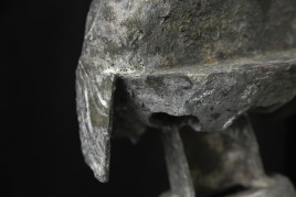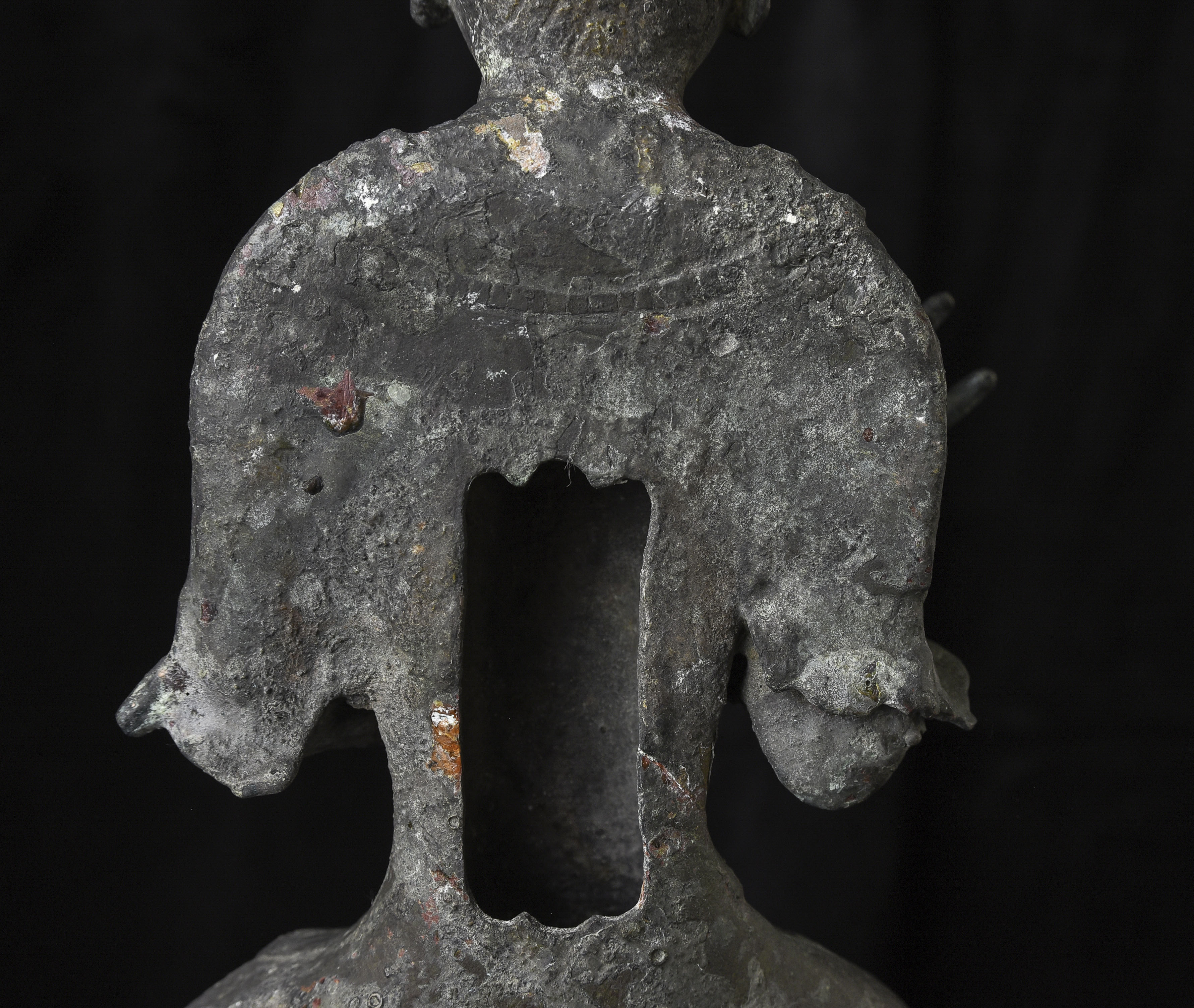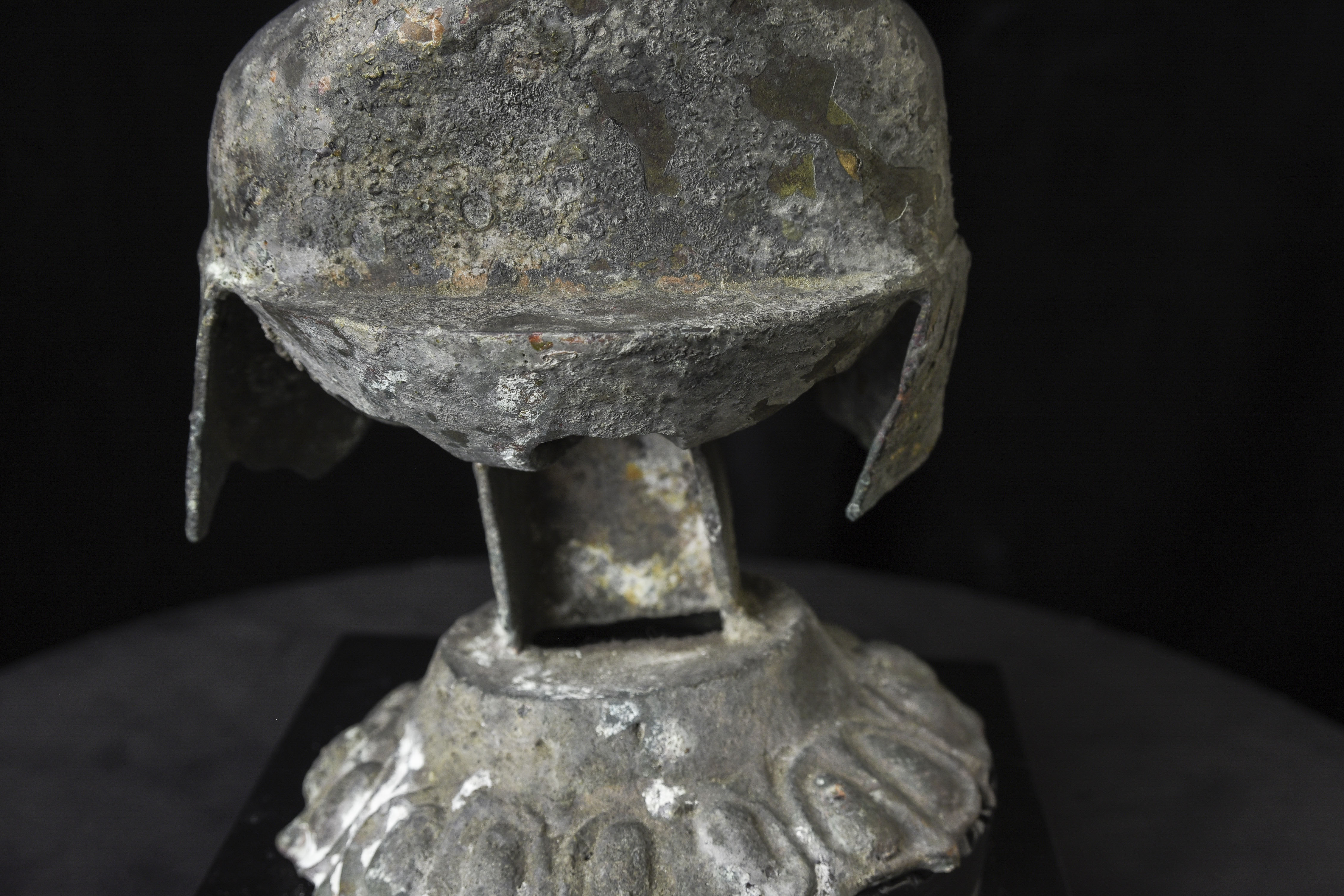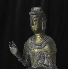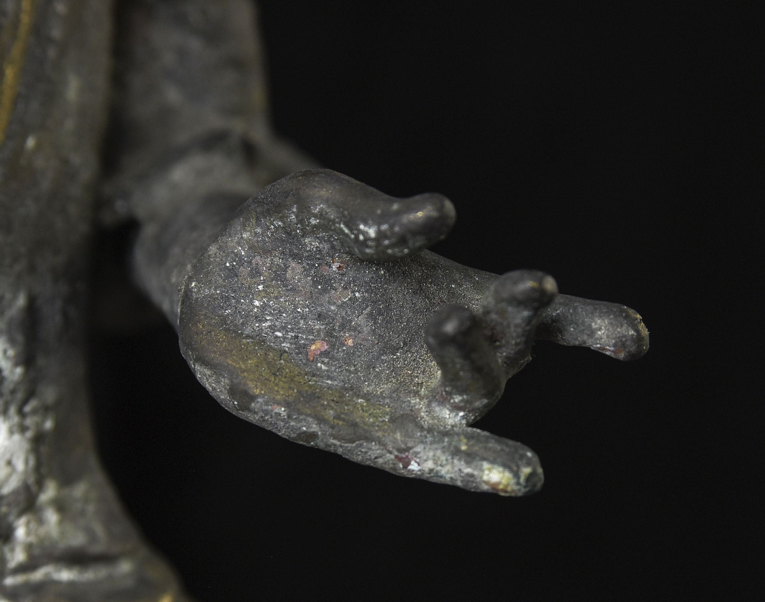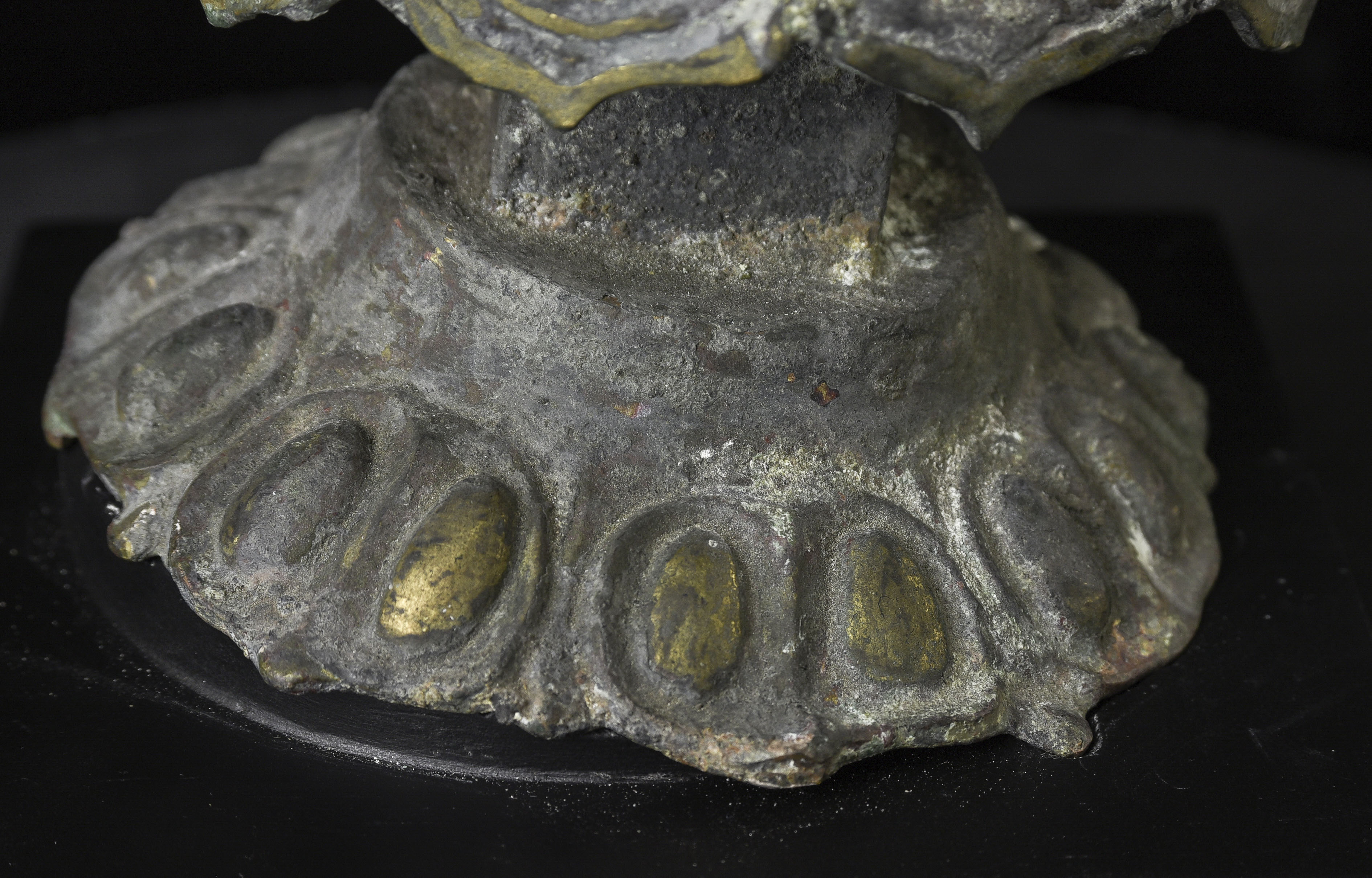 6-9th Century (plus or minus a century or two) Silla Dynasty Buddha. Extremely large for its type at 16.5 INCHES tall. Superb face. Korean national treasure number 79 (from 709 A.D.) has the same form, including the shape of the base, the type of robes, and the bump on top of the head. That one is a classic, extremely fine gilded bronze with an intricate back plate, so at first sight, it looks quite different than this one. Still, when you spend time looking at the two next to each other, you can see how someone during that time period, With deep devotion and love in their heart, but without extensive training in the craft of casting bronze statues, could have easily made this sculpture. It has a Gandharan look to the robes- especially in the way they close around the neck. It is also possible that it is a Silk Road piece that has combined elements of a number of cultures. The style suggests dating as early as the 6th, but the large size and provincial sculpting make it more likely to be late in the Silla Dynasty or possibly afterward. The condition is excellent for such a large early piece. The only issue is that the post that connects the base to the bottom of the base has slowly bent over to the left side I had a custom base made that allows it to sit straight, as you can see in the photos. I did not believe it was a good idea to try and correct this. While the underside looks quite solid and stable, I would not try and mess with it as it is probably brittle given that it likely is 1,000+ years old. It is the incredibly gentle, joy-filled face, the very large size at 16.5 inches tall, and the extremely early dating for a Korean bronze figure that makes this such an extreme rarity for a Korean Bronze Sculpture. Search the internet for comps and you will see what I mean! There is some possibility it is a few hundred years later due to the very large size and provincial nature(but no more than 13/14th at the absolute latest) as a revival piece, though my feeling is that it can be attributed to an earlier date. I've not seen another like it myself. Go onto the internet and try to find any comps-you will discover how rare and special this Buddha is.