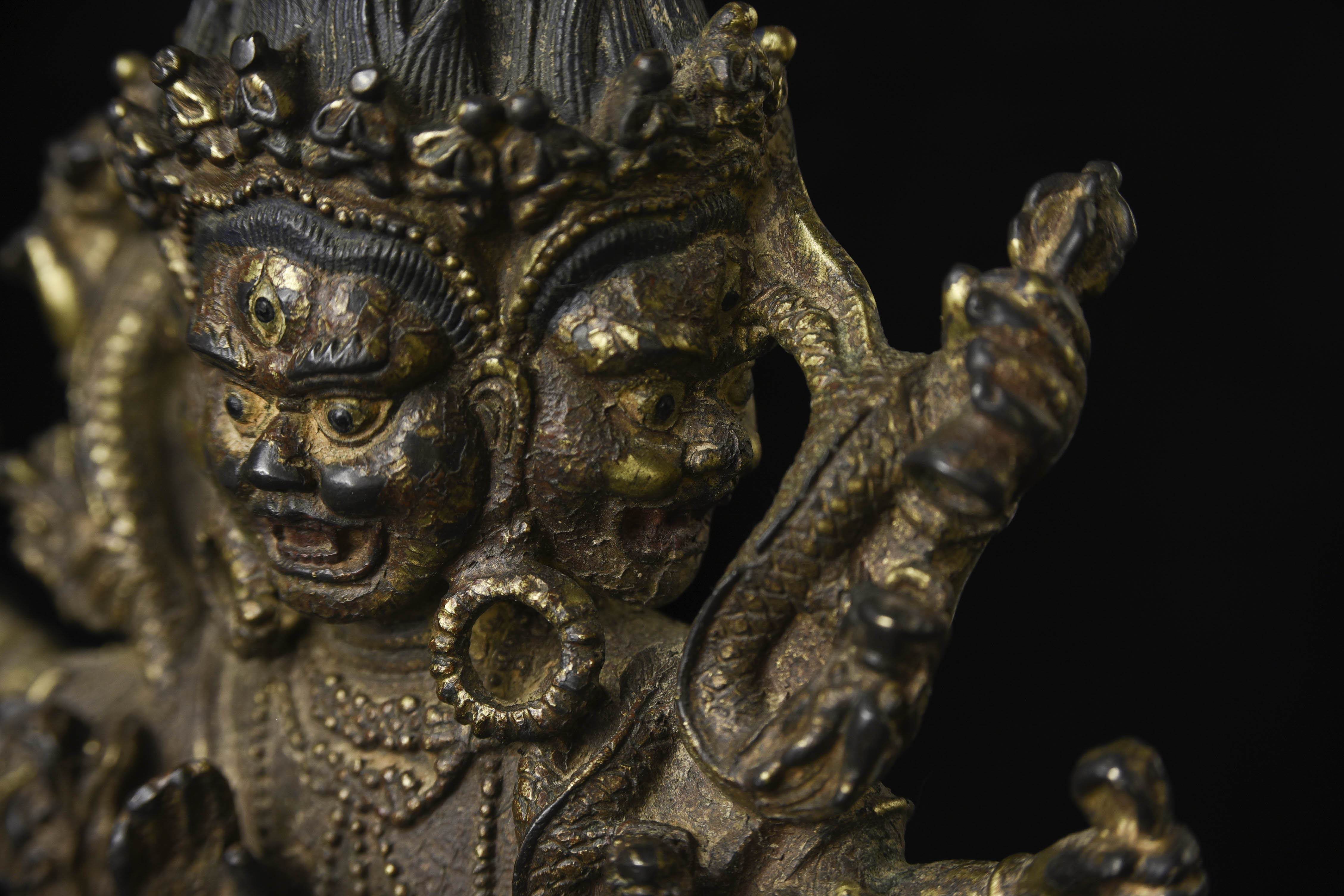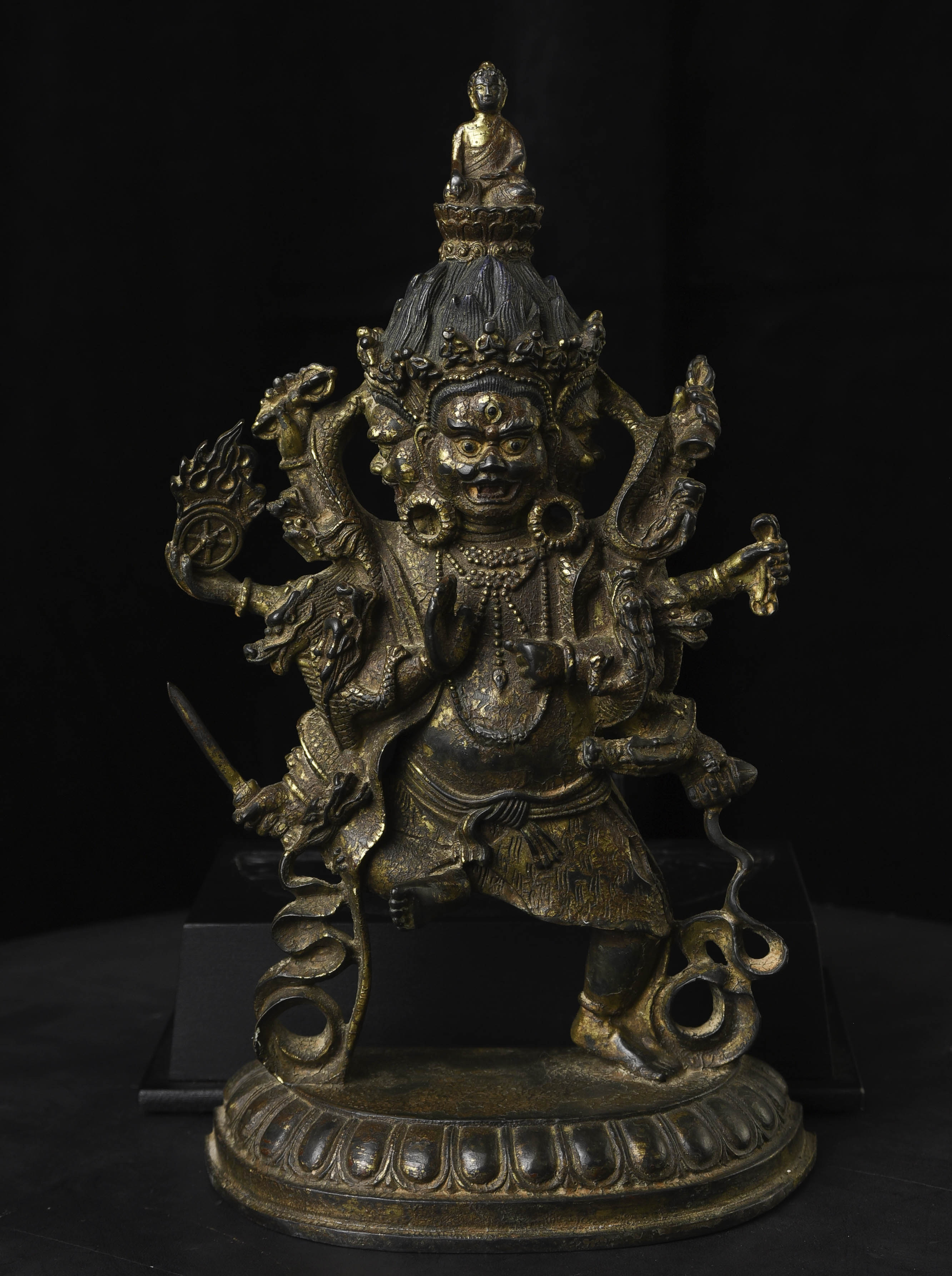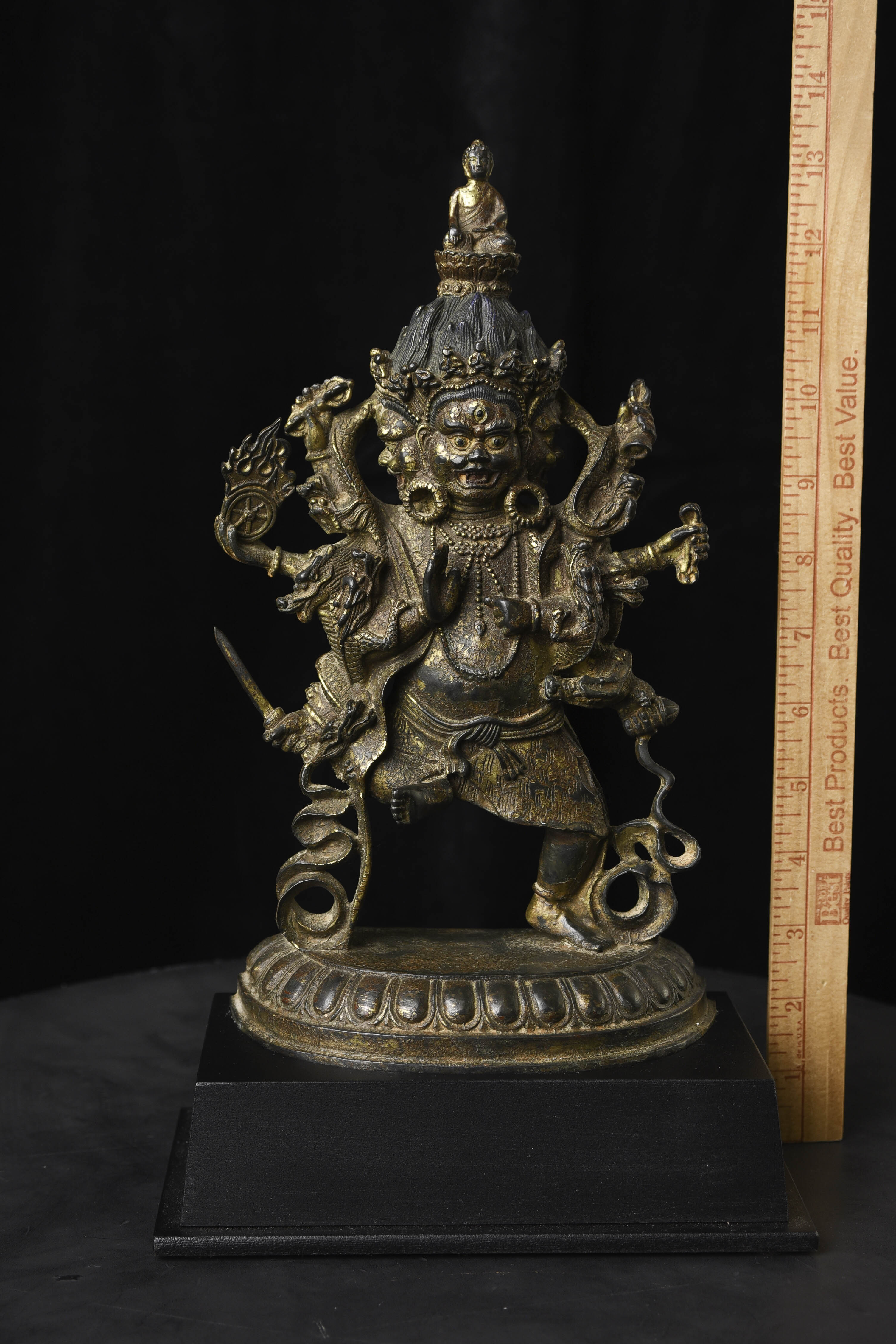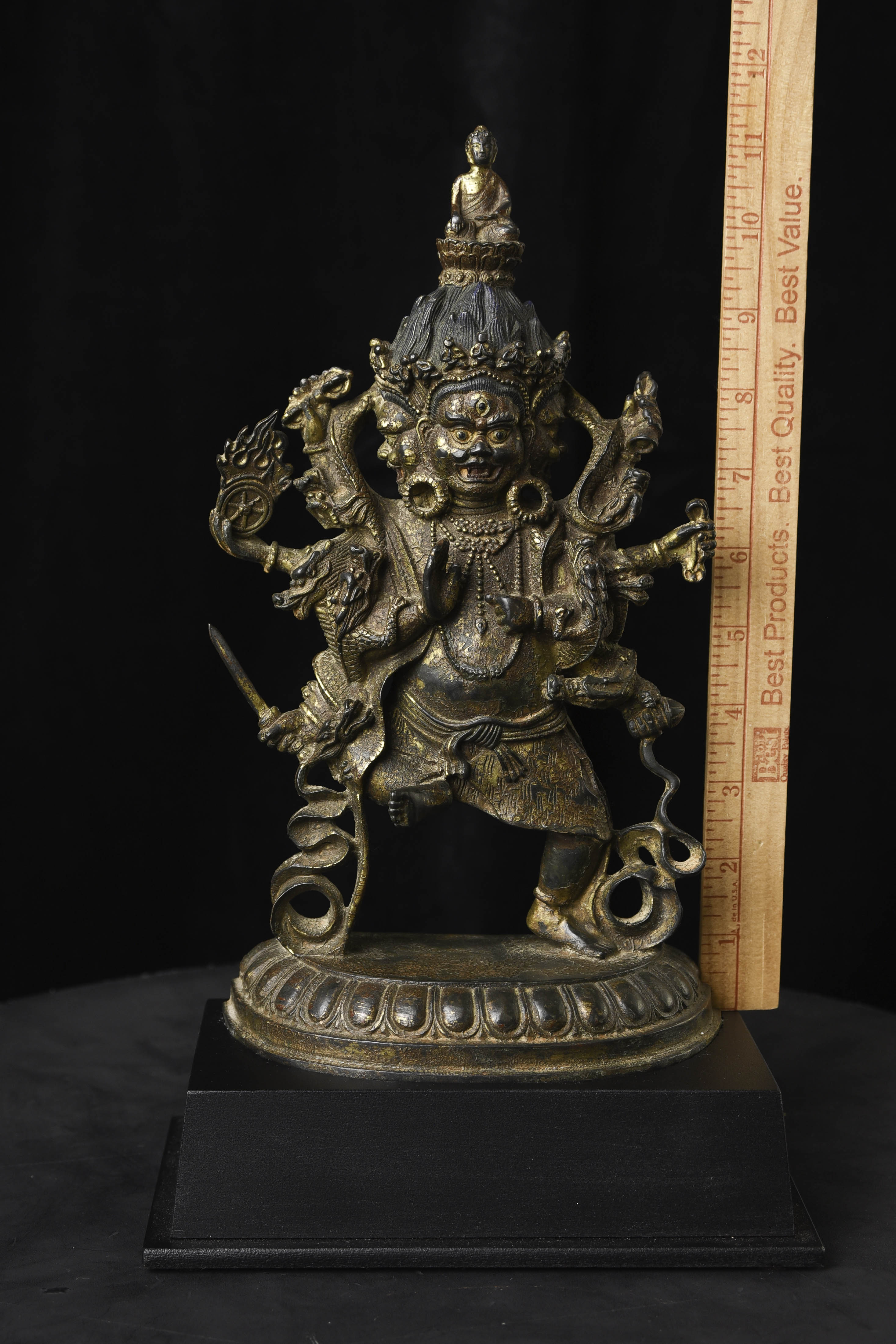 Remarkable Tibetan tantric figure. It is unlike any I have seen before. Take a look at the photos and you will see what I mean. It is hard to know where to look first-from the four main faces to the 8 incredibly detailed dragons to the tiny Buddhas in the crown, It will mesmerize you for hours. you see the quality everywhere-from the subtle striping cast into the Tiger Pelt around his waist to the Precision in all of the casting and finishing in virtually every single tiny detail. I've had many wonderful Tibetan Buddhas over the years that were older than this, that were more classic in their subject matter, etc., but I've had very few that had the level of overall precision, Dynamic energy, and complexity balanced with Beauty. It does not have the look or feel of an early piece. It also does not have the look or feel of a recent fake. based on the wear, patina, and overall quality, my feeling is that it is approaching 100 years old, though hard to know for sure.( 11.25"H x 6.25"W ) - 7.69lbs / 3.485kg including base. Base is 2" Tall.