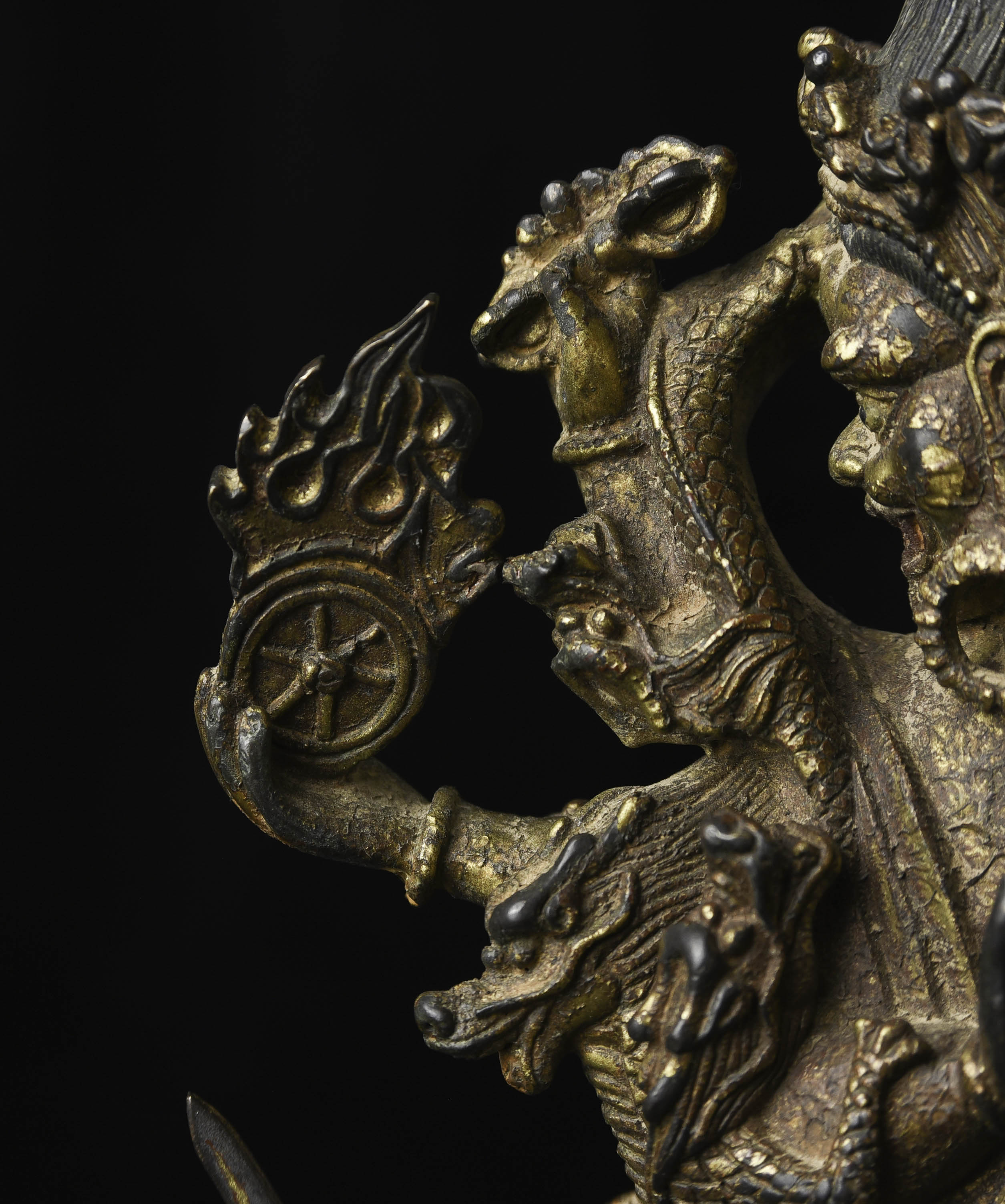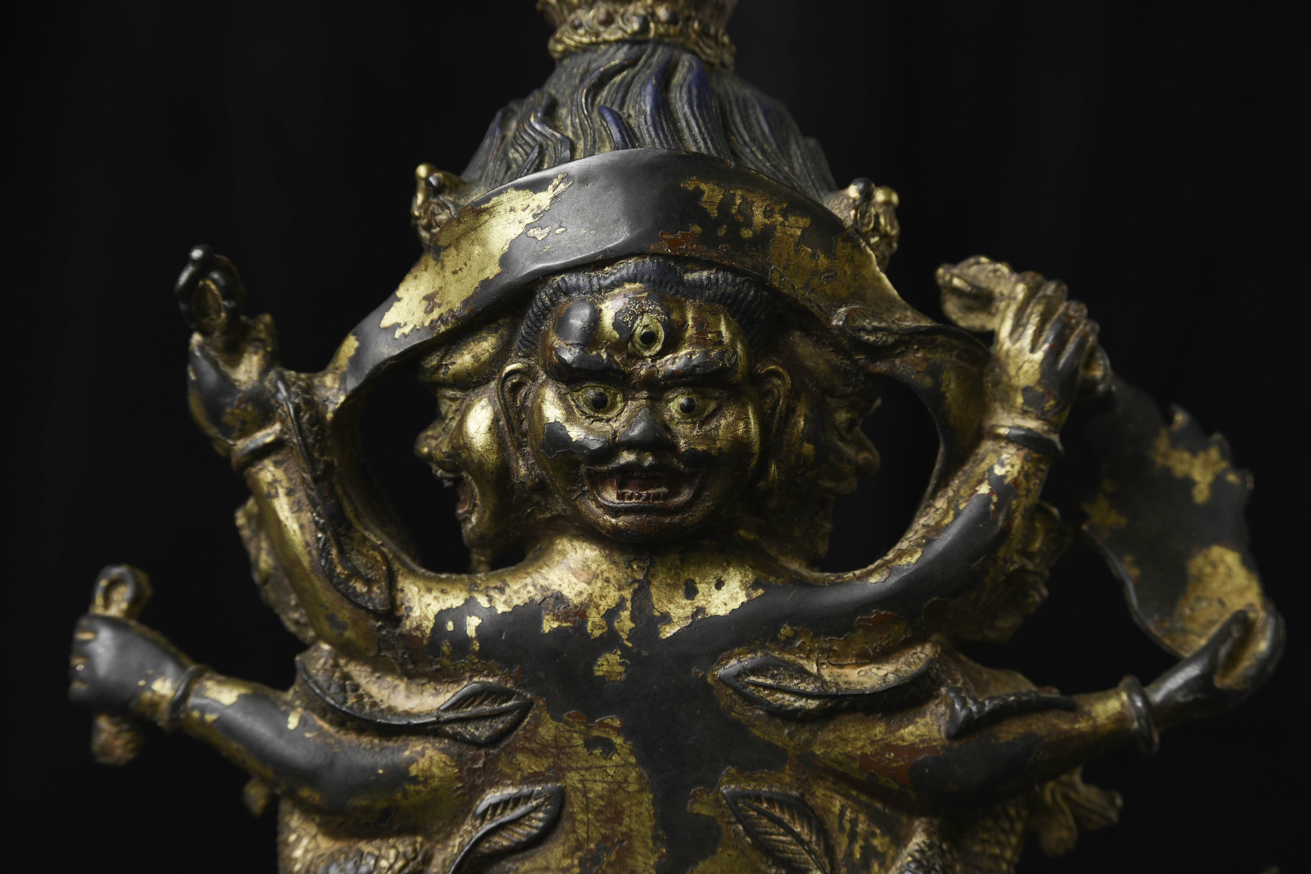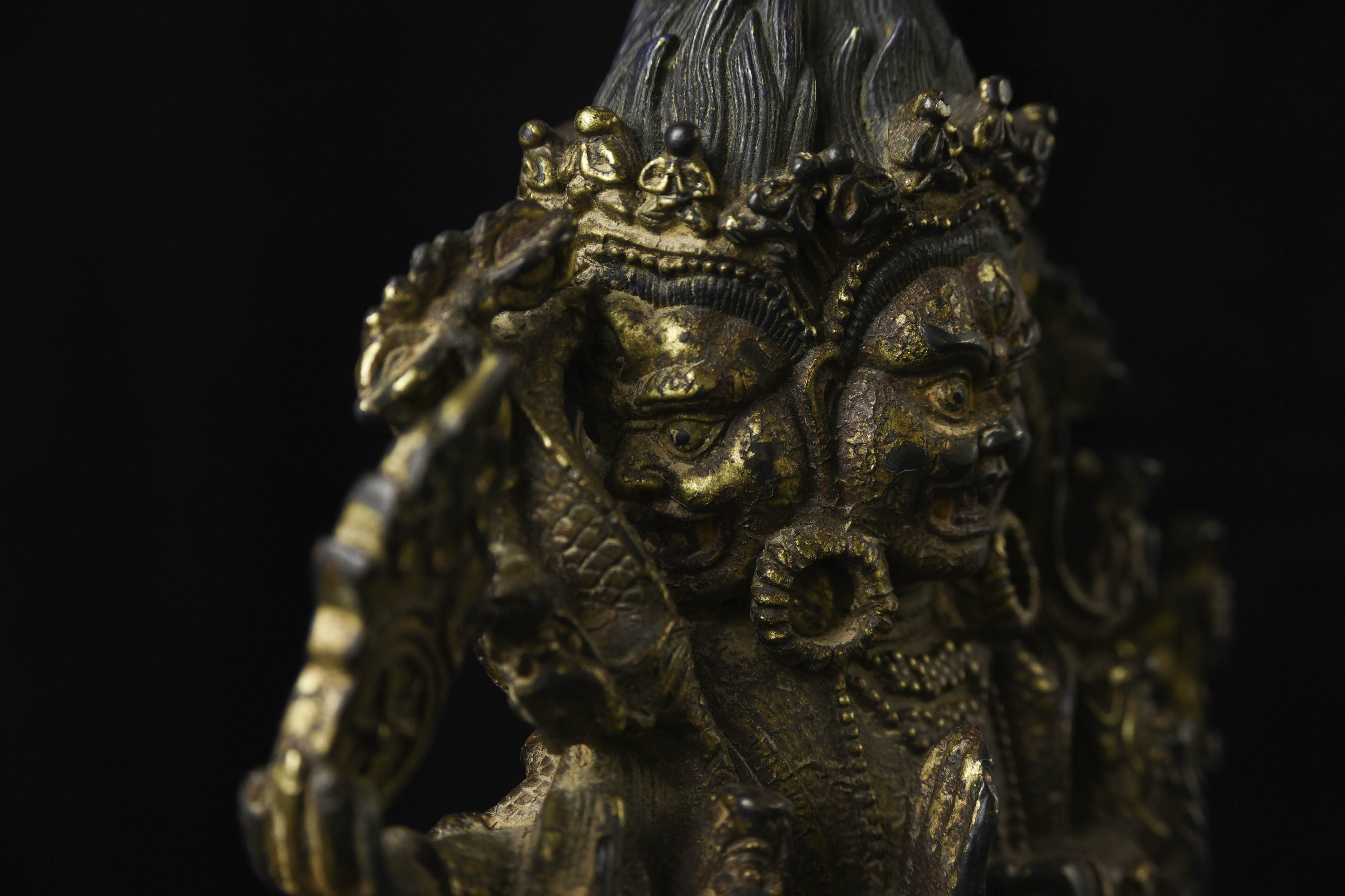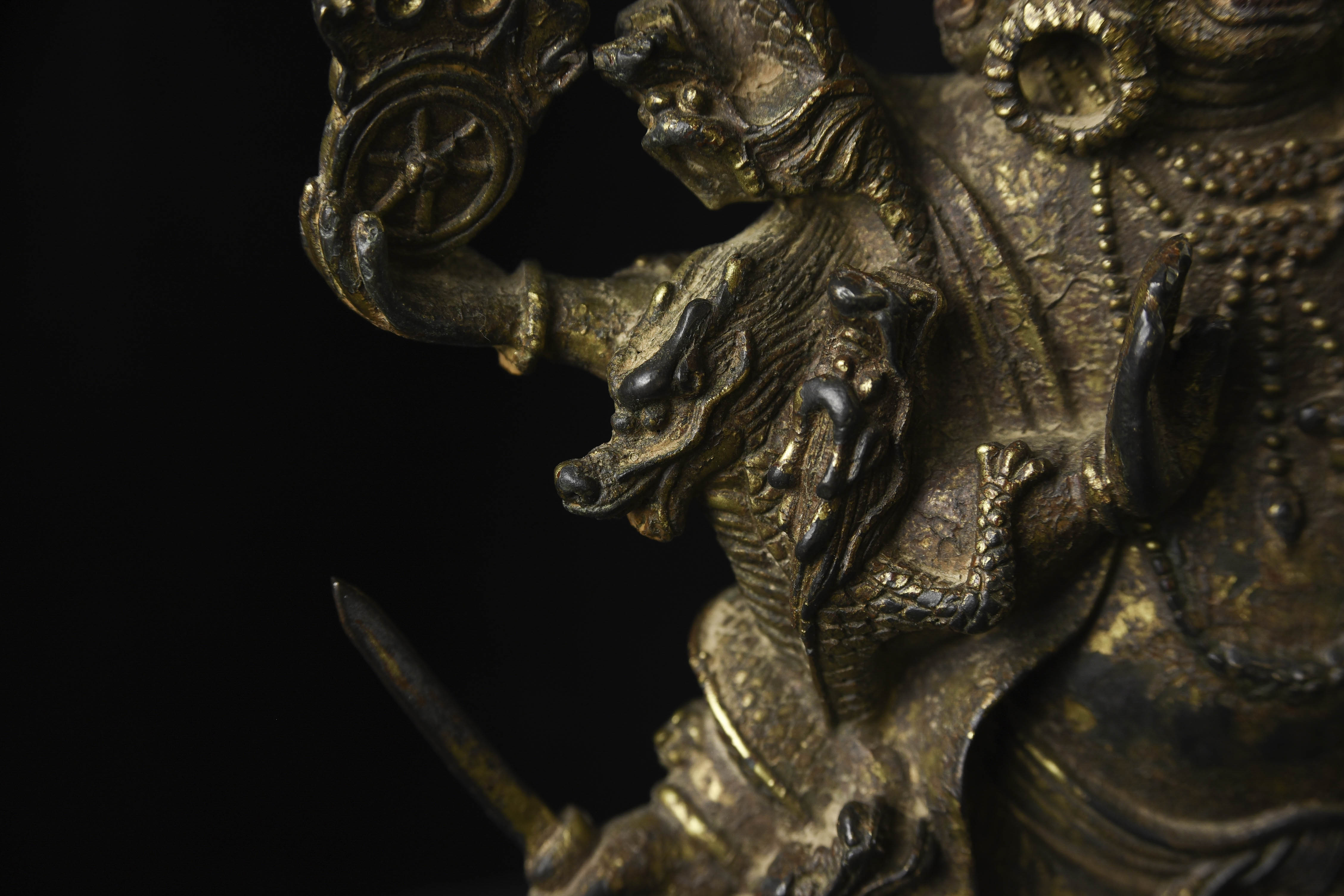 Remarkable Tibetan tantric figure. It is unlike any I have seen before. Take a look at the photos and you will see what I mean. It is hard to know where to look first-from the four main faces to the 8 incredibly detailed dragons to the tiny Buddhas in the crown, It will mesmerize you for hours. you see the quality everywhere-from the subtle striping cast into the Tiger Pelt around his waist to the Precision in all of the casting and finishing in virtually every single tiny detail. I've had many wonderful Tibetan Buddhas over the years that were older than this, that were more classic in their subject matter, etc., but I've had very few that had the level of overall precision, Dynamic energy, and complexity balanced with Beauty. It does not have the look or feel of an early piece. It also does not have the look or feel of a recent fake. based on the wear, patina, and overall quality, my feeling is that it is approaching 100 years old, though hard to know for sure.( 11.25"H x 6.25"W ) - 7.69lbs / 3.485kg including base. Base is 2" Tall.