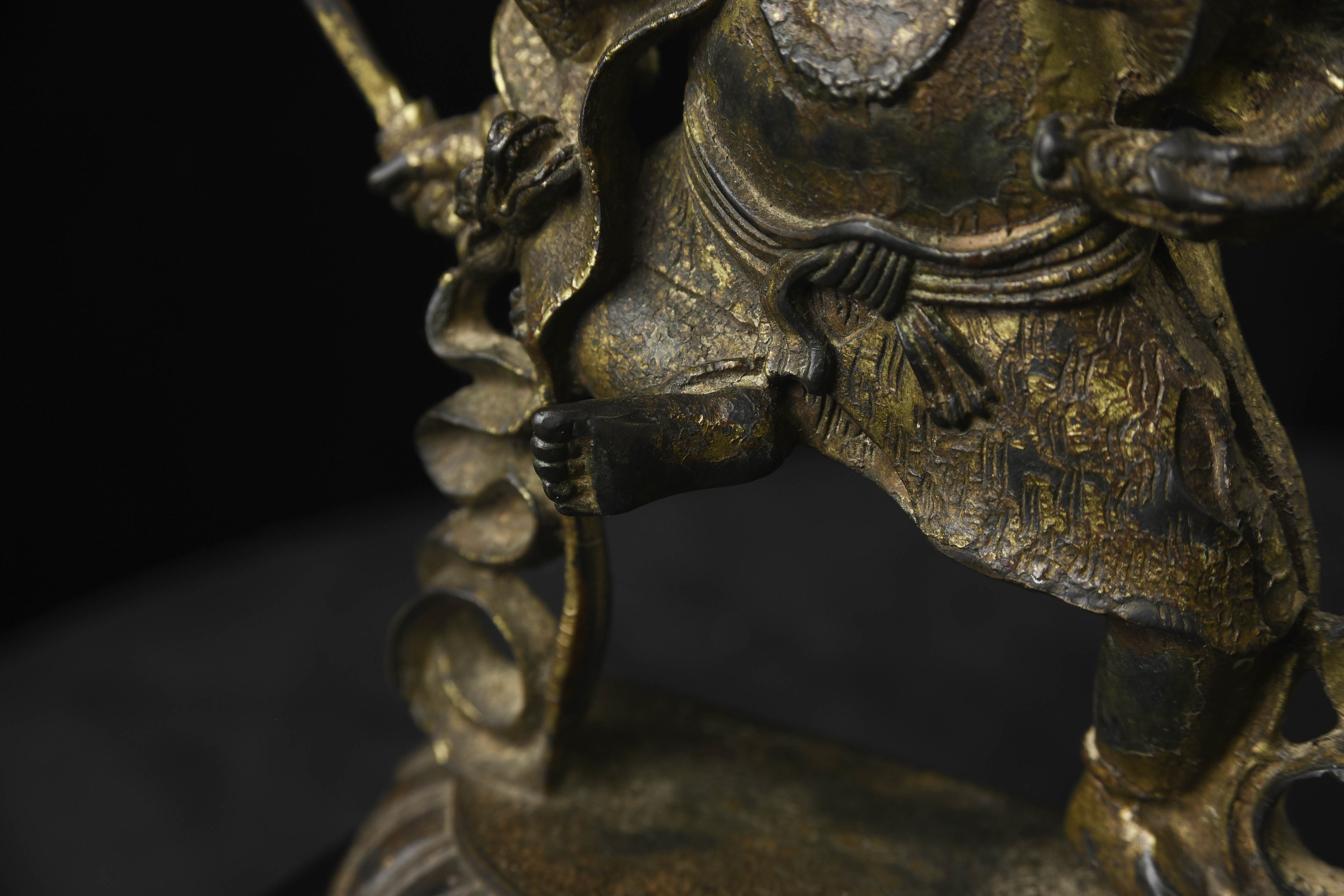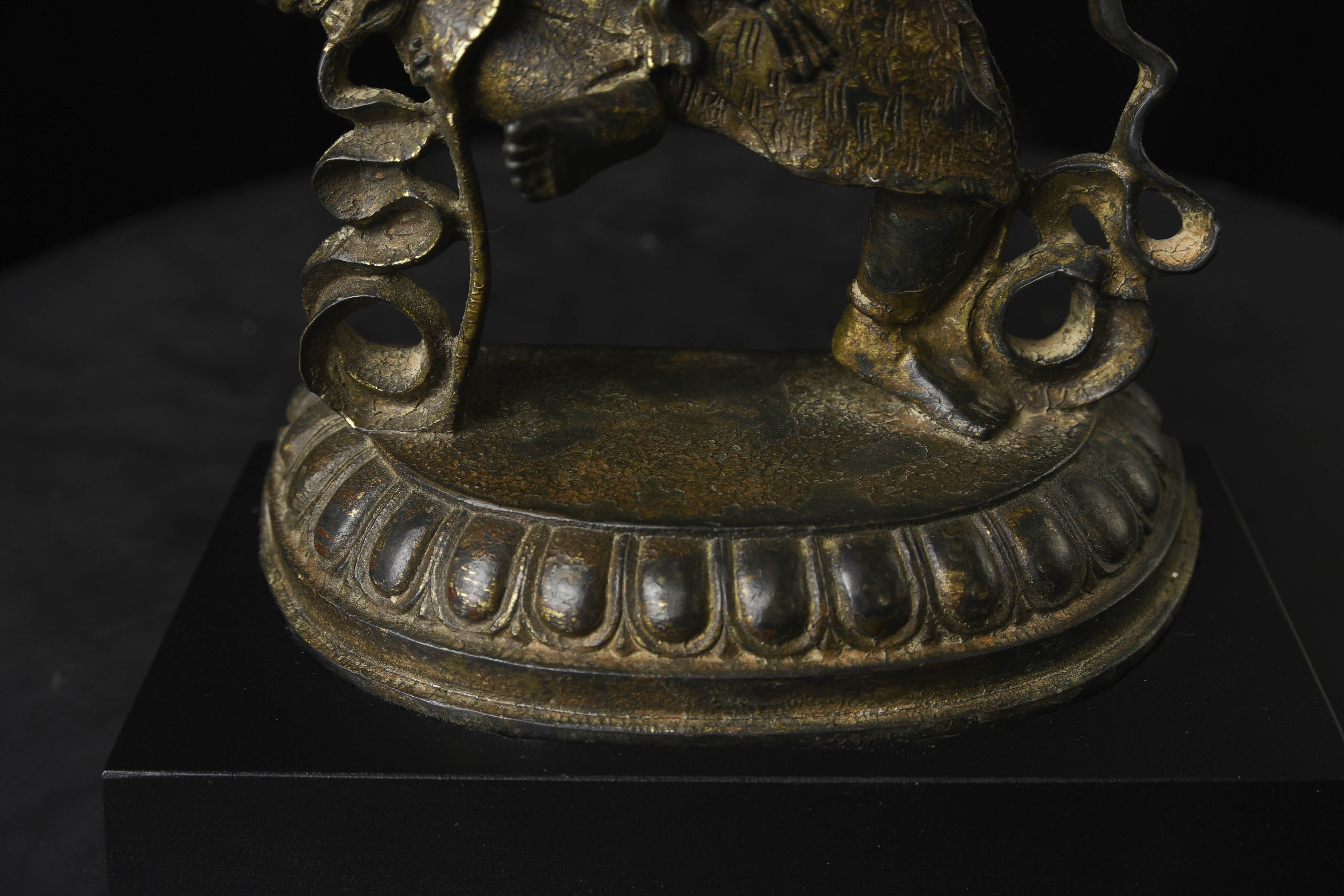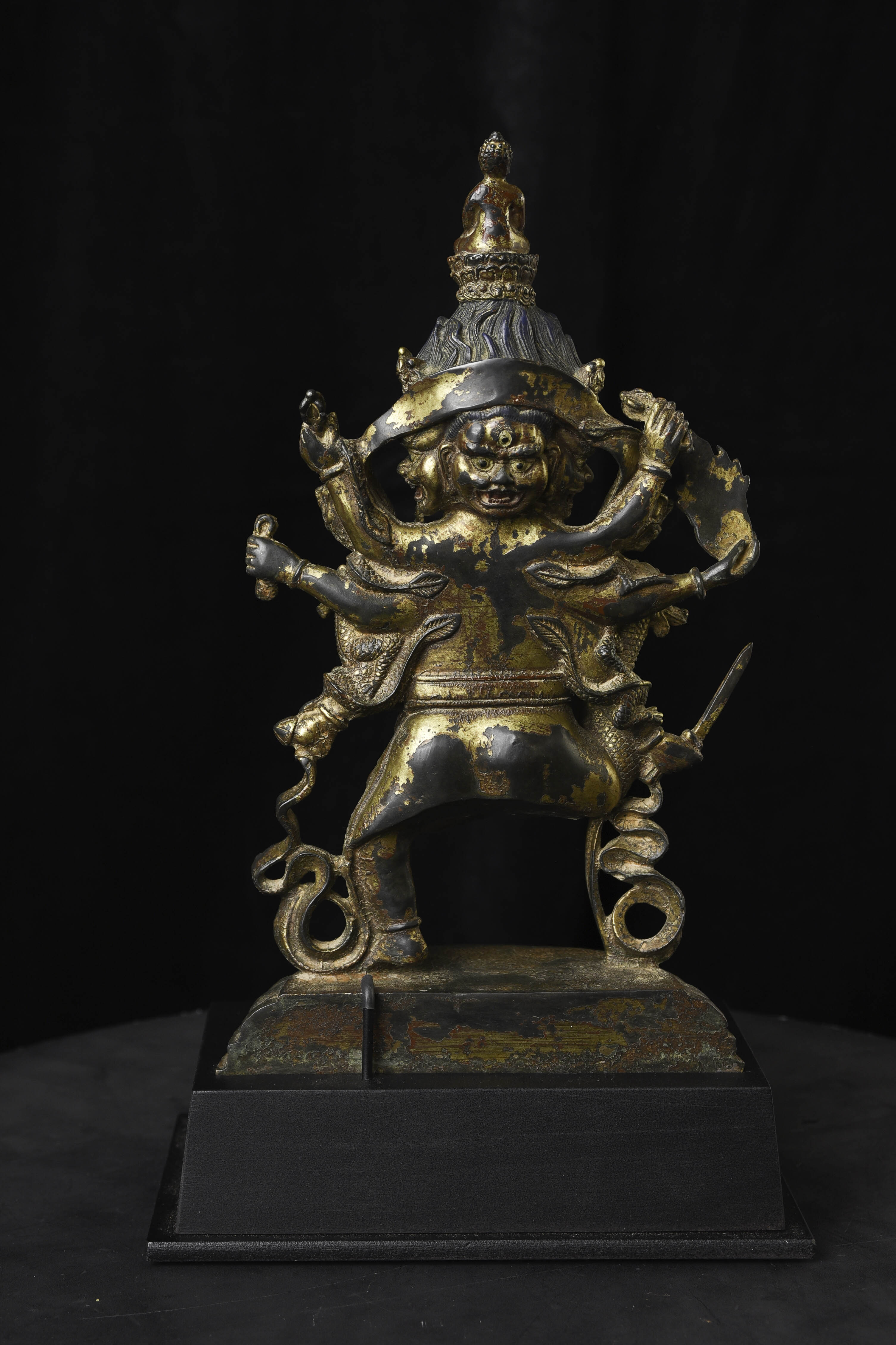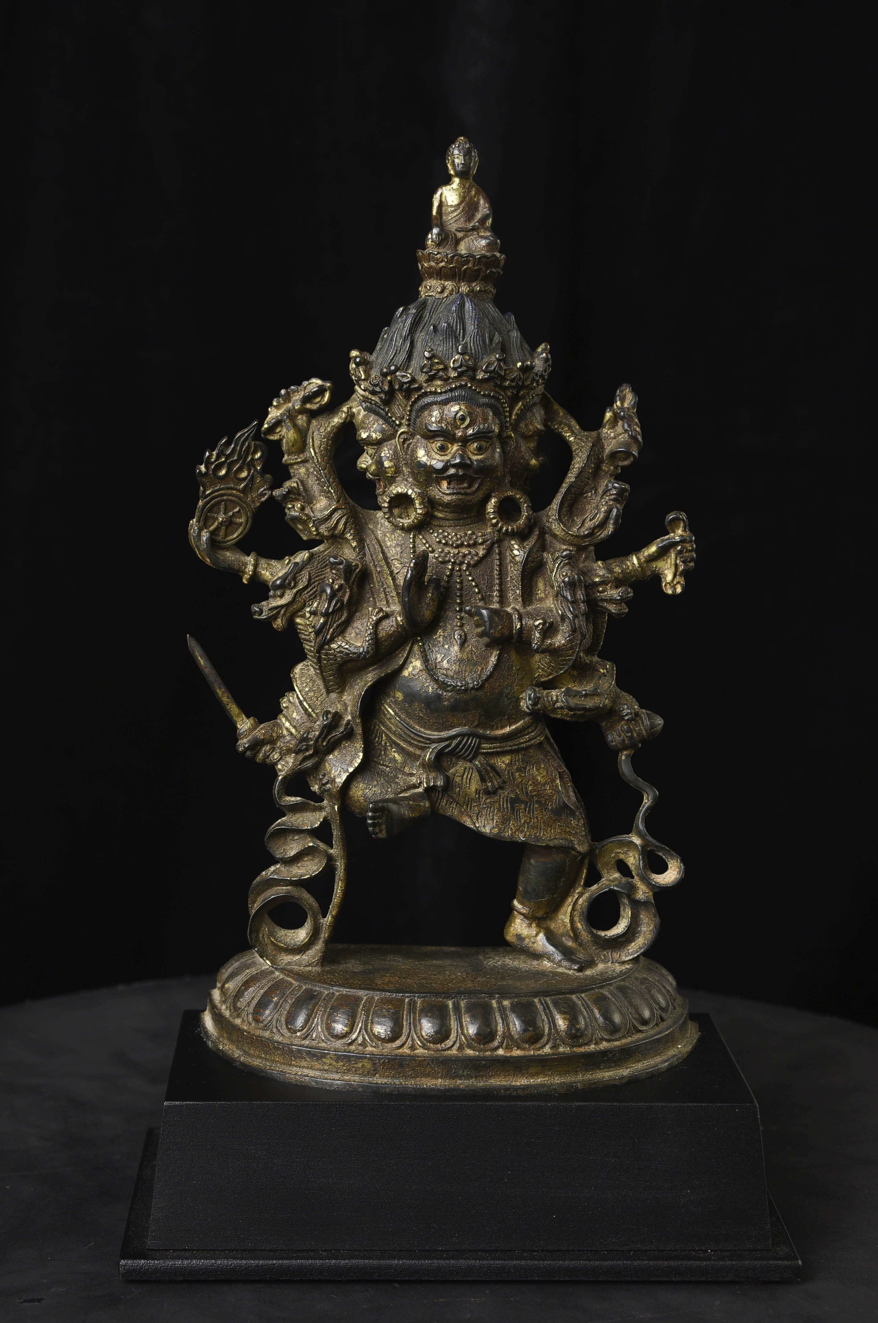 Remarkable Tibetan tantric figure. It is unlike any I have seen before. Take a look at the photos and you will see what I mean. It is hard to know where to look first-from the four main faces to the 8 incredibly detailed dragons to the tiny Buddhas in the crown, It will mesmerize you for hours. you see the quality everywhere-from the subtle striping cast into the Tiger Pelt around his waist to the Precision in all of the casting and finishing in virtually every single tiny detail. I've had many wonderful Tibetan Buddhas over the years that were older than this, that were more classic in their subject matter, etc., but I've had very few that had the level of overall precision, Dynamic energy, and complexity balanced with Beauty. It does not have the look or feel of an early piece. It also does not have the look or feel of a recent fake. based on the wear, patina, and overall quality, my feeling is that it is approaching 100 years old, though hard to know for sure.( 11.25"H x 6.25"W ) - 7.69lbs / 3.485kg including base. Base is 2" Tall.