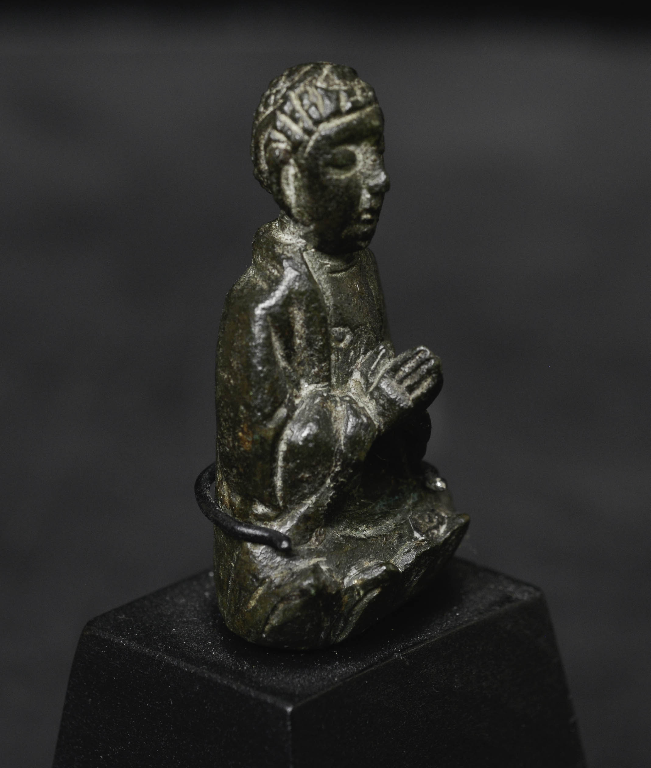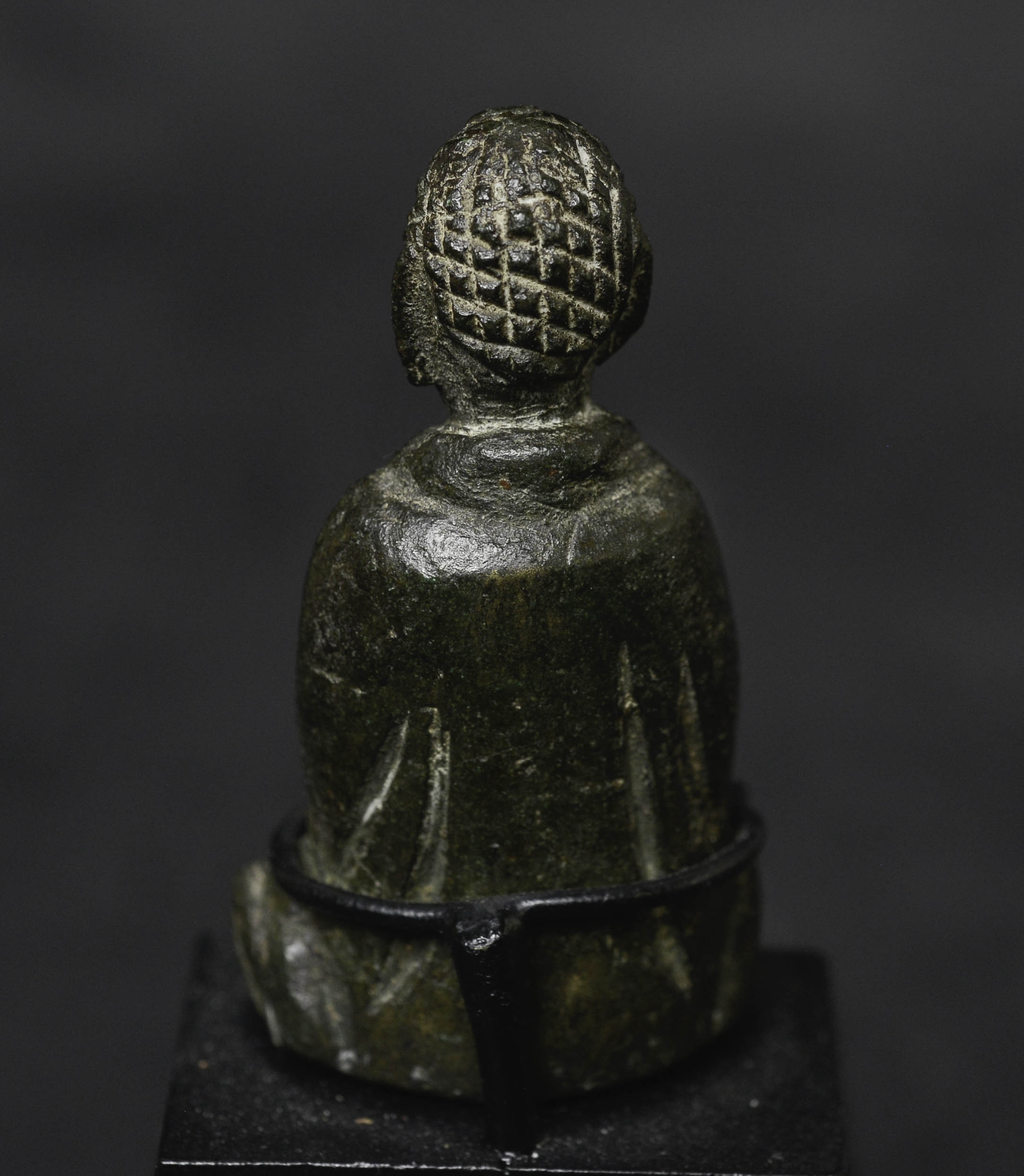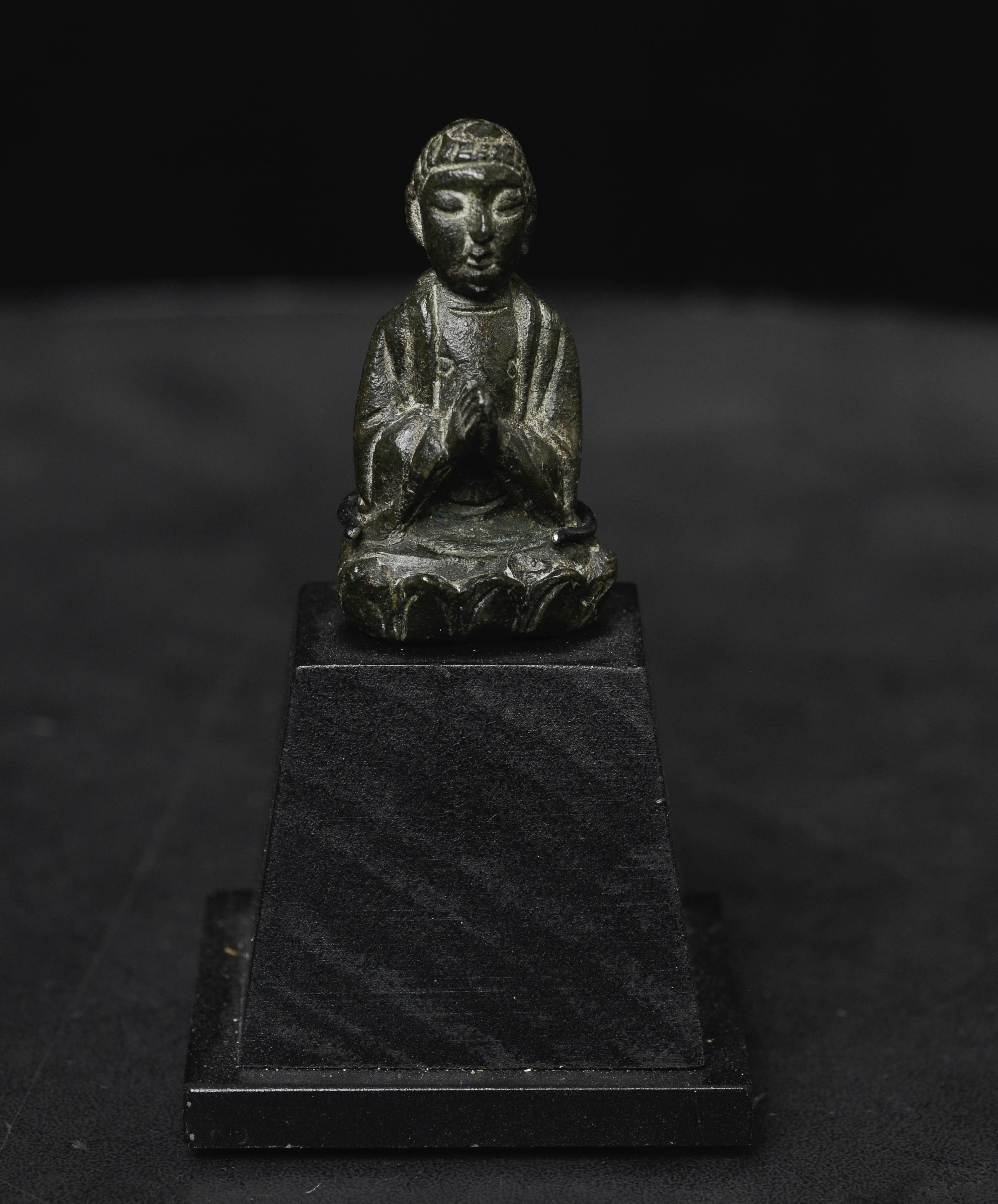 Very early (pre-Ming) Chinese solid-cast bronze Buddha. 2.25" tall, height on custom base is 3 3/8 inches. Has incredible presence for such a small piece.