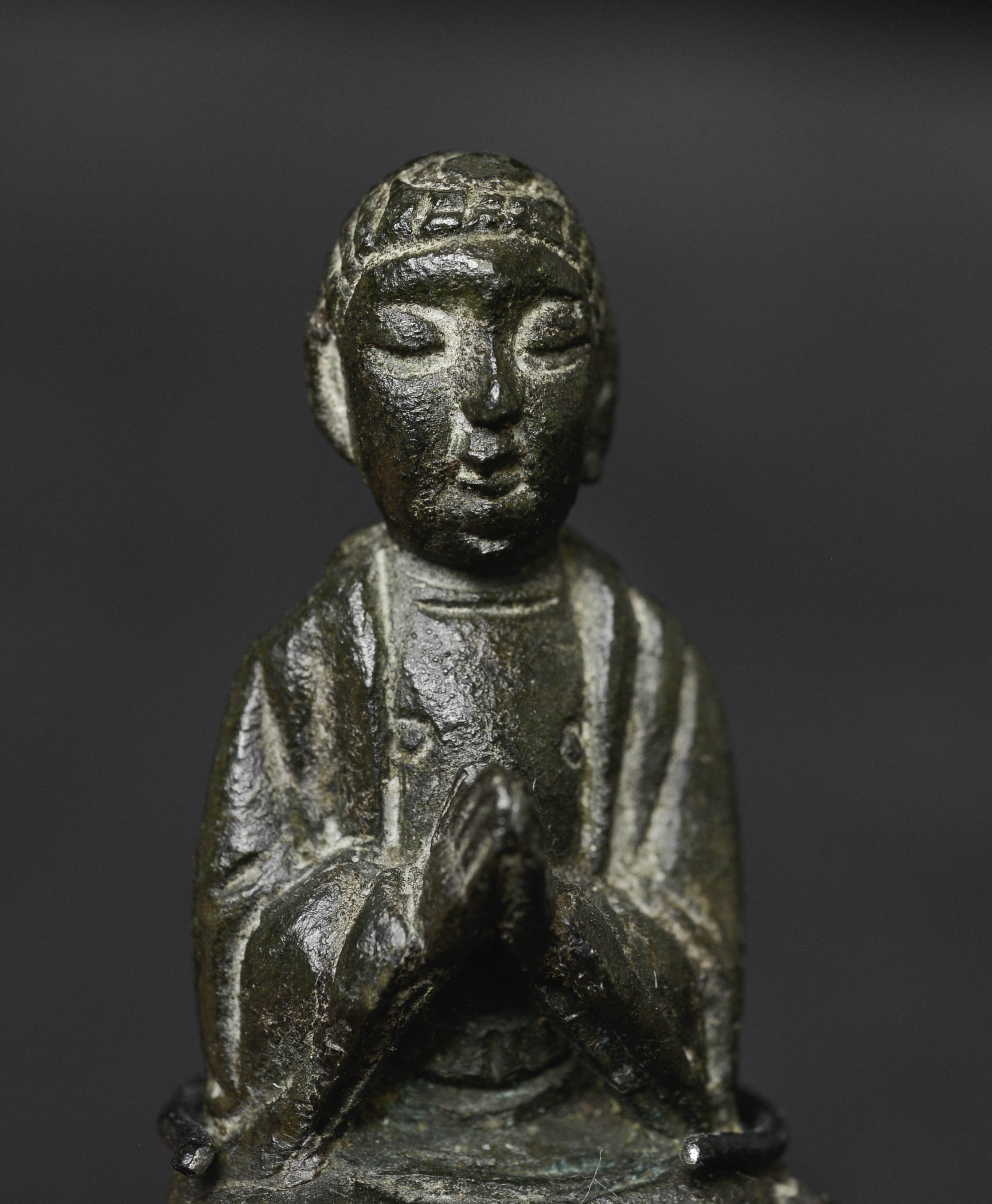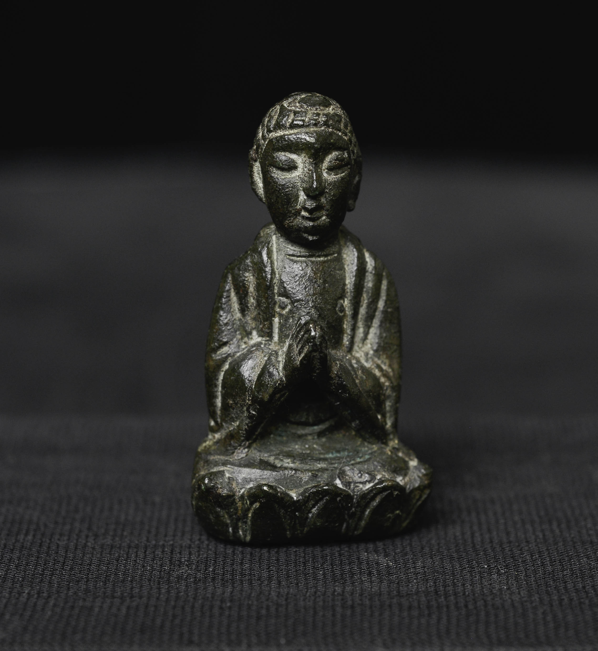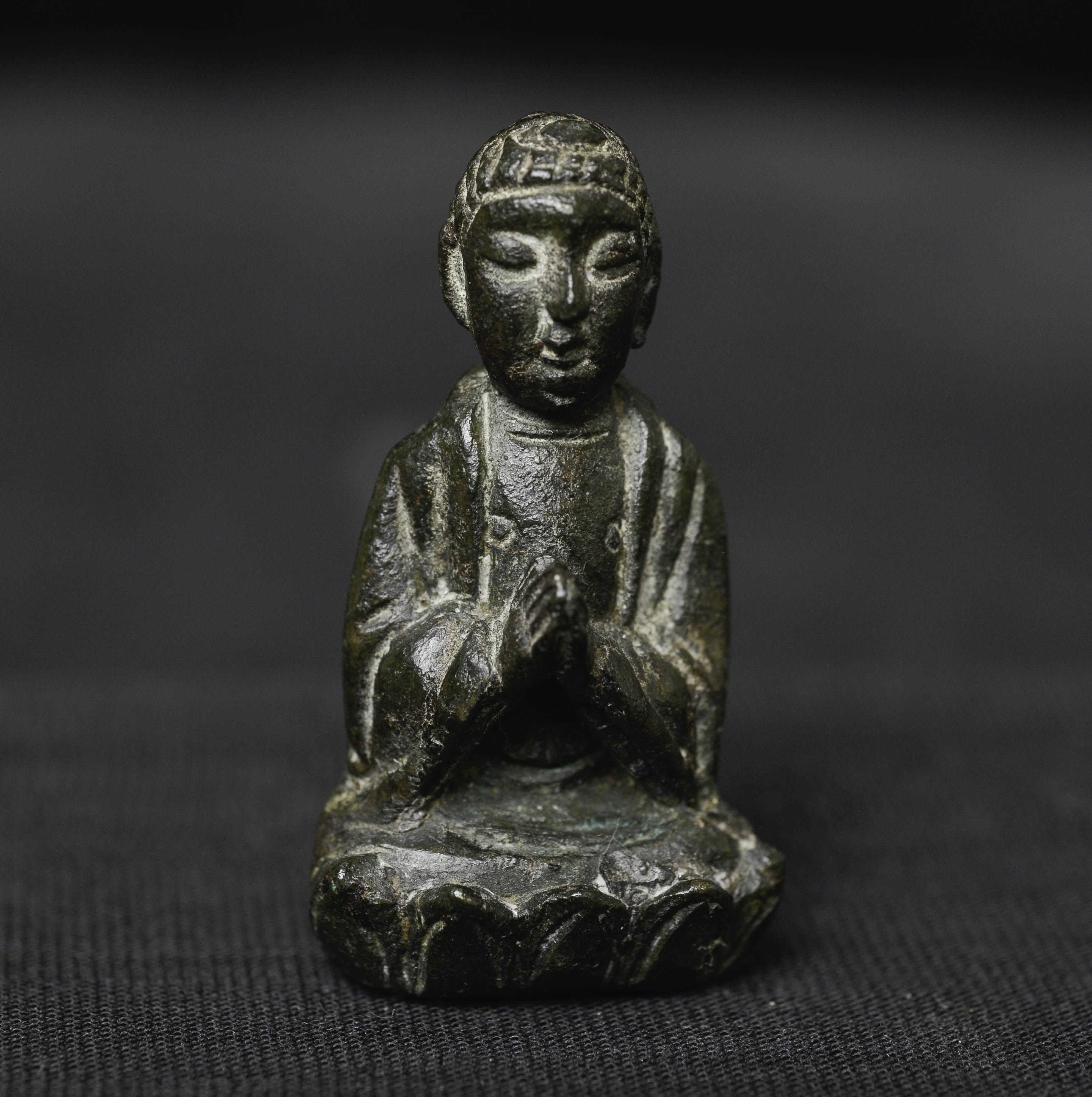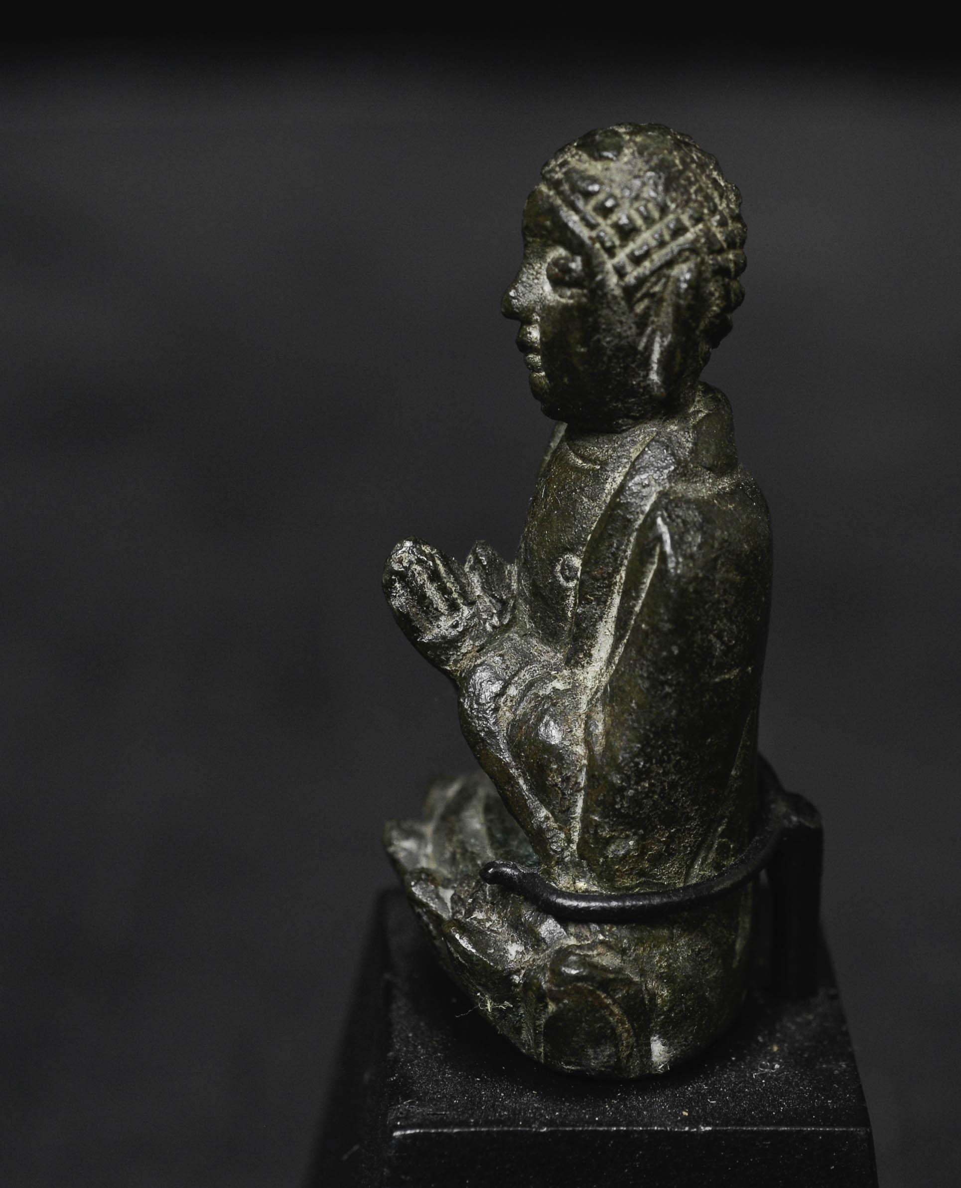 Very early (pre-Ming) Chinese solid-cast bronze Buddha. 2.25" tall, height on custom base is 3 3/8 inches. Has incredible presence for such a small piece.