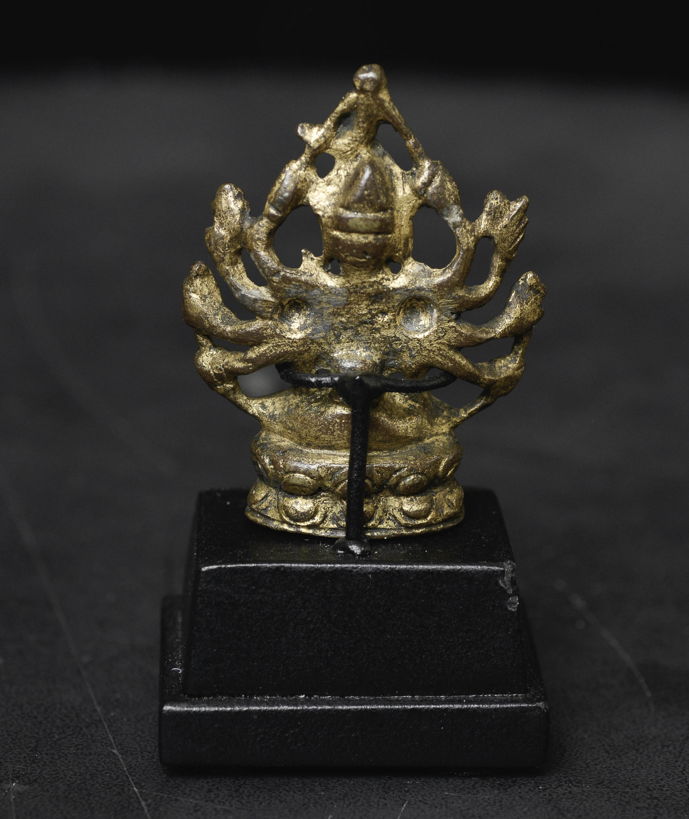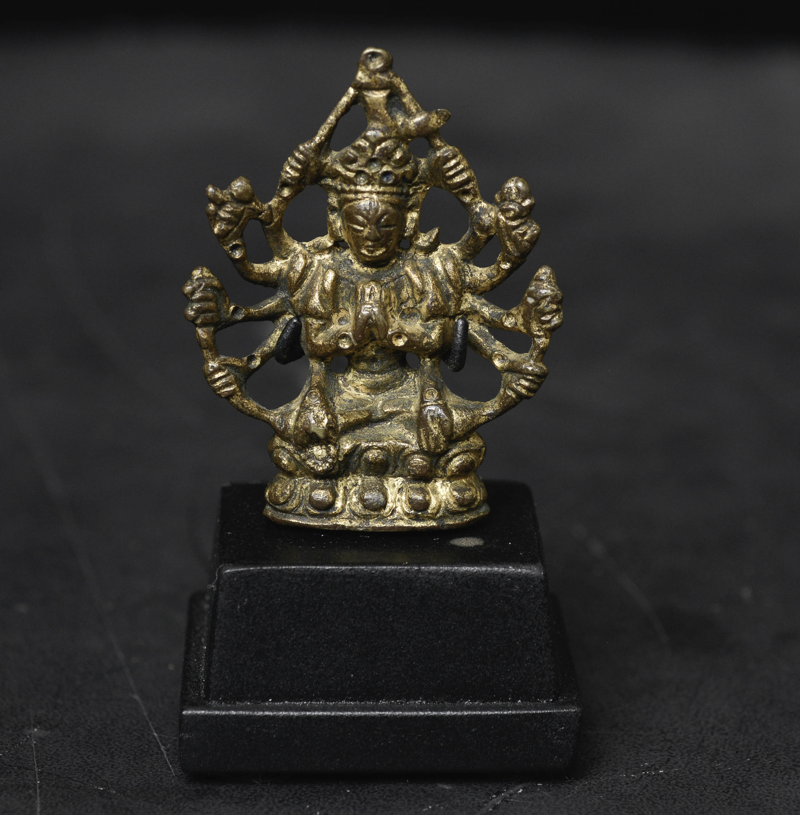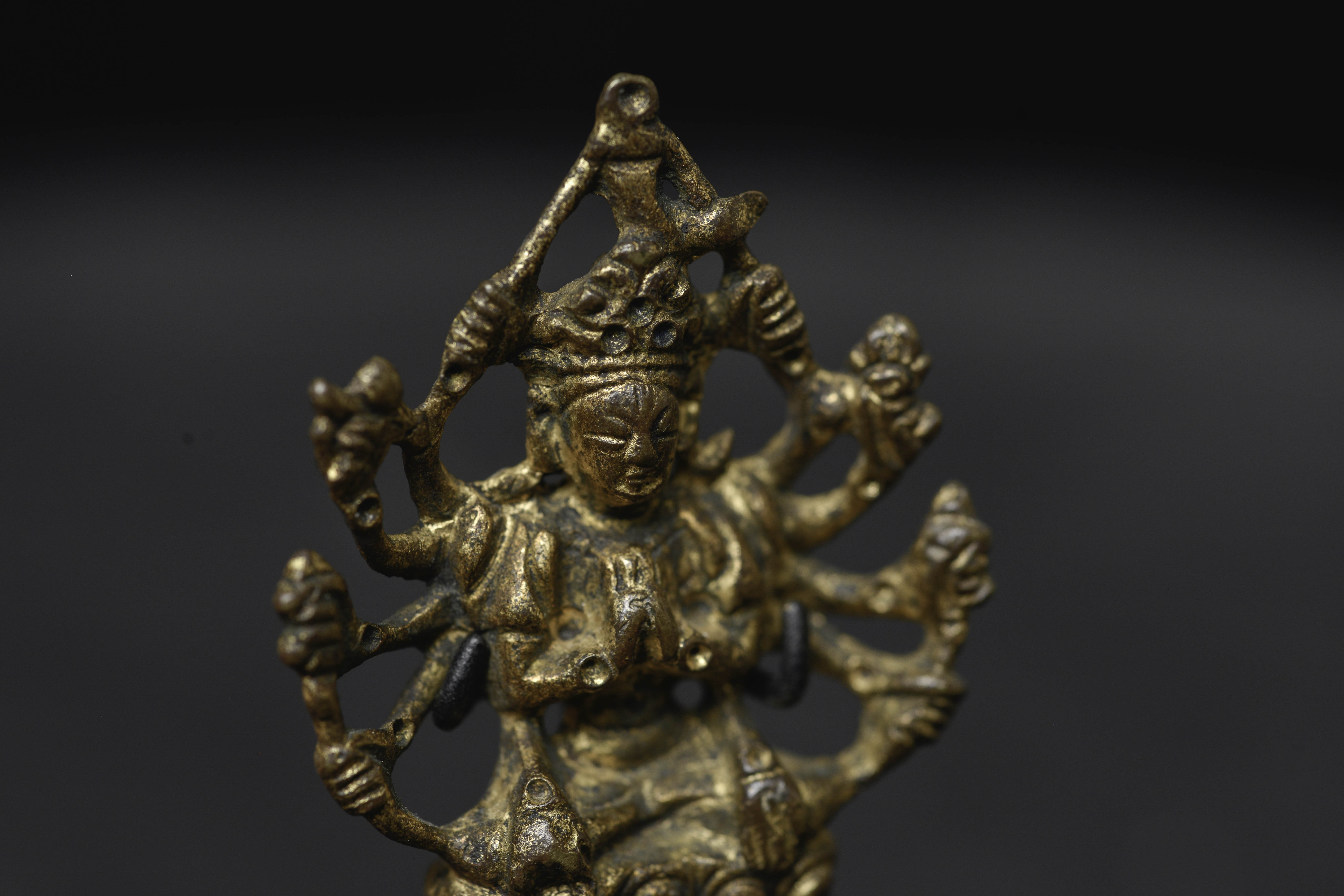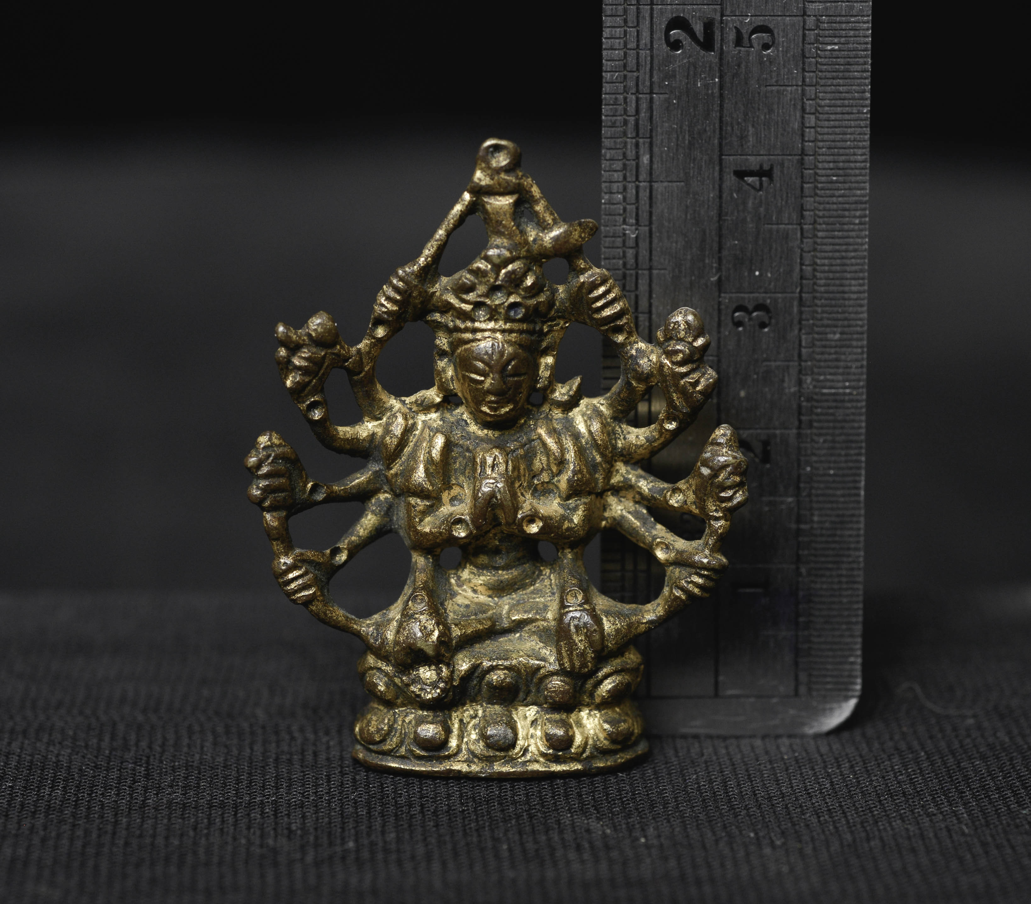 Multi-arm antique Chinese Gilded Bronze Miniature Bodhisattva. Probably 18thC. ( 1.75"H x 1.5"W x .5"D ) - 30g. - Base ( 1.5"W x .75"H )