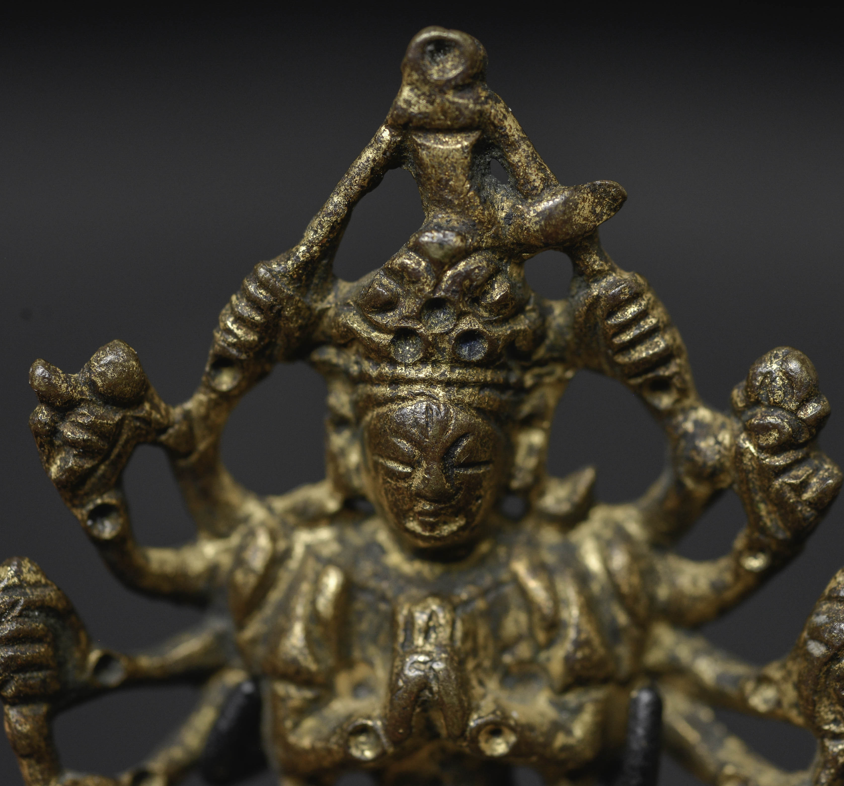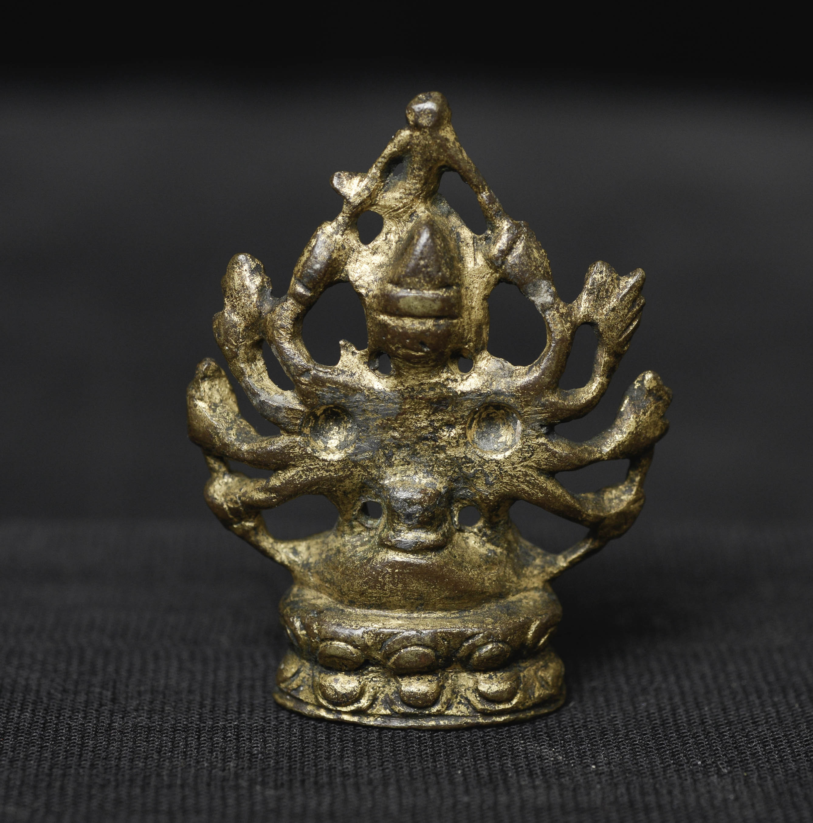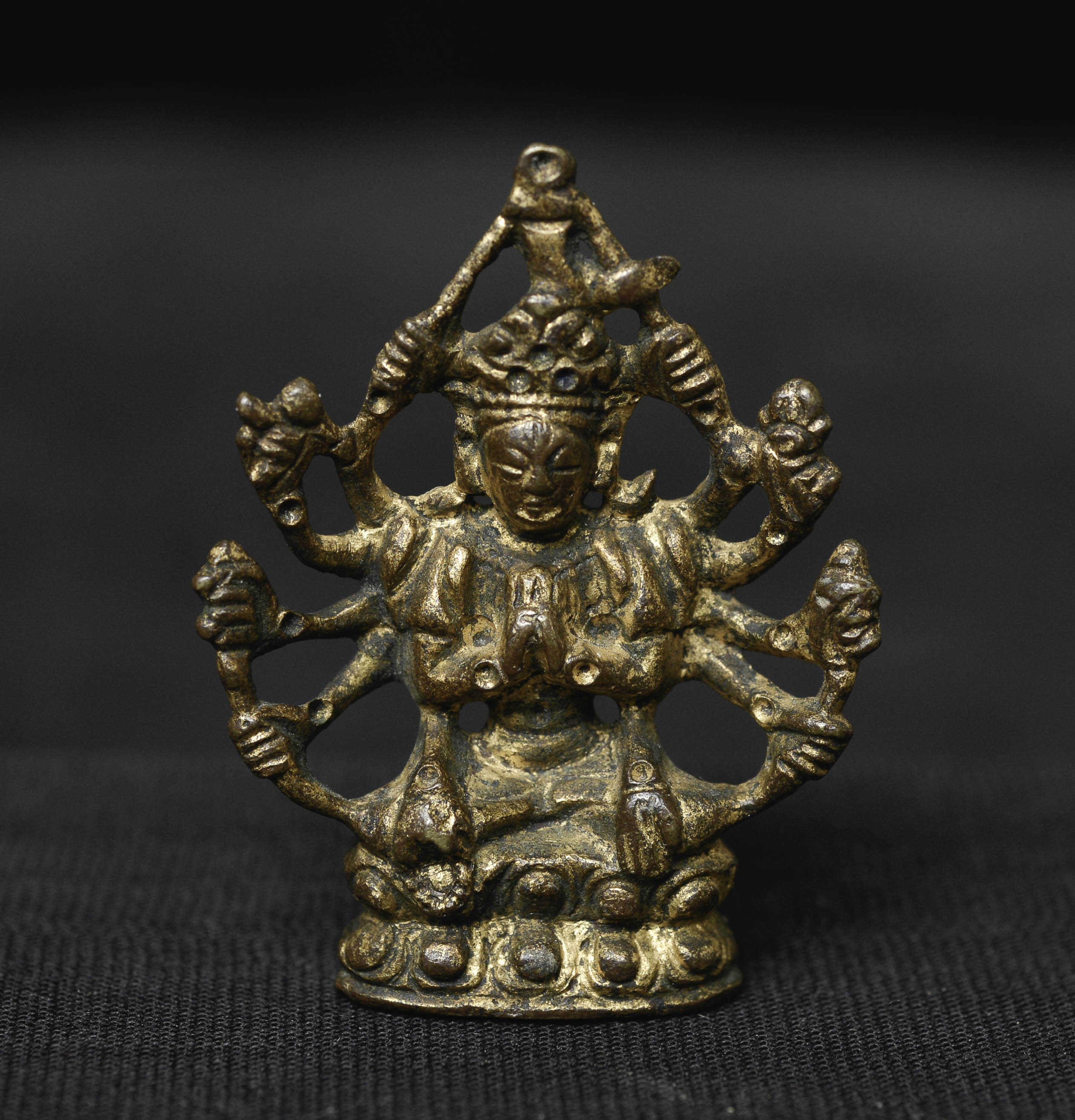 Multi-arm antique Chinese Gilded Bronze Miniature Bodhisattva. Probably 18thC. ( 1.75"H x 1.5"W x .5"D ) - 30g. - Base ( 1.5"W x .75"H )