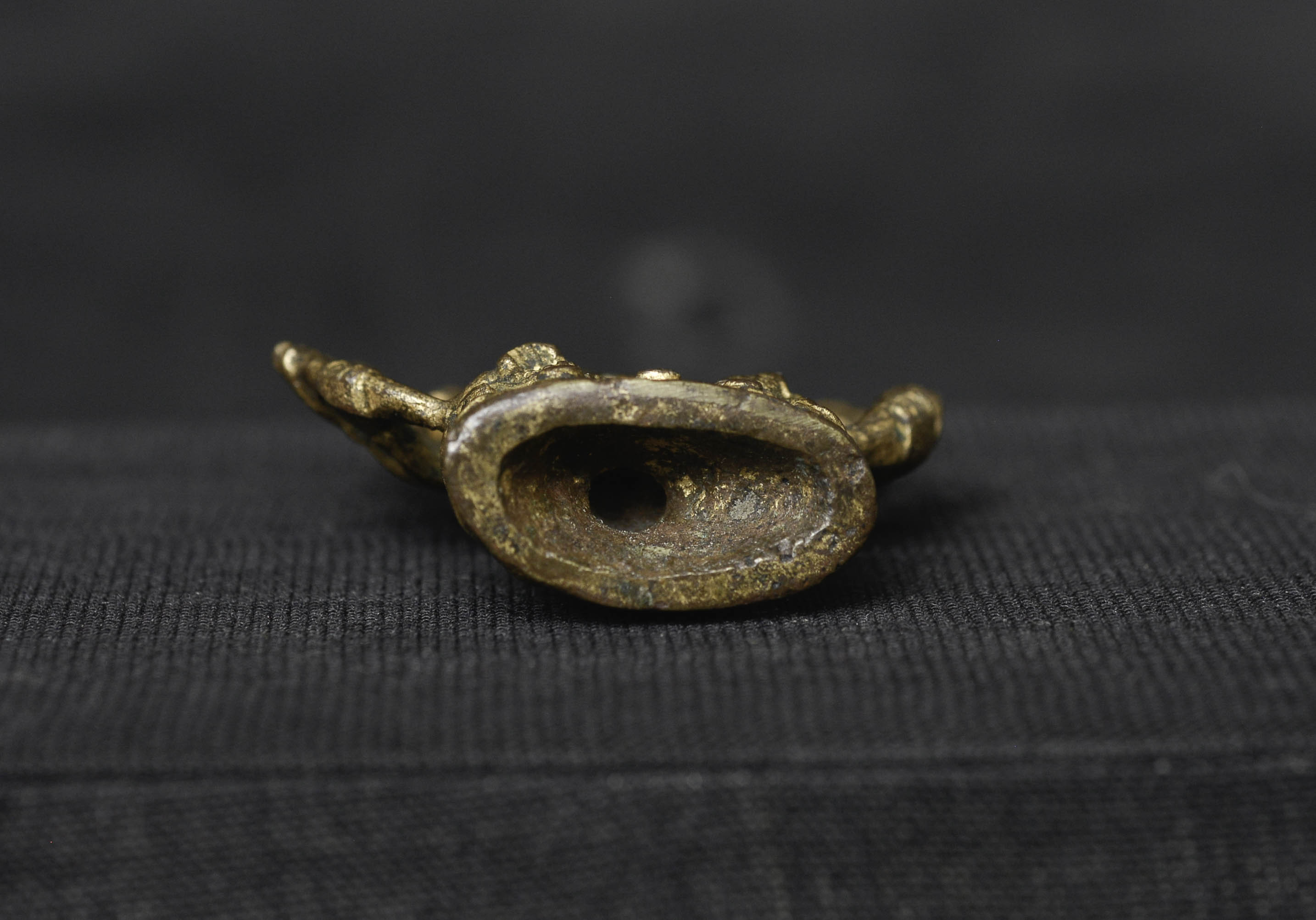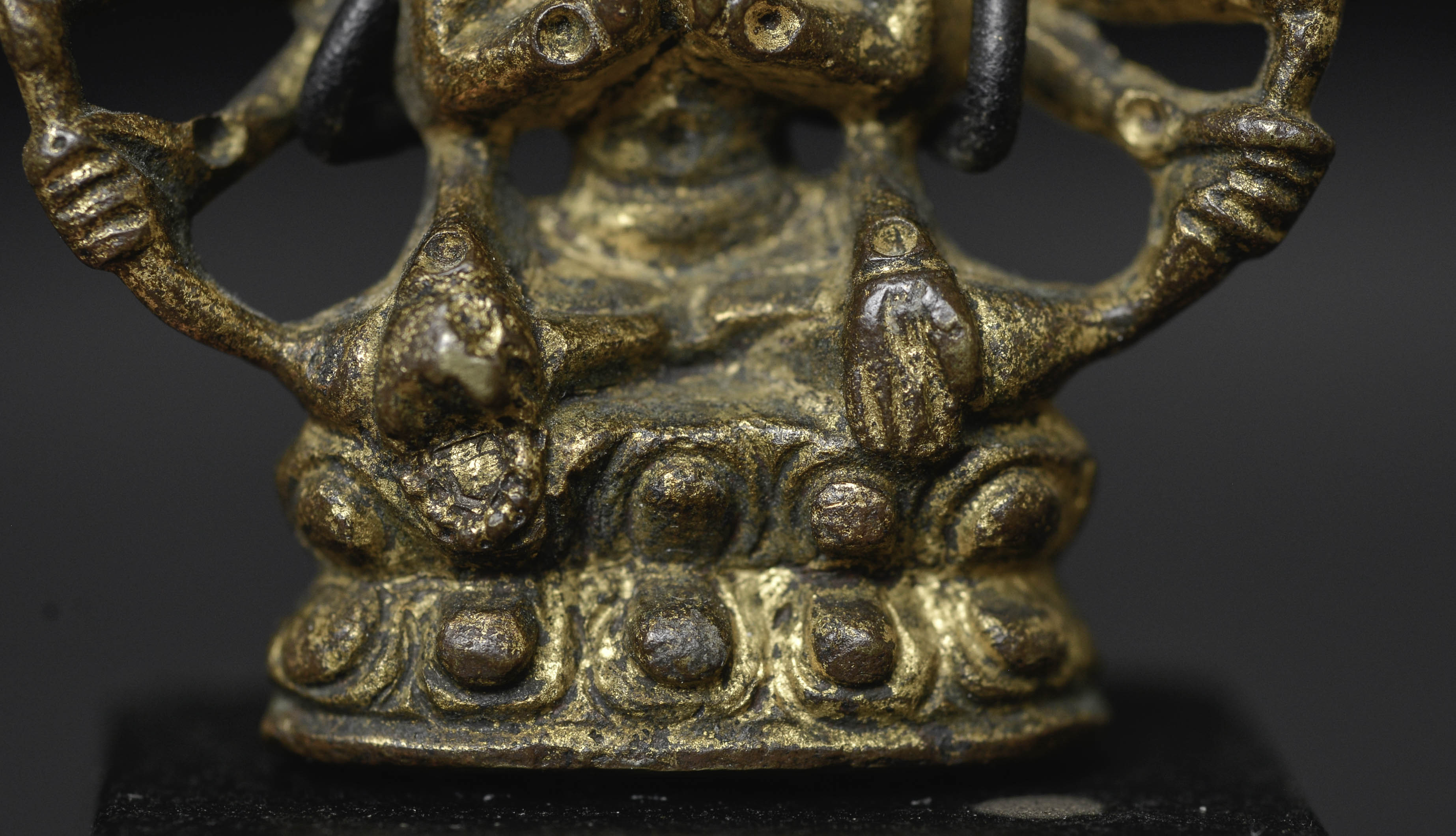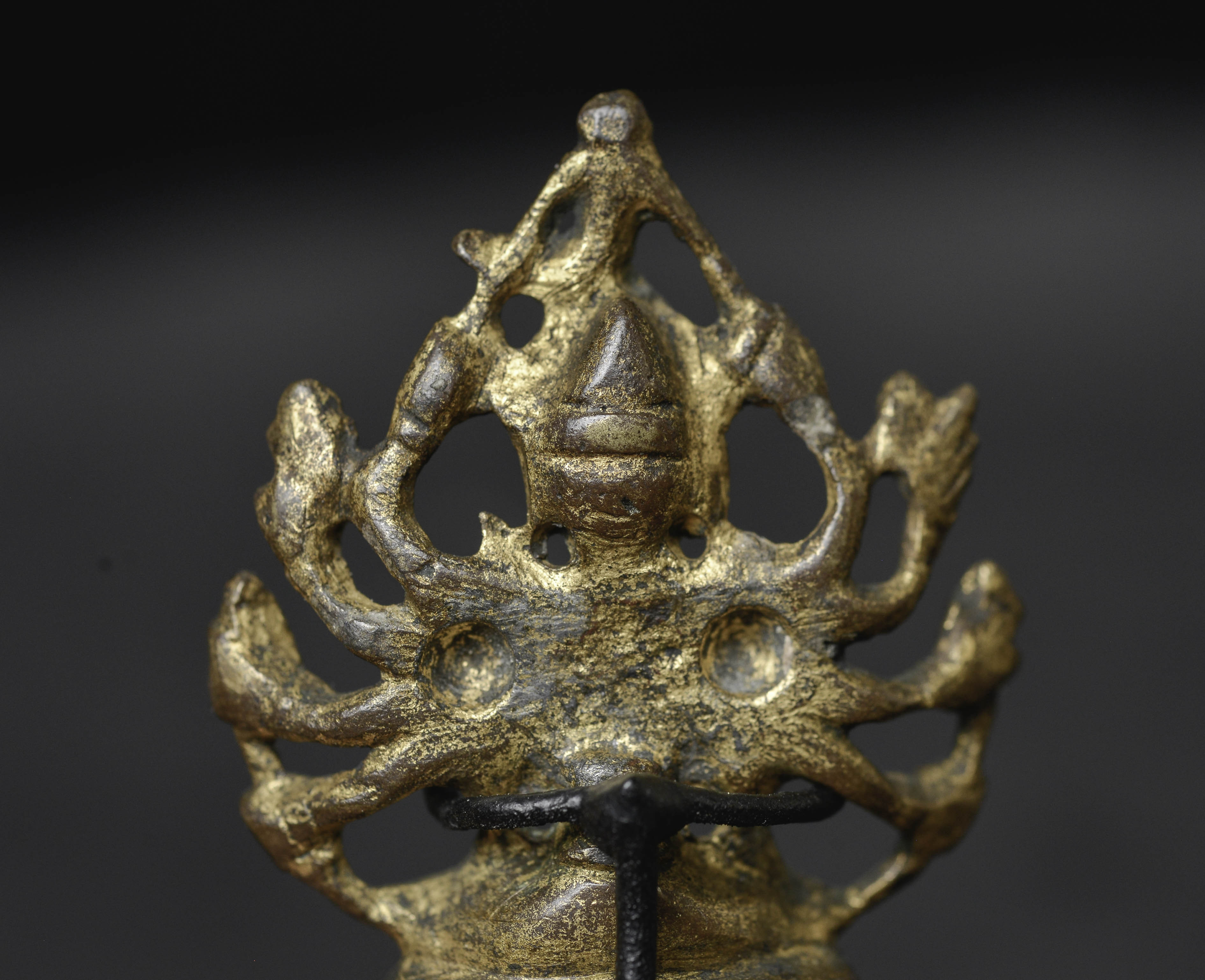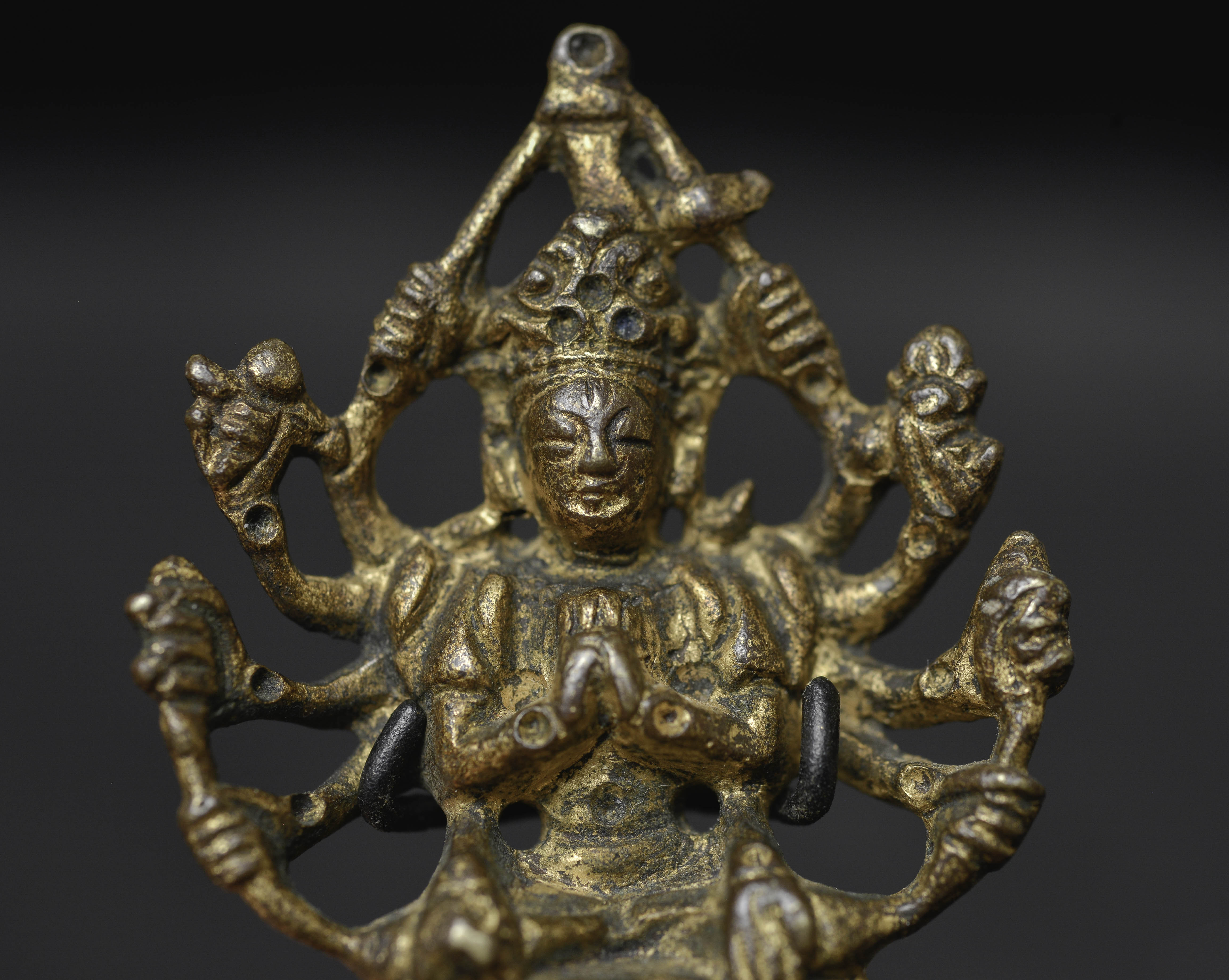 Multi-arm antique Chinese Gilded Bronze Miniature Bodhisattva. Probably 18thC. ( 1.75"H x 1.5"W x .5"D ) - 30g. - Base ( 1.5"W x .75"H )