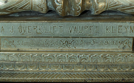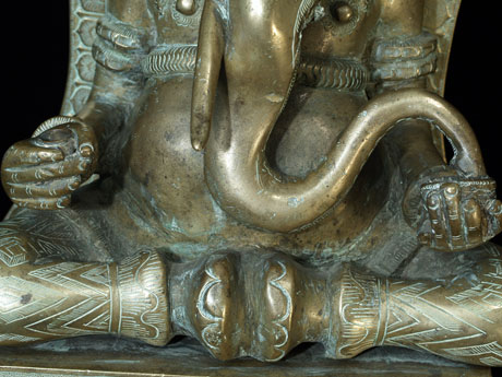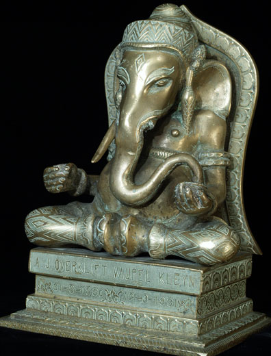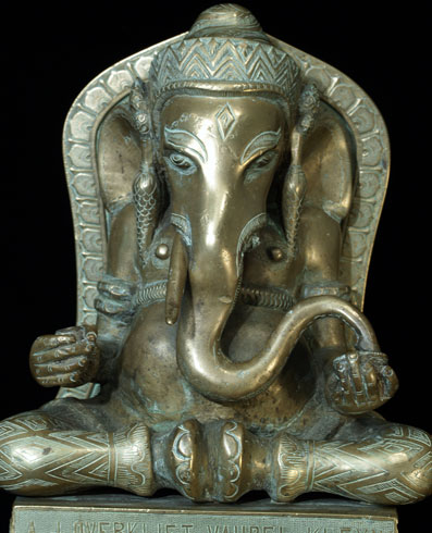 Large, magnificent Ganesh. As imposing and powerful as any I have owned. It has an inscription indicating that it was given in memoriam for A.J.Overklift Vaupel Kleyn, in 1931, and was obviously made sometime before that. He was almost certainly made in Imperial India, and it has strong Art Deco influence, with very fine architectual design work covering the base, back-plate, legs, and a crown. The amalgam of east and west in a finely made Indian bronze Hindu sculpture is both uncommon and highly desirable. He is large; the dimensions are 9.75 all by close to 7 inches wide by 5.25 inches deep. He seems much larger than the dimensions convey. As he is solid cast he weighs an incredible 22 to 23 pounds (think bowling ball). No one I’ve shown him to has ever seen anything like him. She sculpting casting, and detail are all superb. The face is expressive, which is quite hard to do with a Ganesh.