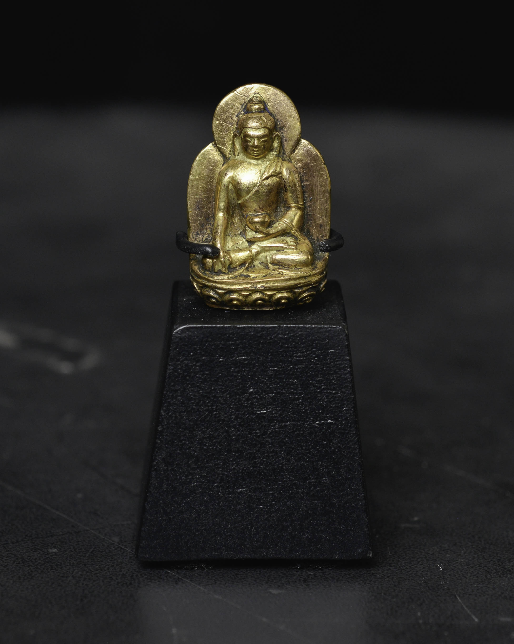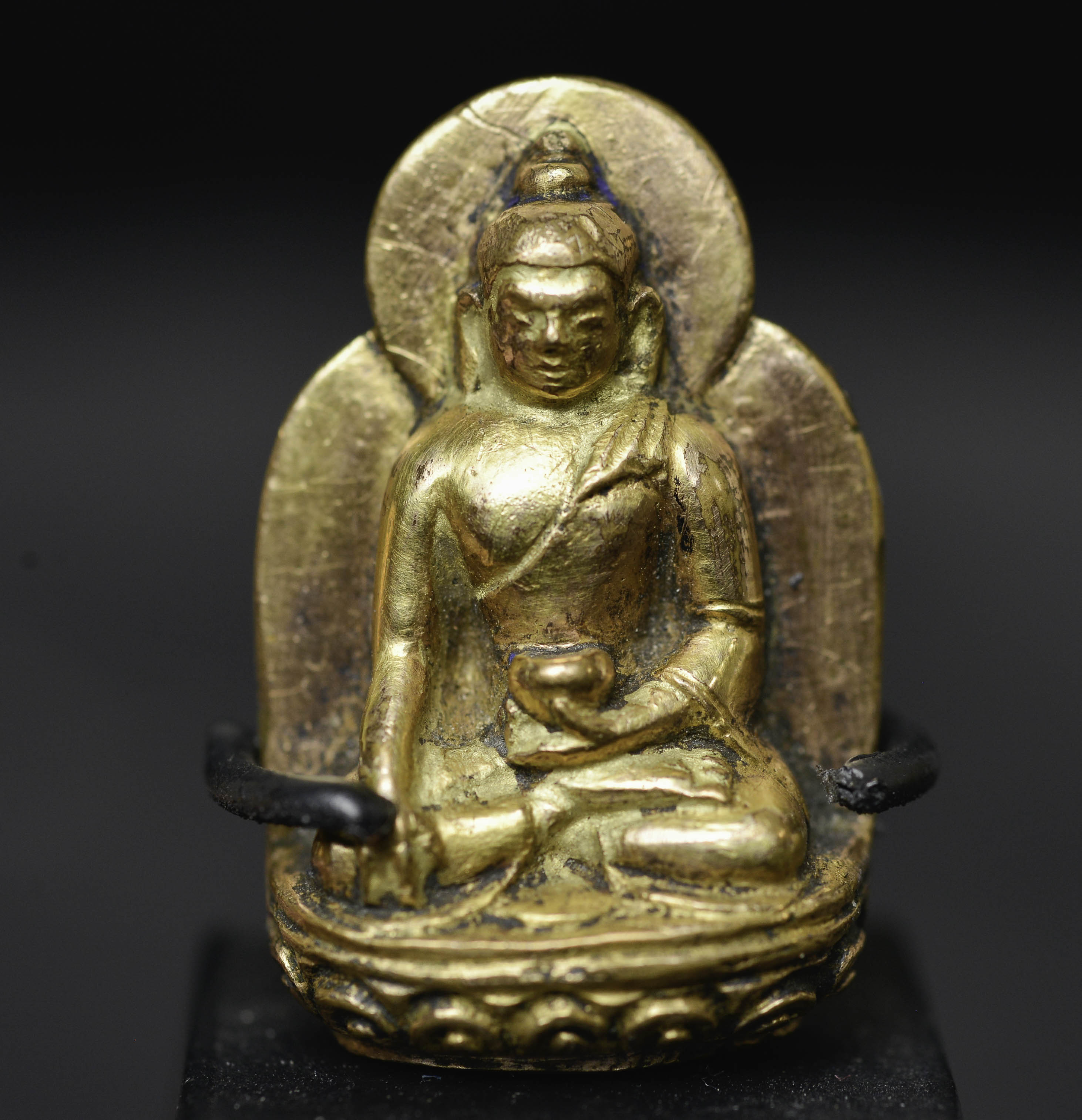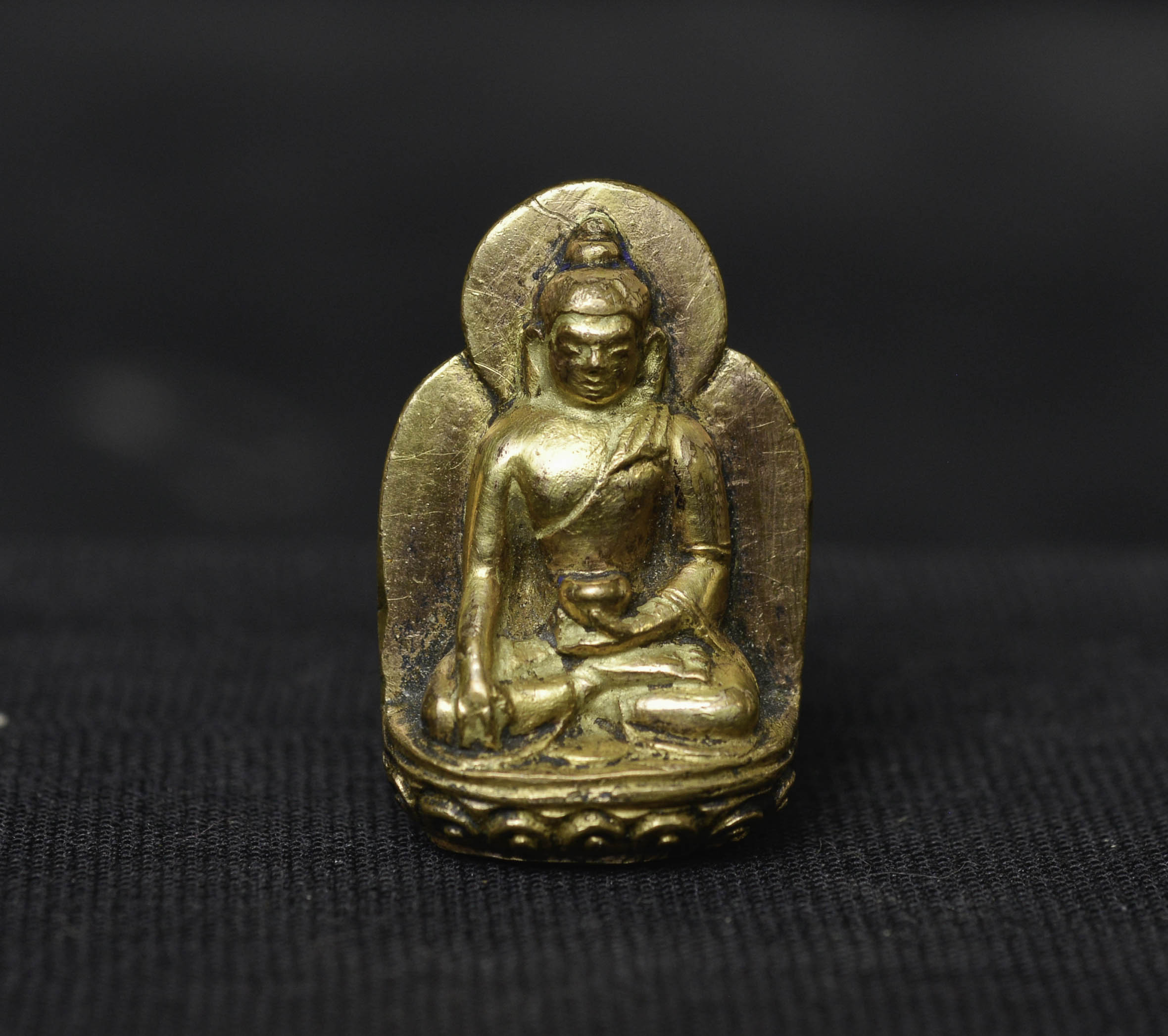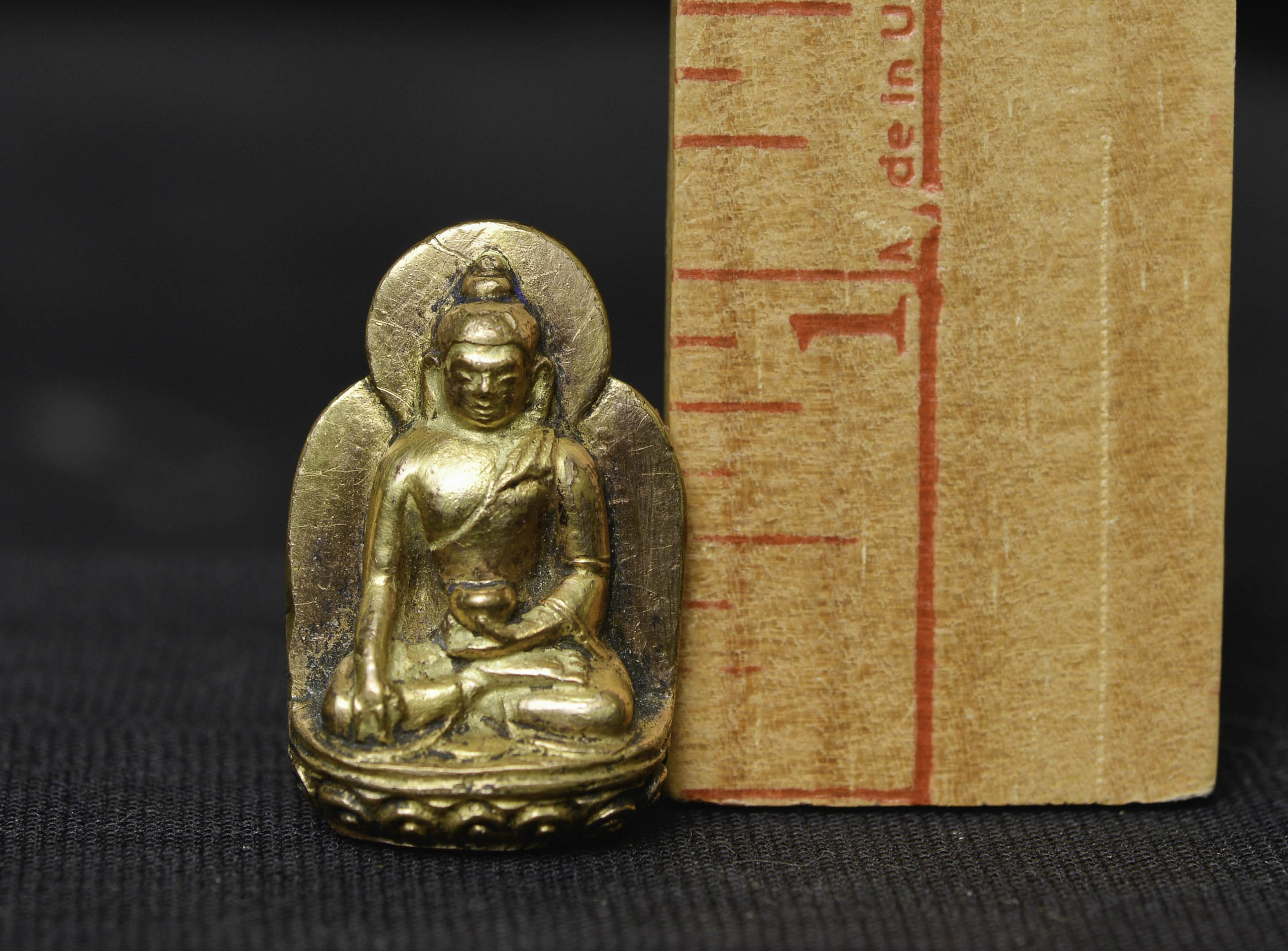 Beautiful 18thC solid-cast miniature Tibetan medicine Buddha. Solid gilt bronze or copper alloy/ with a possible mix of silver and/or gold. (The previous owner believed there was gold and or silver in the alloy due to weight and feel. Never been tested). Likely an attribute from the hand of a larger sculpture. Remarkable at only 1 3/8 inches tall, 2.5 inches on its custom stand. Likely 17/18thC - ( 1.125"H x .75"W x .375"D ) - item only 15g. with base 30g.
