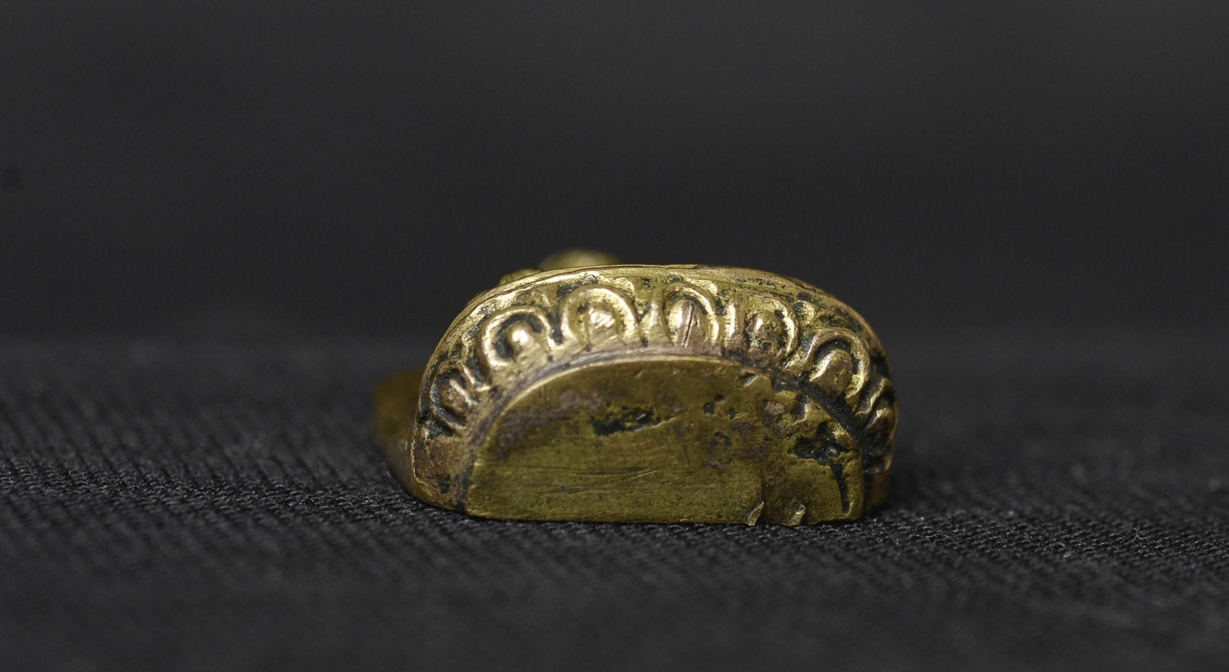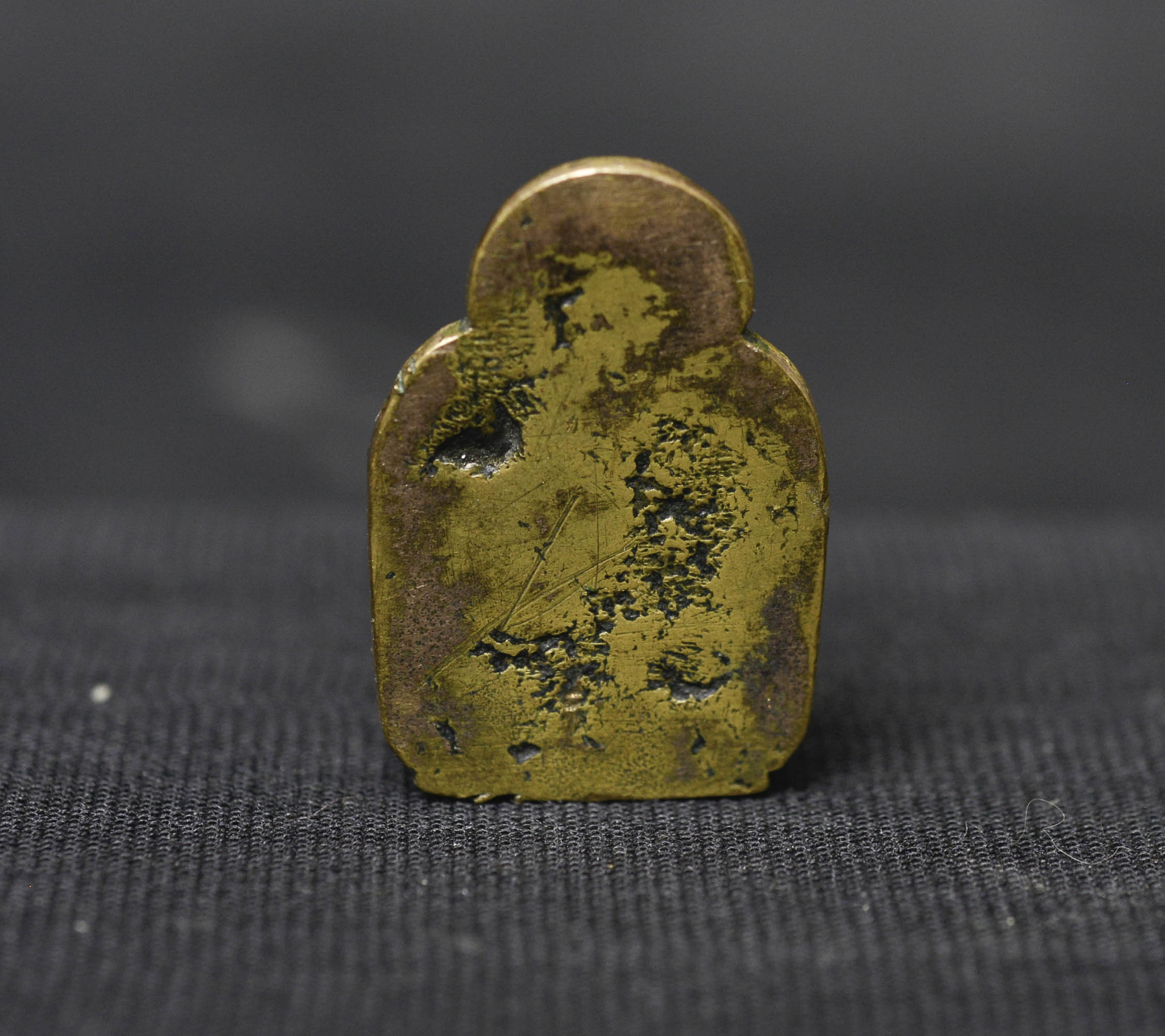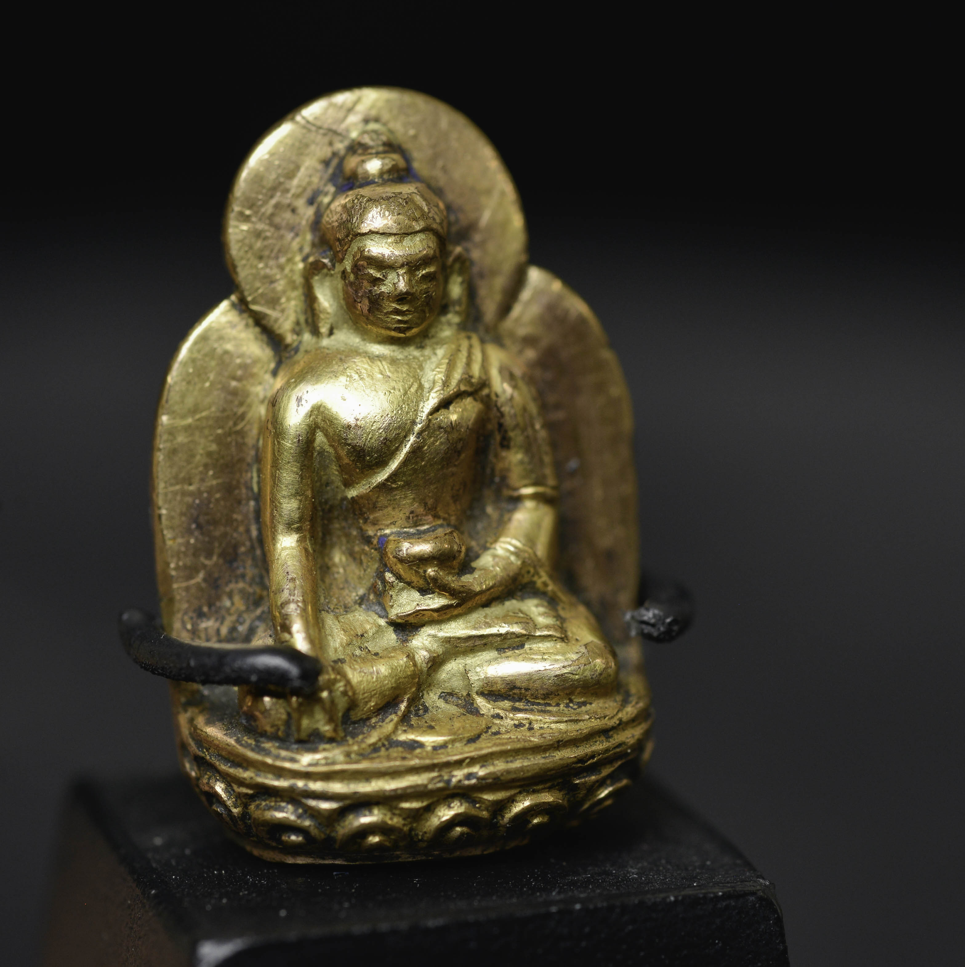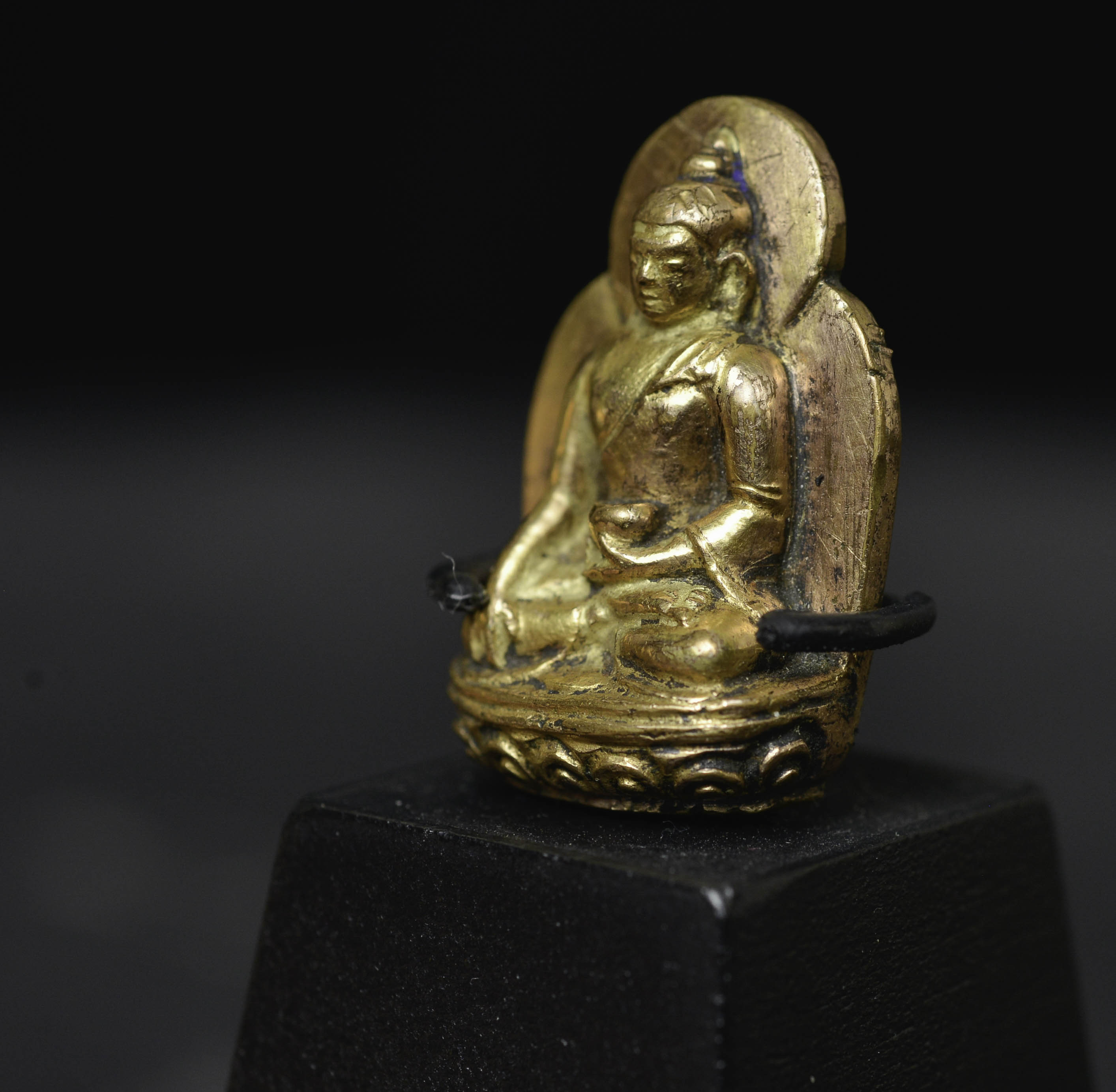 Beautiful 18thC solid-cast miniature Tibetan medicine Buddha. Solid gilt bronze or copper alloy/ with a possible mix of silver and/or gold. (The previous owner believed there was gold and or silver in the alloy due to weight and feel. Never been tested). Likely an attribute from the hand of a larger sculpture. Remarkable at only 1 3/8 inches tall, 2.5 inches on its custom stand. Likely 17/18thC - ( 1.125"H x .75"W x .375"D ) - item only 15g. with base 30g.