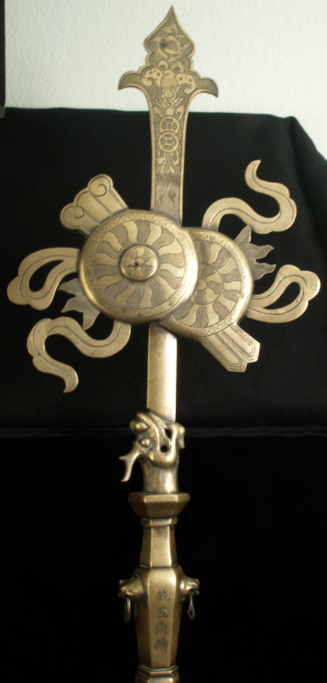 This is a true temple sized piece. I believe it is made to go on a pole and would have probably been taller than human height when assembled. I've been told variously that it is one of the 8 auspicious symbols and that this would have been with 7 others, and alternatively that it is not actually an auspicious symbol (it would be the wheel of the law), but more of a double sun symbol, which is far more esoteric. I have also been told that it was 18th or 19th C- it looks quite old: I do not know how to date this or read the inscription. Cast in several parts out of bronze or brass which are slightly loose, , but no damage or loss. This is a powerful, large and lovely Chinese or Sino-Tibetan authentic temple piece. Extremely large at 27 inches tall by 12 inches at its widest point, and quite heavy.