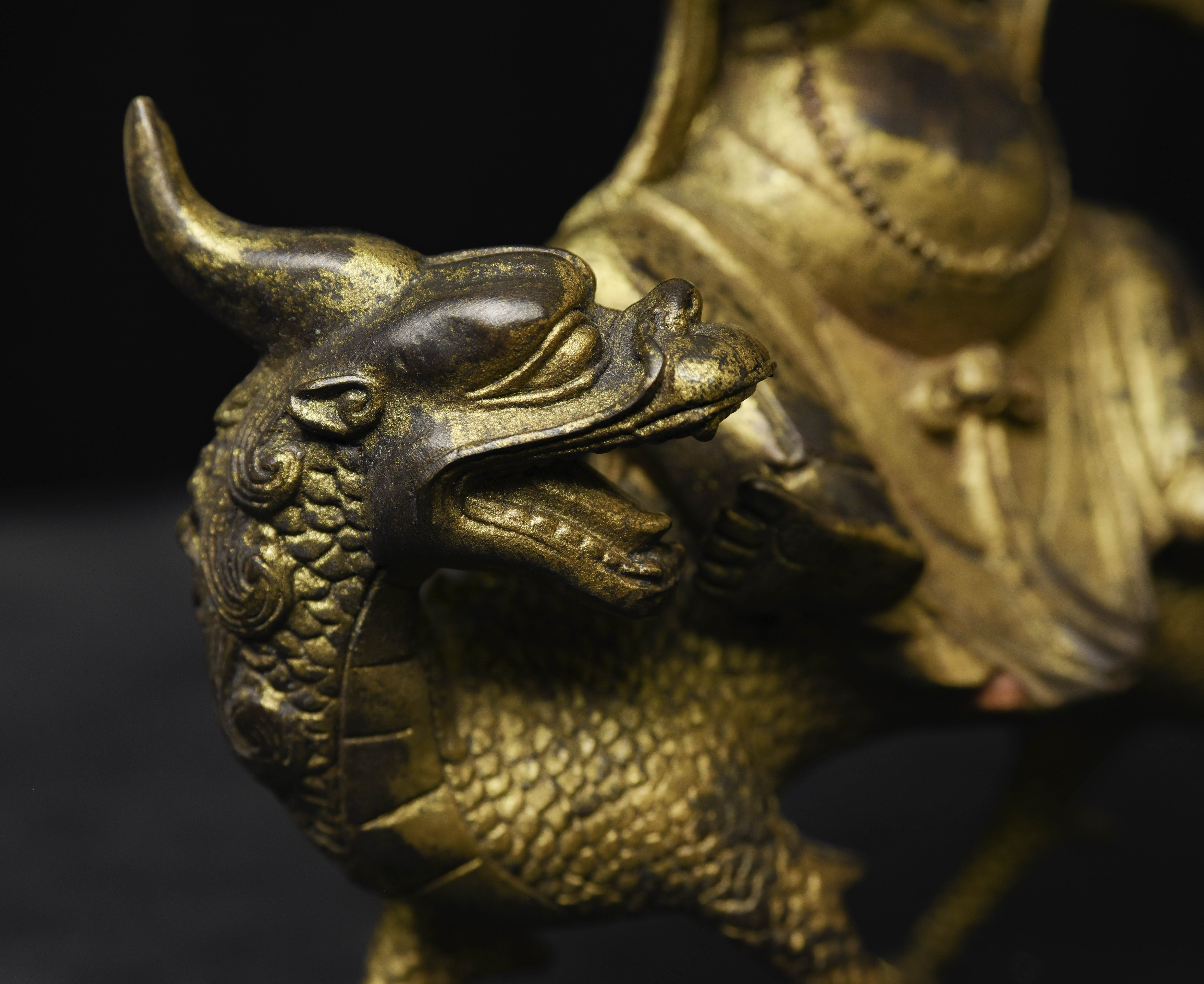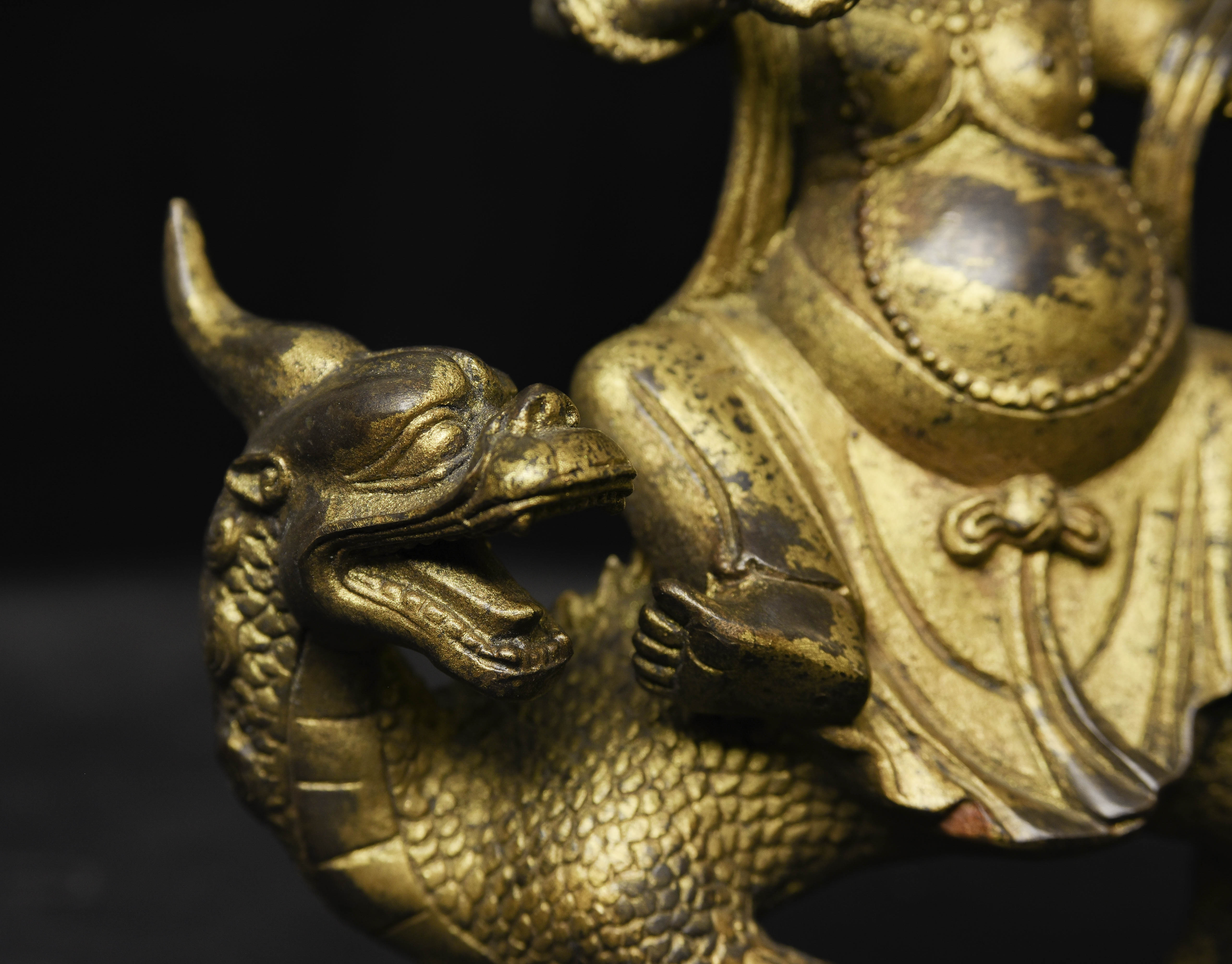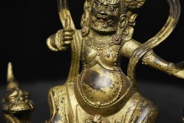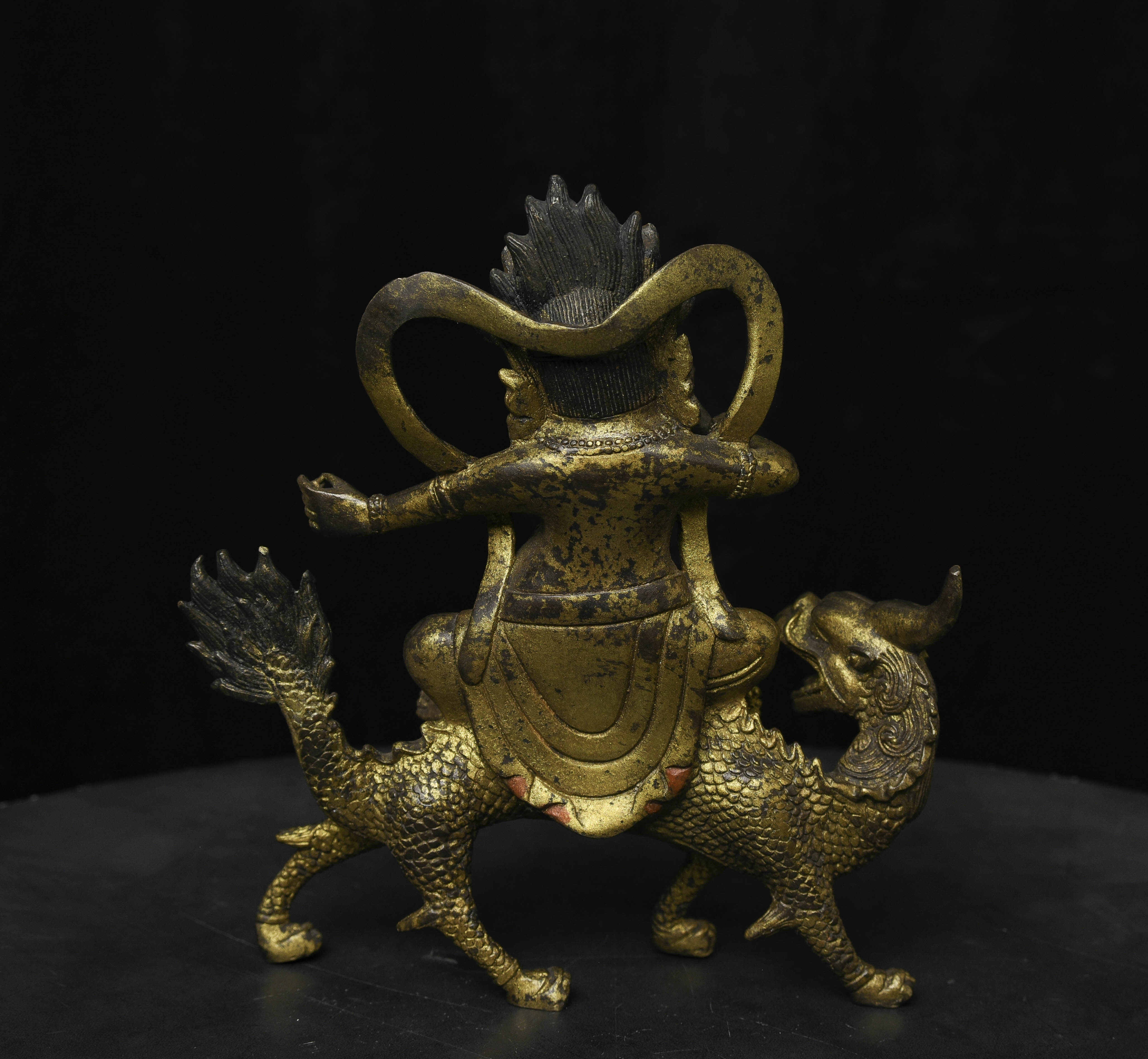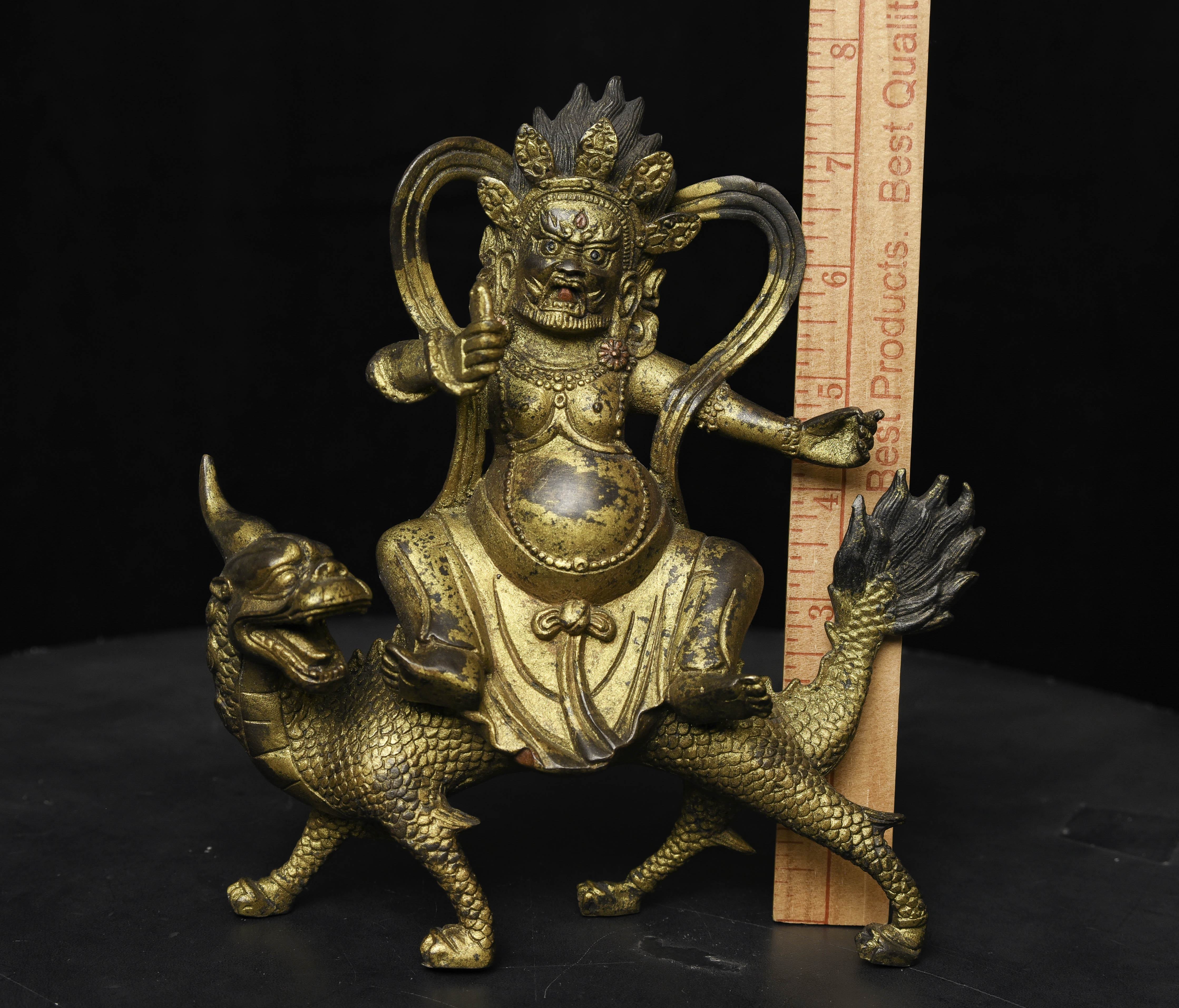 Fierce Tibetan bronze Deity on Dragon. See the photo with the ruler in it to determine the height. Quite animated. A powerful sculpture. 20thC, that manages to be as successful (or more so) as many closely related examples that were made much earlier.