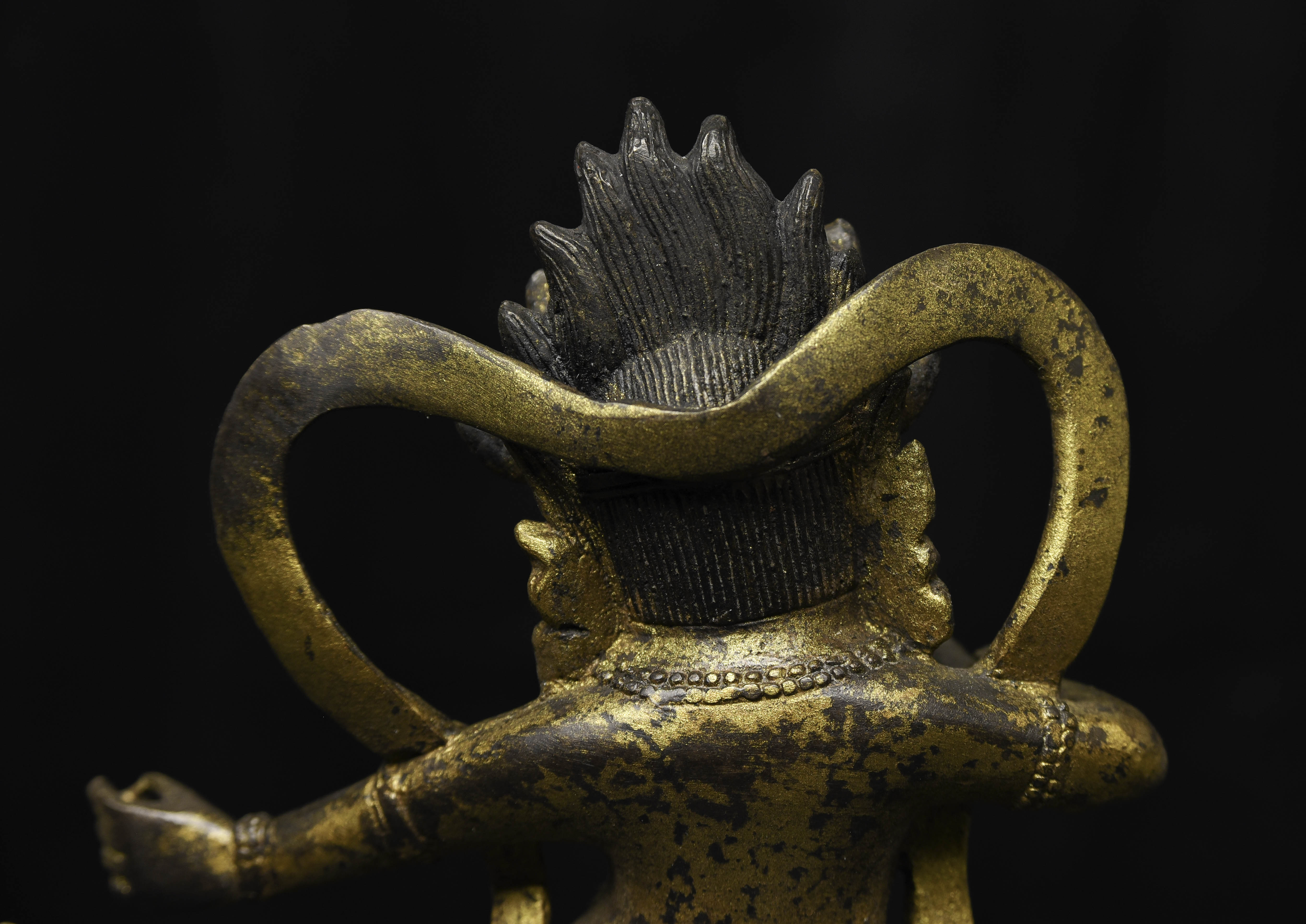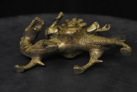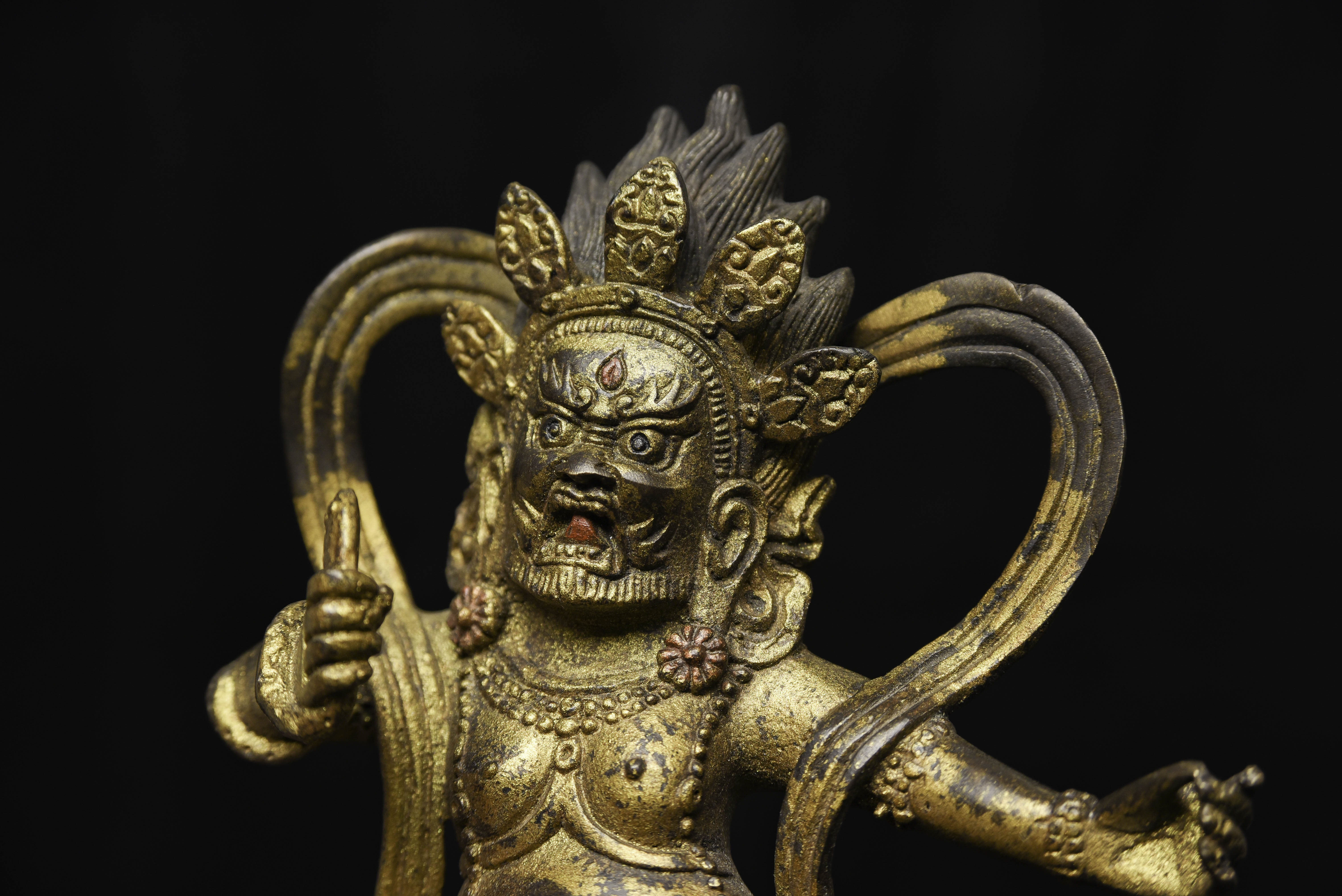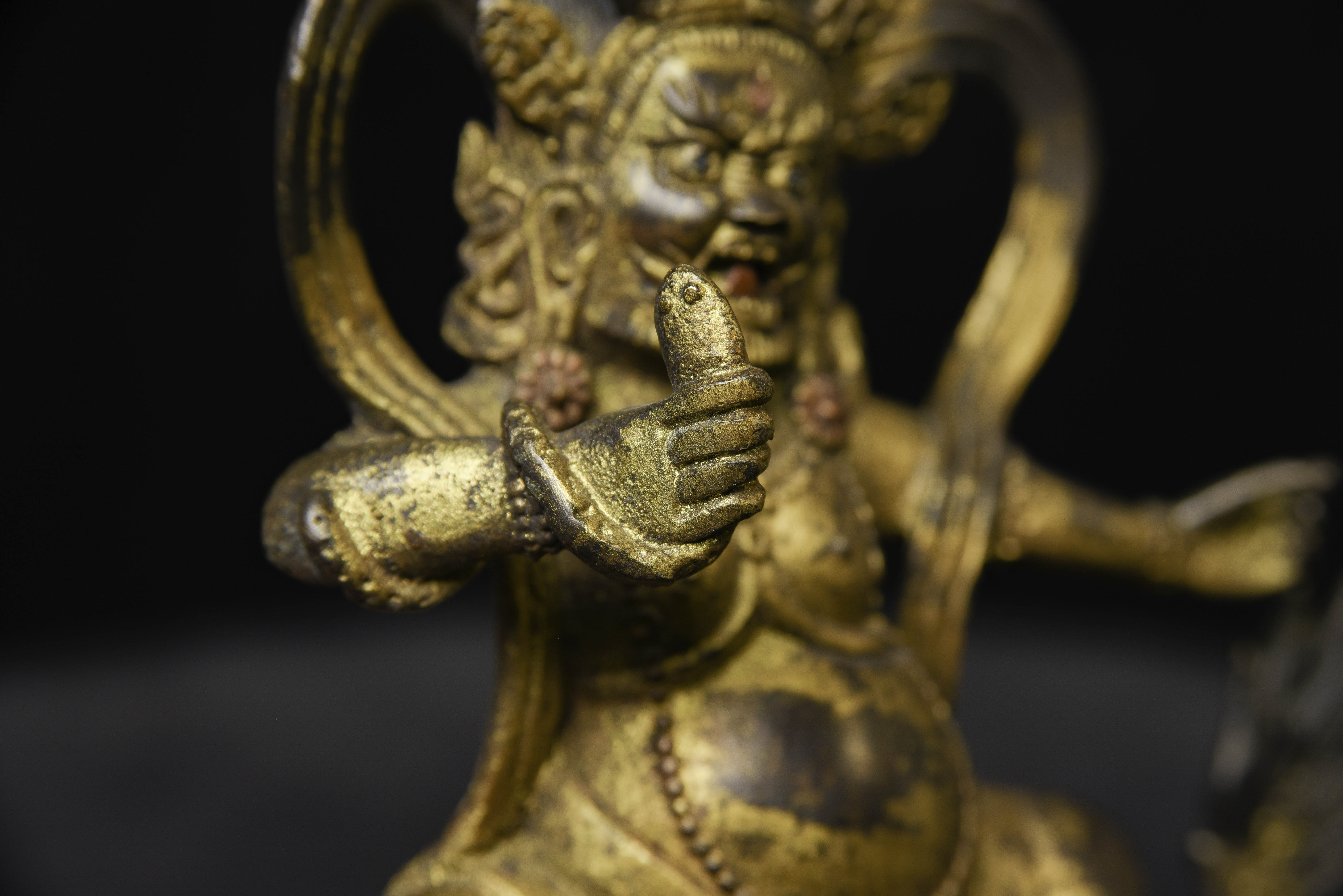 Fierce Tibetan bronze Deity on Dragon. See the photo with the ruler in it to determine the height. Quite animated. A powerful sculpture. 20thC, that manages to be as successful (or more so) as many closely related examples that were made much earlier.