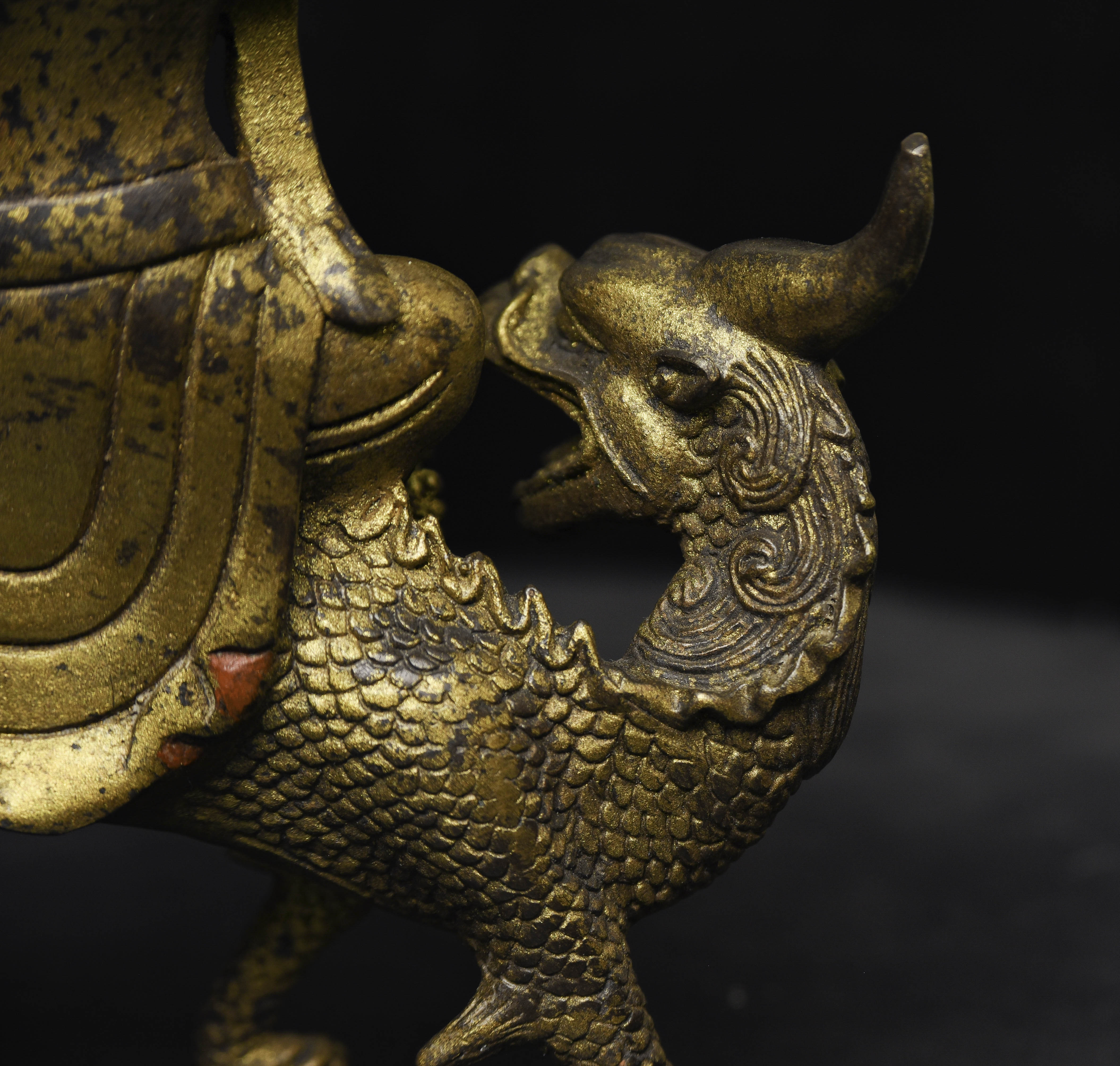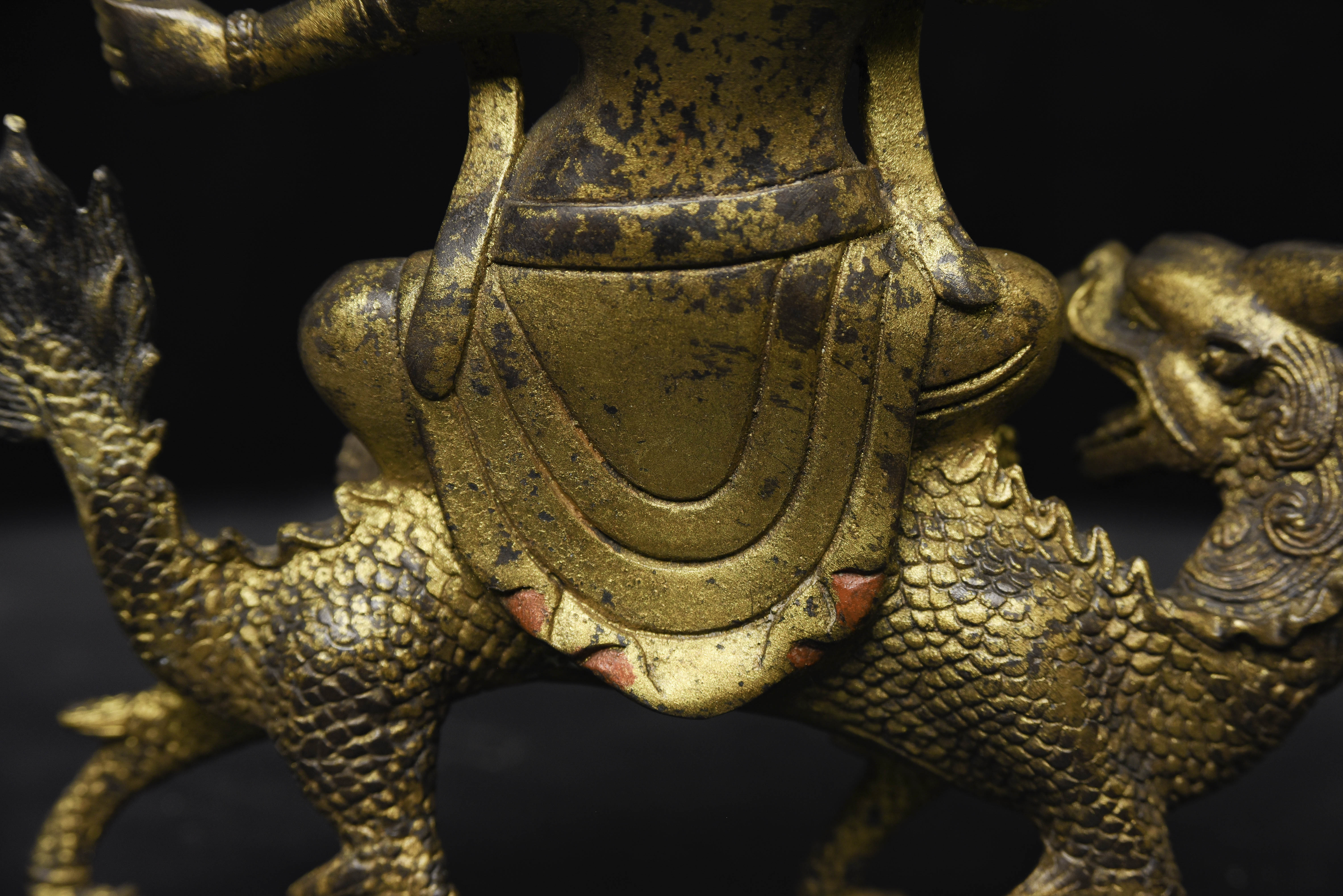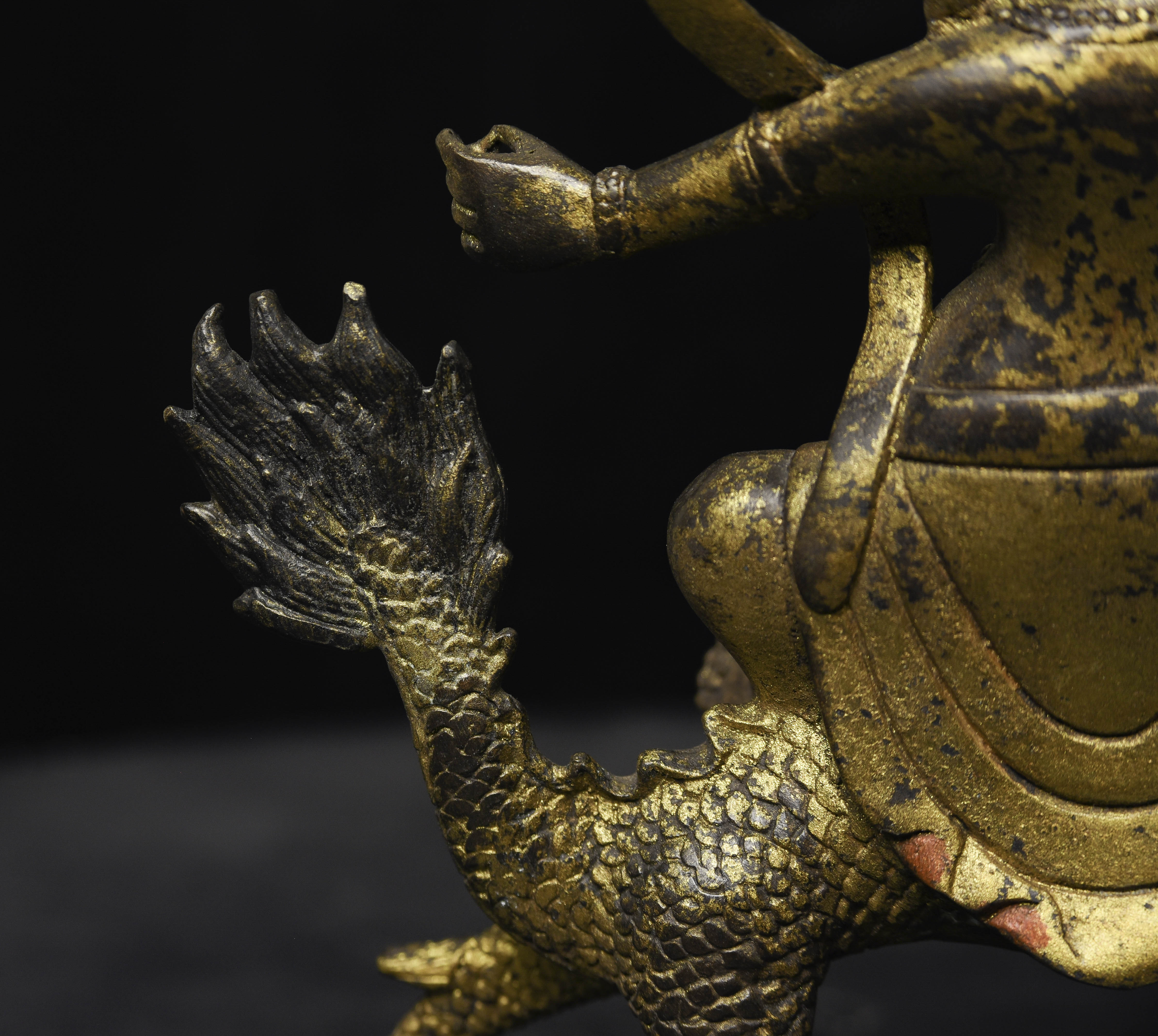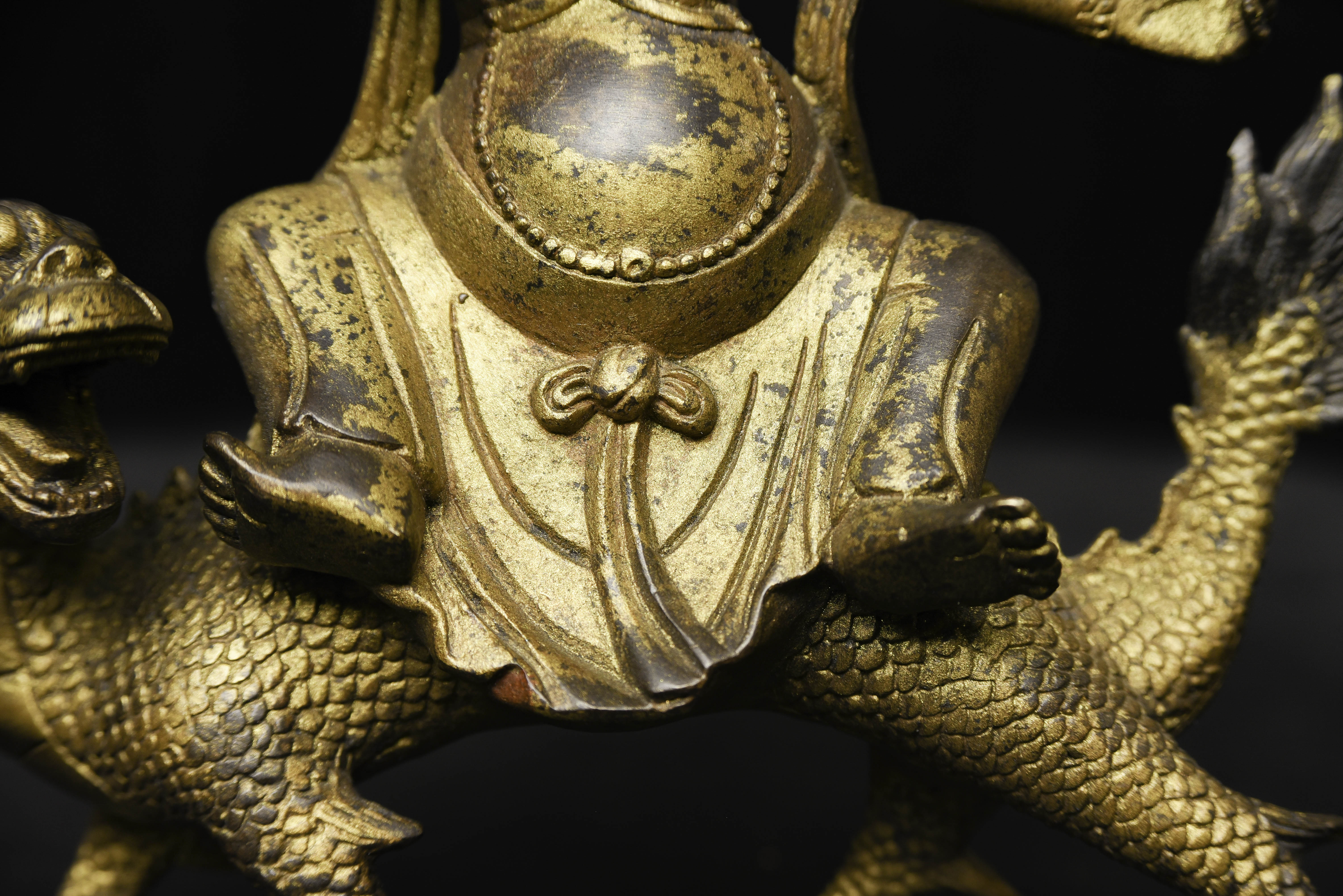 Fierce Tibetan bronze Deity on Dragon. See the photo with the ruler in it to determine the height. Quite animated. A powerful sculpture. 20thC, that manages to be as successful (or more so) as many closely related examples that were made much earlier.