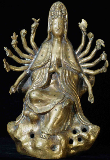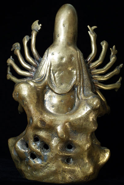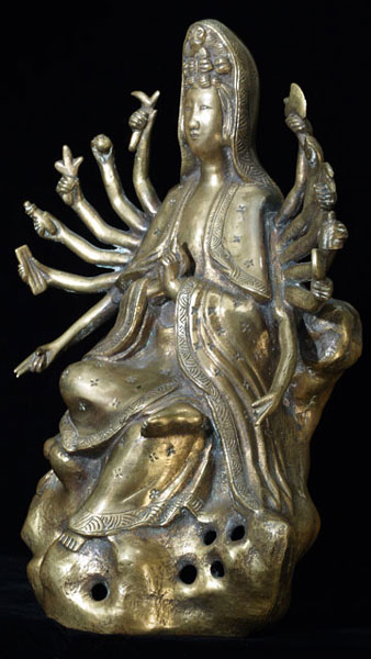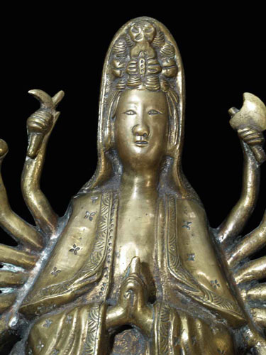 Very special bronze Quan Yin with a wonderful face, and a fantastic overall feel. Take a look- the pictures tell the story. A very good size at 13 inches tall by 8.5 inches wide at the widest point. Extremely heavy.