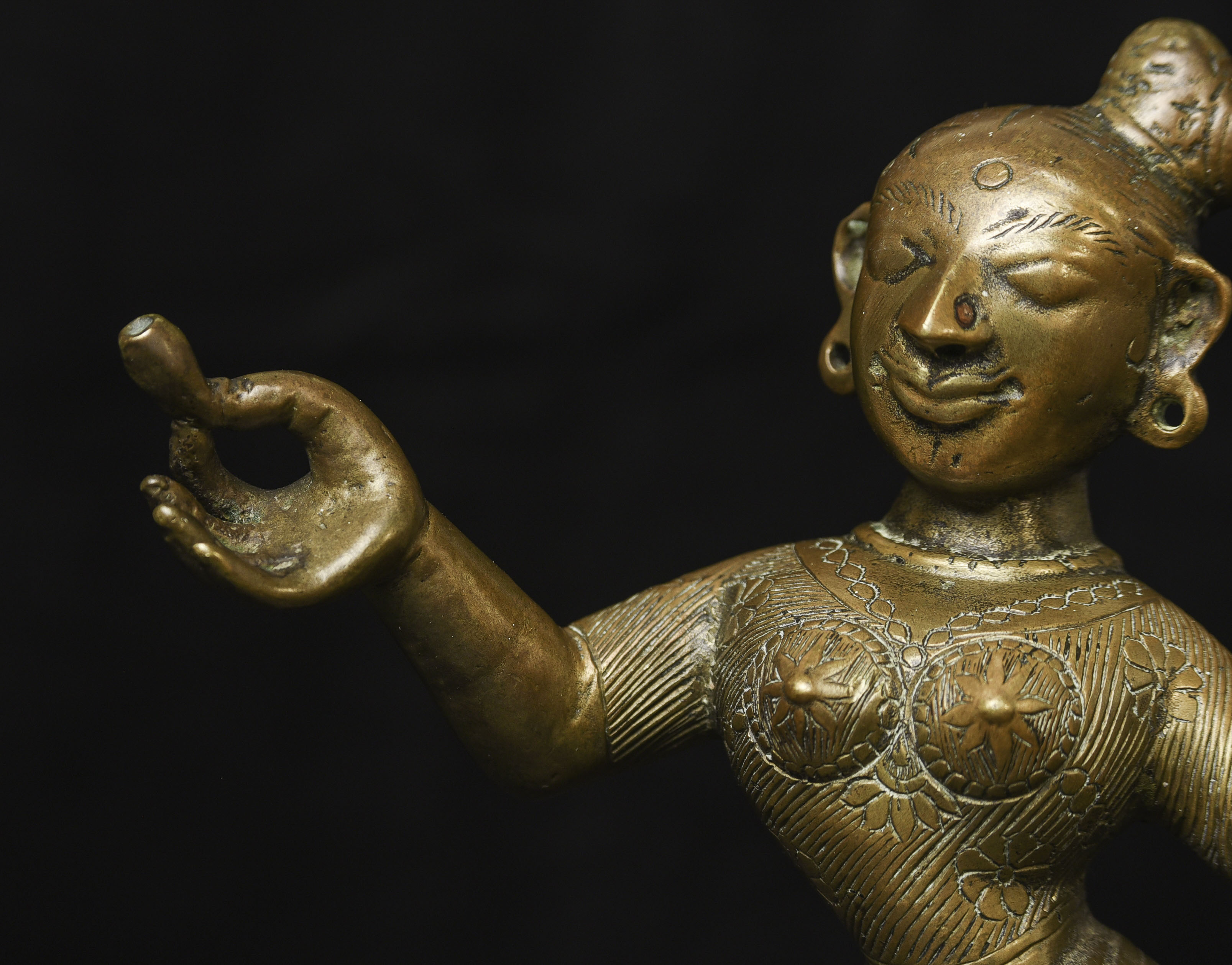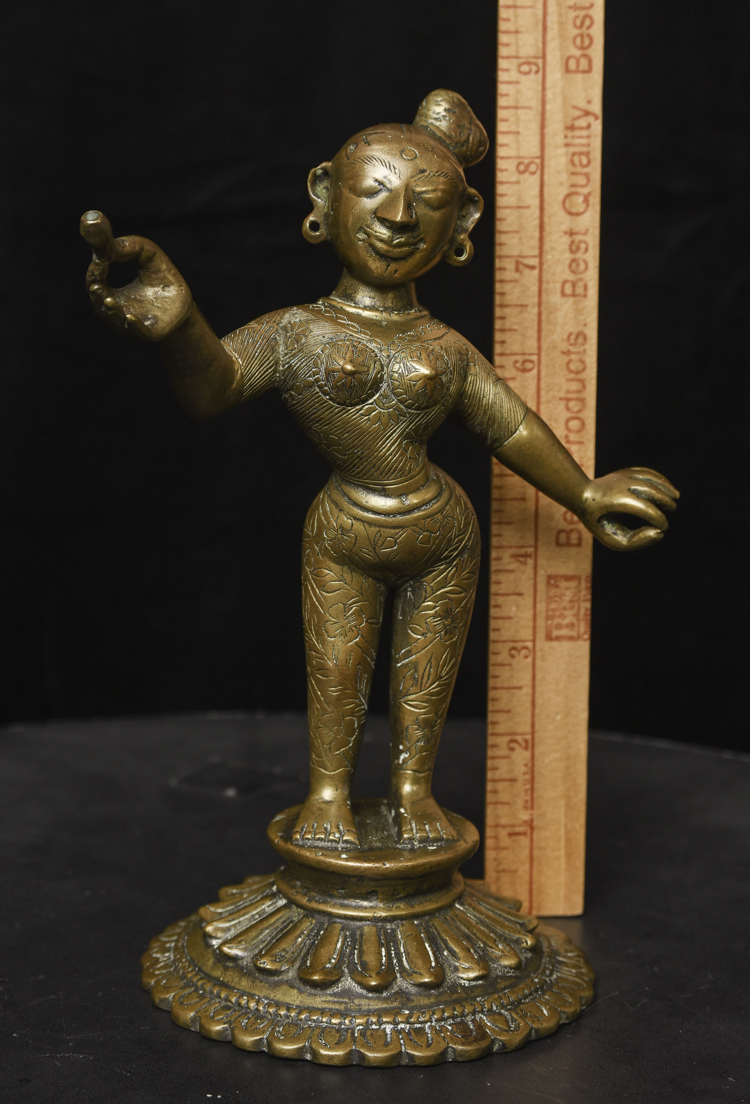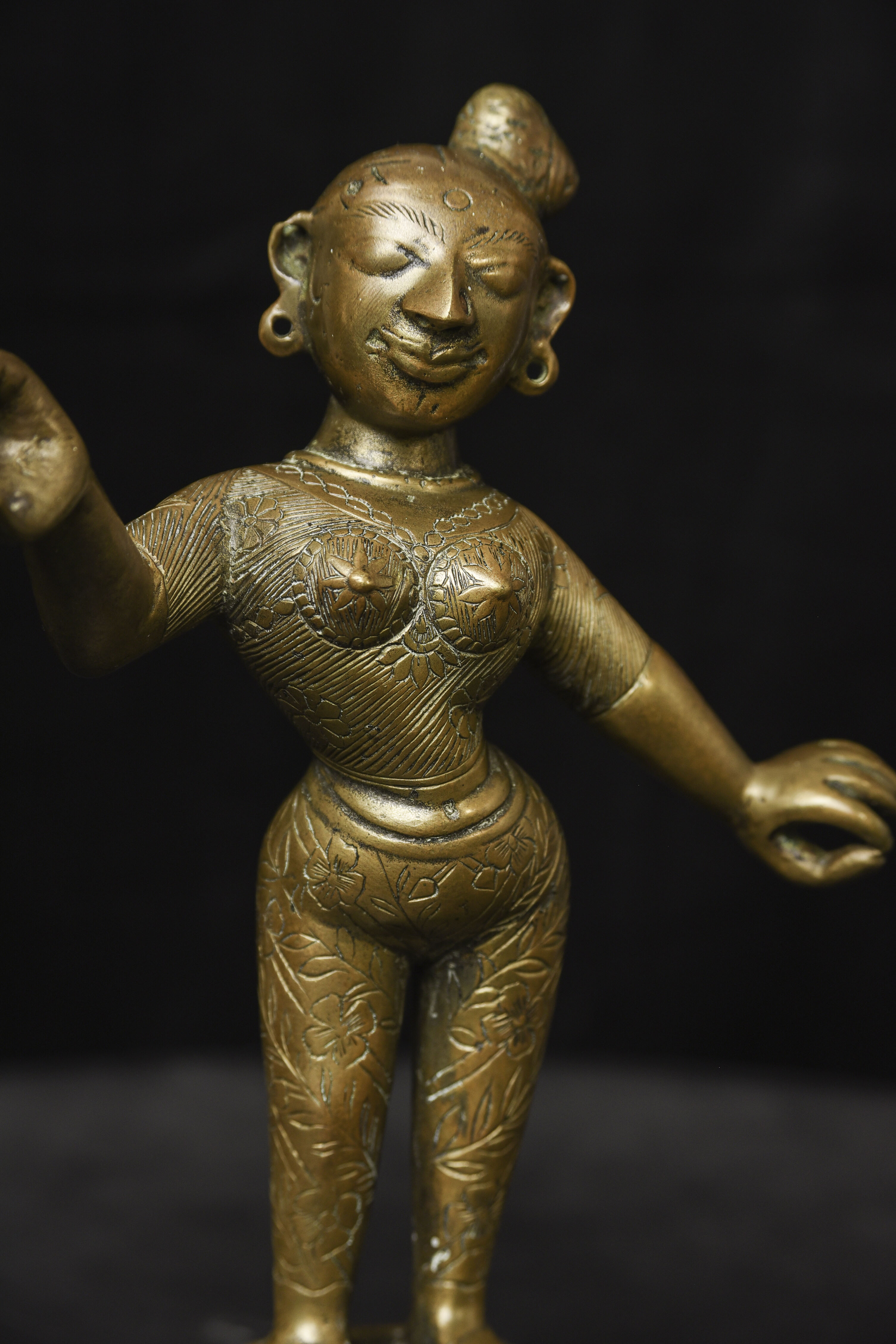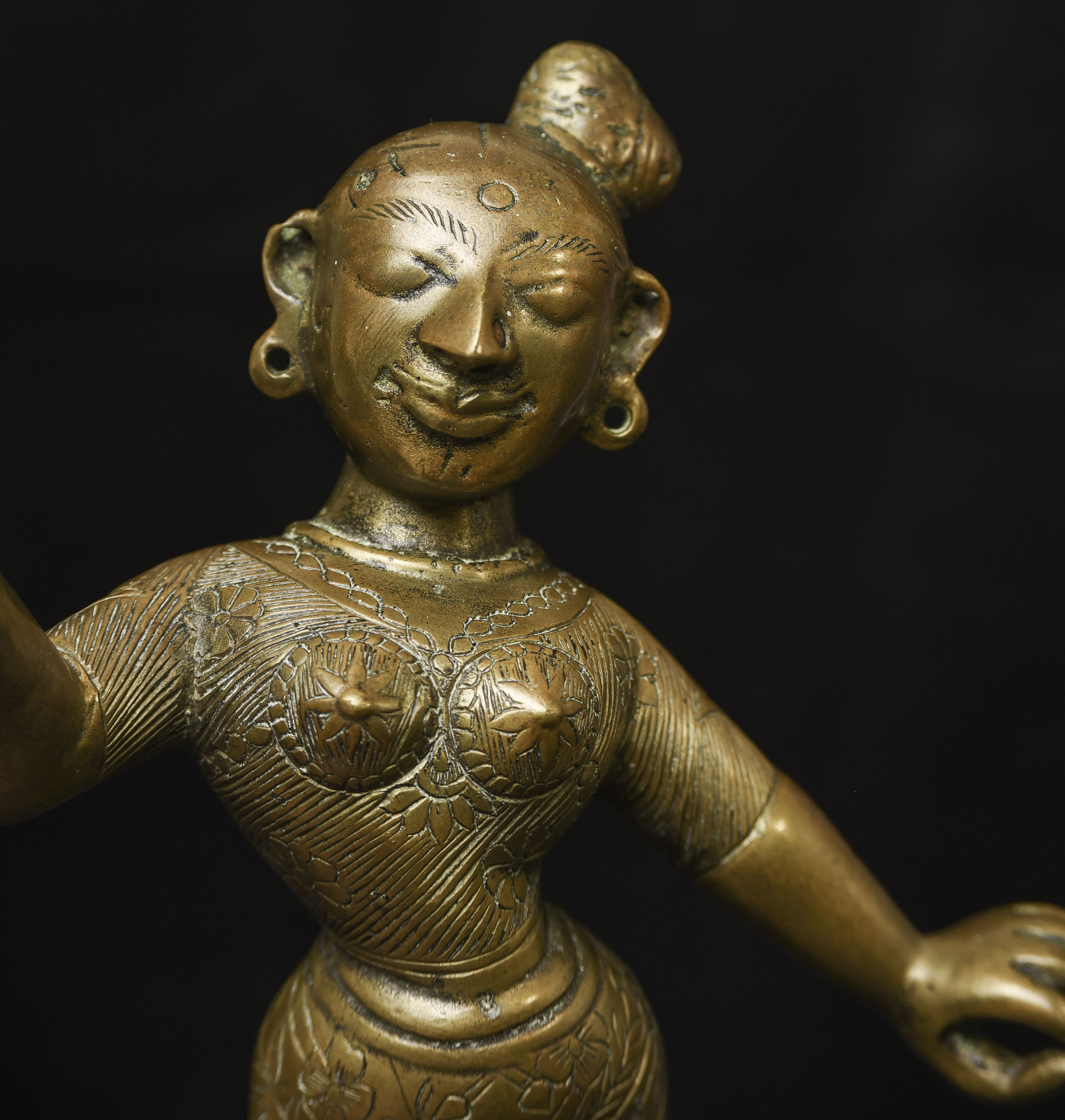 Large antique solid cast South Indian female deity covered with well incised elaborate design. Big beautiful smile. Good age. - (8.5"H x 6"W) - 3.76lbs / 1.705kg