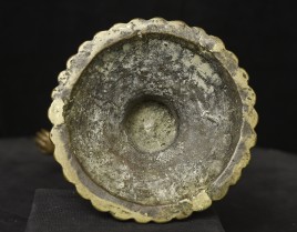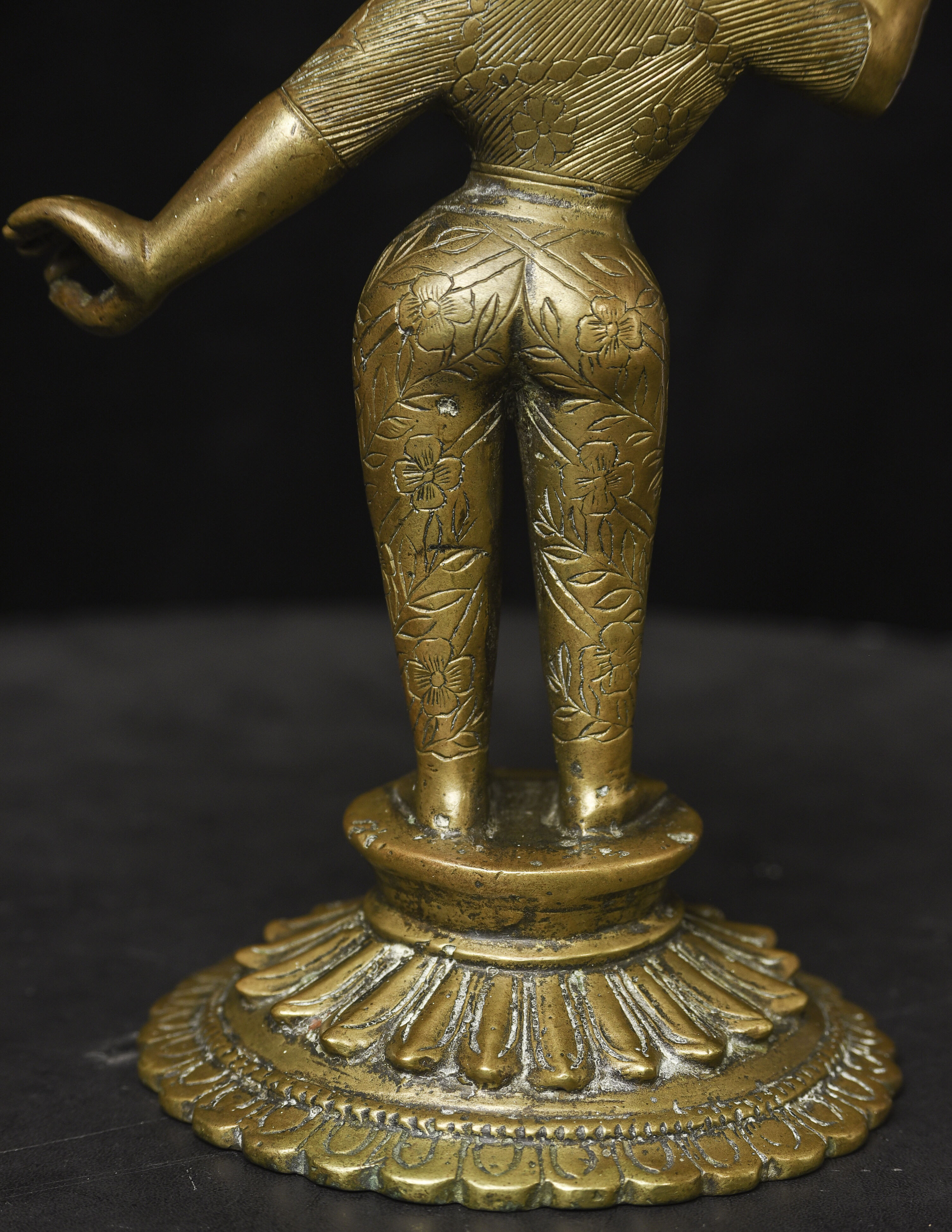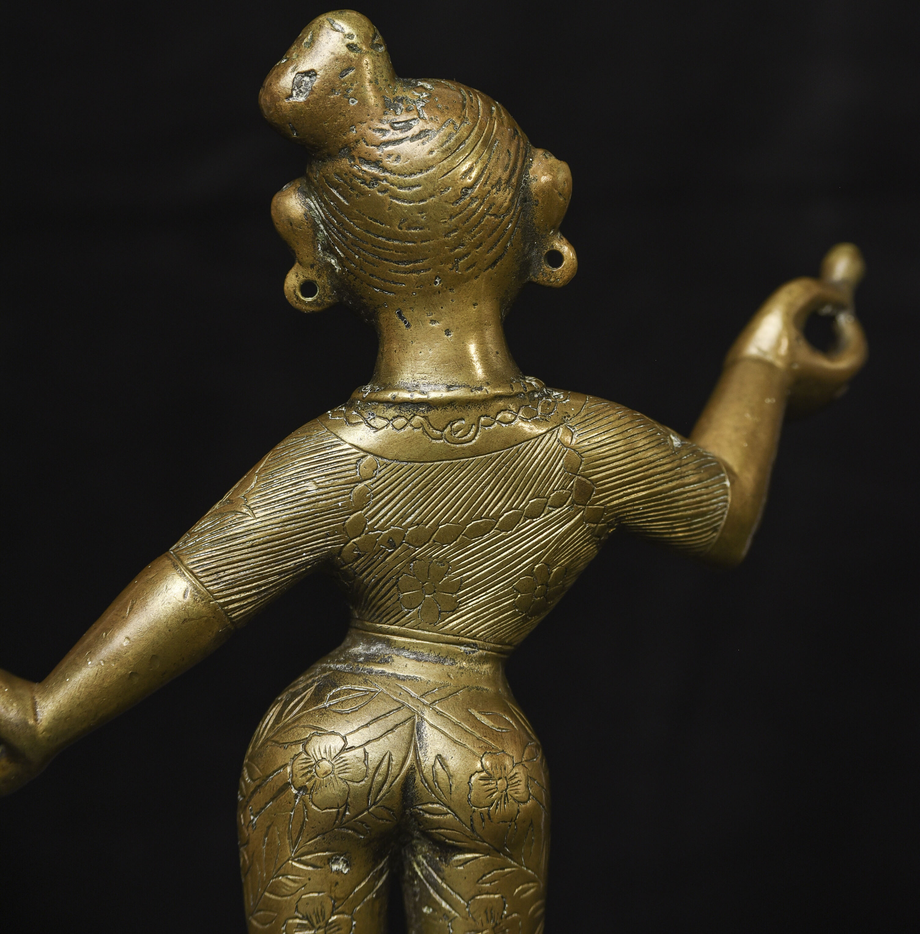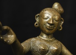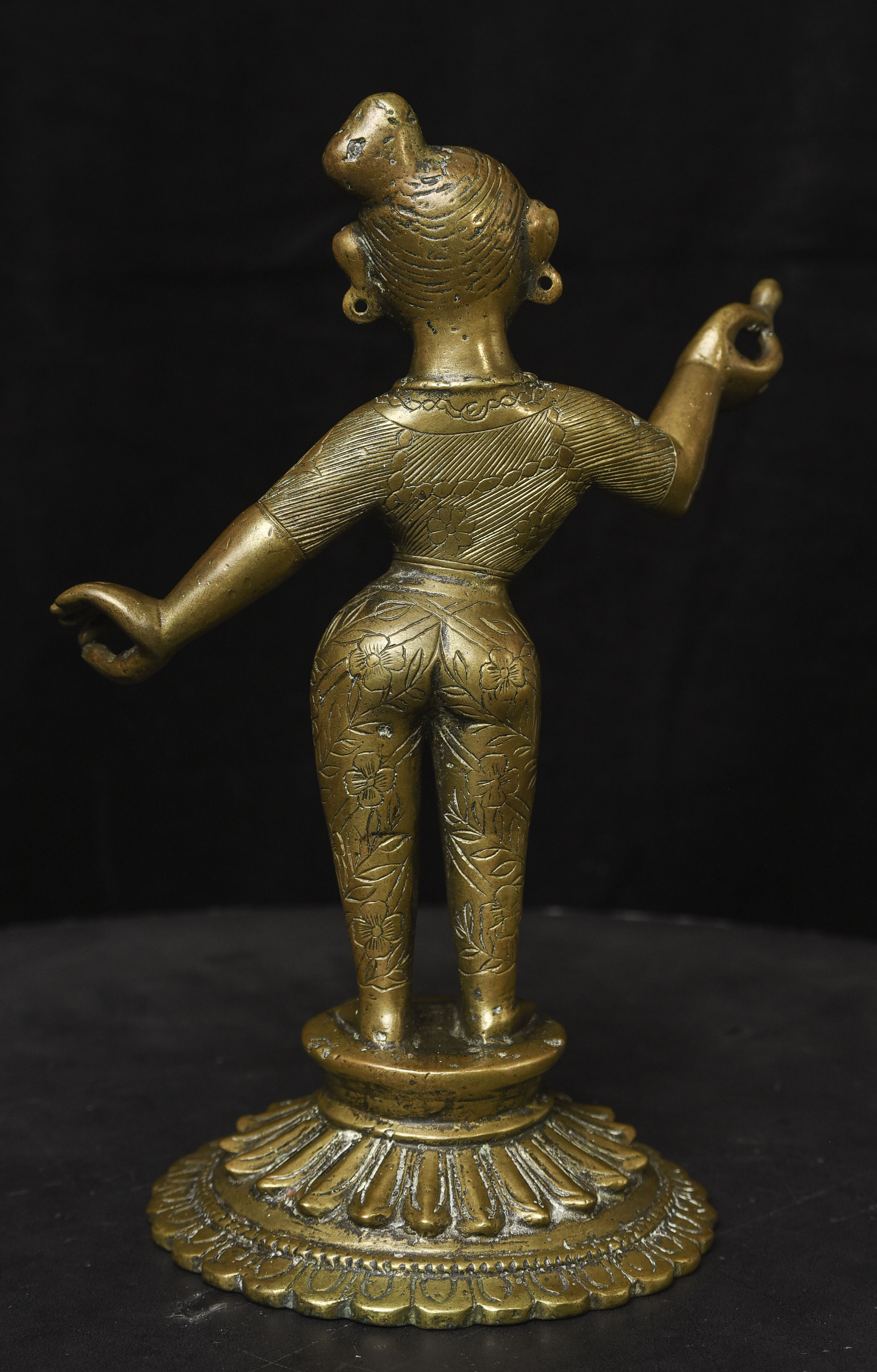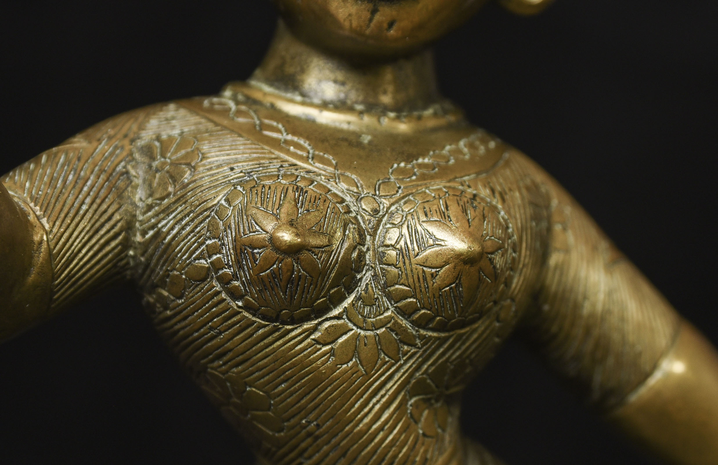 Large antique solid cast South Indian female deity covered with well incised elaborate design. Big beautiful smile. Good age. - (8.5"H x 6"W) - 3.76lbs / 1.705kg