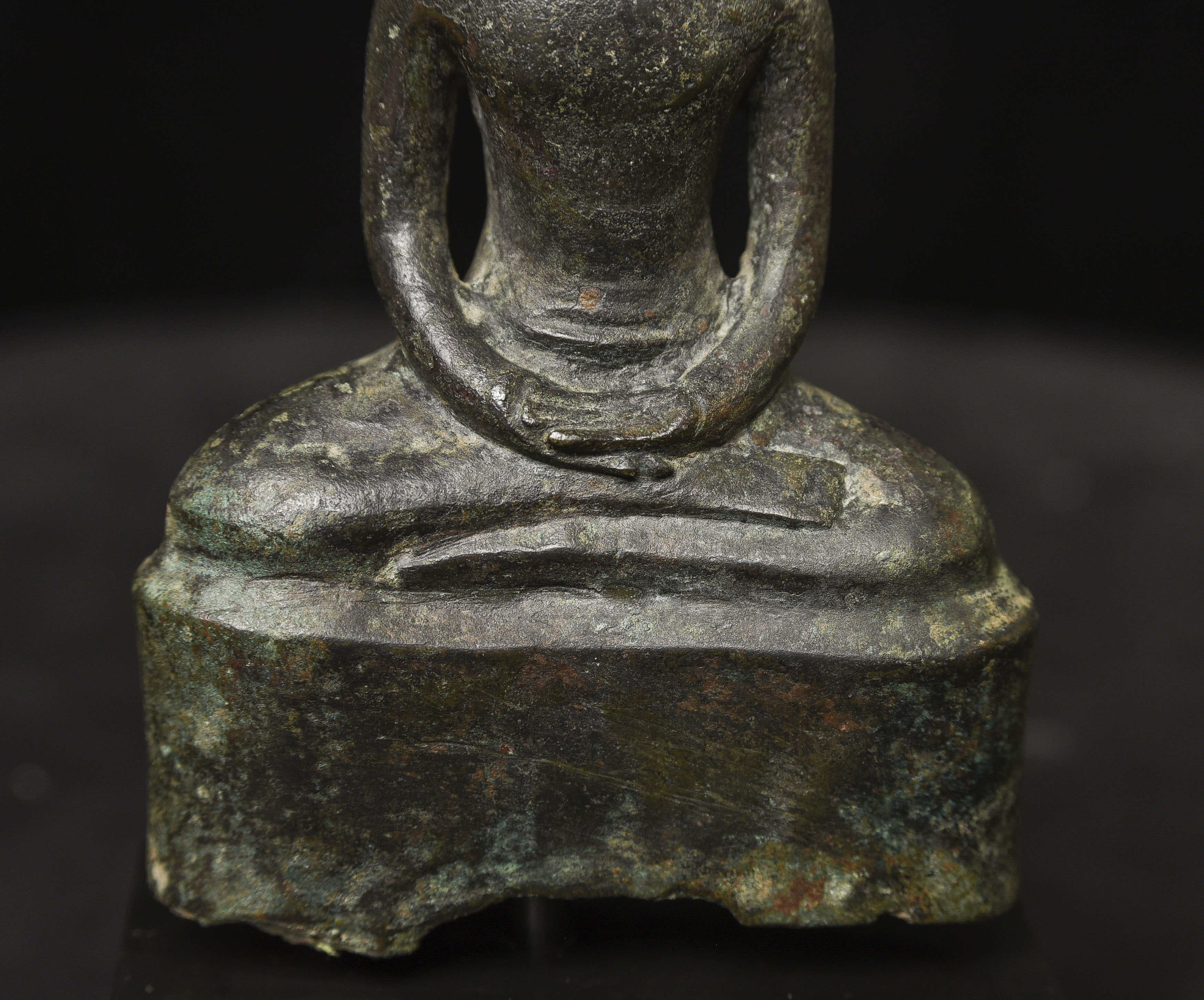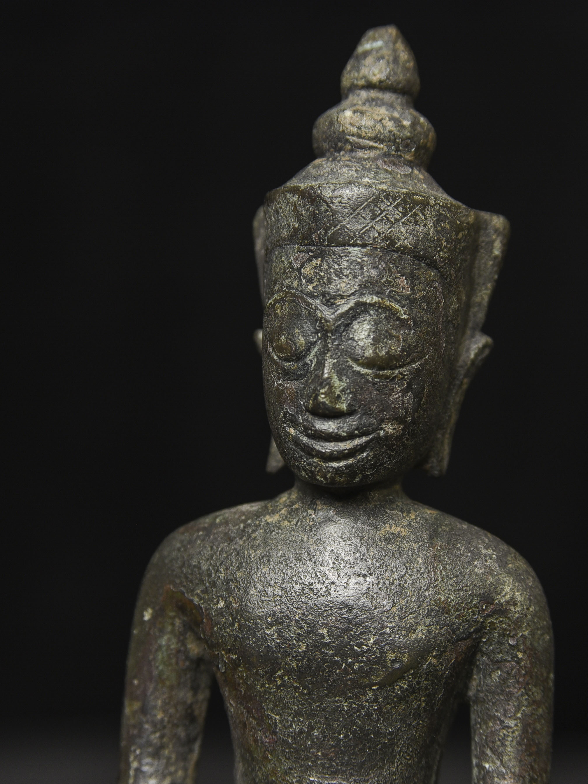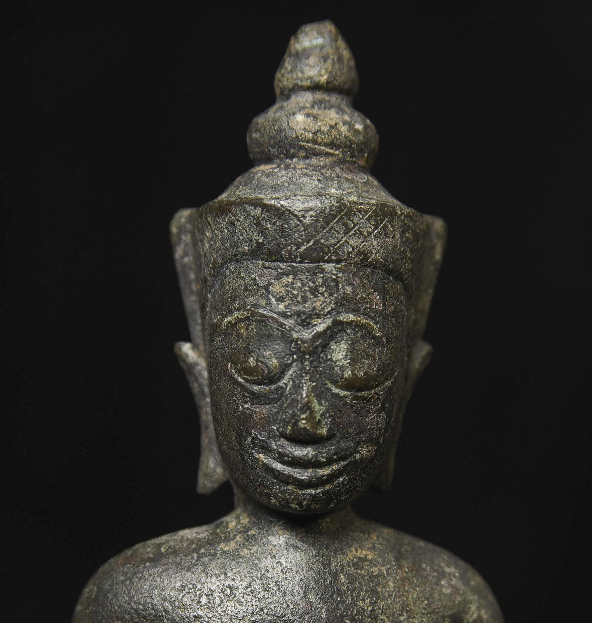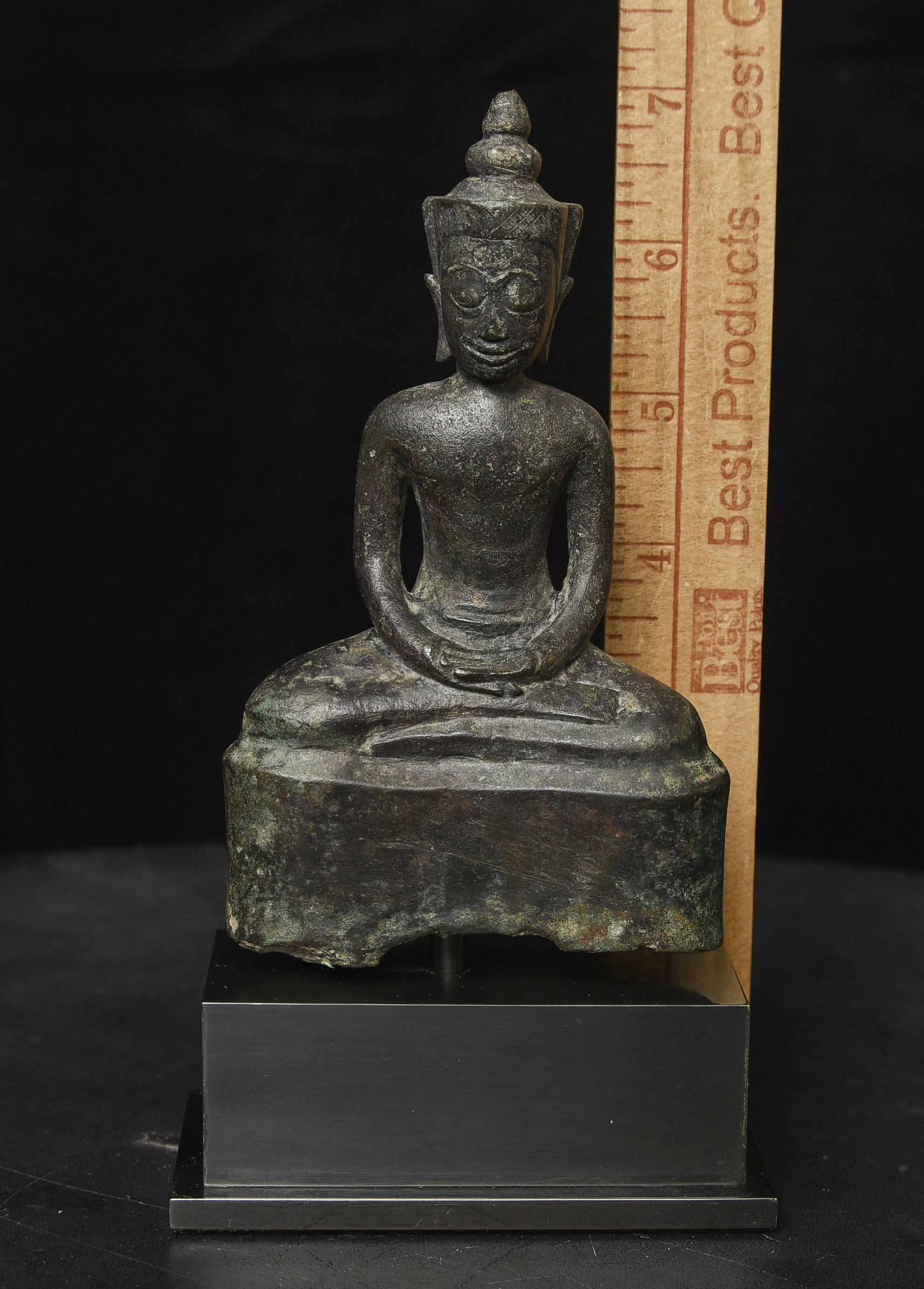 Very special 15thC Cambodian Buddha with strong Thai influence. The wonderfully wide smile is an artifact of the Khmer origins of this type. Buddha is Very uncommon type. - *(*5.25"H x 3.25"W) - 1.65lbs / .755kg (*Buddha Only)