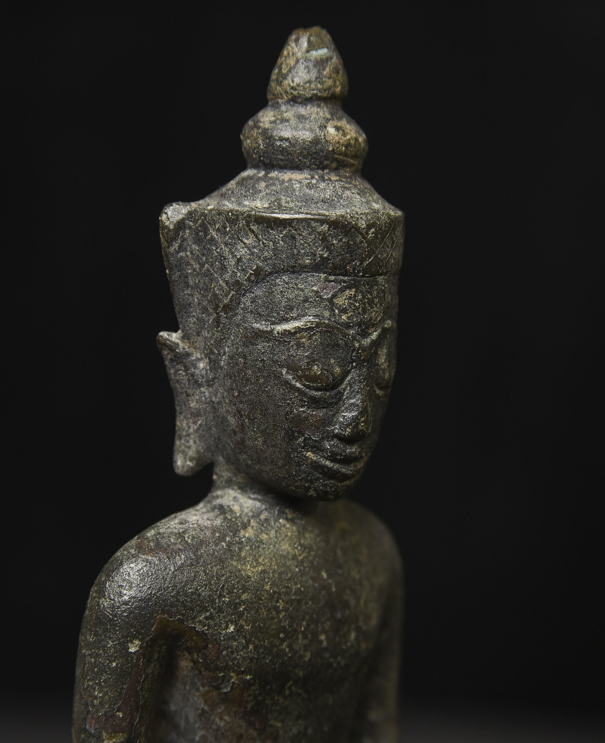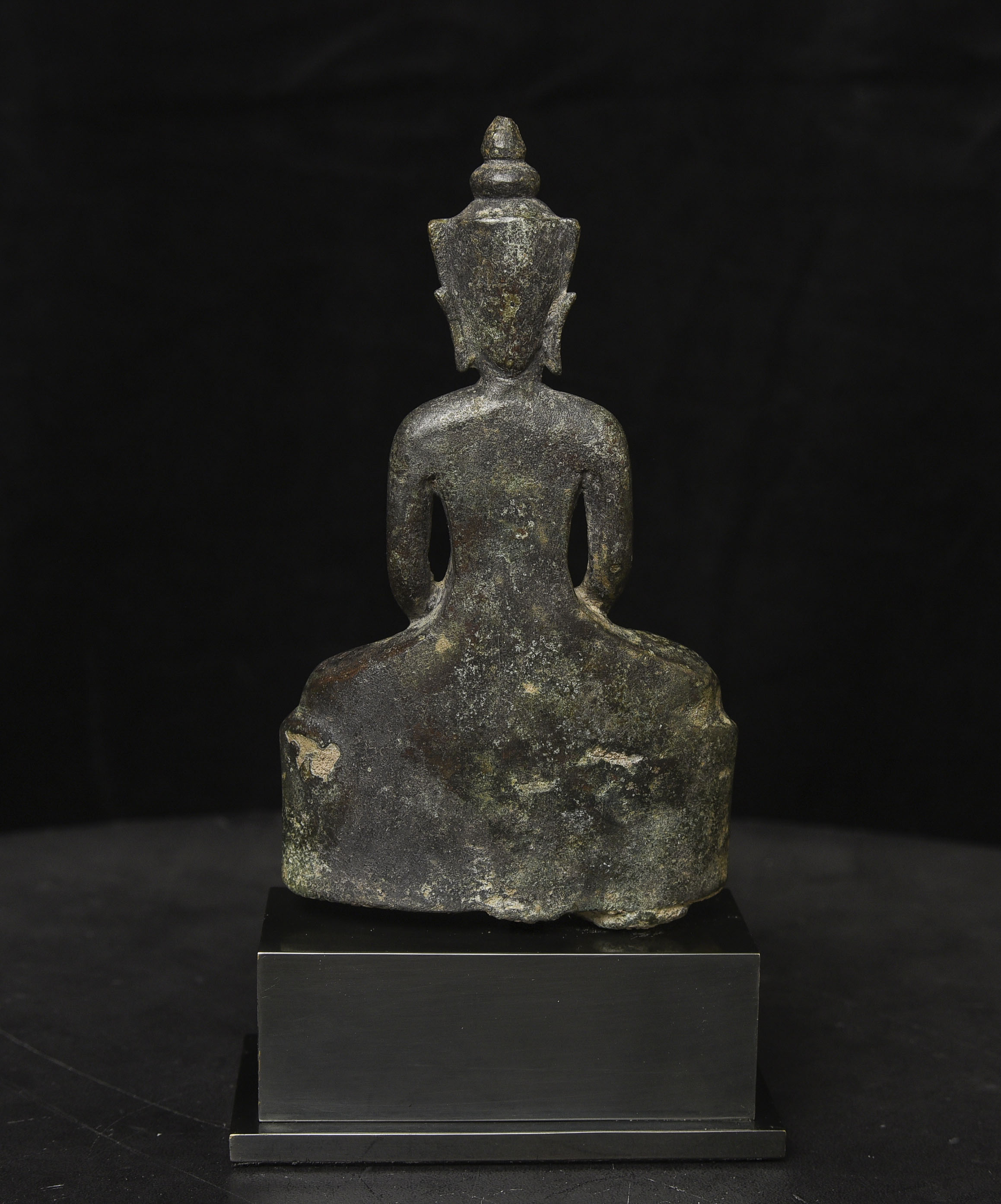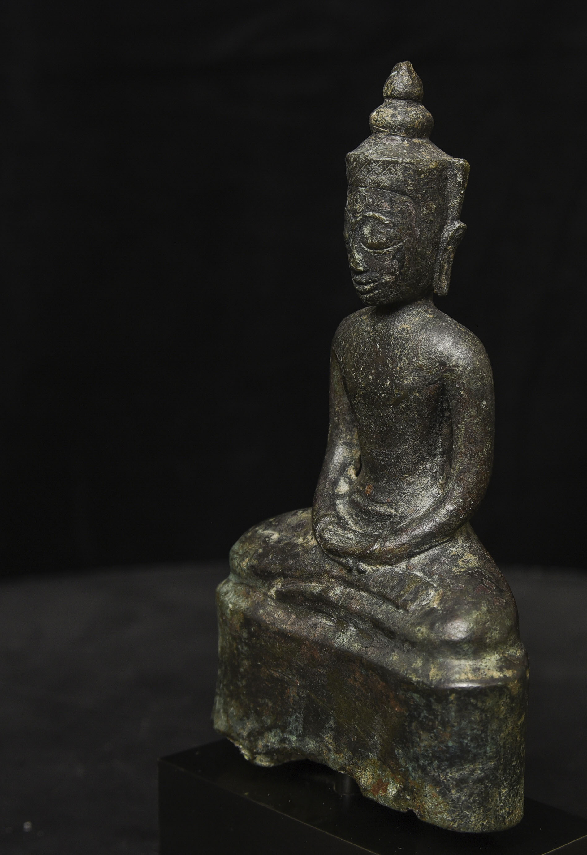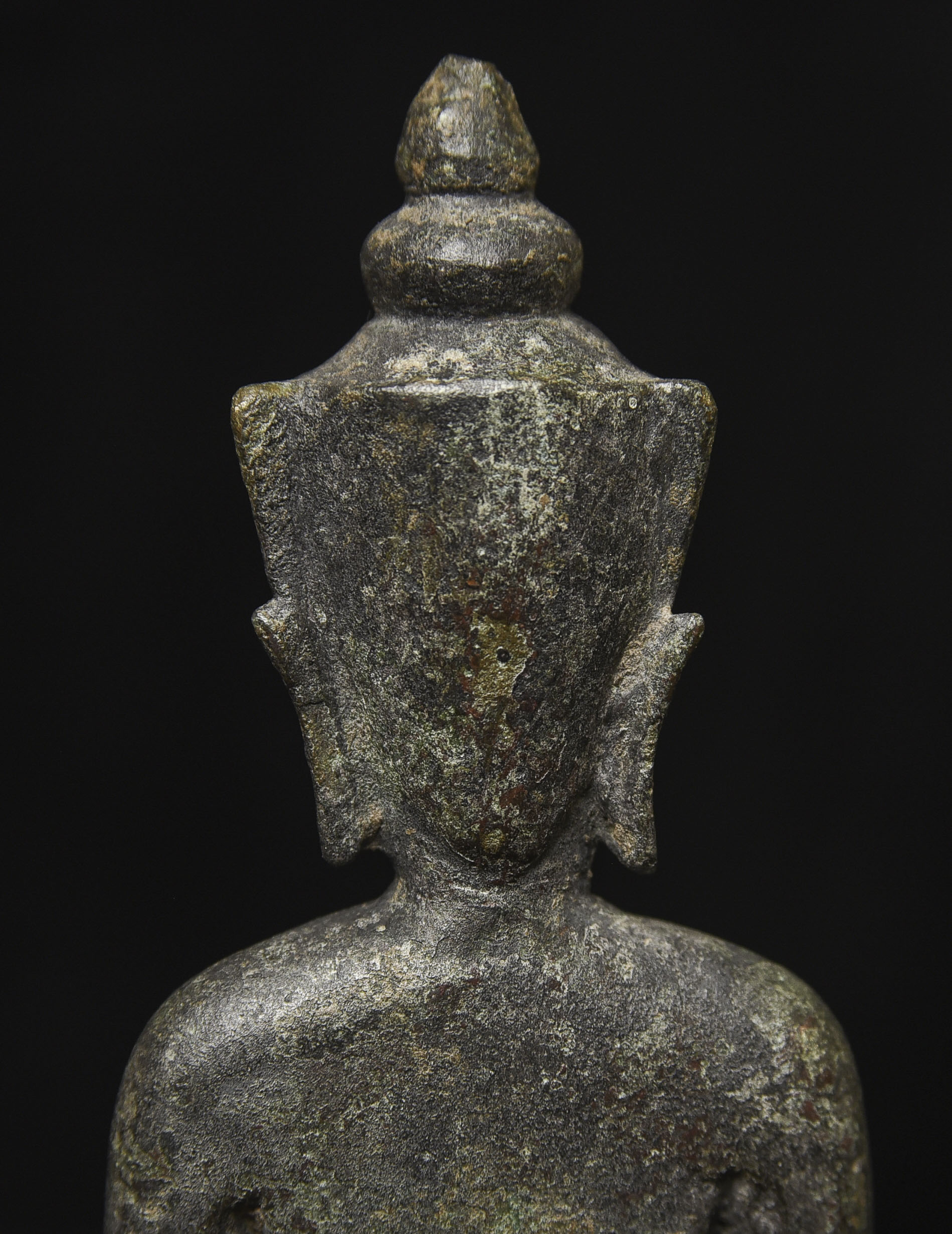 Very special 15thC Cambodian Buddha with strong Thai influence. The wonderfully wide smile is an artifact of the Khmer origins of this type. Buddha is Very uncommon type. - *(*5.25"H x 3.25"W) - 1.65lbs / .755kg (*Buddha Only)