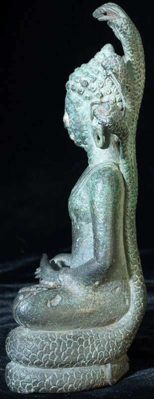 Remarkable 9/10thC Thai Bronze Naga Buddha. It is a transitional piece between Dvarati style and the beginnings of a true Thai style. It is extremely heavy- I think the body is solid cast. The alloy and casting are a bit different than any other Buddha I have had. The condition is excellent with no losses, although there are original obvious casting flaws, including to the face, the knee, and the back of the base. This is out of an old Chinese/Thai family collection. It is 6.75 inches tall. Note the wonderful faces on each Naga. Wonderful!!