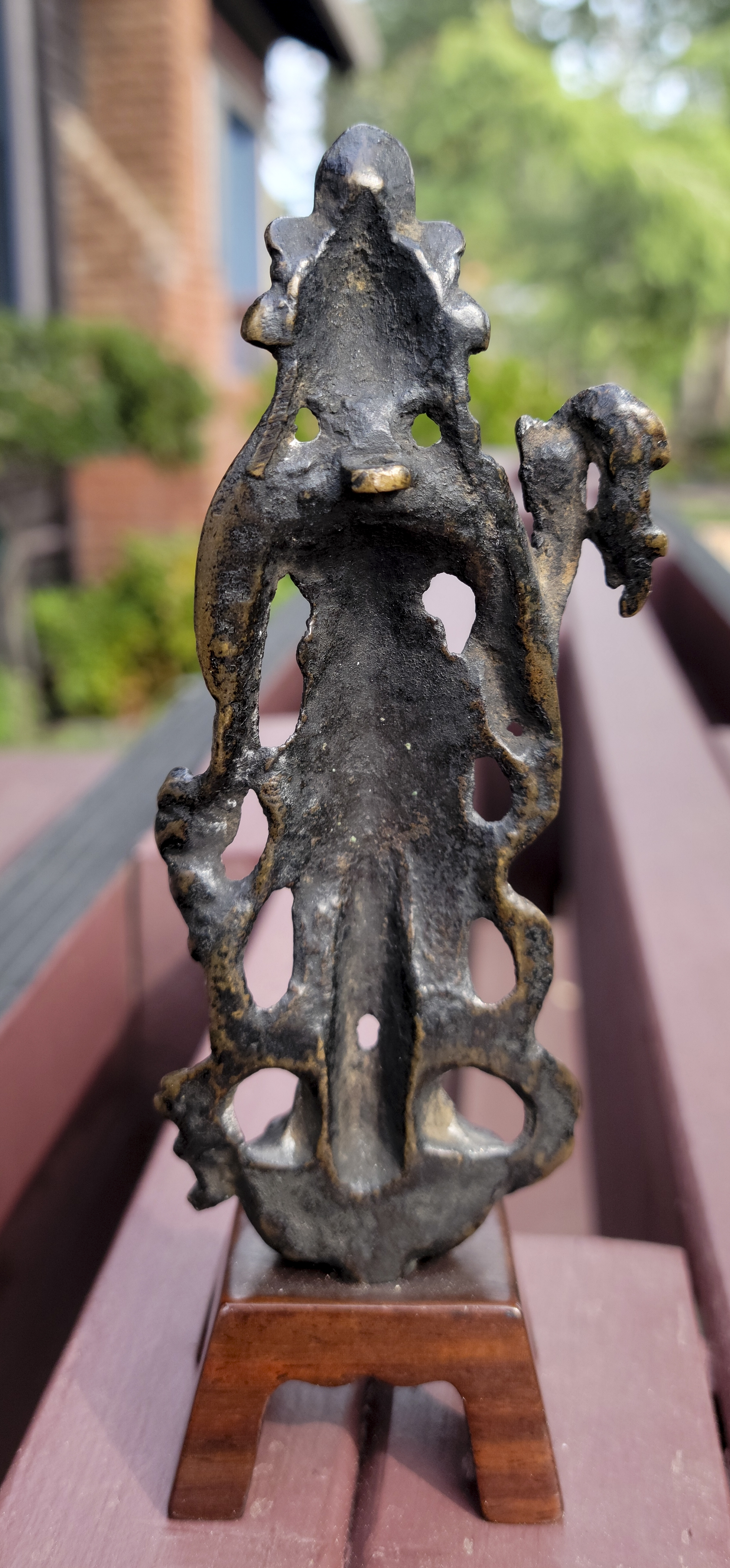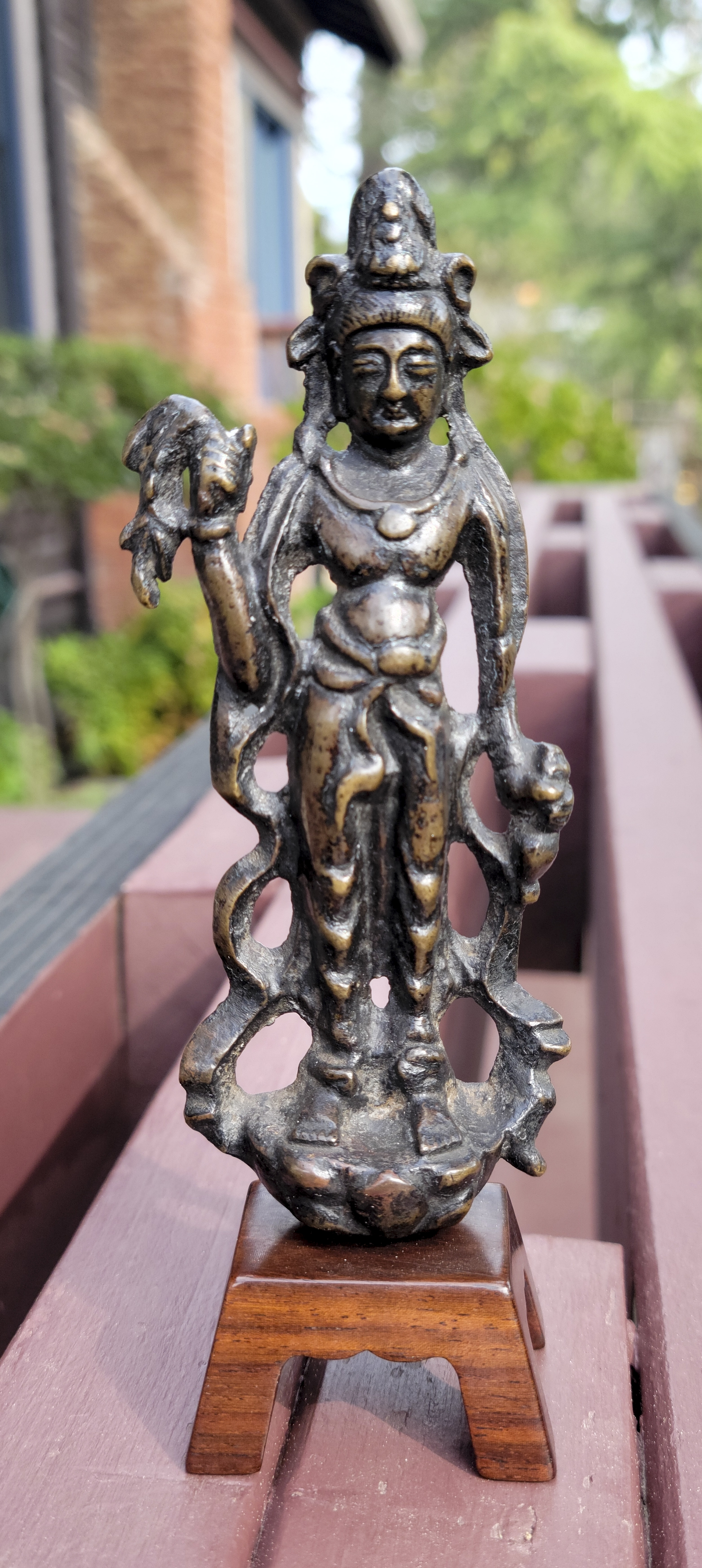The Bodhisattva’s face is gentle and expressive, radiating compassion and inner calm. The ribbons and robes are rendered with remarkable complexity—flowing, layered, and carefully articulated—demonstrating the skillful hand of an accomplished Tang-period artisan. Such intricacy in the drapery is a hallmark of more sophisticated early Buddhist metalwork. The bronze measures 4.5 inches tall, and reaches 5.5 inches in height on its custom stand. Dimensions: 1.75 inches wide and 0.6 inches deep.