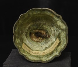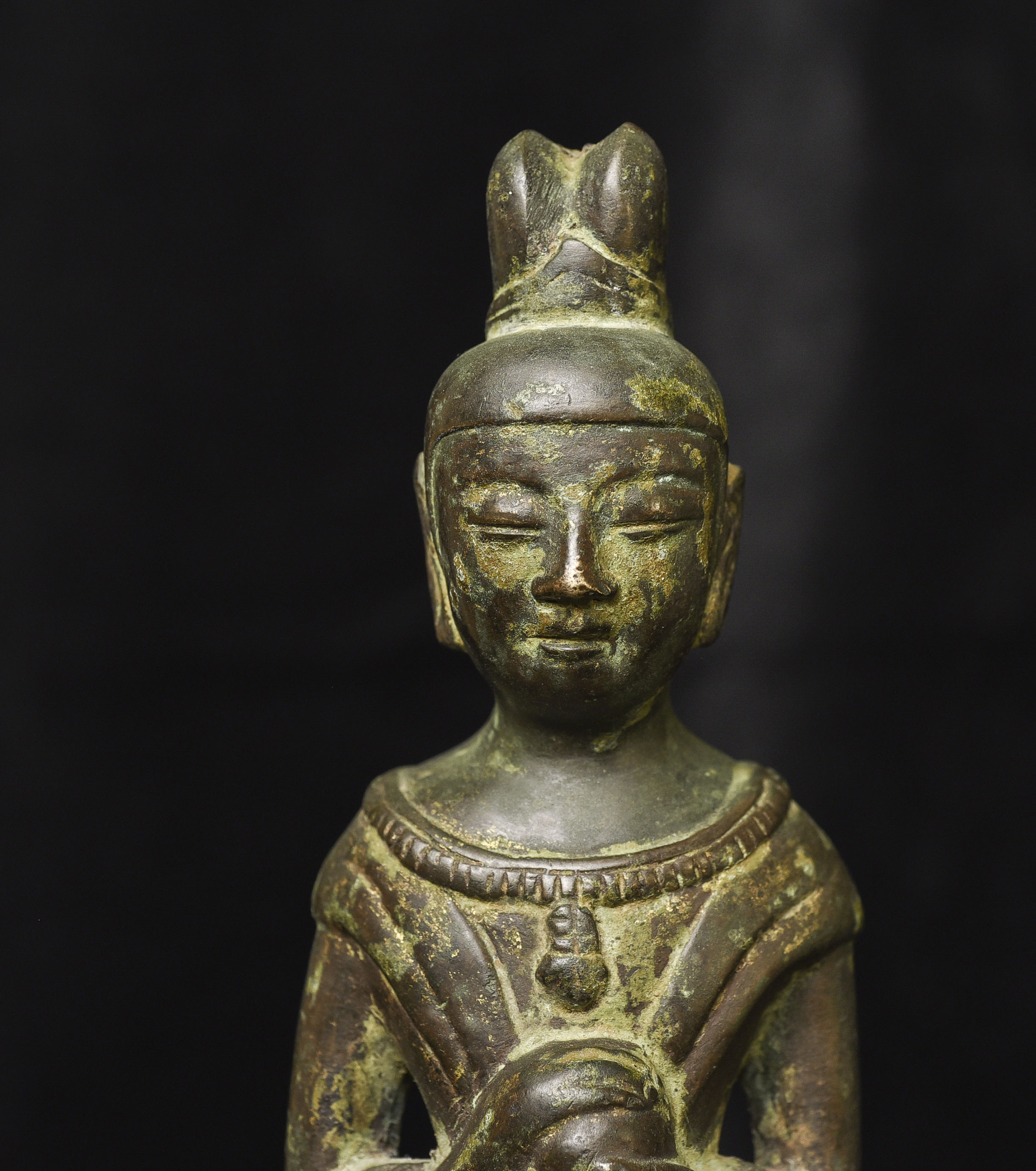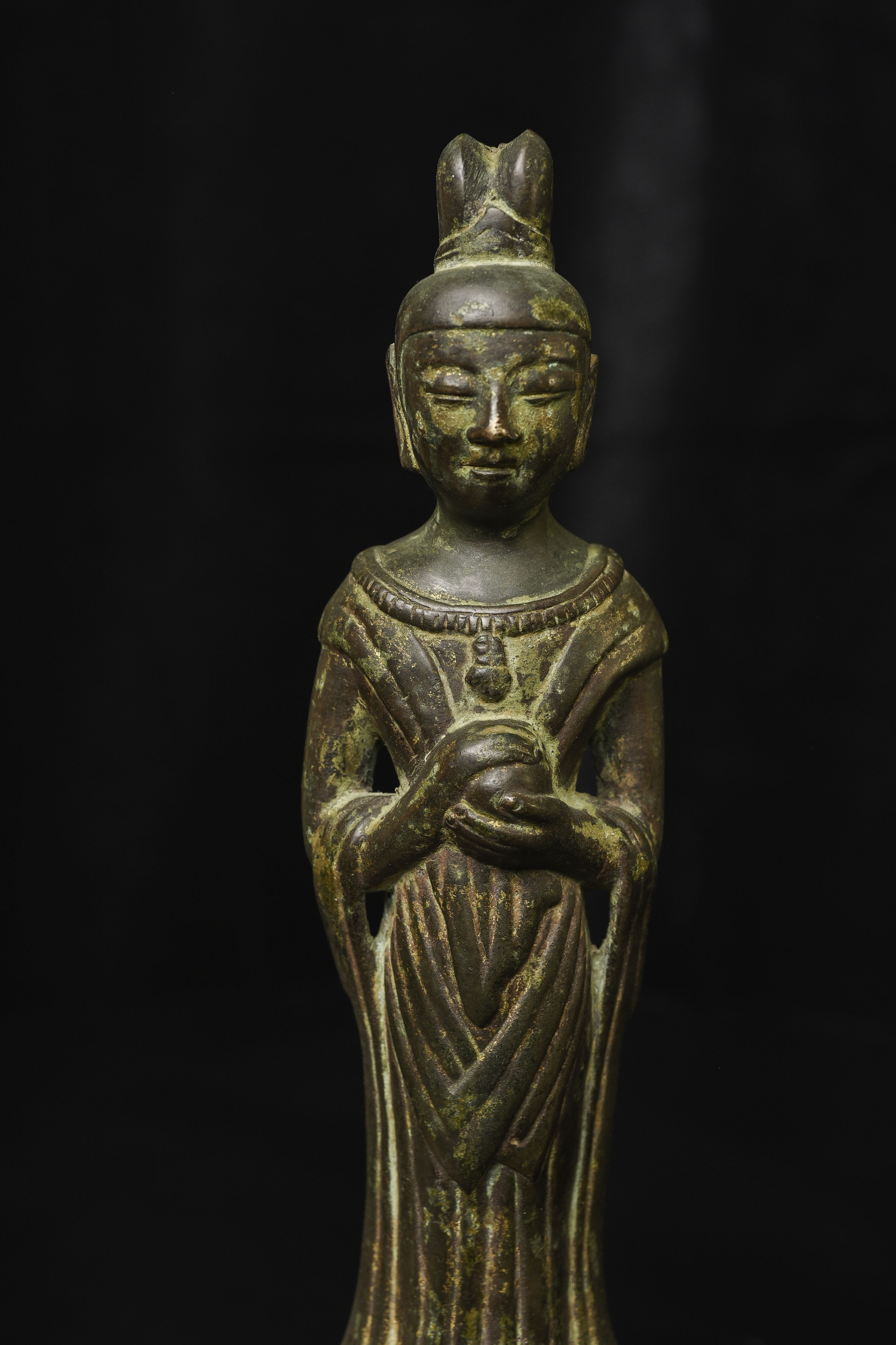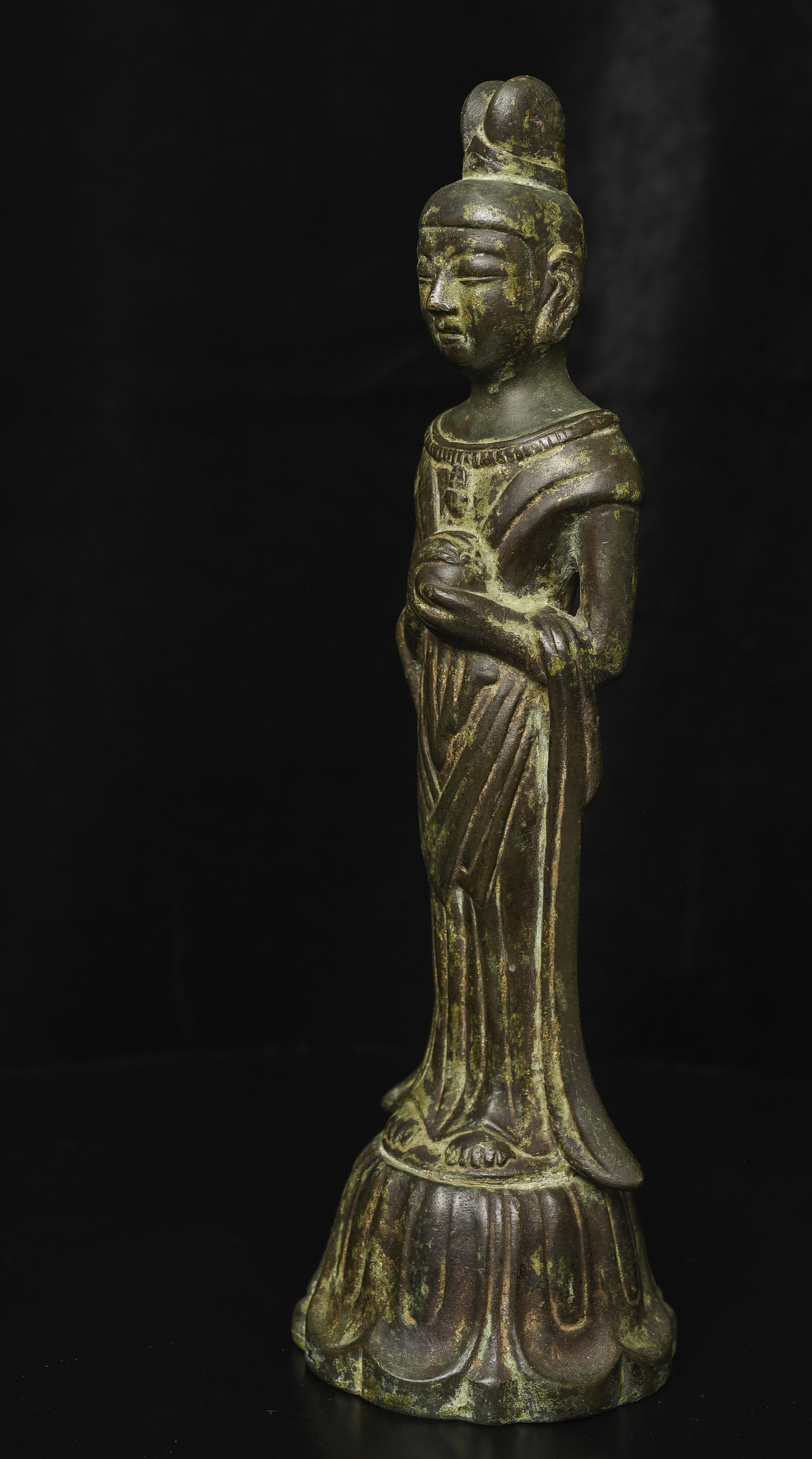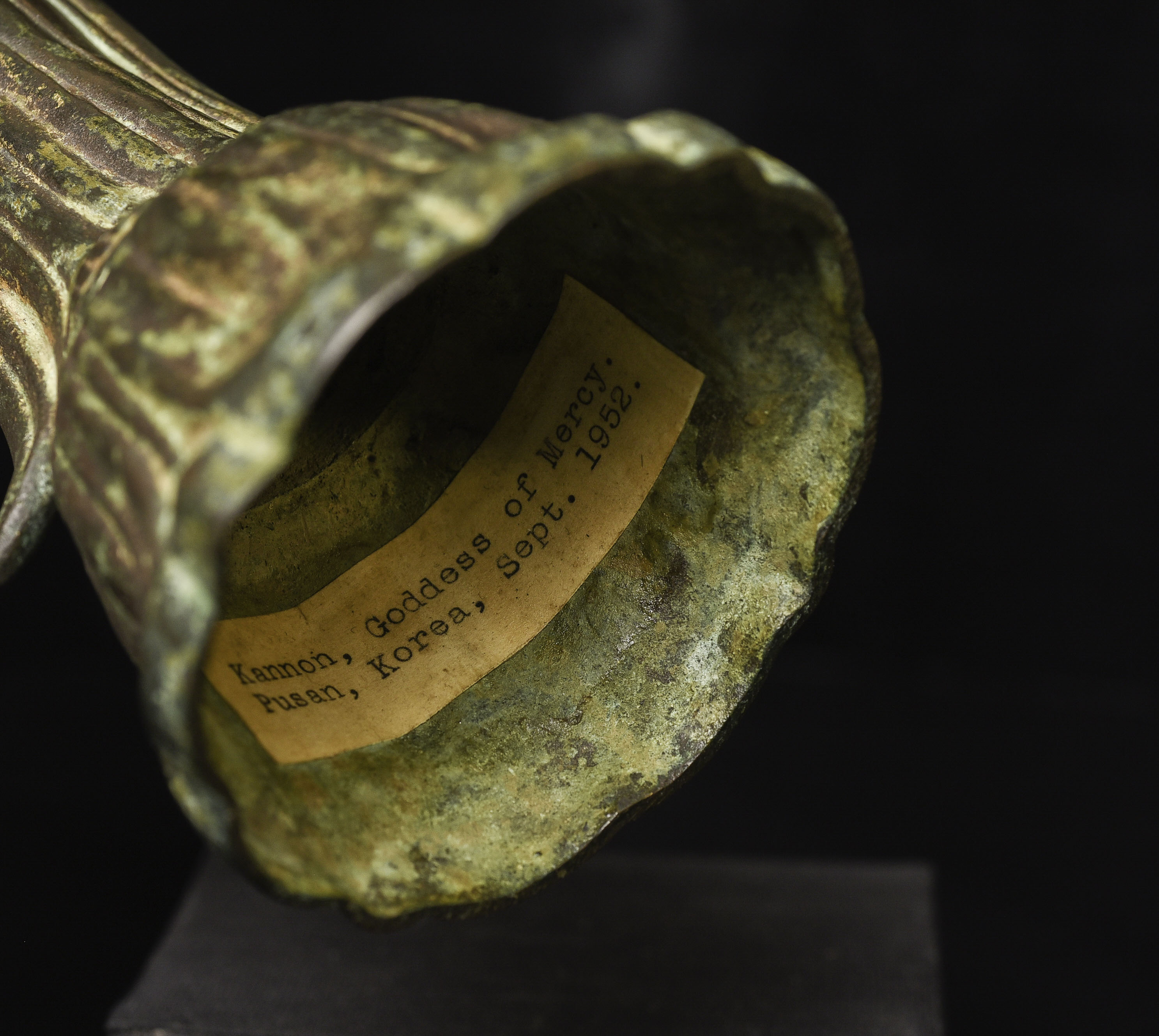Korean Buddha with a provenance note fixed to the lower inside that was placed there in 1952 during the Korean War. It clearly had long years of devotion on an altar with incense and or butterfat lamps that developed a strong patina that covered the entire surface over time. The style of this piece goes back more than a thousand years, though it is more likely that this piece is a few hundred years old. This type is hard to date precisely because they have made this style for so long to "honor the elders". I will estimate it at 18 19th century to be conservative. Many of the best Korean Buddhas I have been able to acquire over the past several decades have been from Korean veterans or from their families, as so many Korean Buddhas were melted down during the Korean War or shortly afterward. It is rare and desirable to find a note like the one attached to the inside of this one, which confirms the exact place and time that it was acquired. Very good size( 11"H x 3.25"W ) - 2.63lbs / 1.070kg