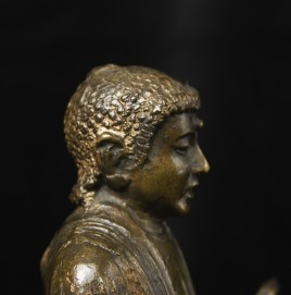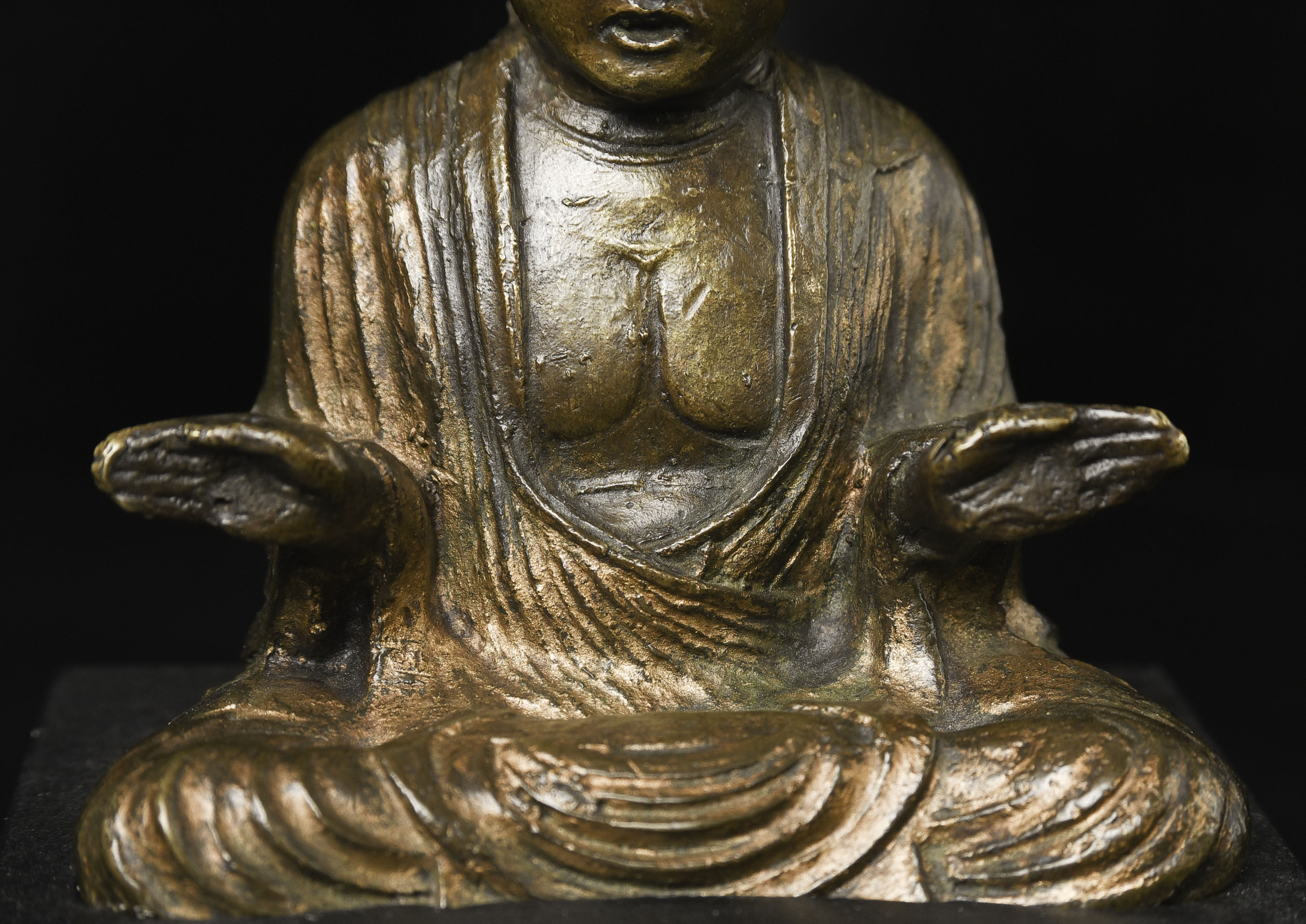 Antique Japanese Buddha-sits 4 inches tall, 6 inches on custom base. Solid-cast, and is very heavy for its size. The bottom says "Kamakura" and 18 BC (Buddhist Calendar- we are in the year 2558-this would make the 18th BC approx 13thC, which corresponds to the Kamakura period)). I've never seen another like it. Looks to have good age and from my experience to be at least pre-Edo, and is probably the 13thC Kamakura era. The face is so unusual, and the casting so distinctive, it may be Korean. from a similar time period. Width 4.1", depth 3" - (5.05lbs / 2.295kg). Solid cast- extremely heavy for its size.