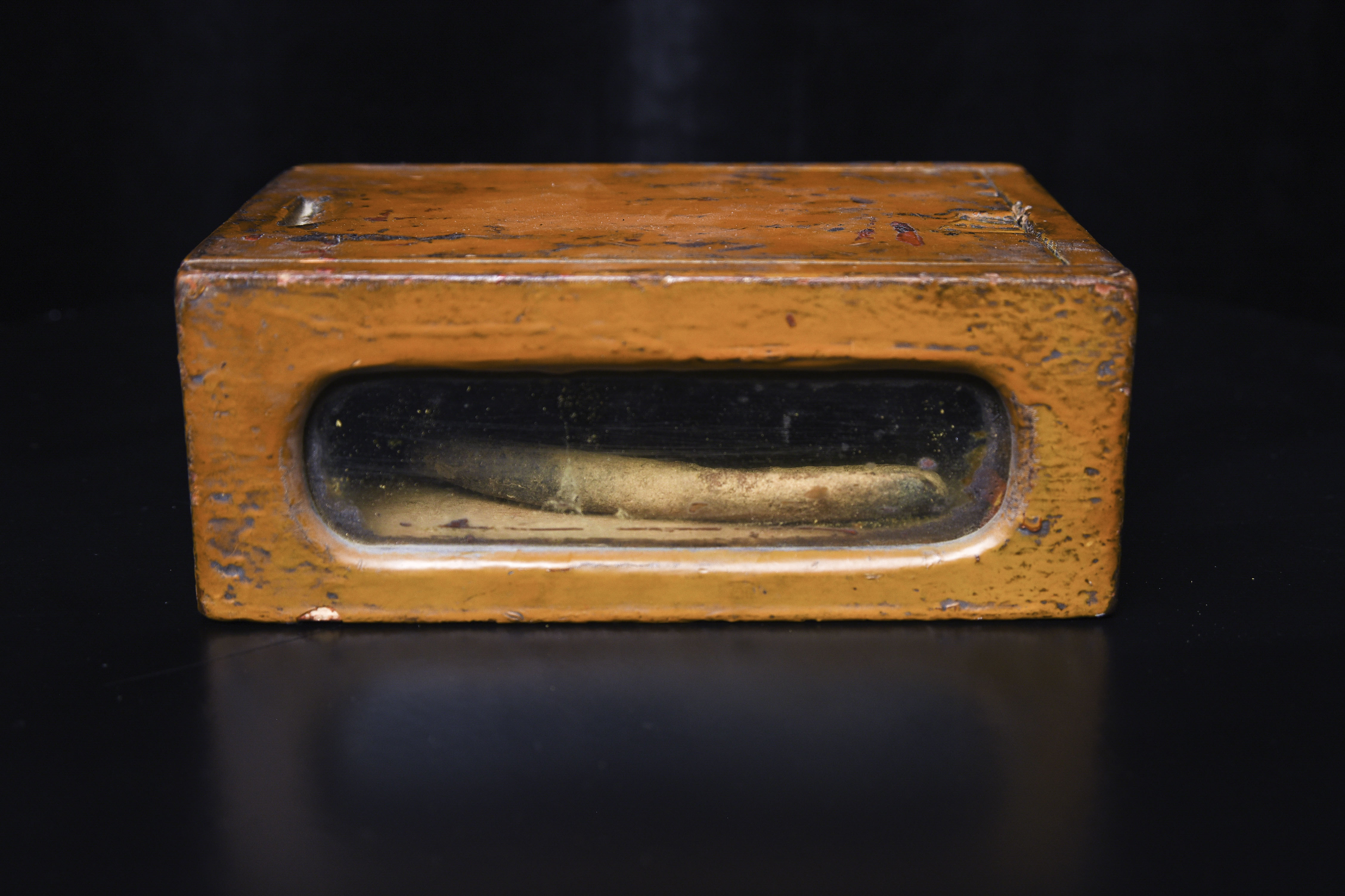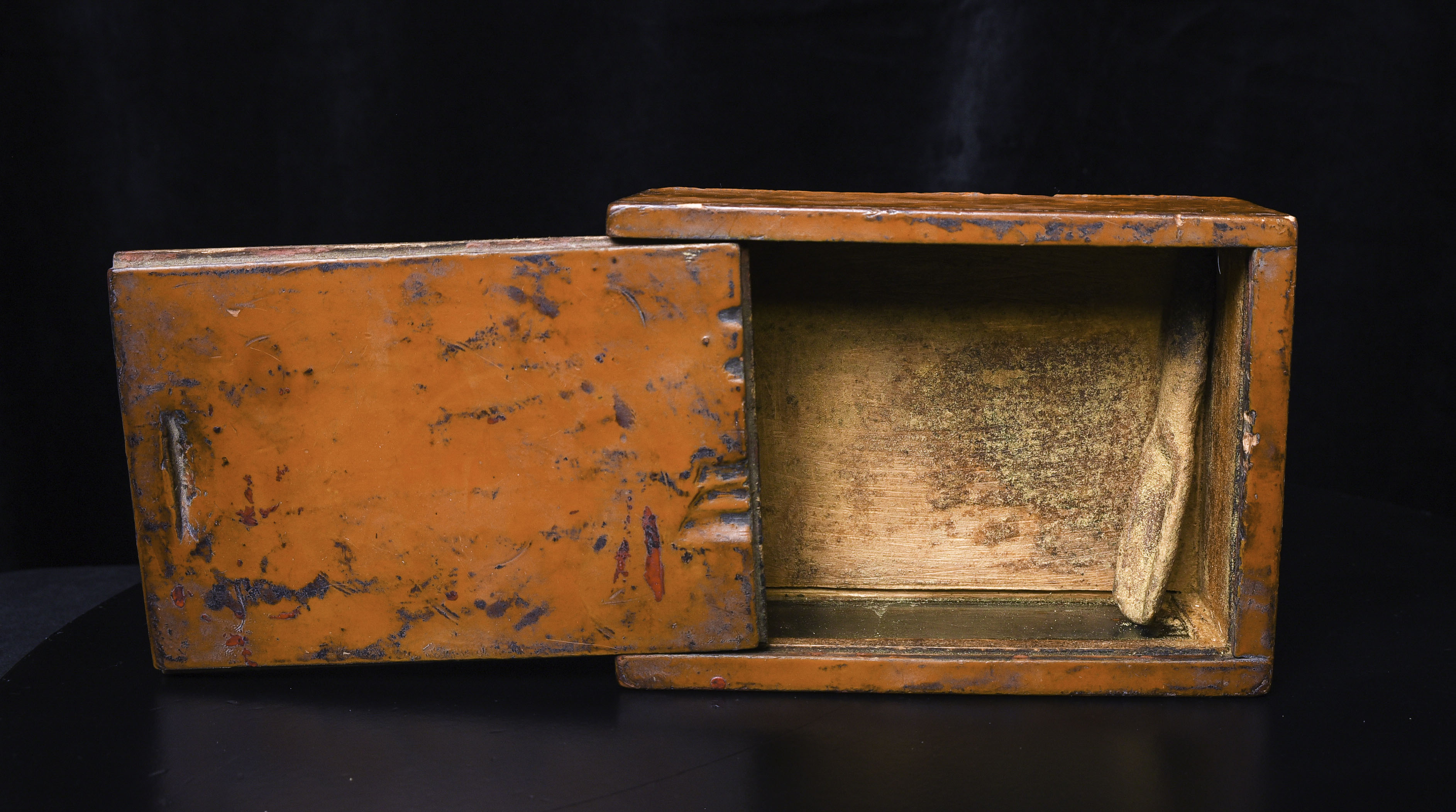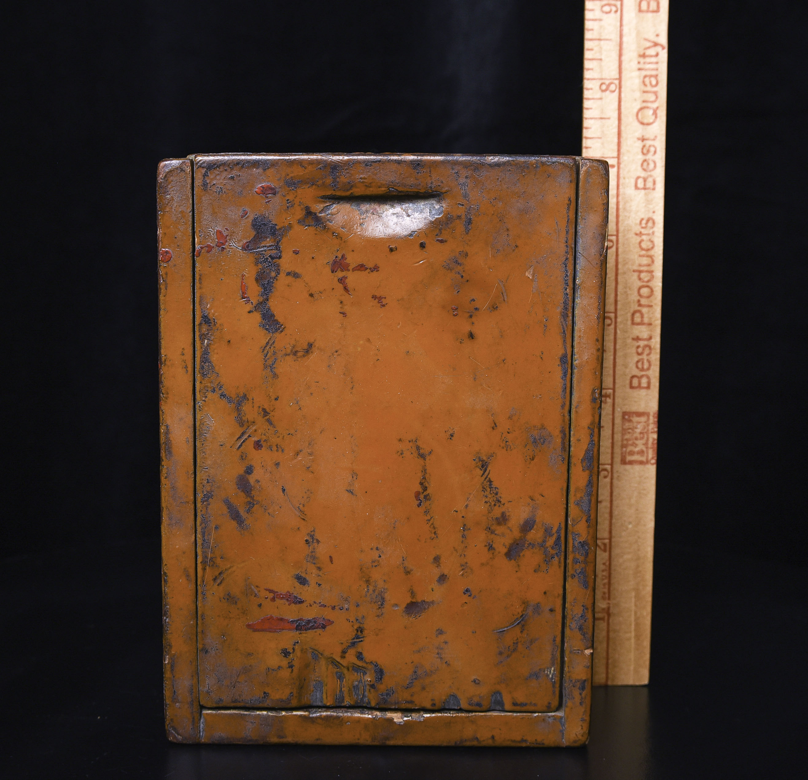 Antique Mongolian Temple Box and Spoon For ritual Herbs. Rare to find complete. This is a box that contained a fragrant herb that was ingested or applied to the body by Buddhist practitioners in a Mongolian Temple. It looks to have been used over an extremely long amount of time. It has a glass window through which you can see how full the box is. It also has a very old, possibly original spoon. This is one of those items that was probably very common in that there was probably one in each Temple. They are probably extremely rare today because nobody thought to save them and they probably just used them till they wore out and then they threw them away or used the parts of them to make new ones. It's certainly something I've never seen before. (7"W x 2.625H" x 5"D)