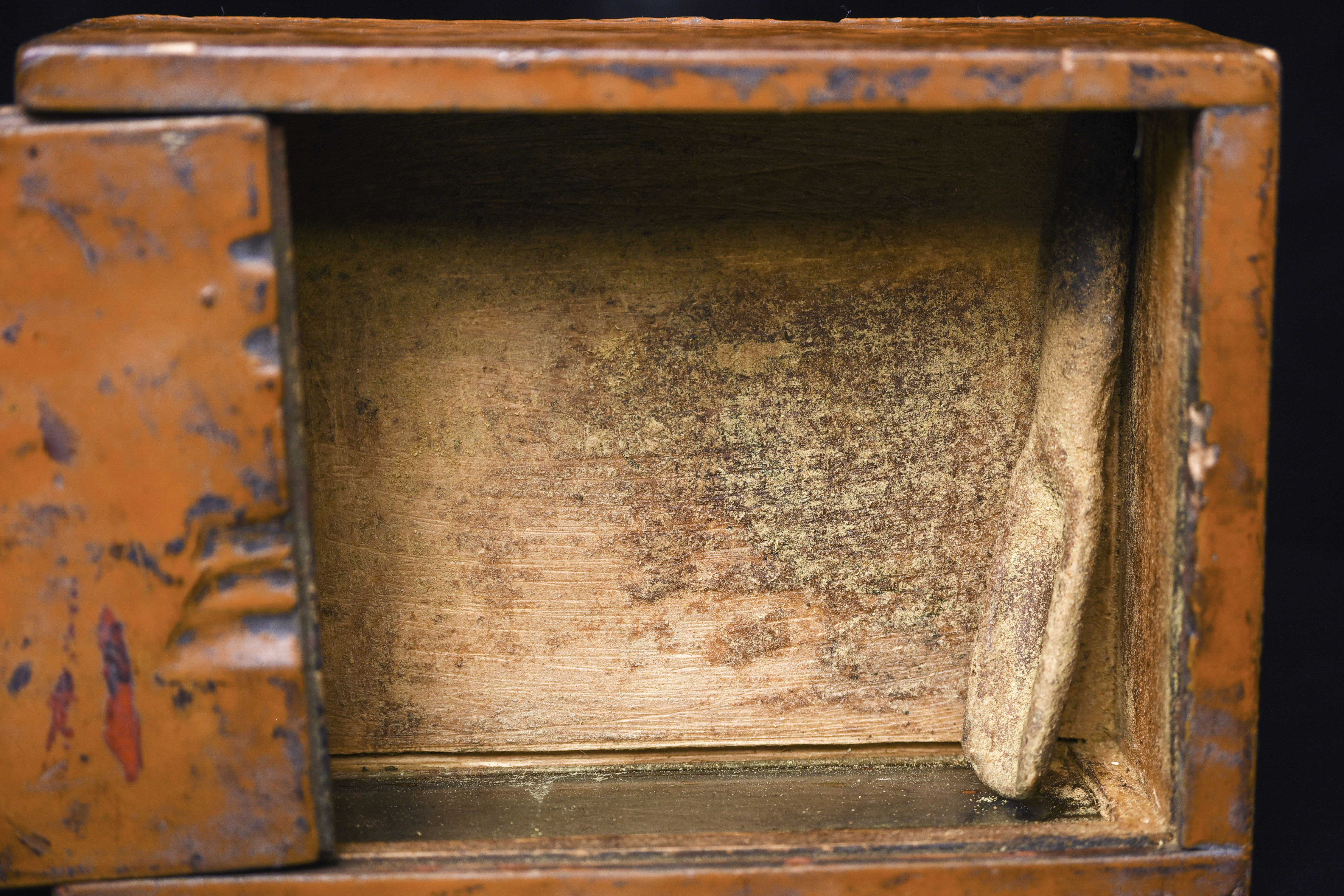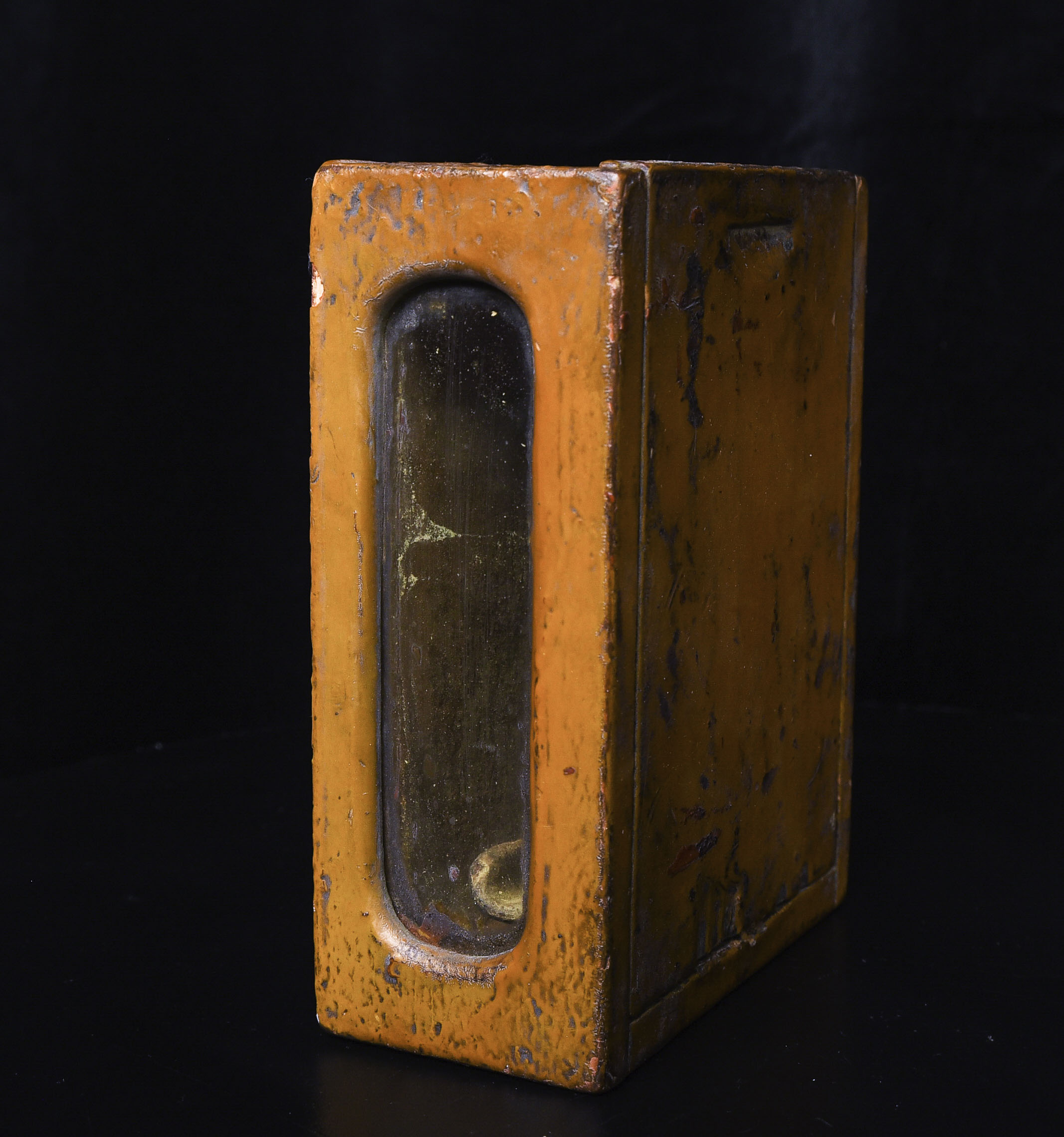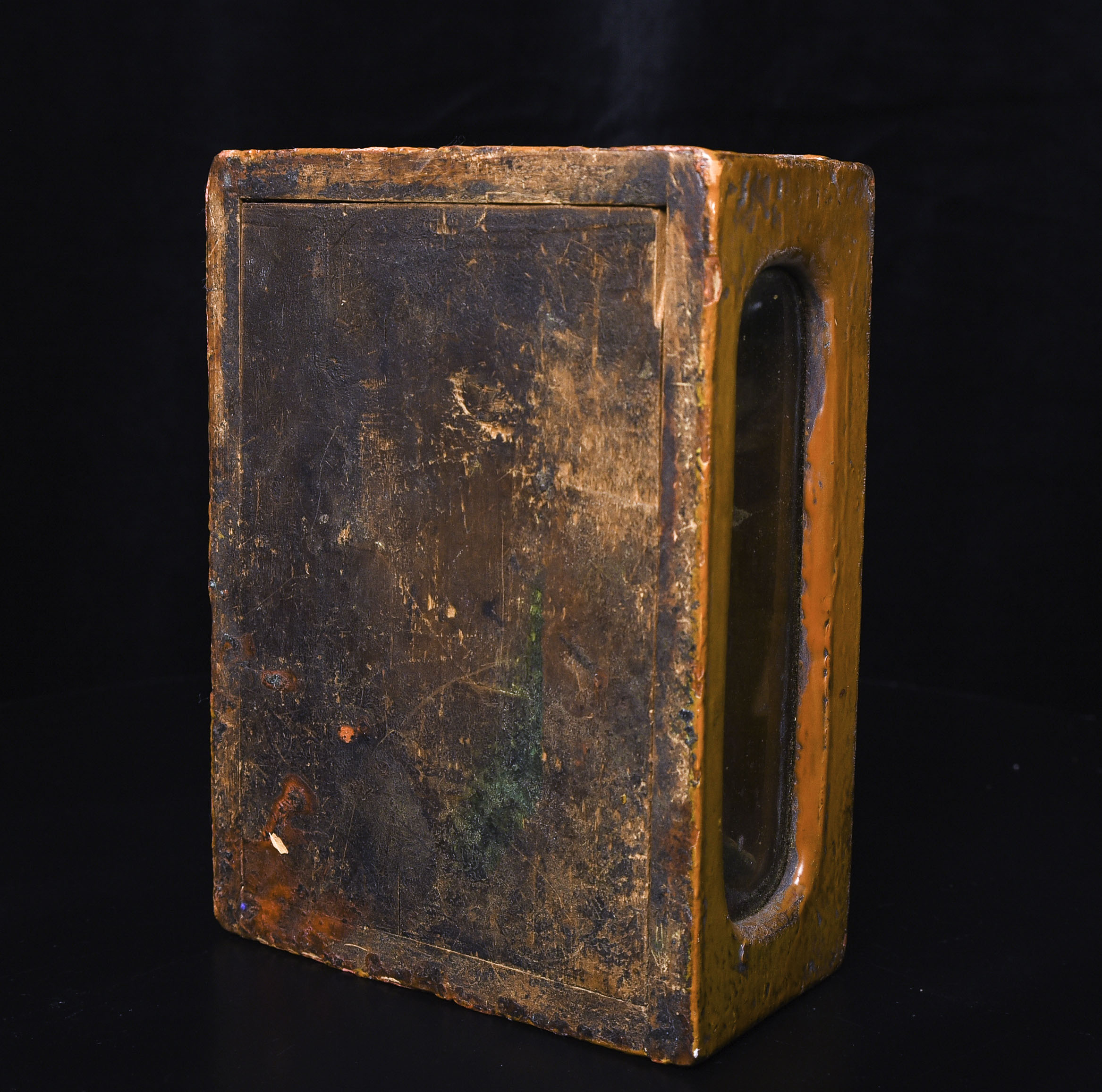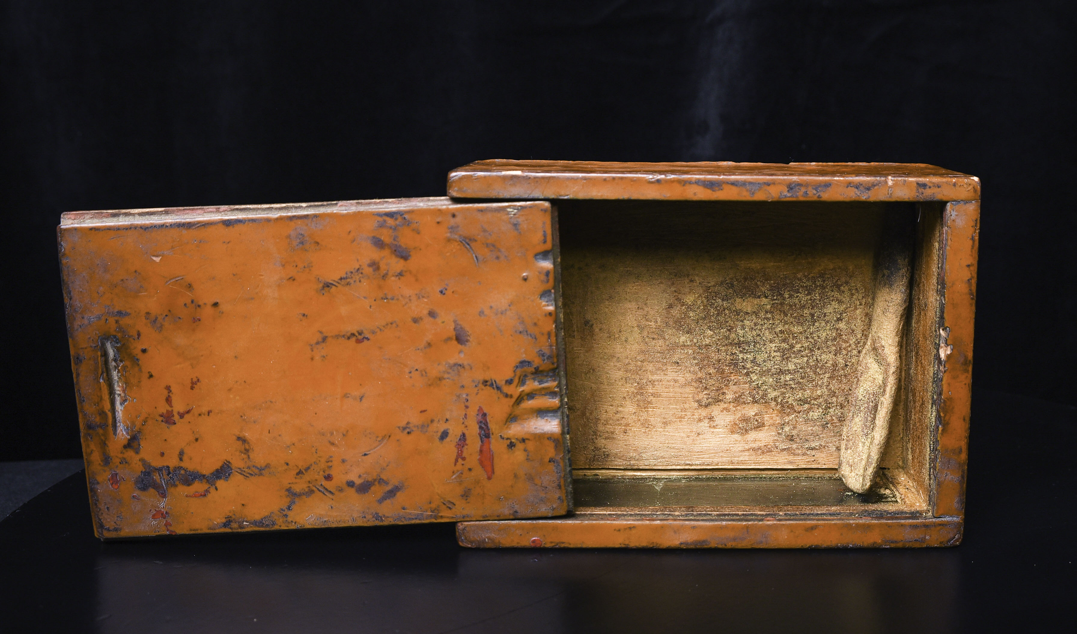 Antique Mongolian Temple Box and Spoon For ritual Herbs. Rare to find complete. This is a box that contained a fragrant herb that was ingested or applied to the body by Buddhist practitioners in a Mongolian Temple. It looks to have been used over an extremely long amount of time. It has a glass window through which you can see how full the box is. It also has a very old, possibly original spoon. This is one of those items that was probably very common in that there was probably one in each Temple. They are probably extremely rare today because nobody thought to save them and they probably just used them till they wore out and then they threw them away or used the parts of them to make new ones. It's certainly something I've never seen before. (7"W x 2.625H" x 5"D)