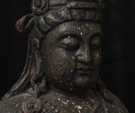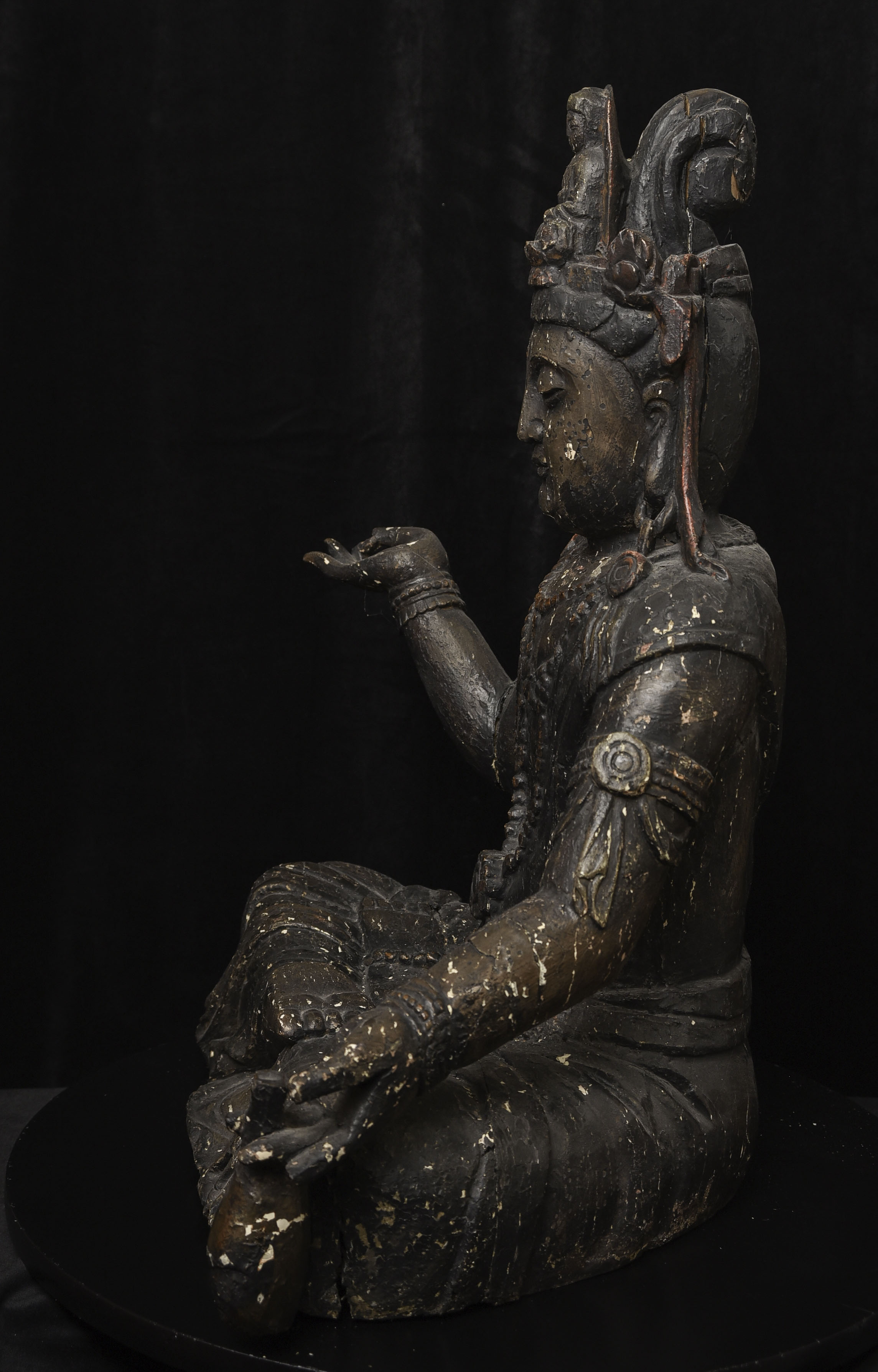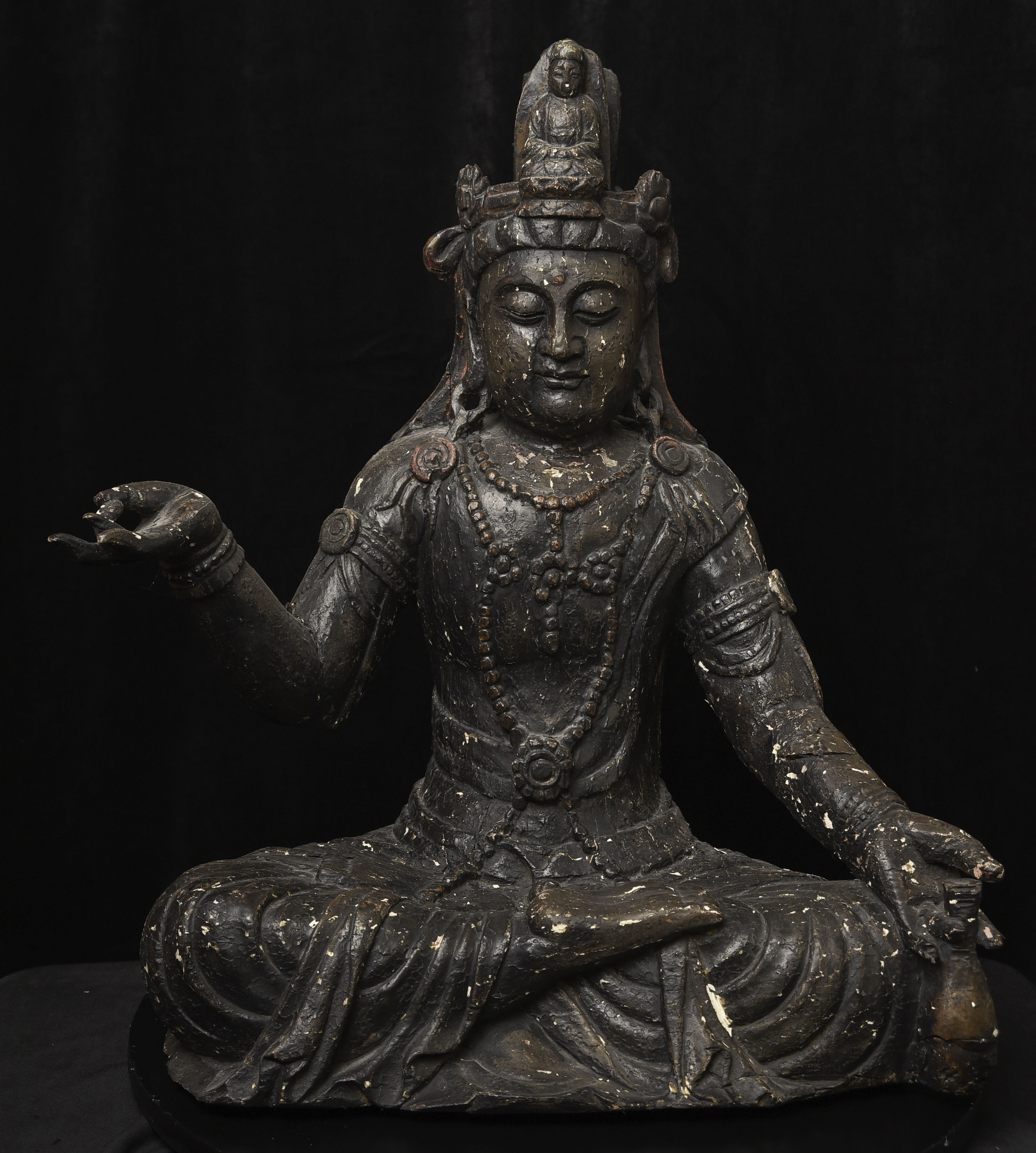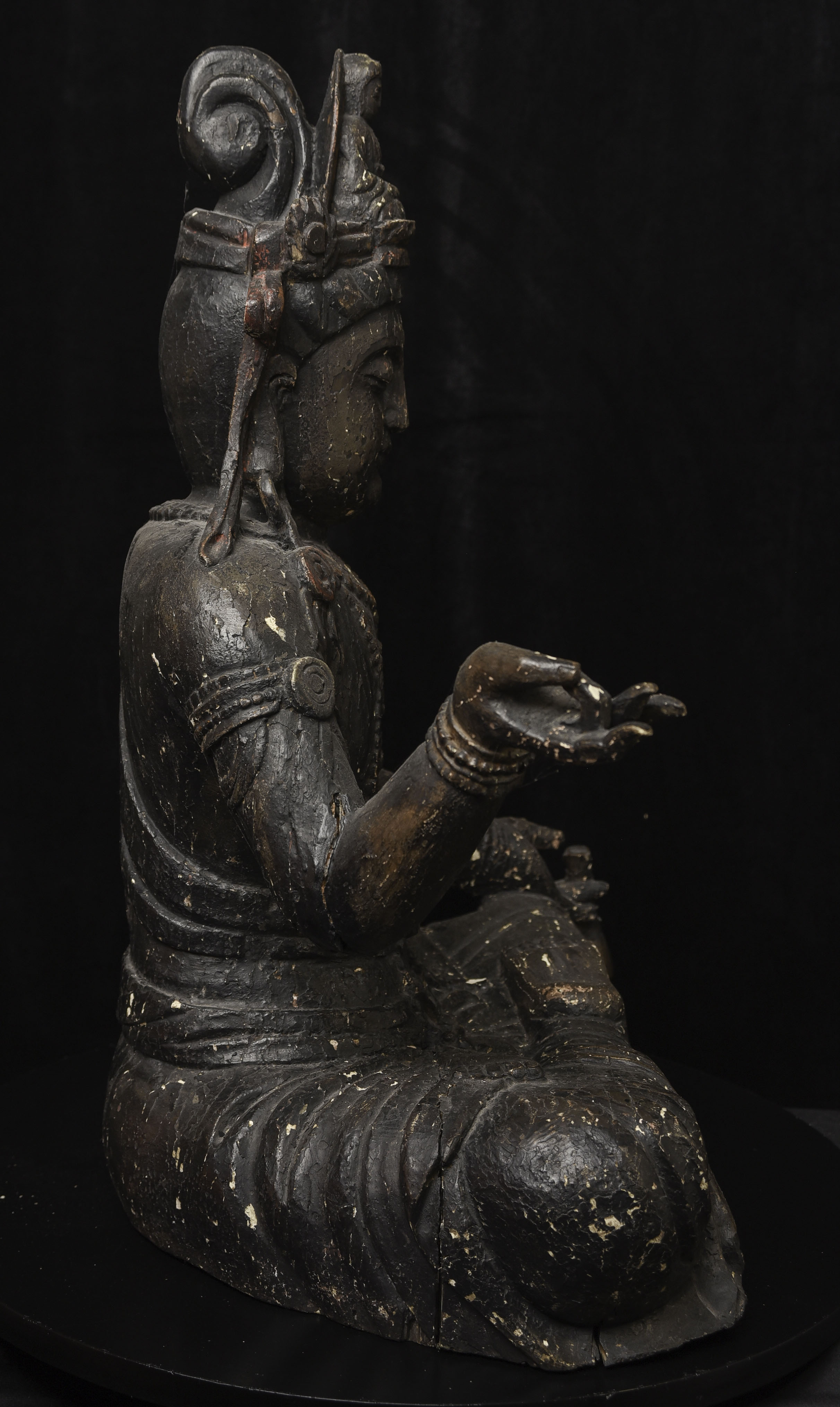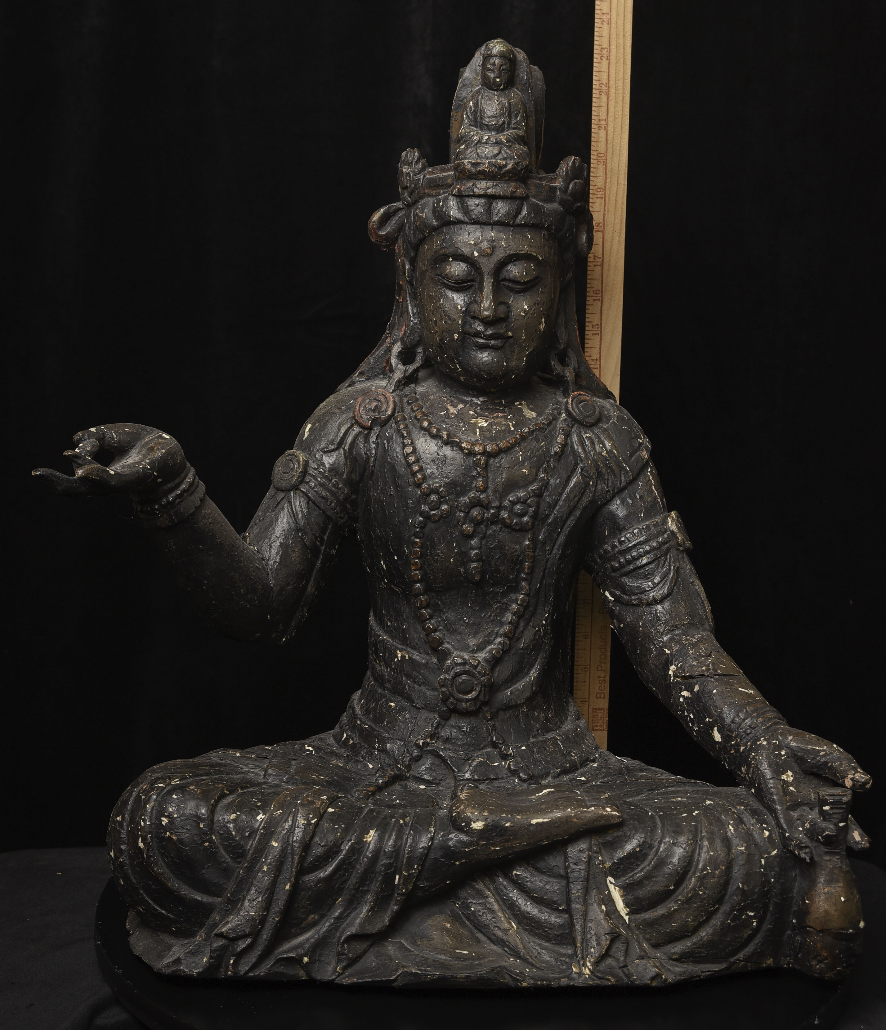 Large 16/17thC Korean Bodhisattva of Compassion (Kannon, or Korean equivalent of Guanyin). It looks contemporary with Early Ming, though I am unsure how to date precisely. The beautiful fragrance of camphor wood still comes through strongly. It looks to have been repainted or freshened many times. Please ask if you want more details on the condition. The patina is complex and still evolving (still shedding bits of gesso and lacquer, exposing the underlying material of the look of this particular sculpture- this will continue). Possible repairs to the arms, with one loose(probably loose a very long time). There is some shortening of fingers, but otherwise, it appears original and complete. Very skillful use of asymmetry in the overall composition. The subtle differences in the two sides of the headdress, ribbons, and jewelry are balanced perfectly by the very unusual Mudra or hand position. A large piece at 22 and 7/8 inches tall, 18 inches wide, and 10 and 1/2 inches deep. Big presence- fills a room. ( 14.32lbs / 6.495kg )