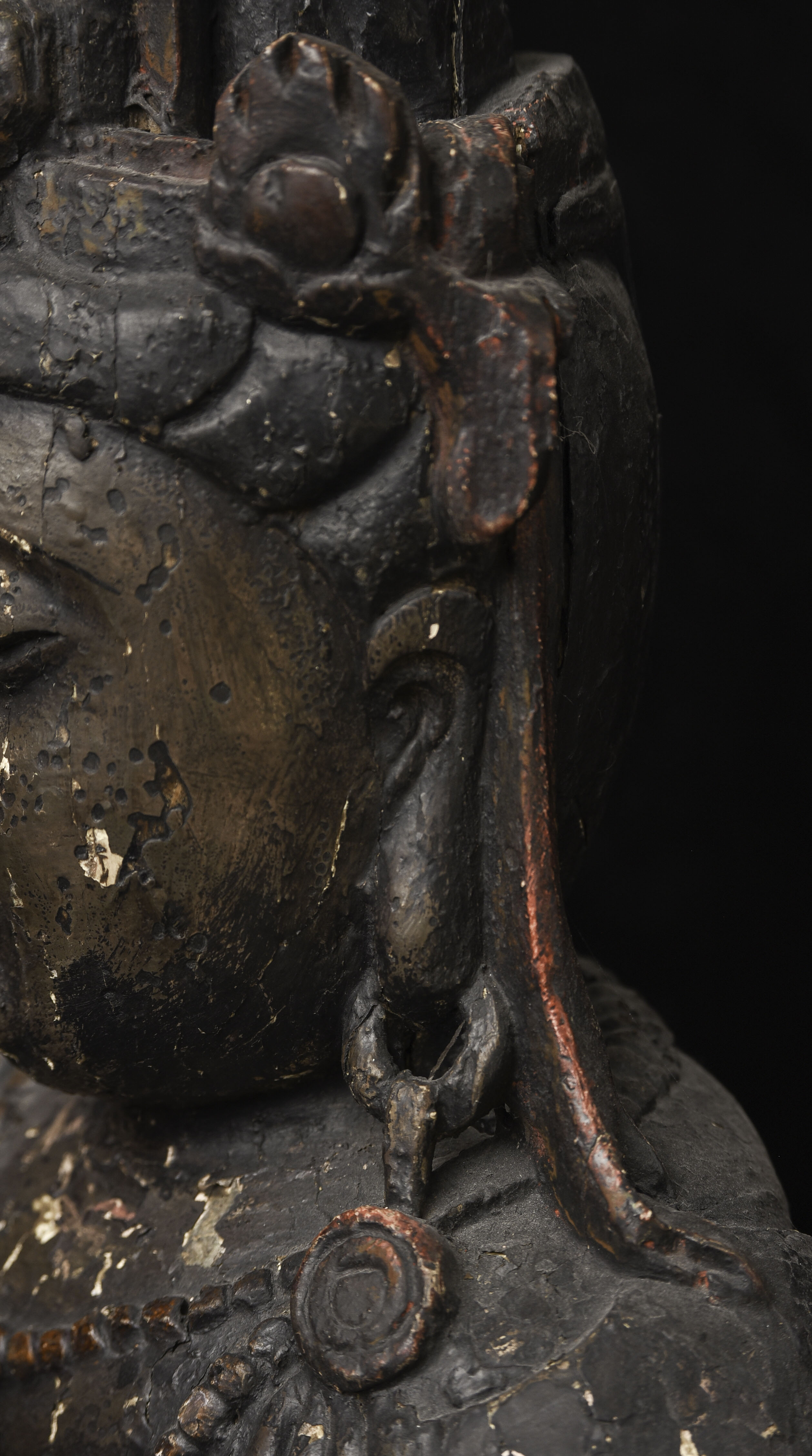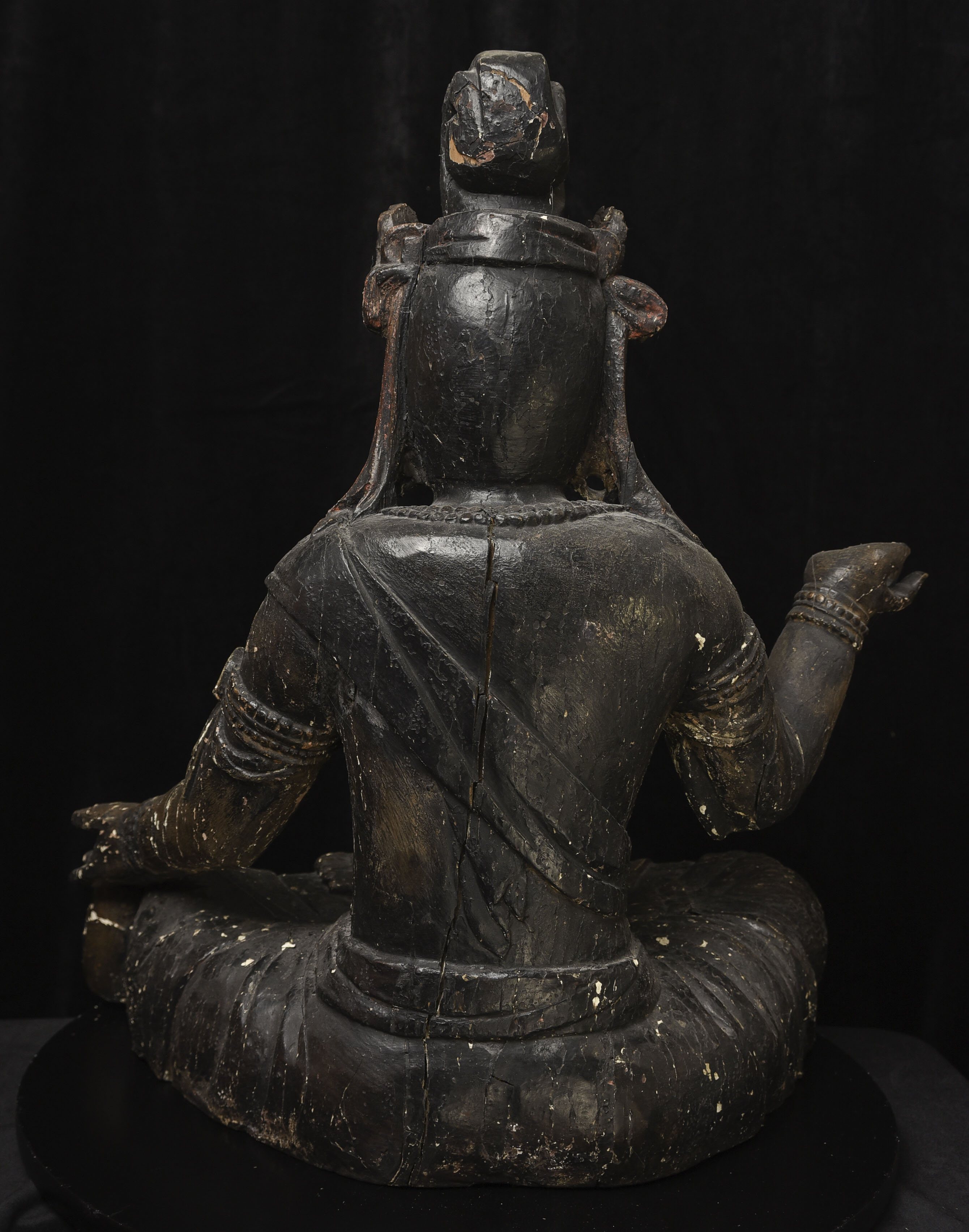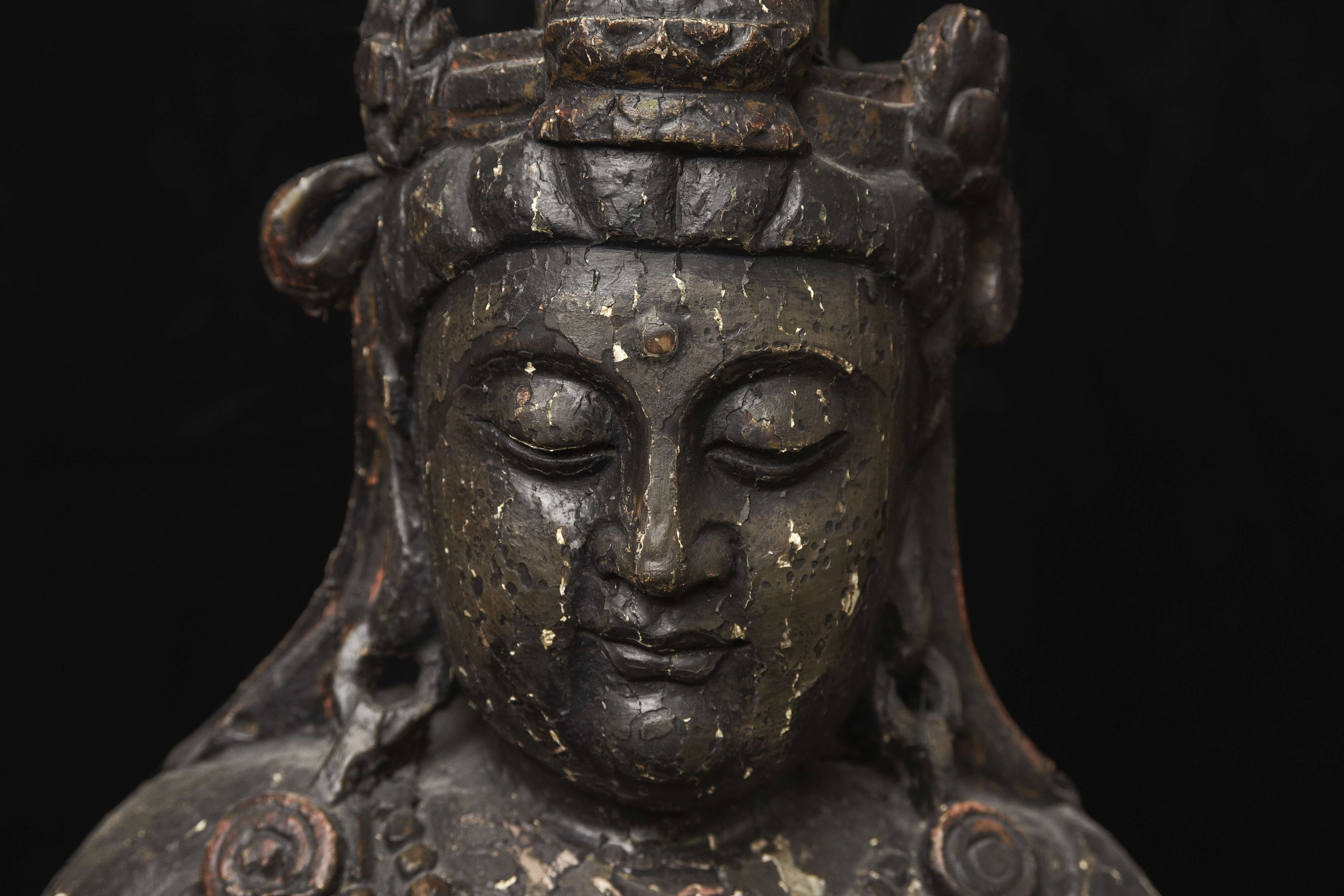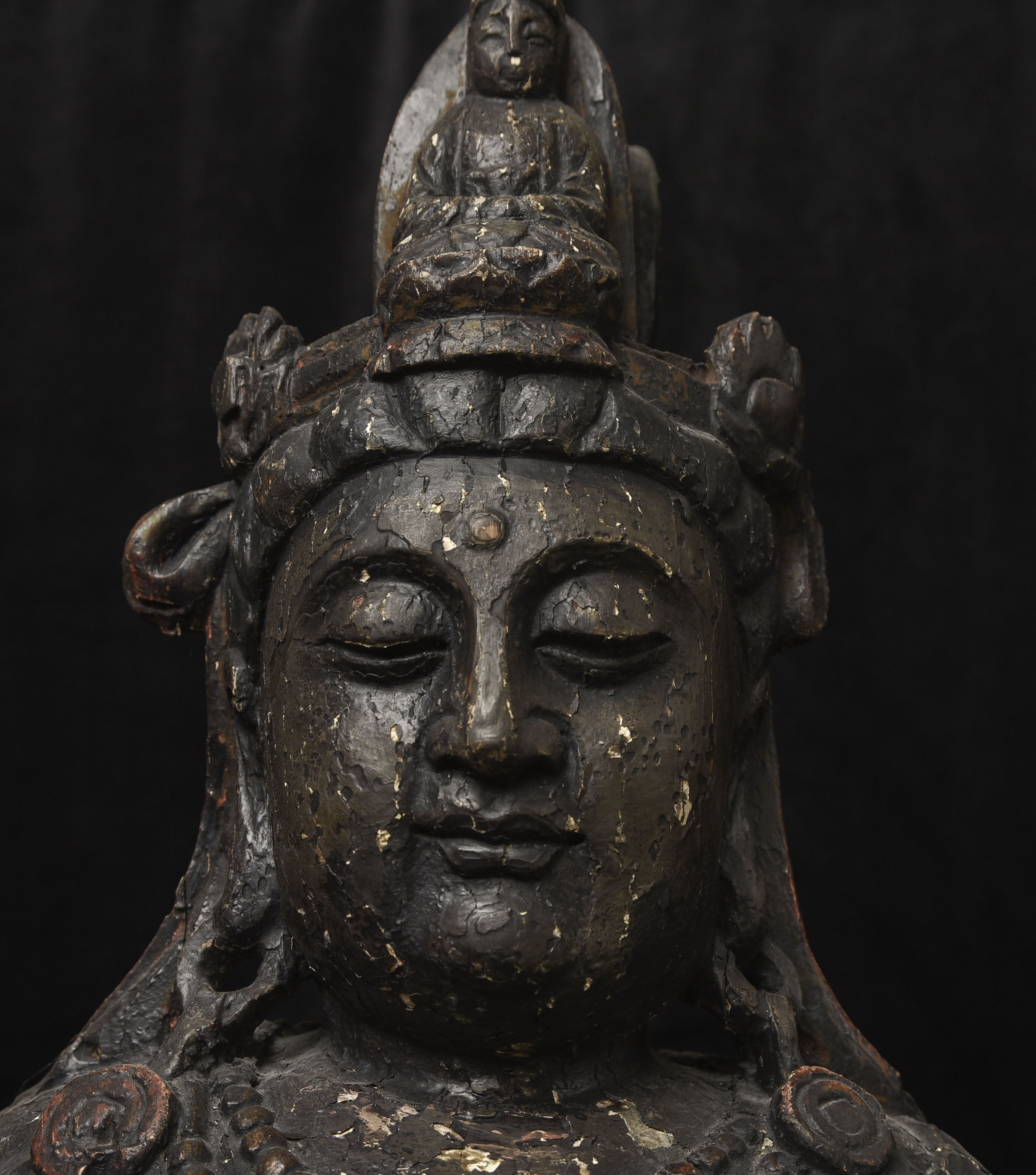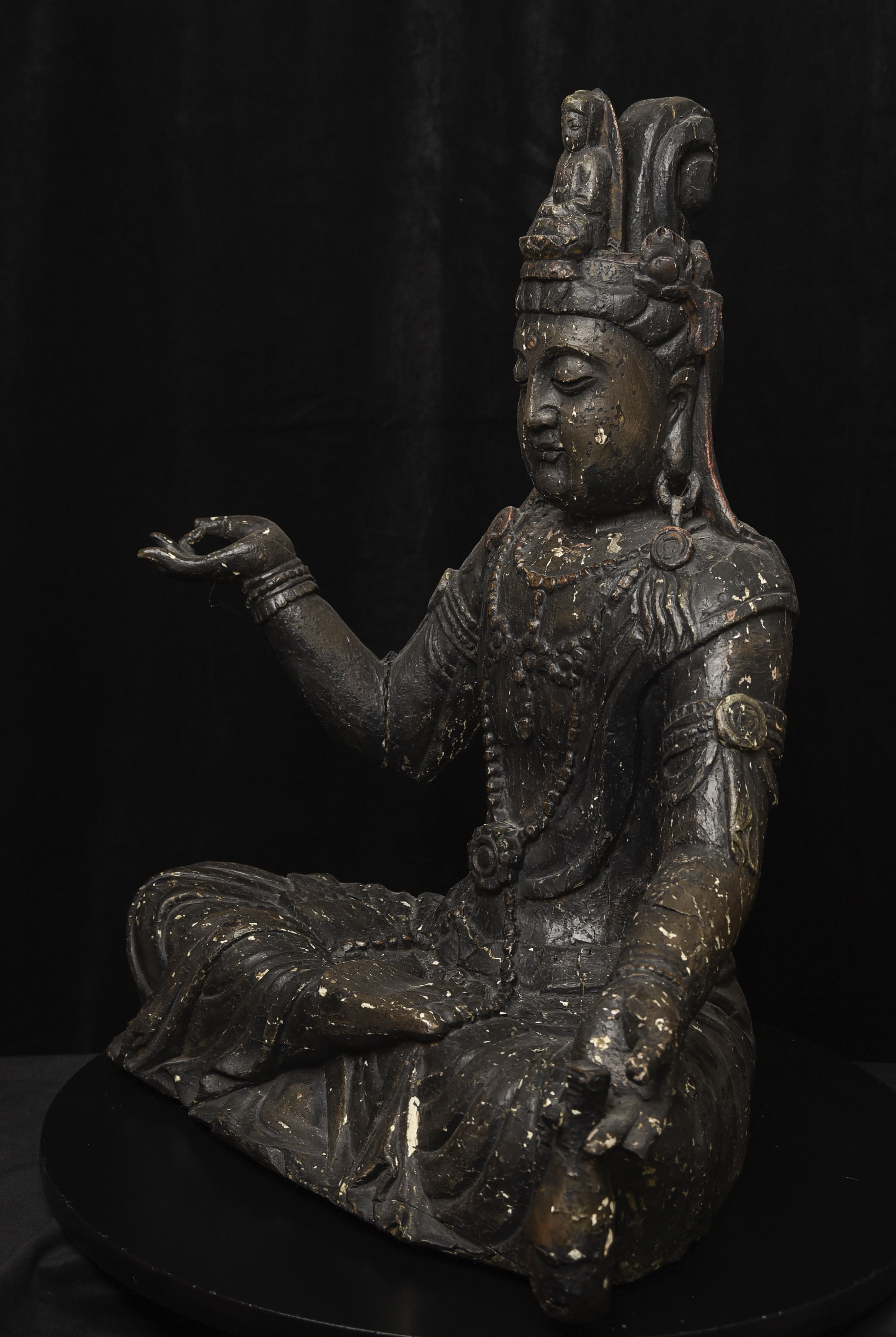 Large 16/17thC Korean Bodhisattva of Compassion (Kannon, or Korean equivalent of Guanyin). It looks contemporary with Early Ming, though I am unsure how to date precisely. The beautiful fragrance of camphor wood still comes through strongly. It looks to have been repainted or freshened many times. Please ask if you want more details on the condition. The patina is complex and still evolving (still shedding bits of gesso and lacquer, exposing the underlying material of the look of this particular sculpture- this will continue). Possible repairs to the arms, with one loose(probably loose a very long time). There is some shortening of fingers, but otherwise, it appears original and complete. Very skillful use of asymmetry in the overall composition. The subtle differences in the two sides of the headdress, ribbons, and jewelry are balanced perfectly by the very unusual Mudra or hand position. A large piece at 22 and 7/8 inches tall, 18 inches wide, and 10 and 1/2 inches deep. Big presence- fills a room. ( 14.32lbs / 6.495kg )