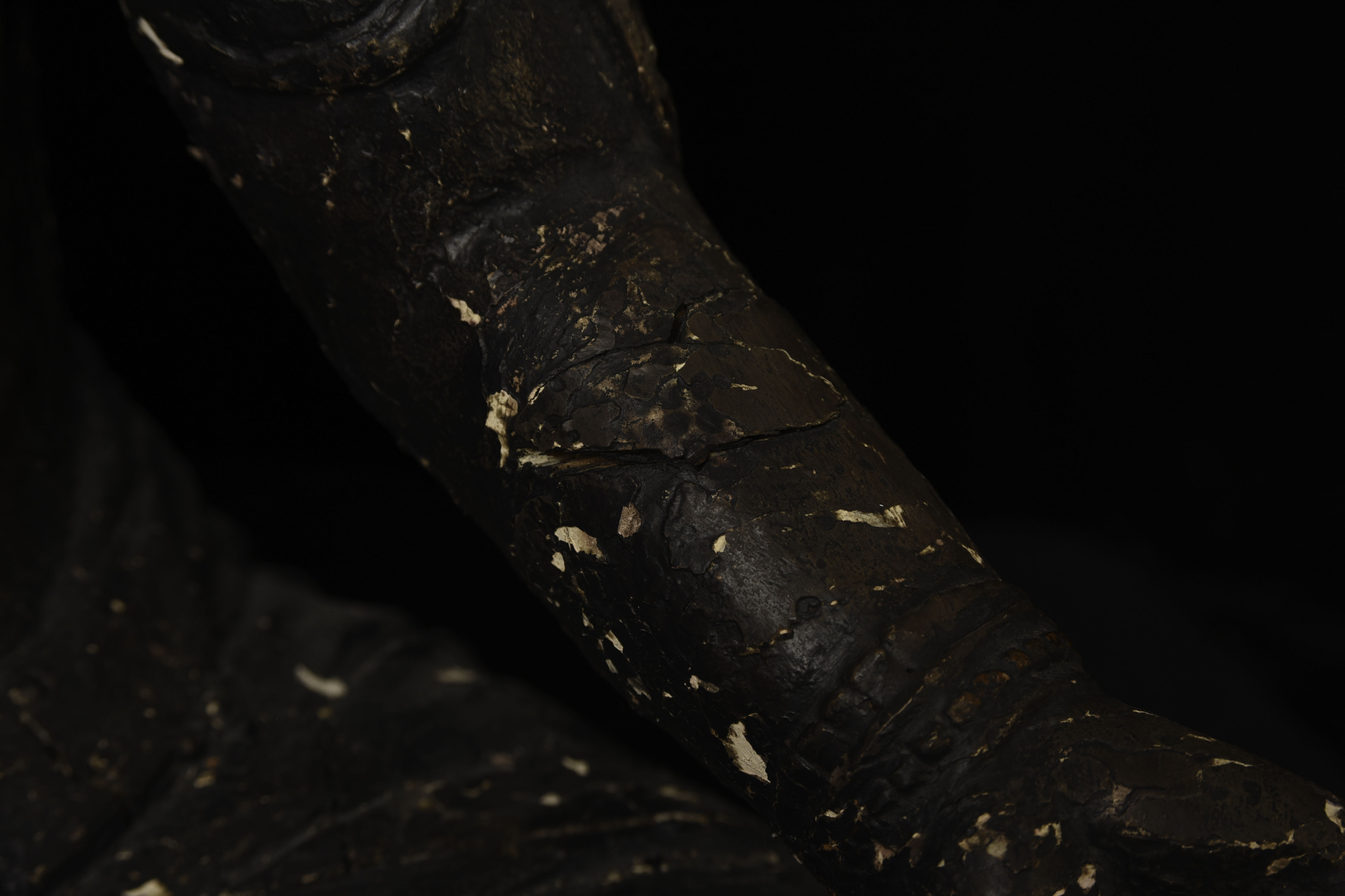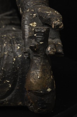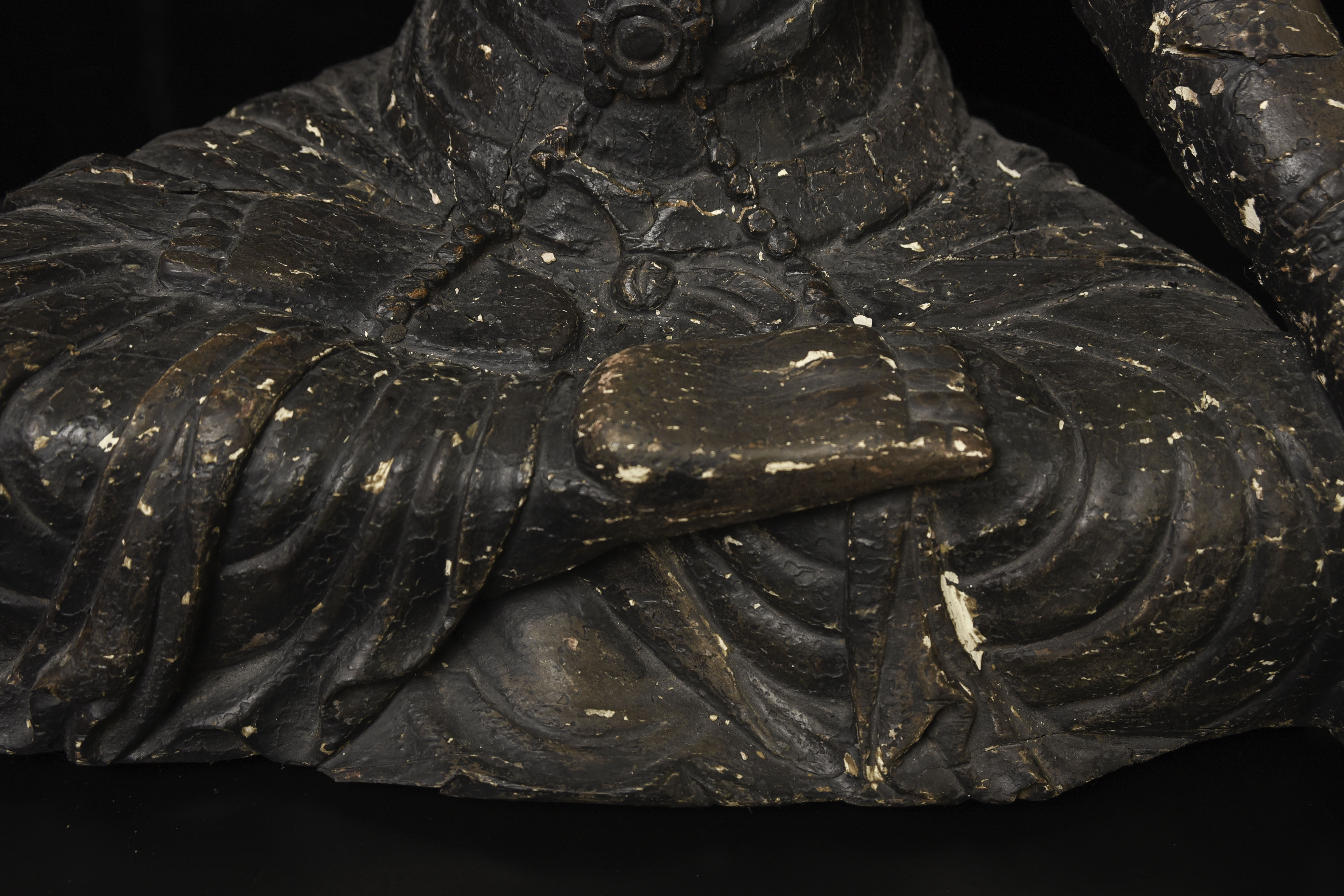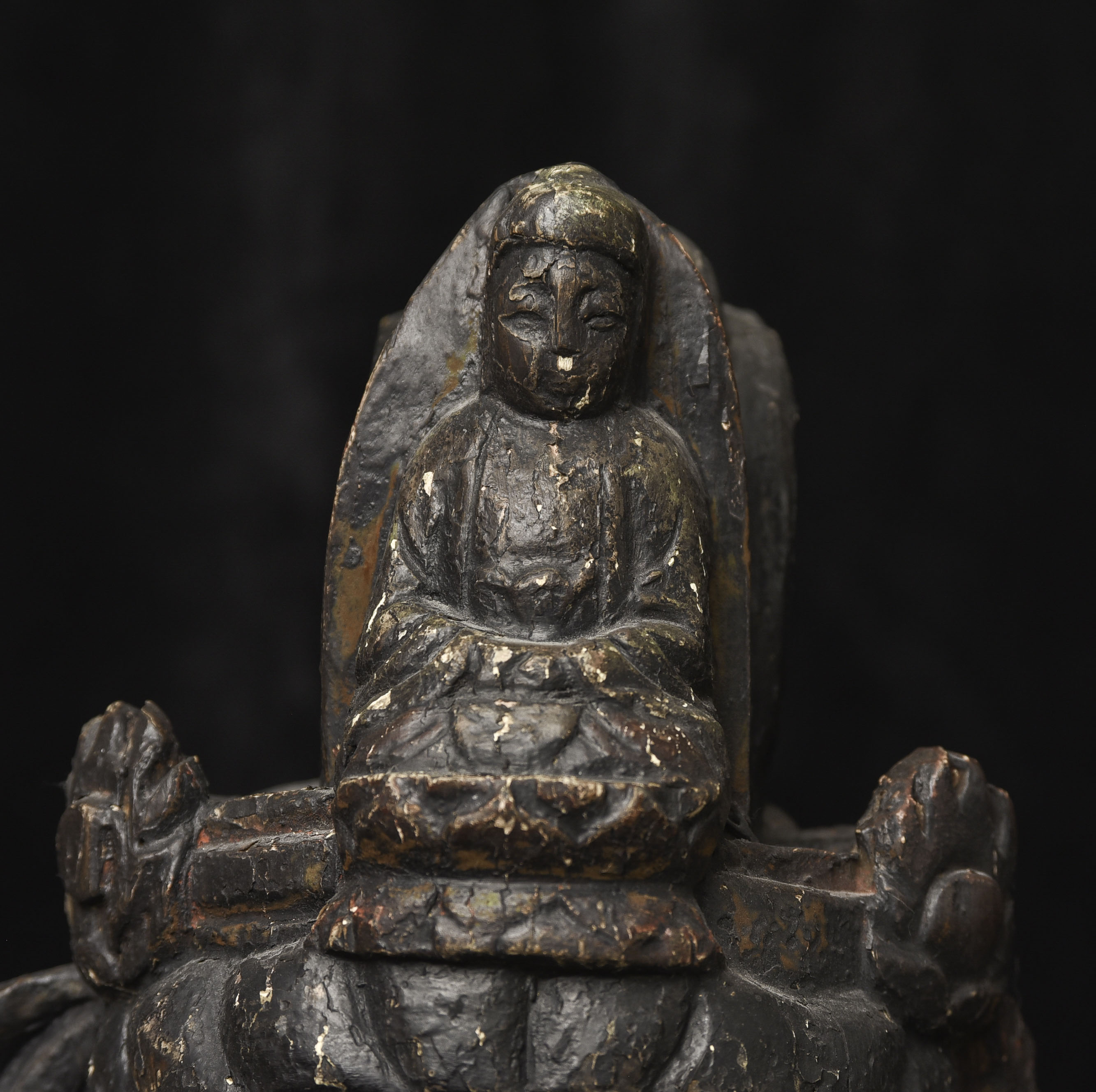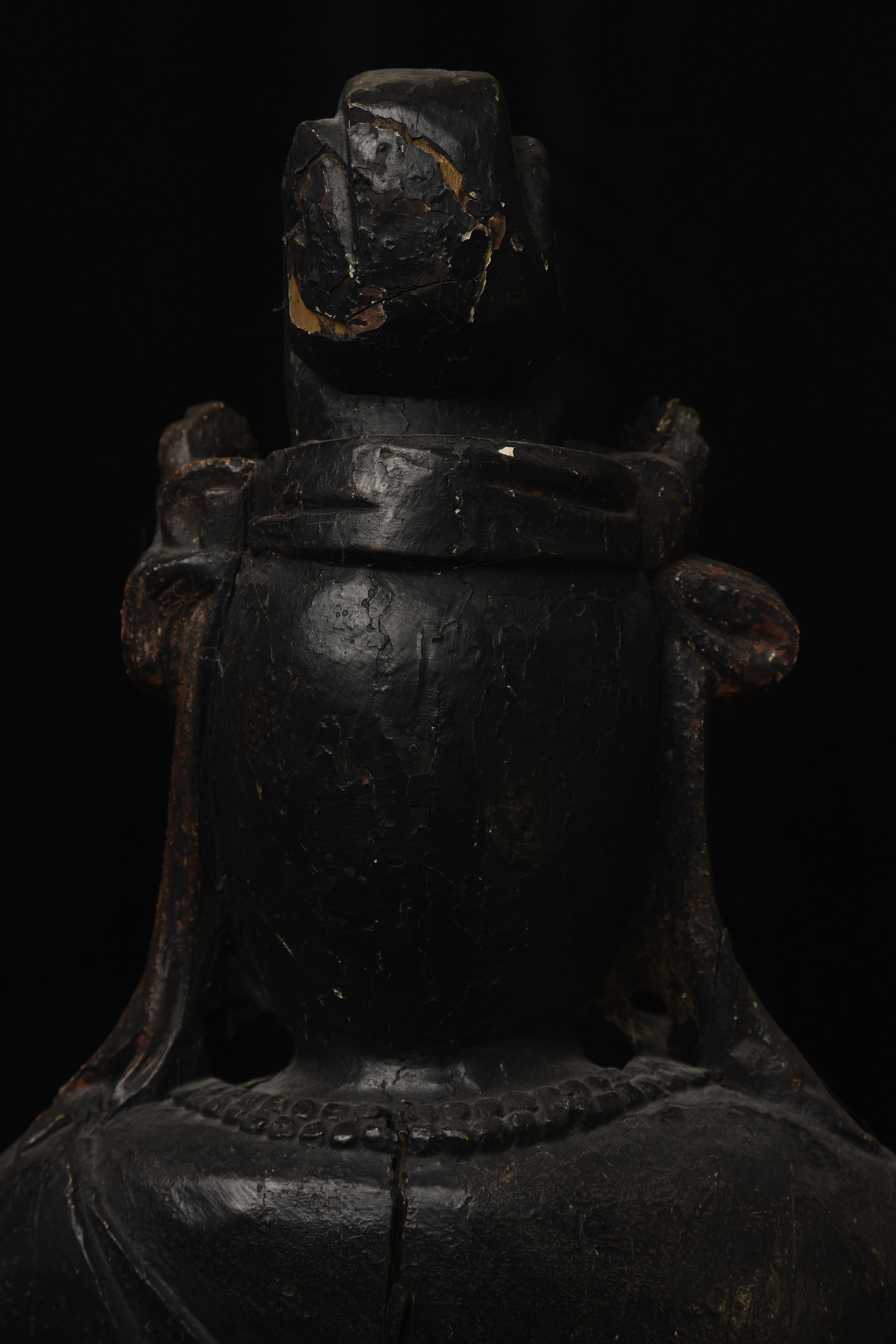 Large 16/17thC Korean Bodhisattva of Compassion (Kannon, or Korean equivalent of Guanyin). It looks contemporary with Early Ming, though I am unsure how to date precisely. The beautiful fragrance of camphor wood still comes through strongly. It looks to have been repainted or freshened many times. Please ask if you want more details on the condition. The patina is complex and still evolving (still shedding bits of gesso and lacquer, exposing the underlying material of the look of this particular sculpture- this will continue). Possible repairs to the arms, with one loose(probably loose a very long time). There is some shortening of fingers, but otherwise, it appears original and complete. Very skillful use of asymmetry in the overall composition. The subtle differences in the two sides of the headdress, ribbons, and jewelry are balanced perfectly by the very unusual Mudra or hand position. A large piece at 22 and 7/8 inches tall, 18 inches wide, and 10 and 1/2 inches deep. Big presence- fills a room. ( 14.32lbs / 6.495kg )
