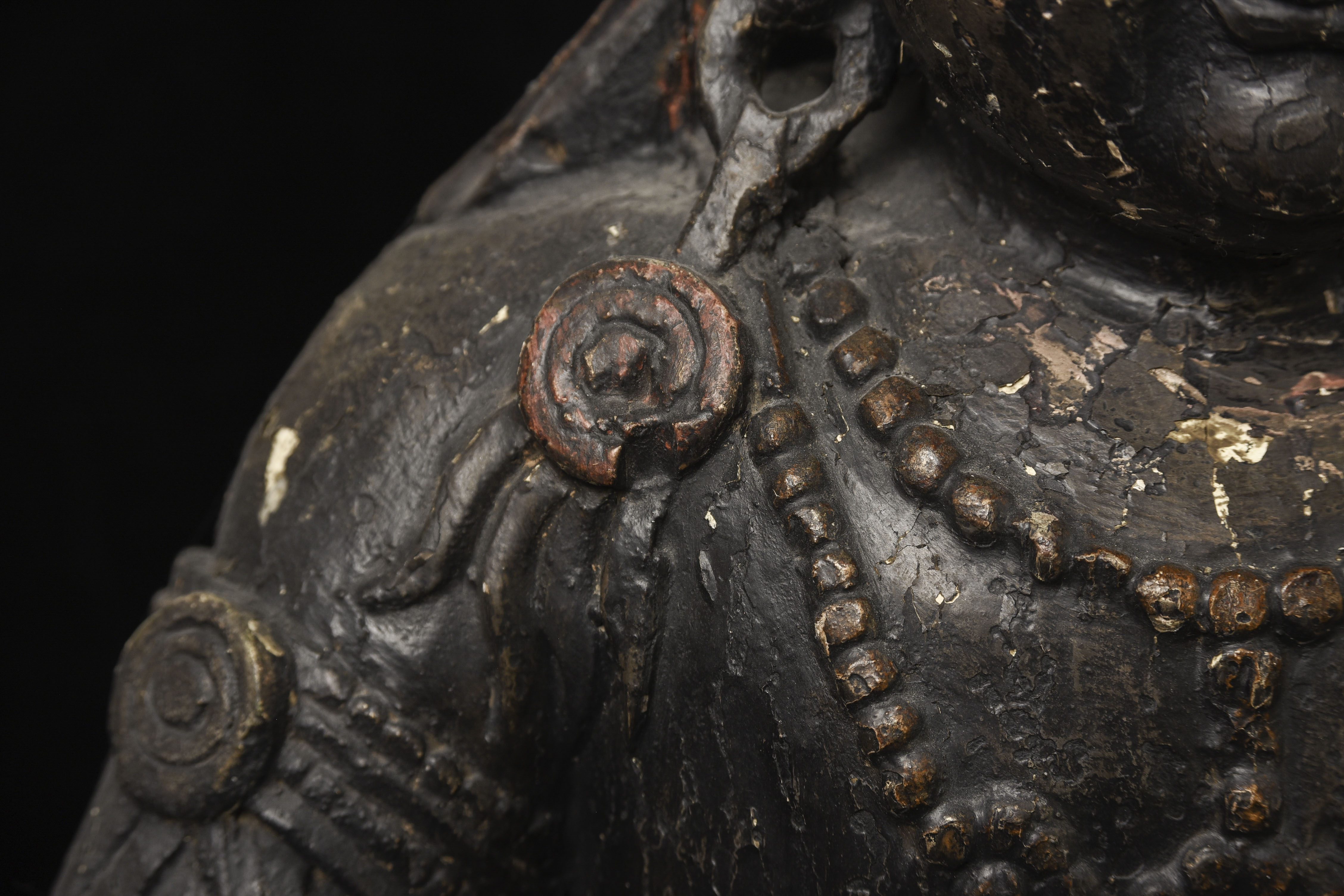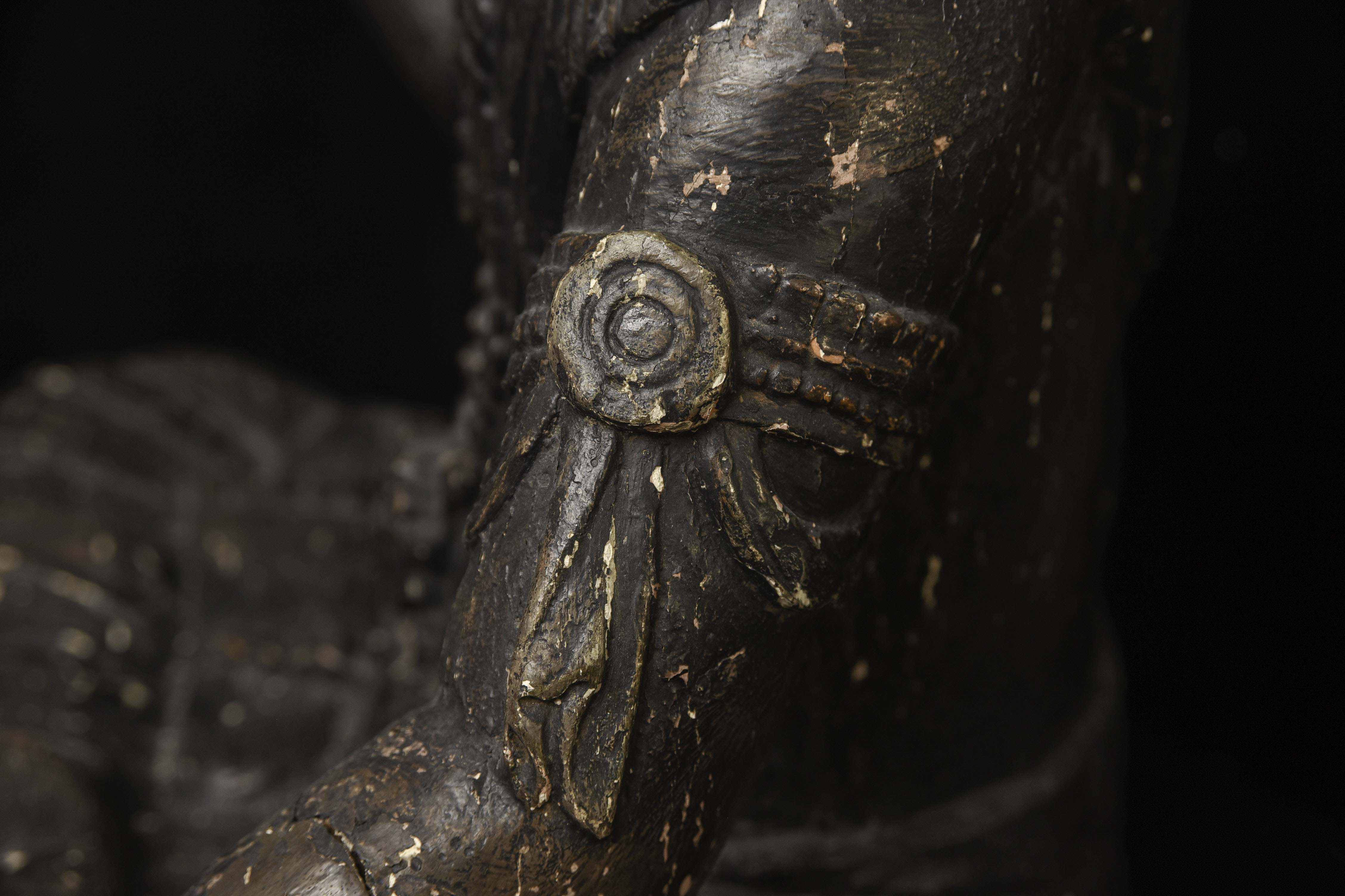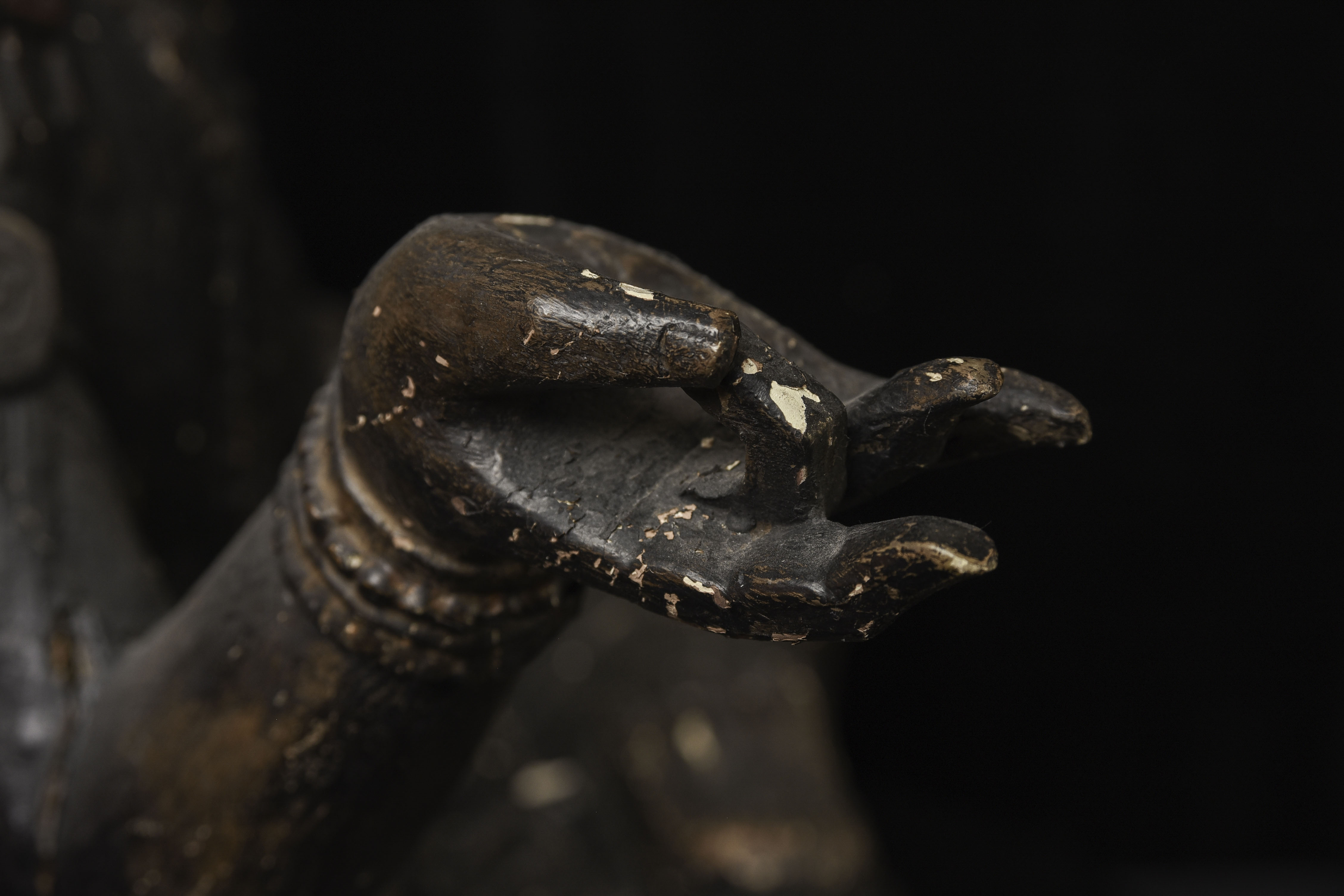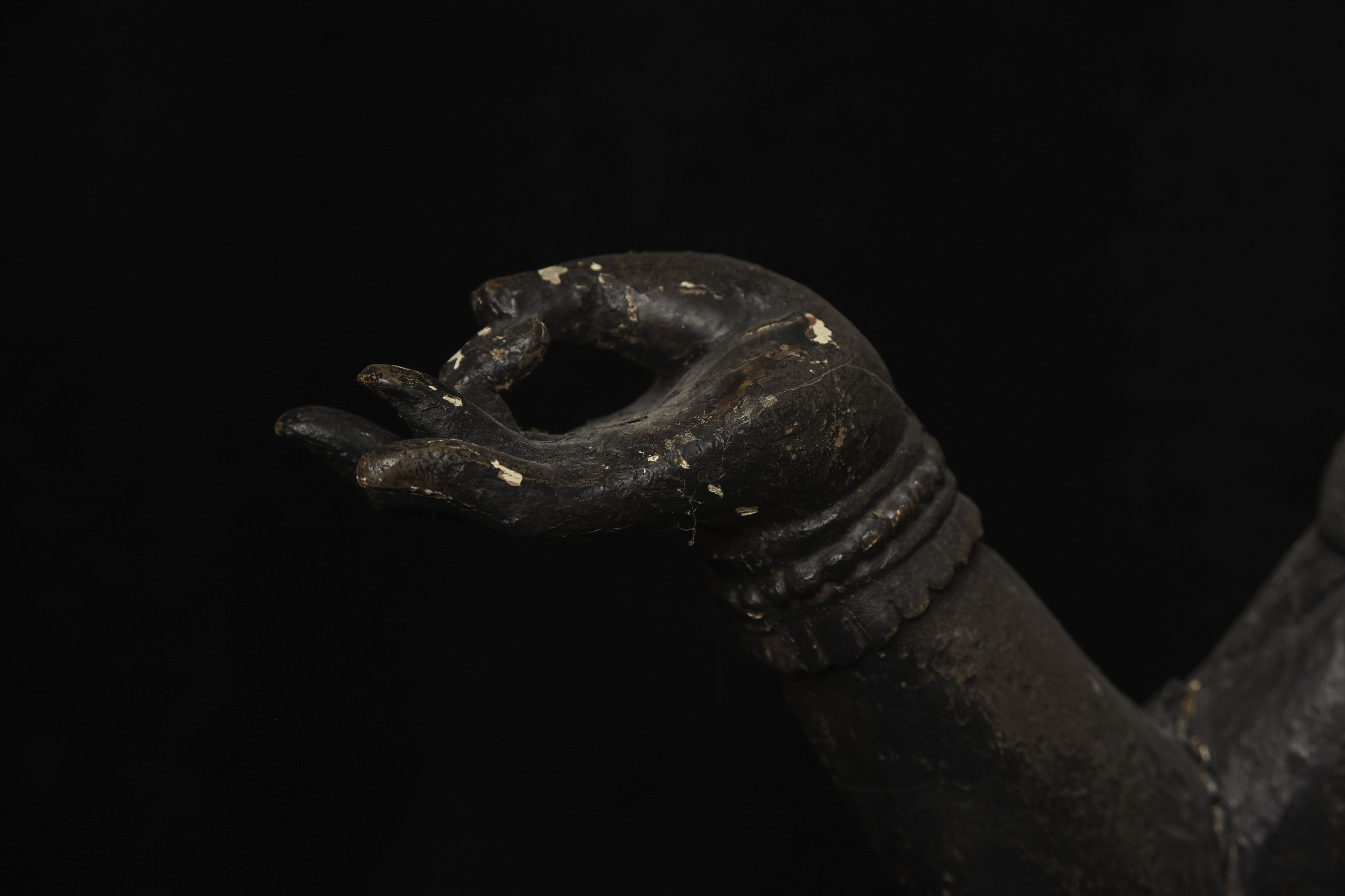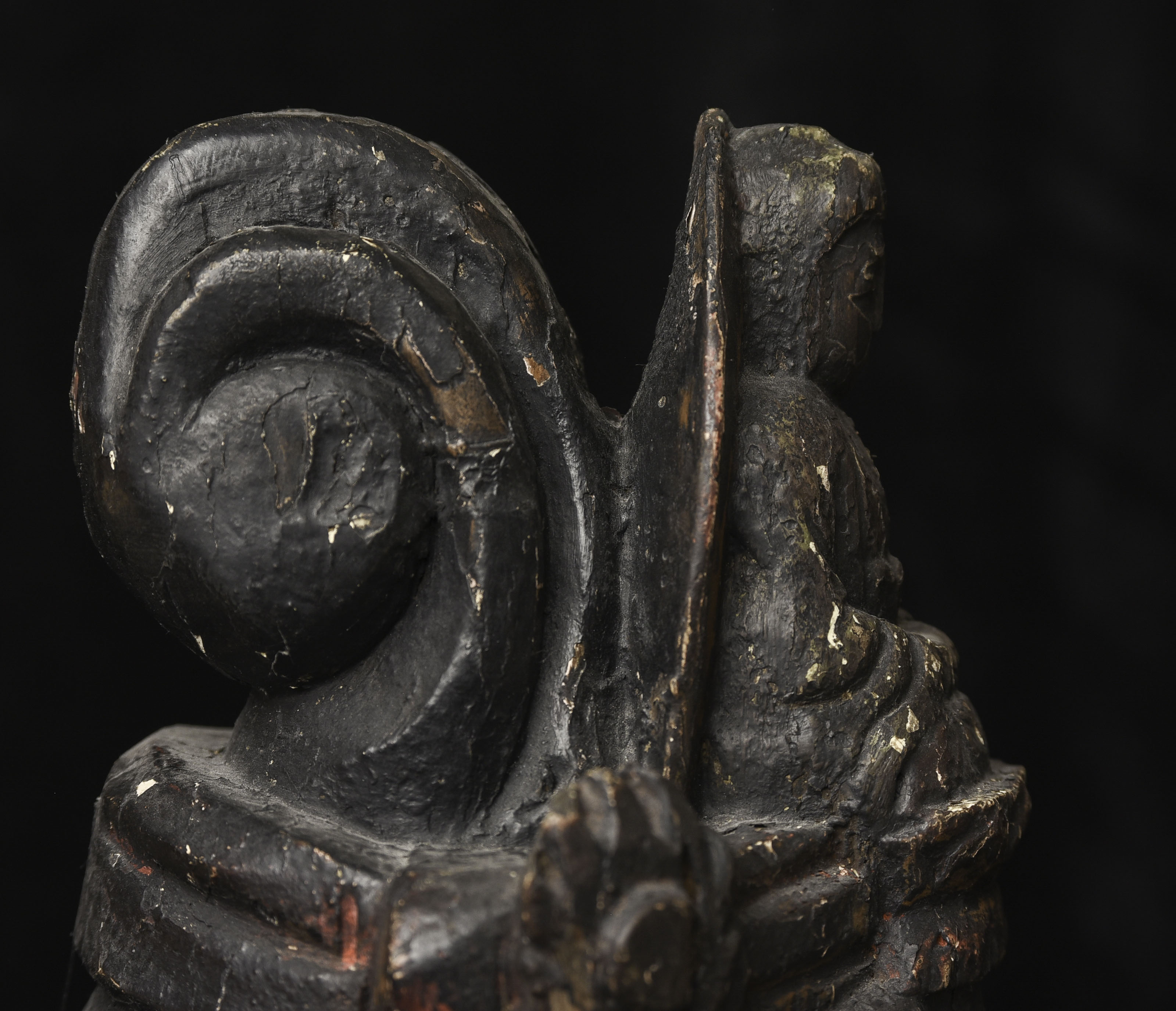 Large 16/17thC Korean Bodhisattva of Compassion (Kannon, or Korean equivalent of Guanyin). It looks contemporary with Early Ming, though I am unsure how to date precisely. The beautiful fragrance of camphor wood still comes through strongly. It looks to have been repainted or freshened many times. Please ask if you want more details on the condition. The patina is complex and still evolving (still shedding bits of gesso and lacquer, exposing the underlying material of the look of this particular sculpture- this will continue). Possible repairs to the arms, with one loose(probably loose a very long time). There is some shortening of fingers, but otherwise, it appears original and complete. Very skillful use of asymmetry in the overall composition. The subtle differences in the two sides of the headdress, ribbons, and jewelry are balanced perfectly by the very unusual Mudra or hand position. A large piece at 22 and 7/8 inches tall, 18 inches wide, and 10 and 1/2 inches deep. Big presence- fills a room. ( 14.32lbs / 6.495kg )