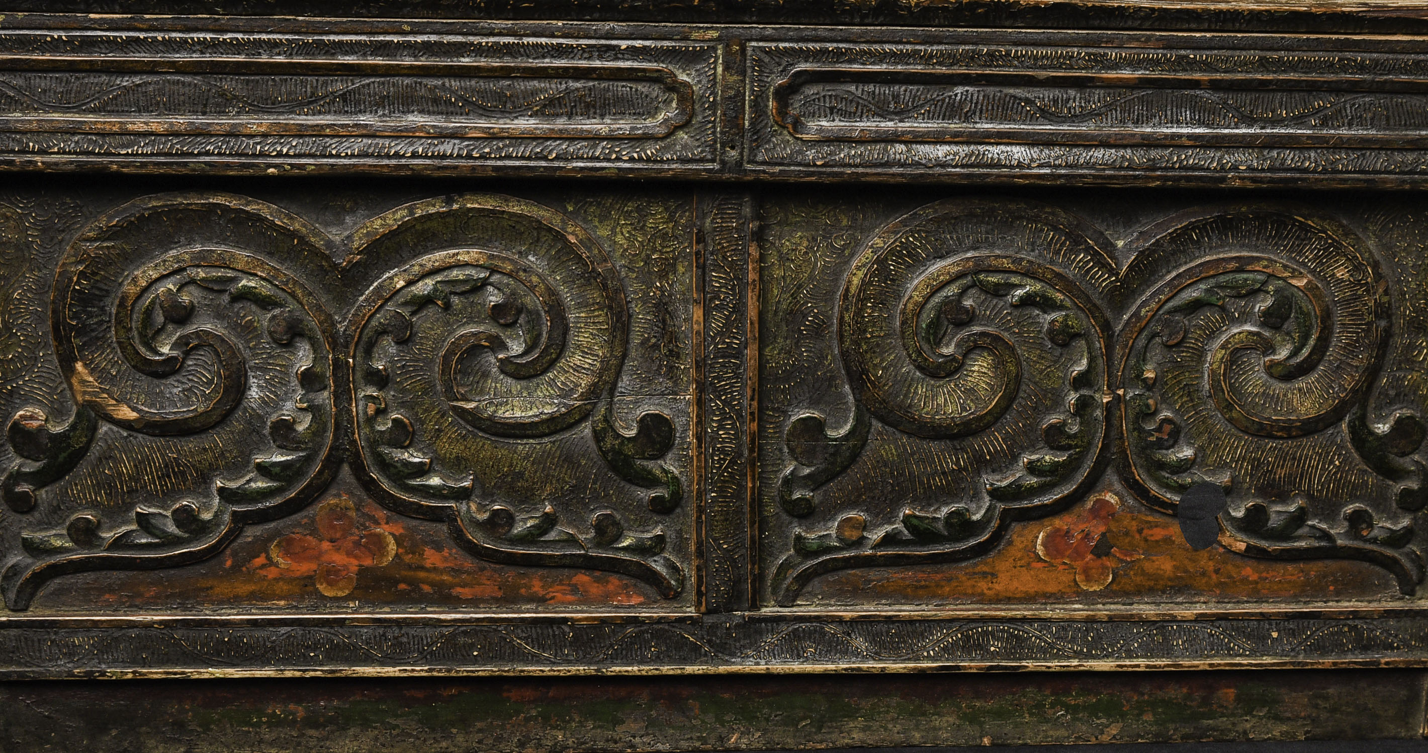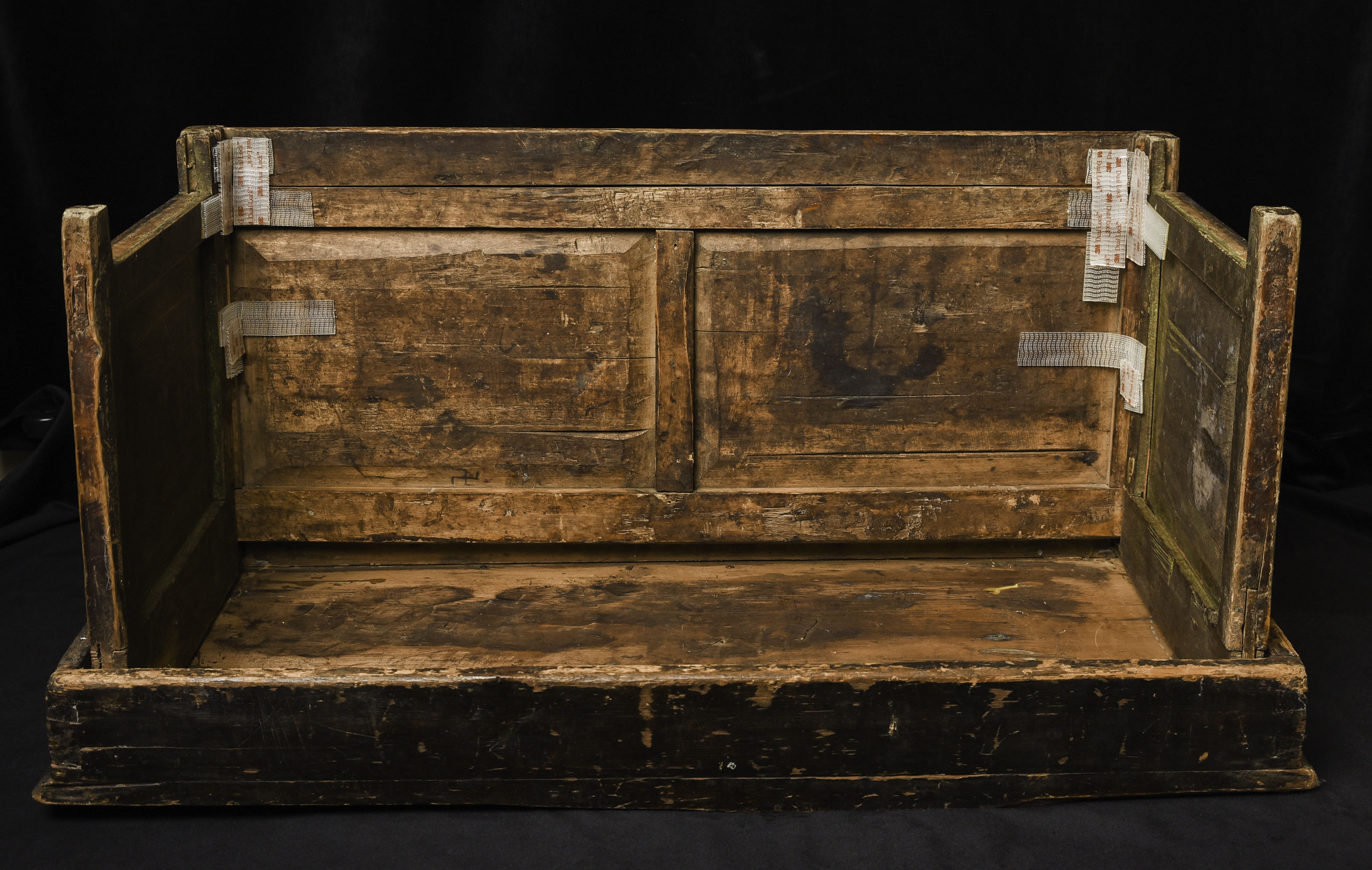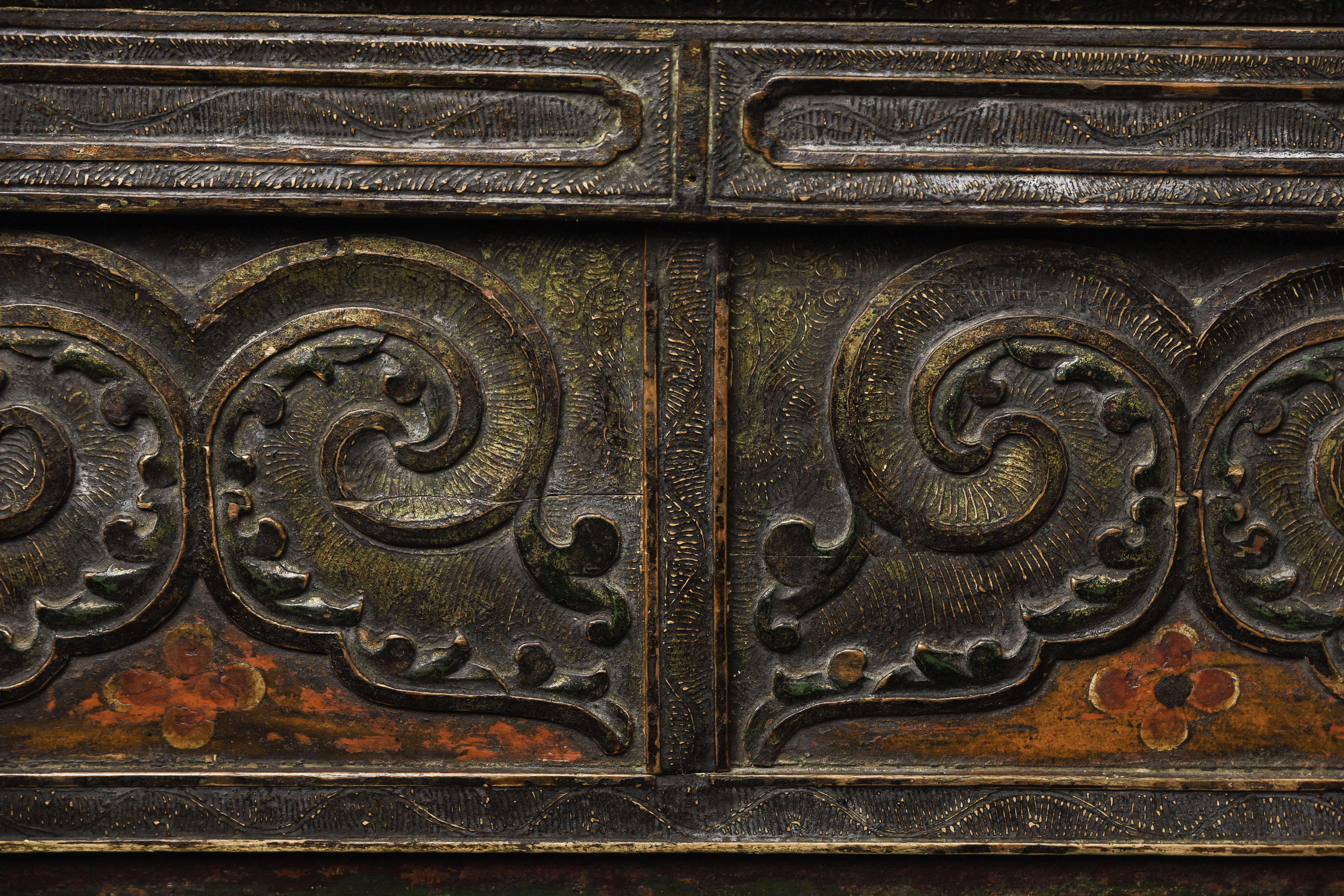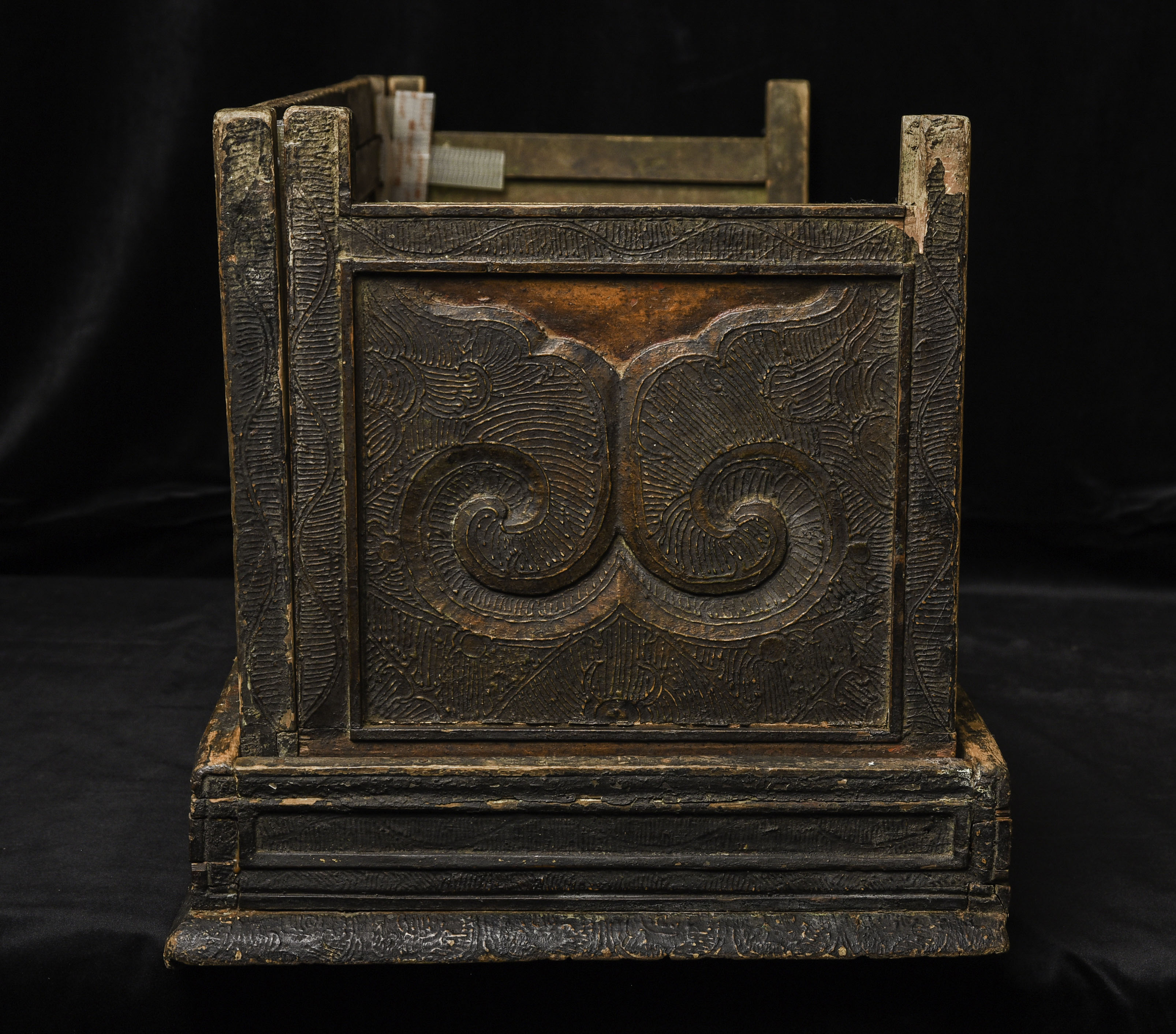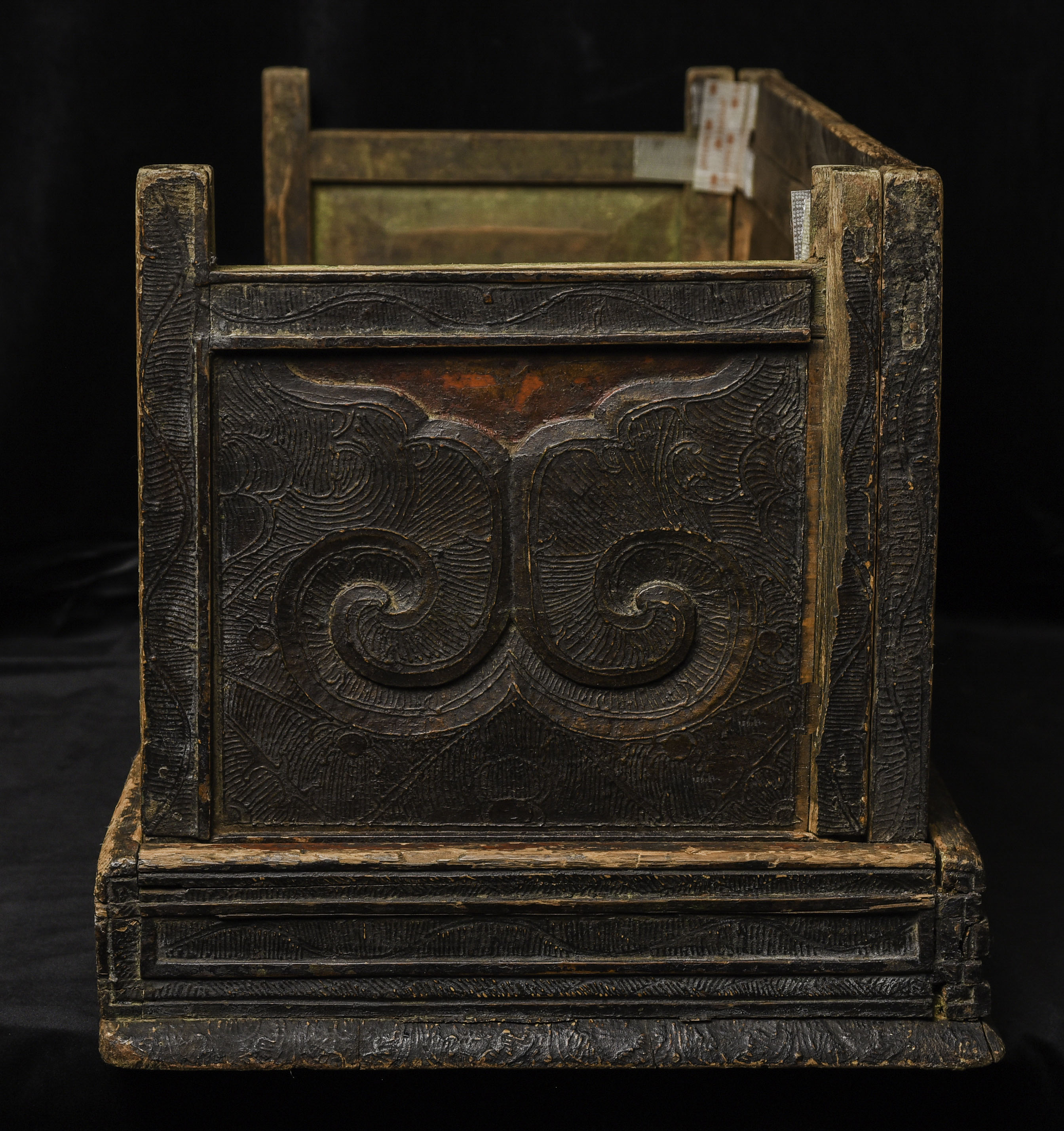 Early Tibetan altar table. Larger than most at 14 inches high, 31 inches wide, 14 inches deep (when not folded). I am not expert on this type, but I believe it is pre-17thC) based on the design, ornamentation, and look of the wood. Beautiful!!