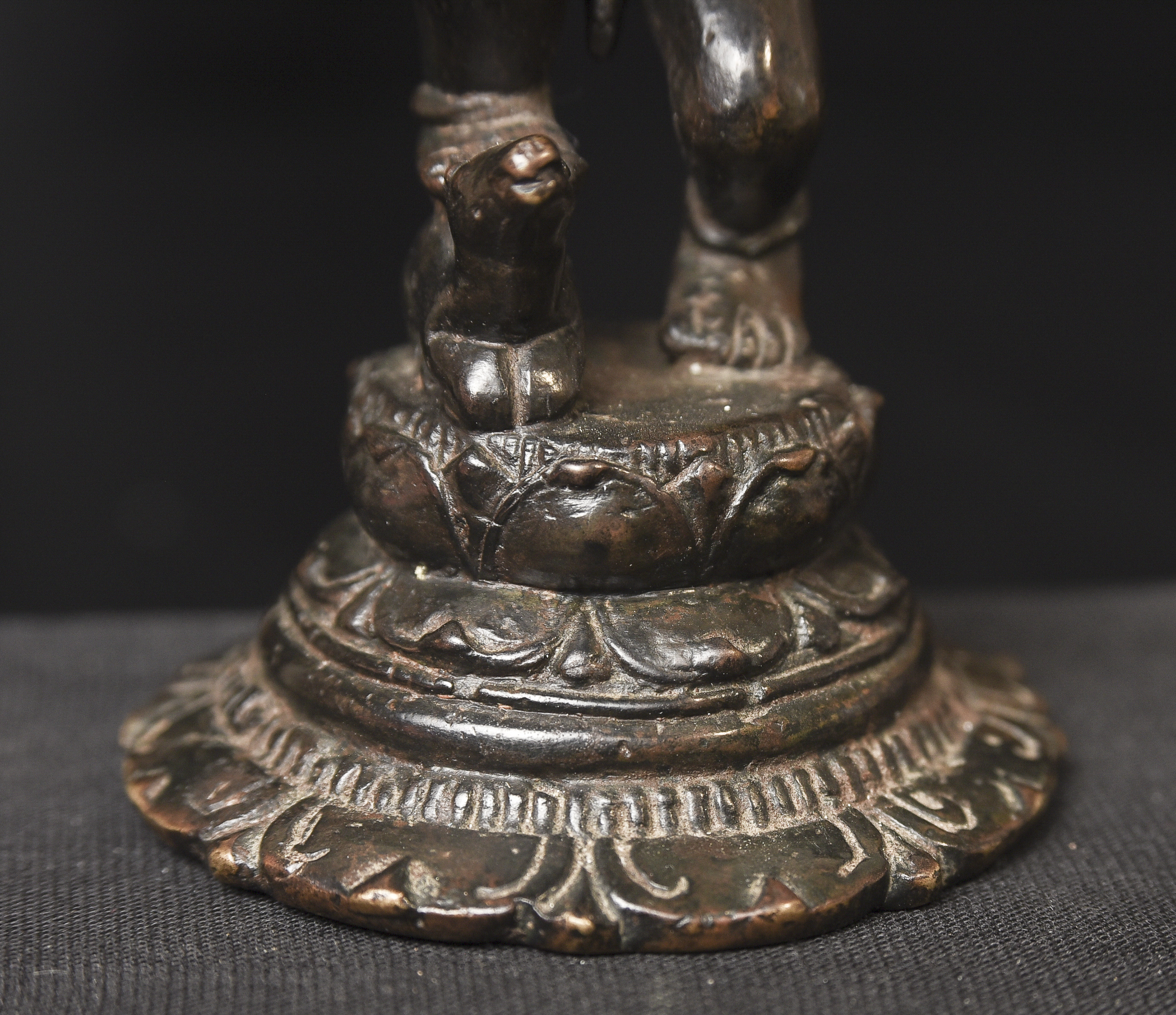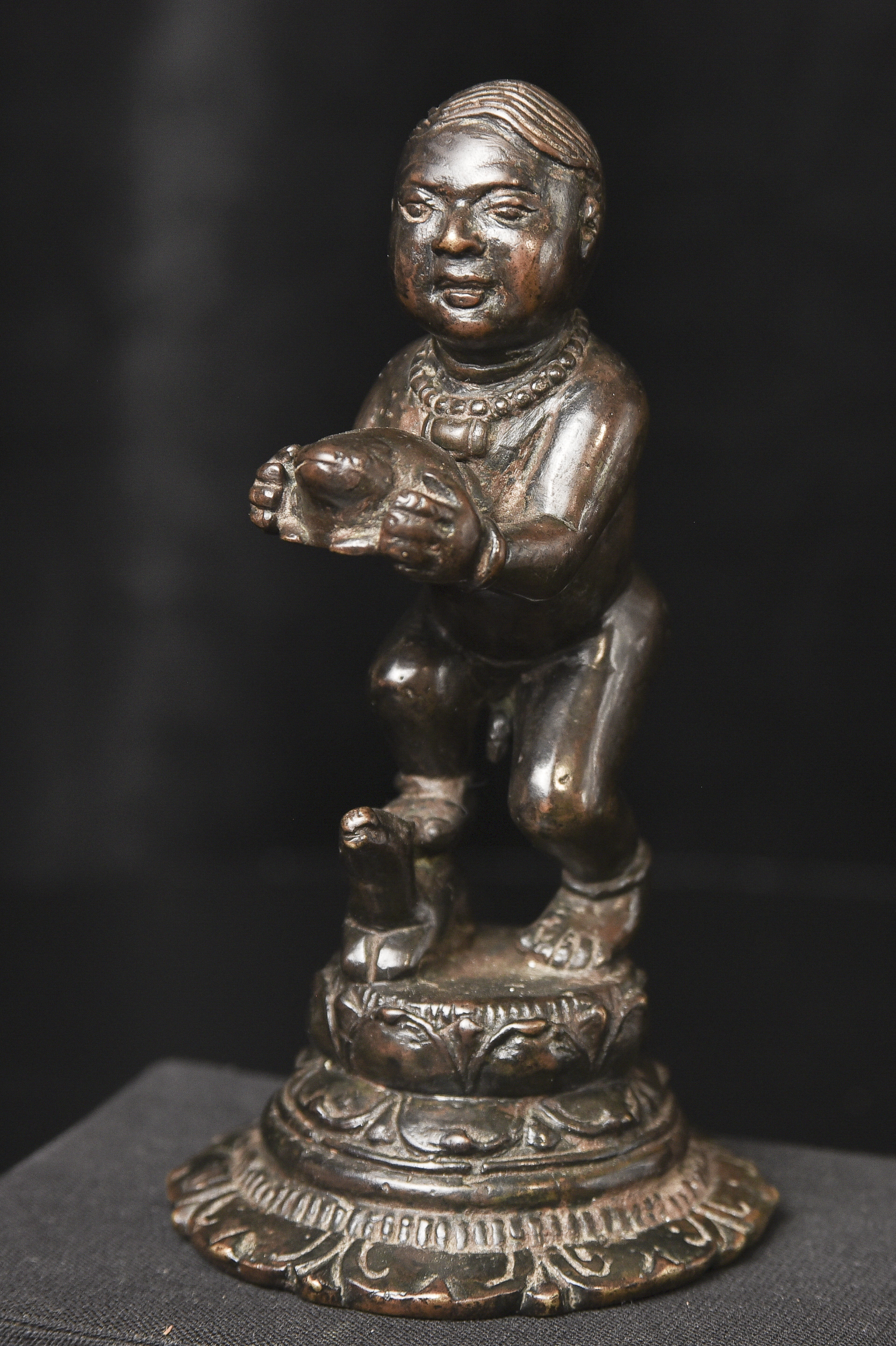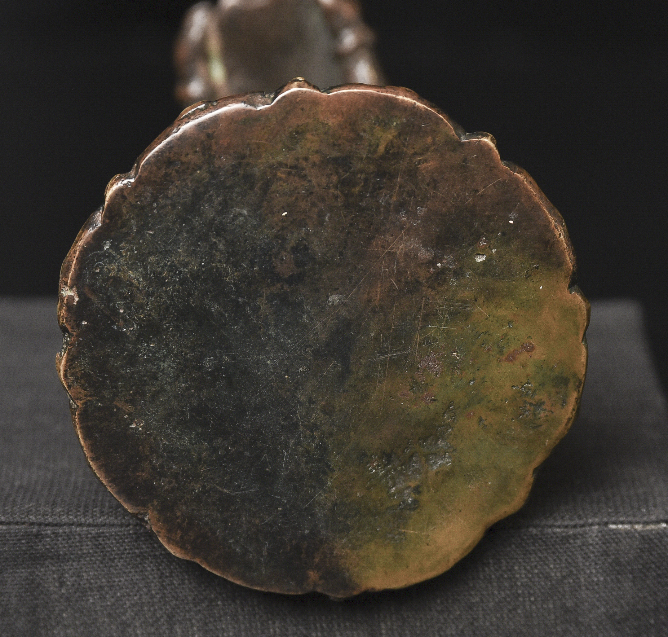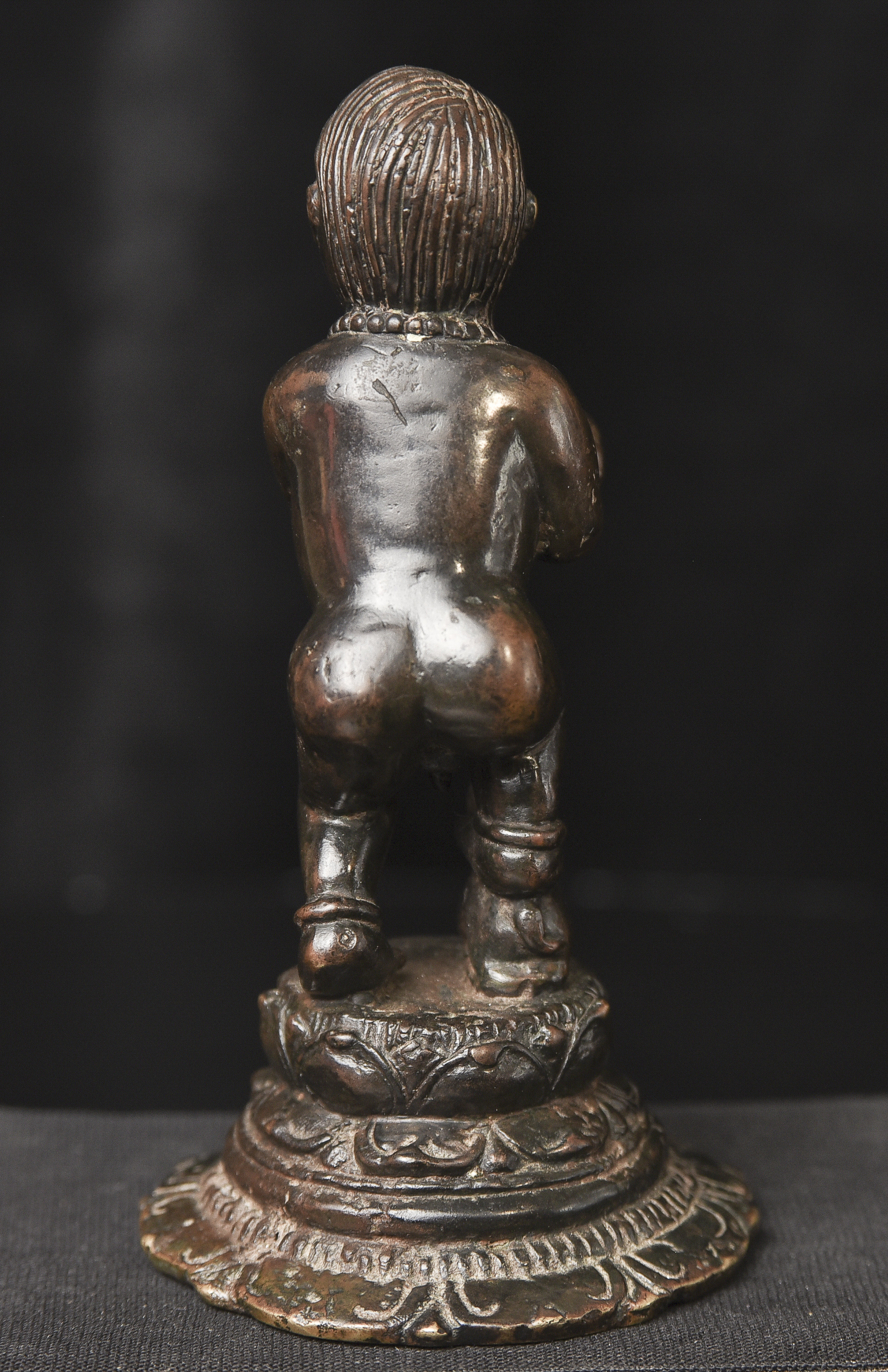Highly unusual antique solid-cast Chinese youthful figure with giant frog. 4.75" tall. Probably Ching.