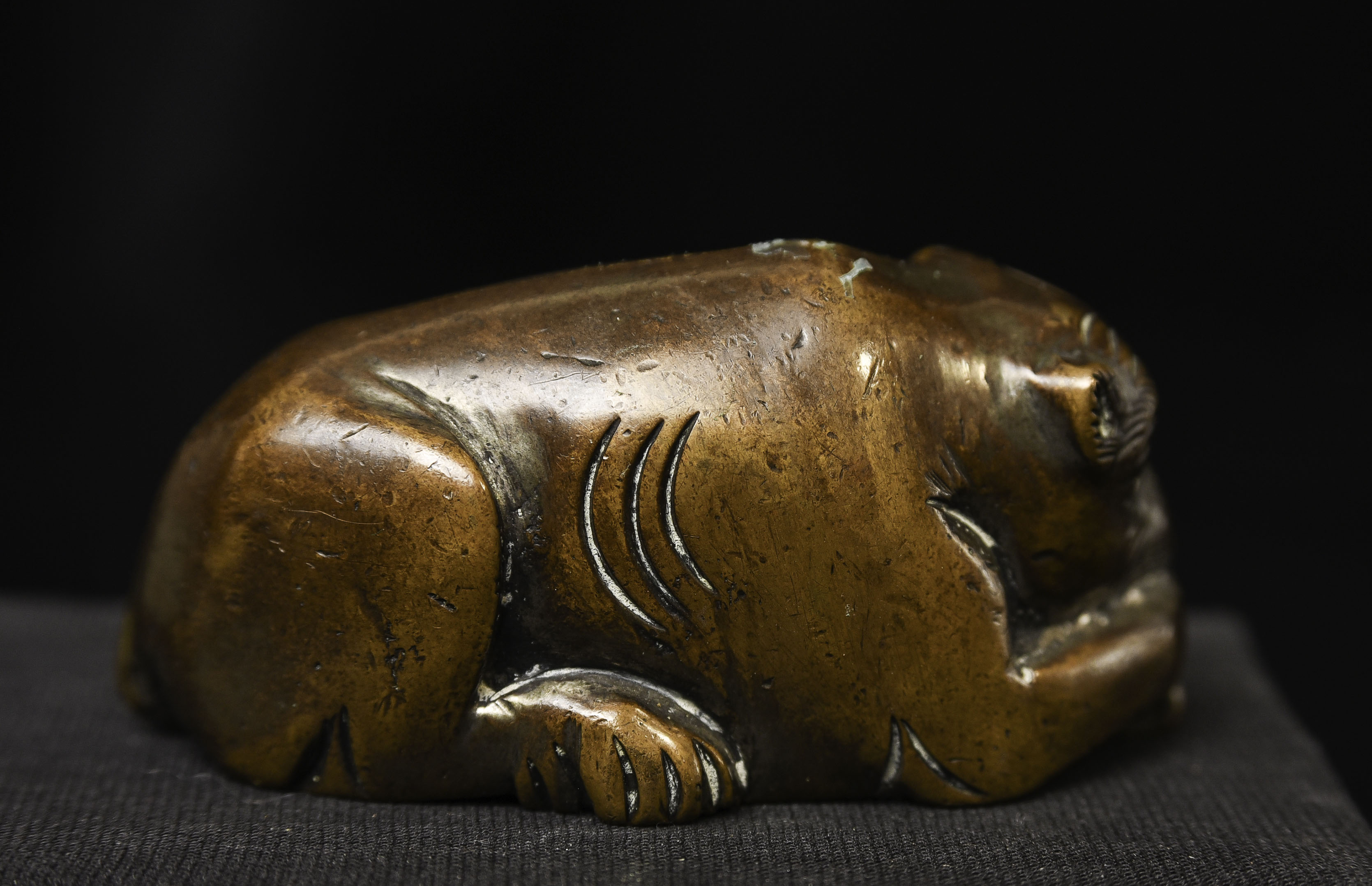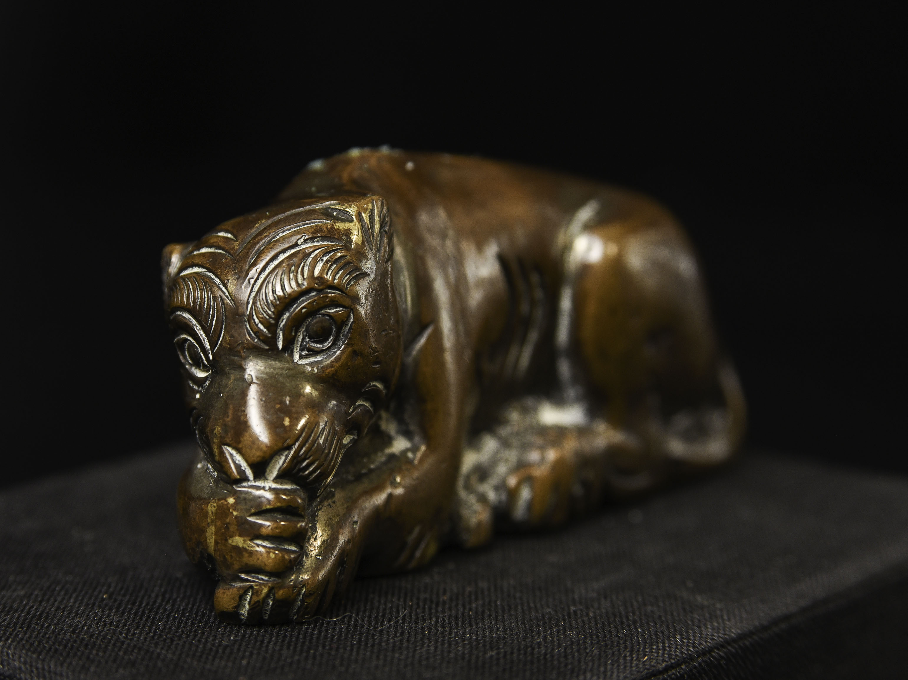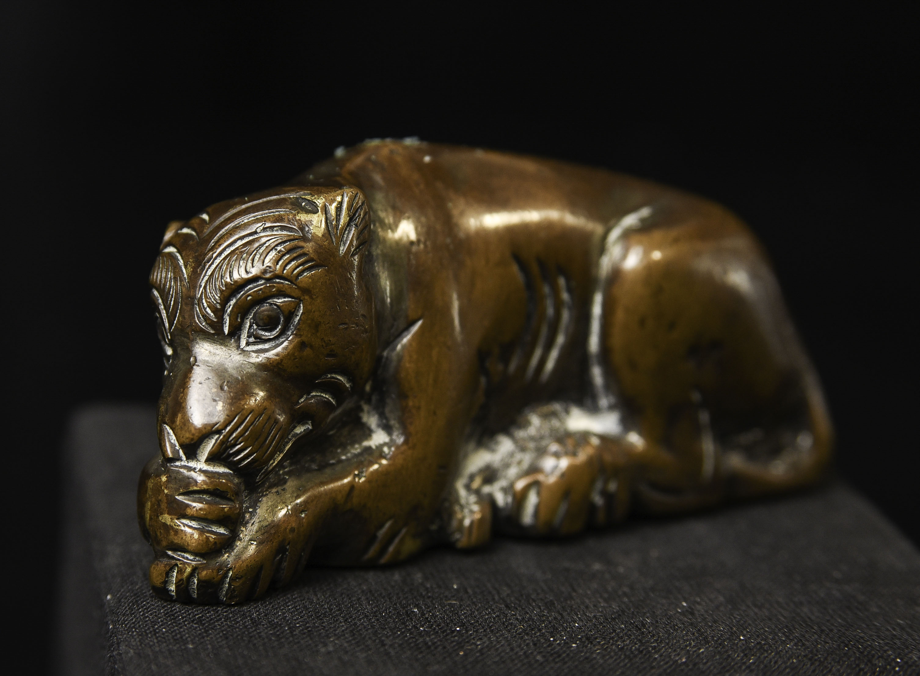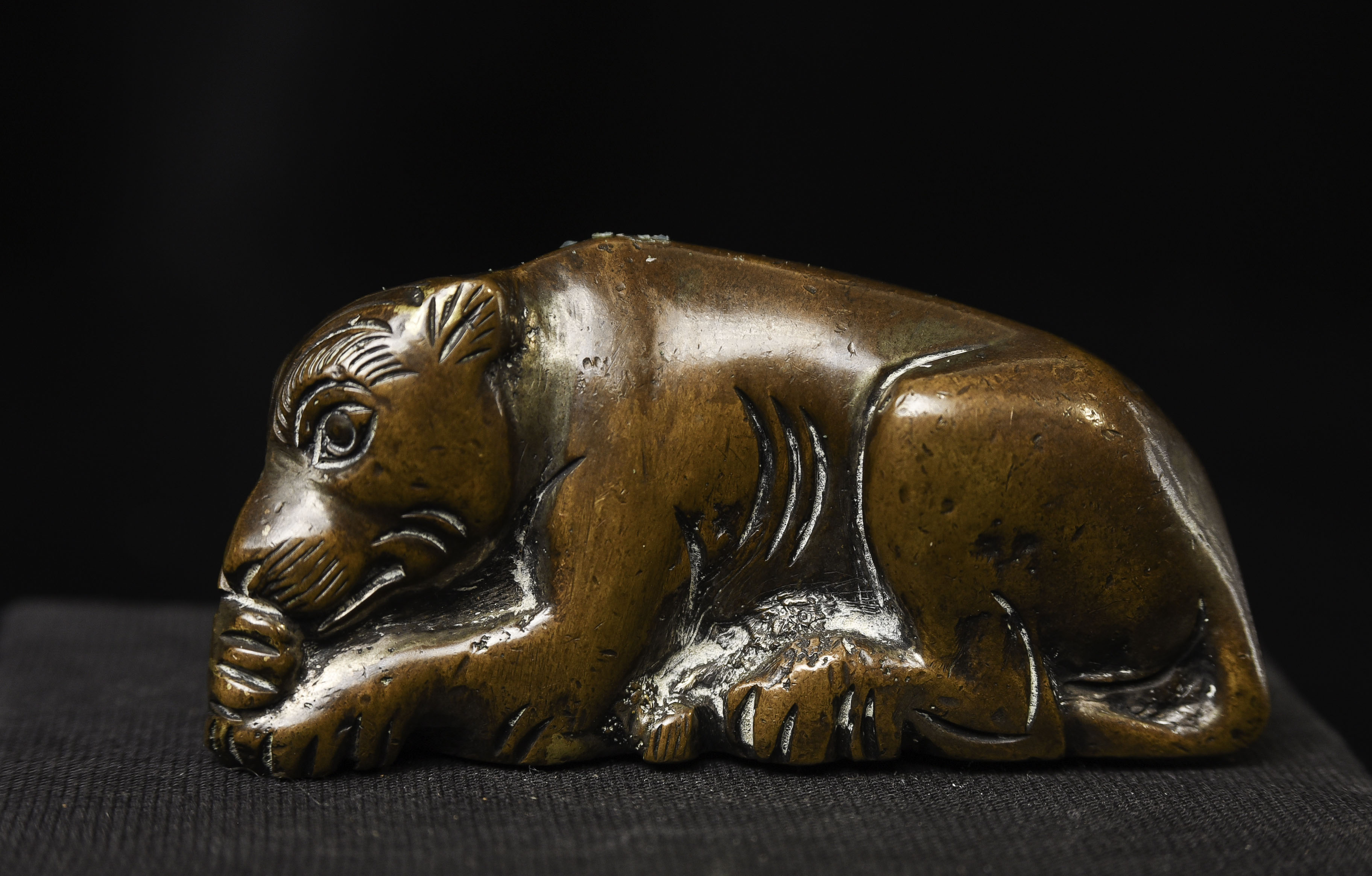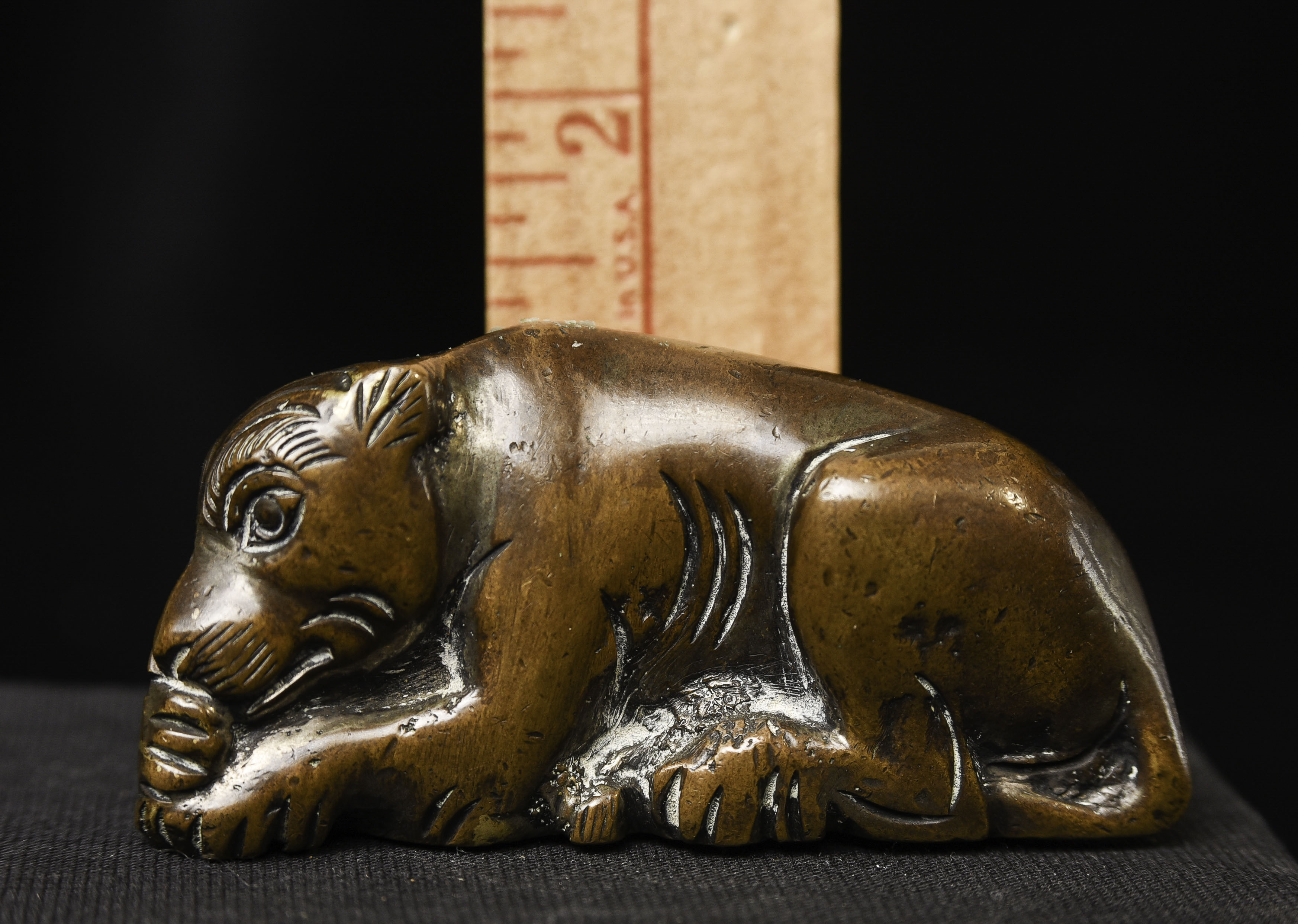 18/19thC Chinese scroll weight of an animated lion. Solid-cast, and 3" long.