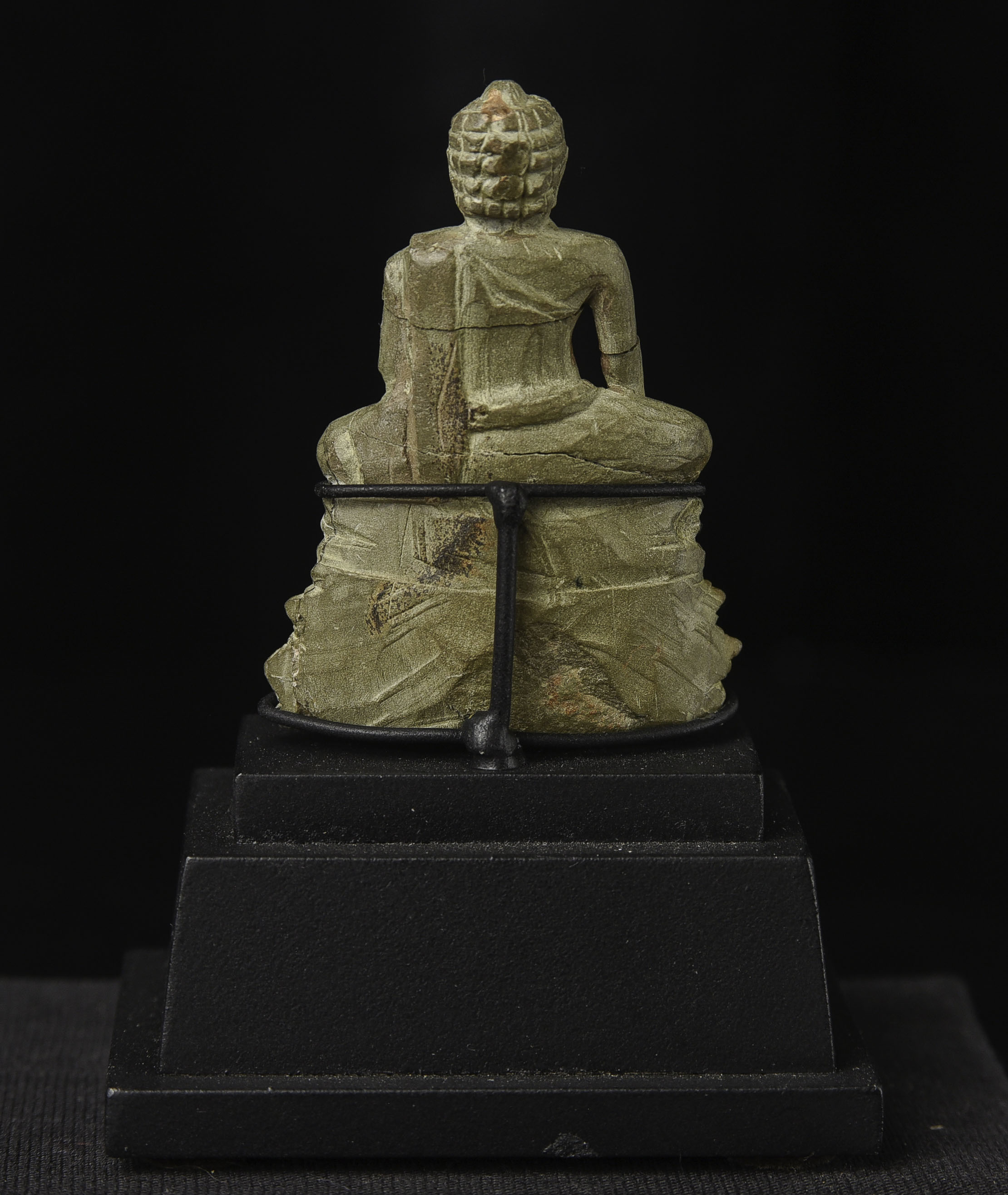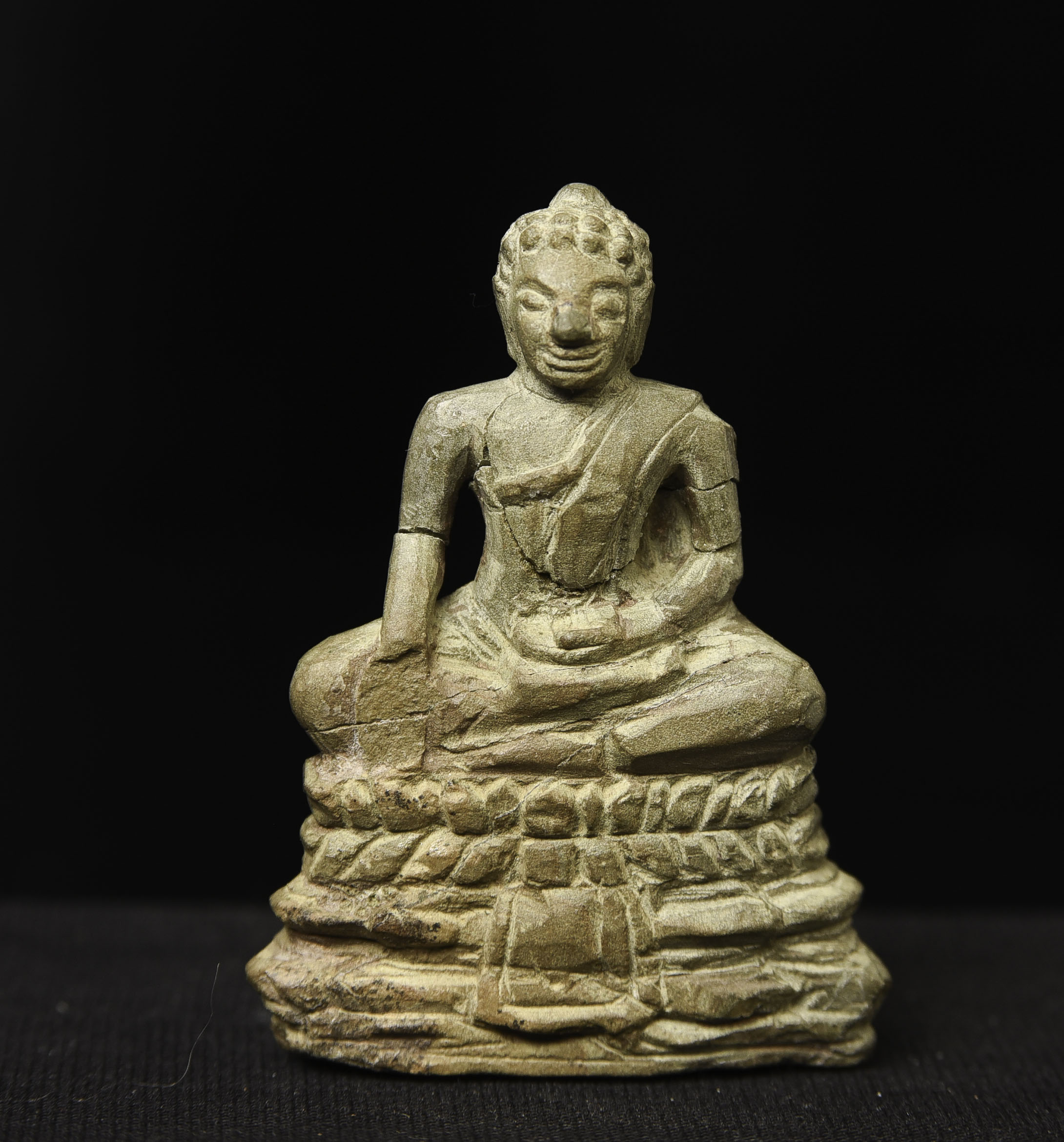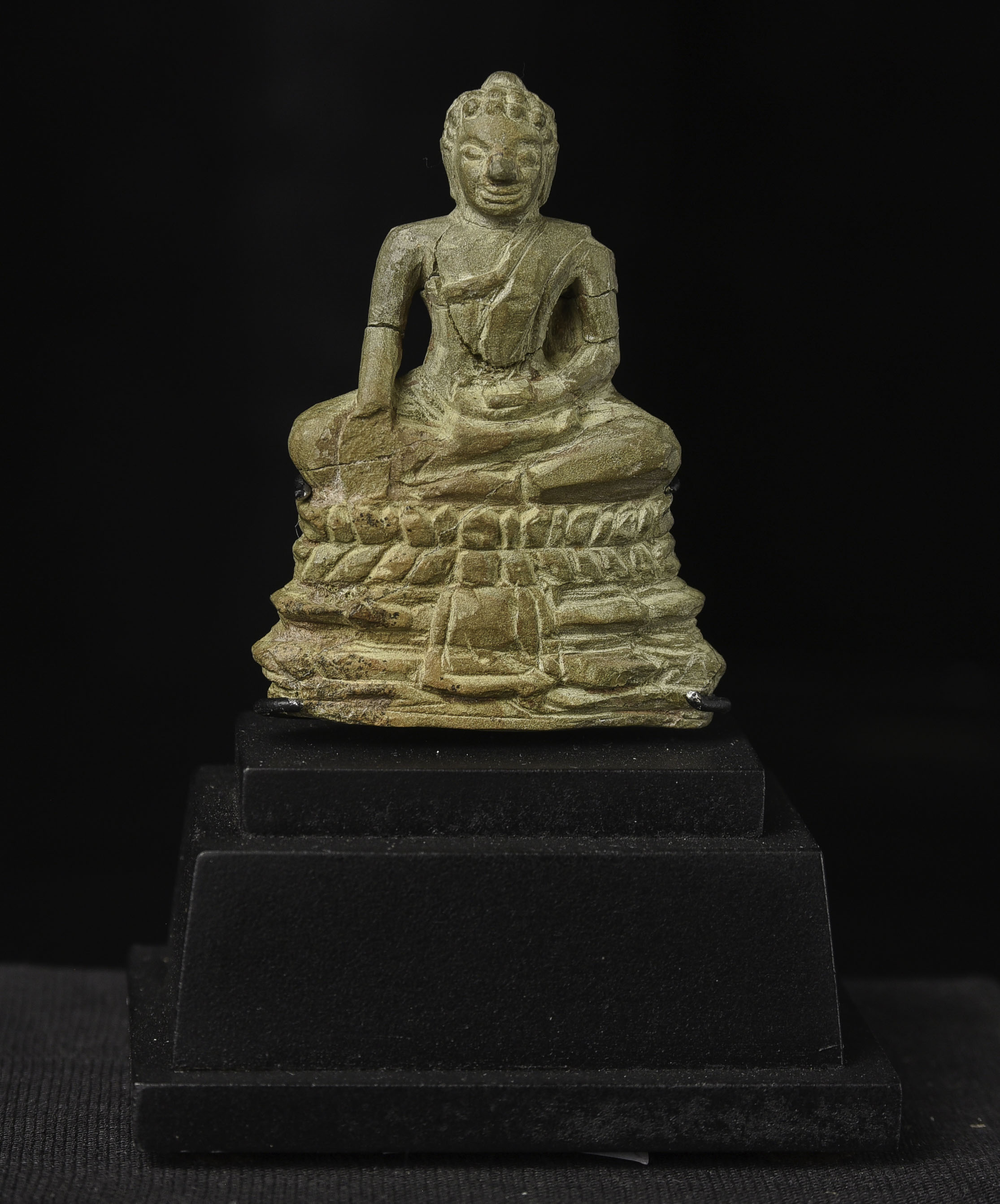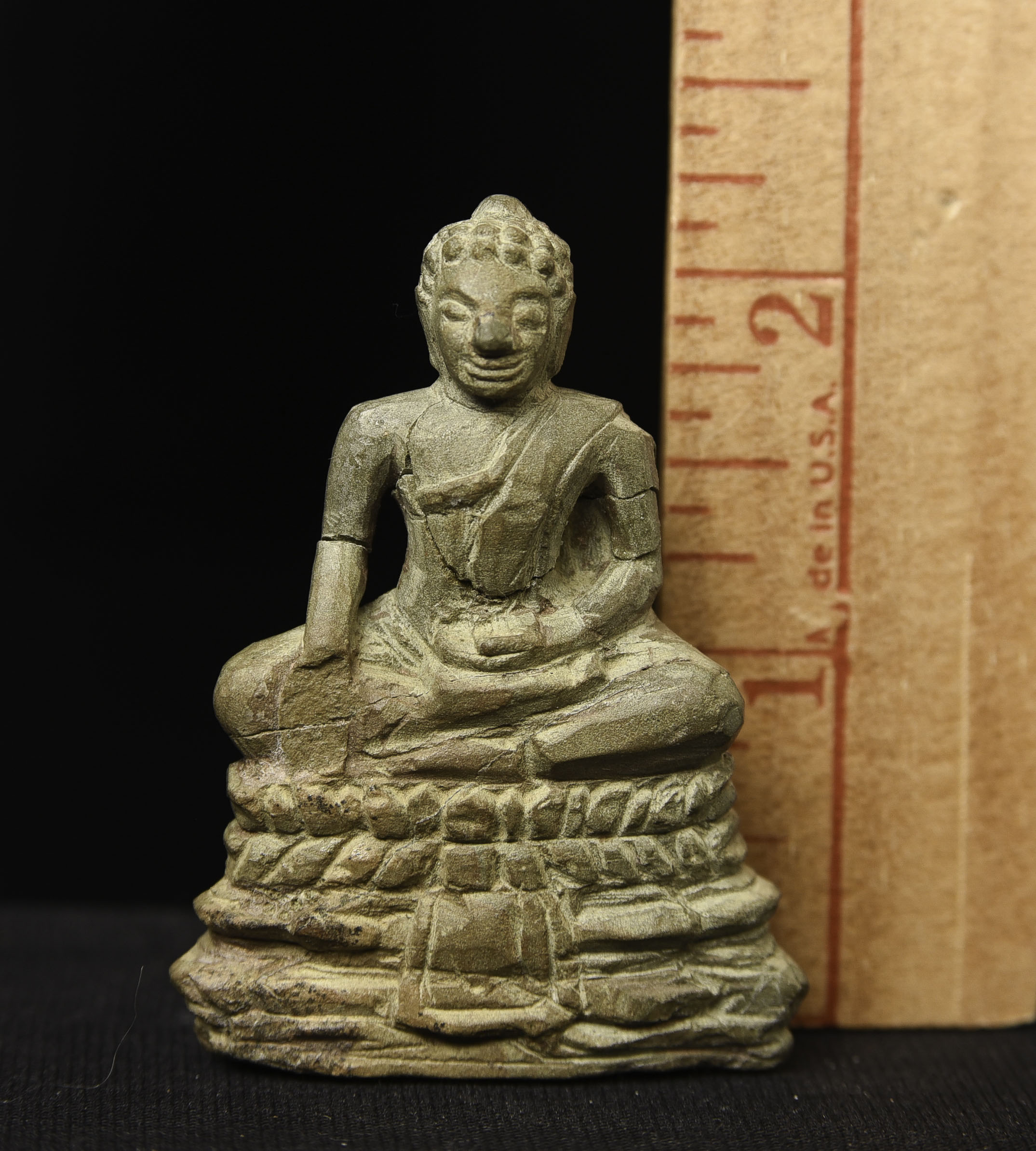 Very sweet small 17/18thC Cambodian stone Buddha. One hand is missing and the nose is repaired. Excavated by the previous owner's ancestors in 1912 in Cambodia, Great folk art. (2.25"H x 1.75"W) for the sculpture alone. Broken and repaired solid as seen. Also has a custom museum stand. Wonderfully expressive.