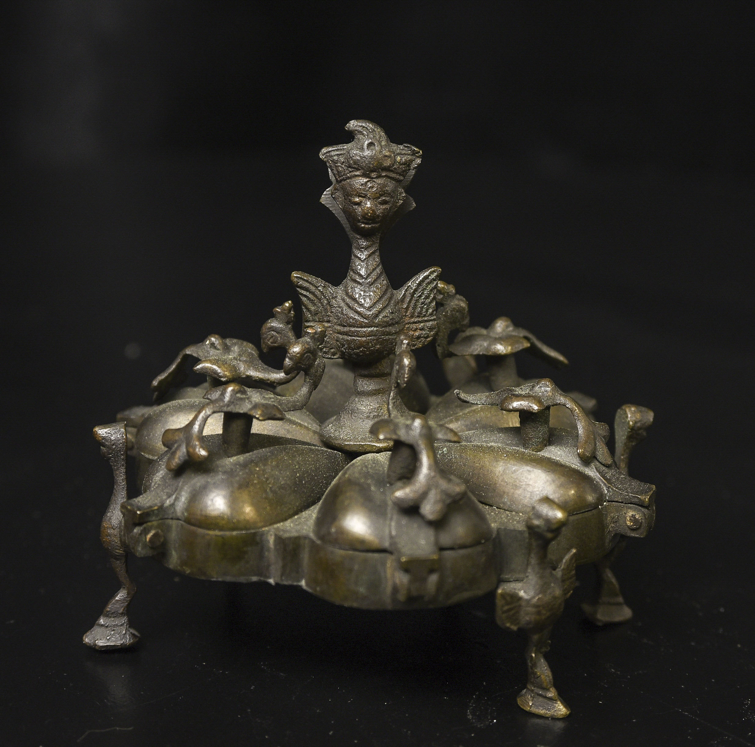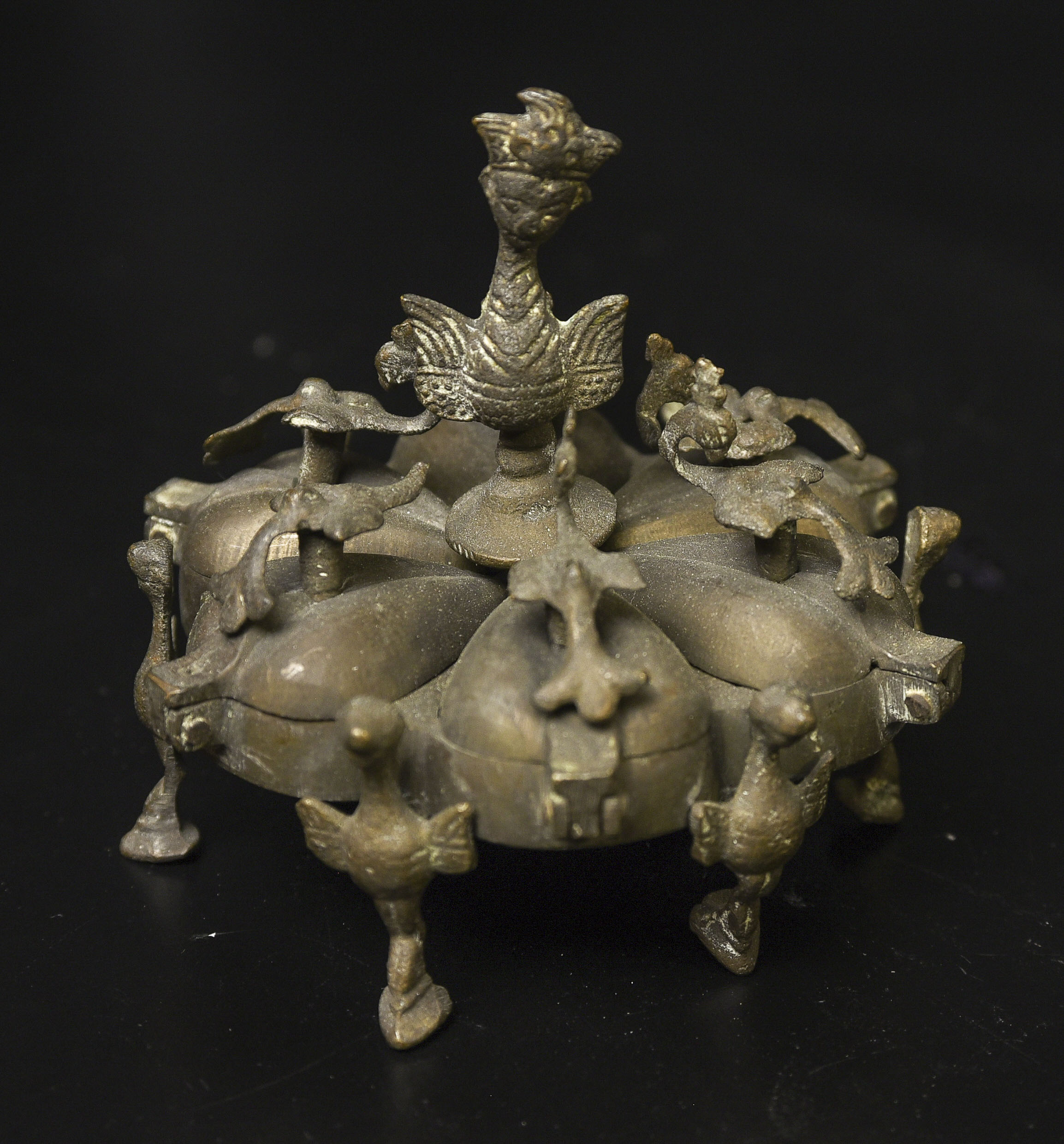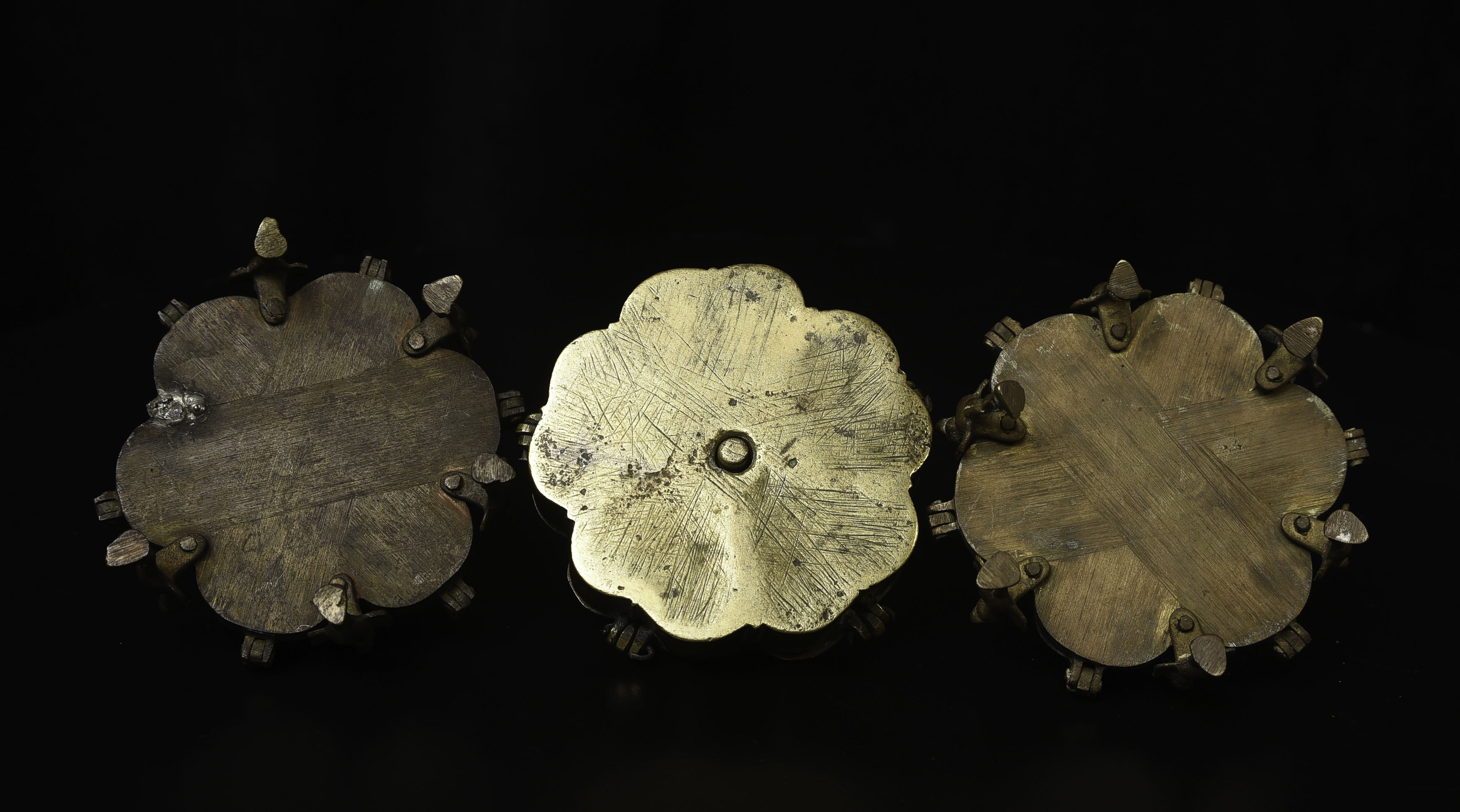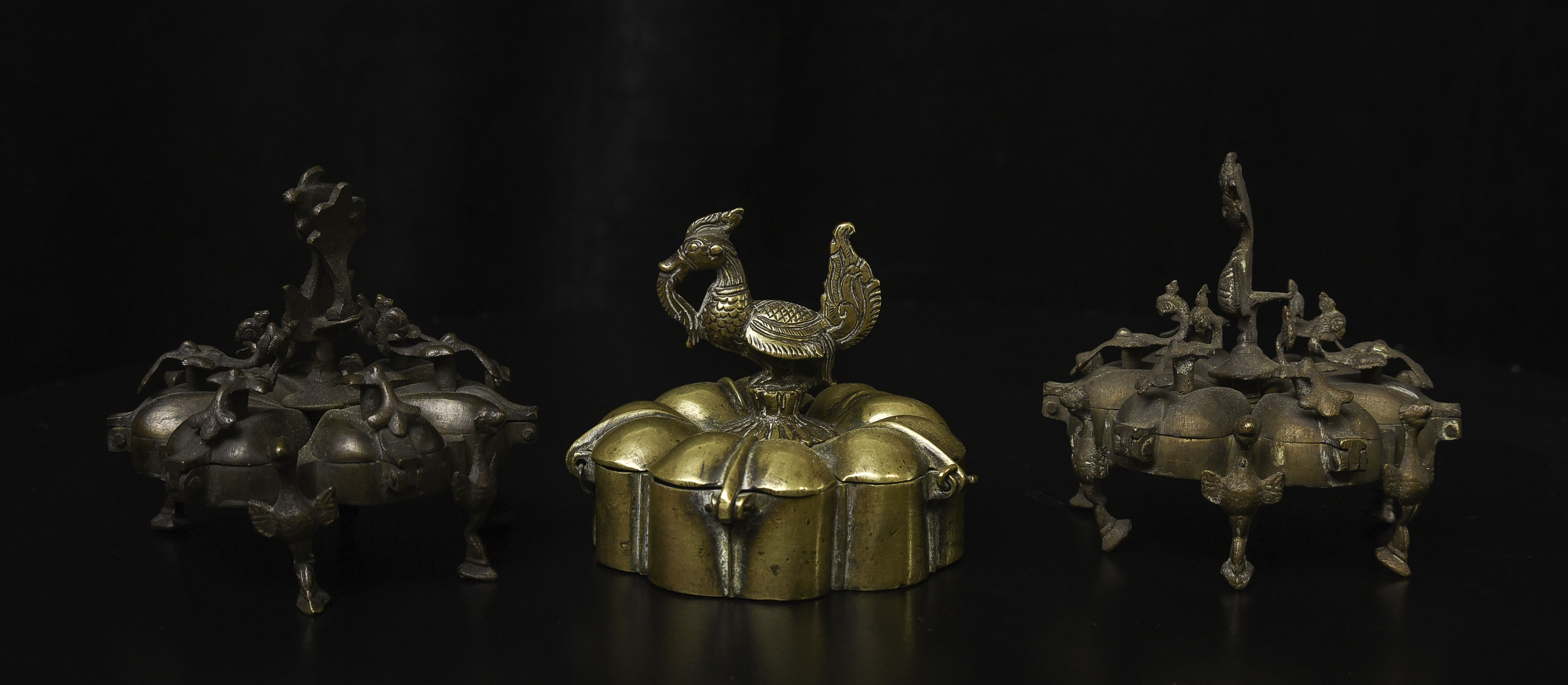 Three antique Indian bronze containers, each about 3" high, diameters of 3-1/8". Some losses as seen in the photos.