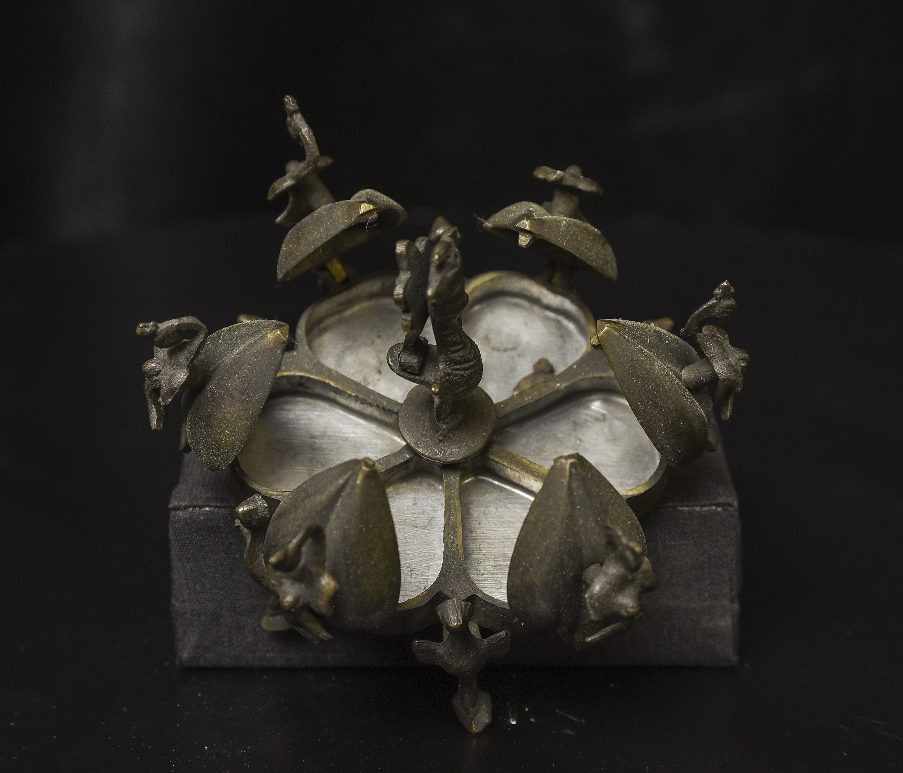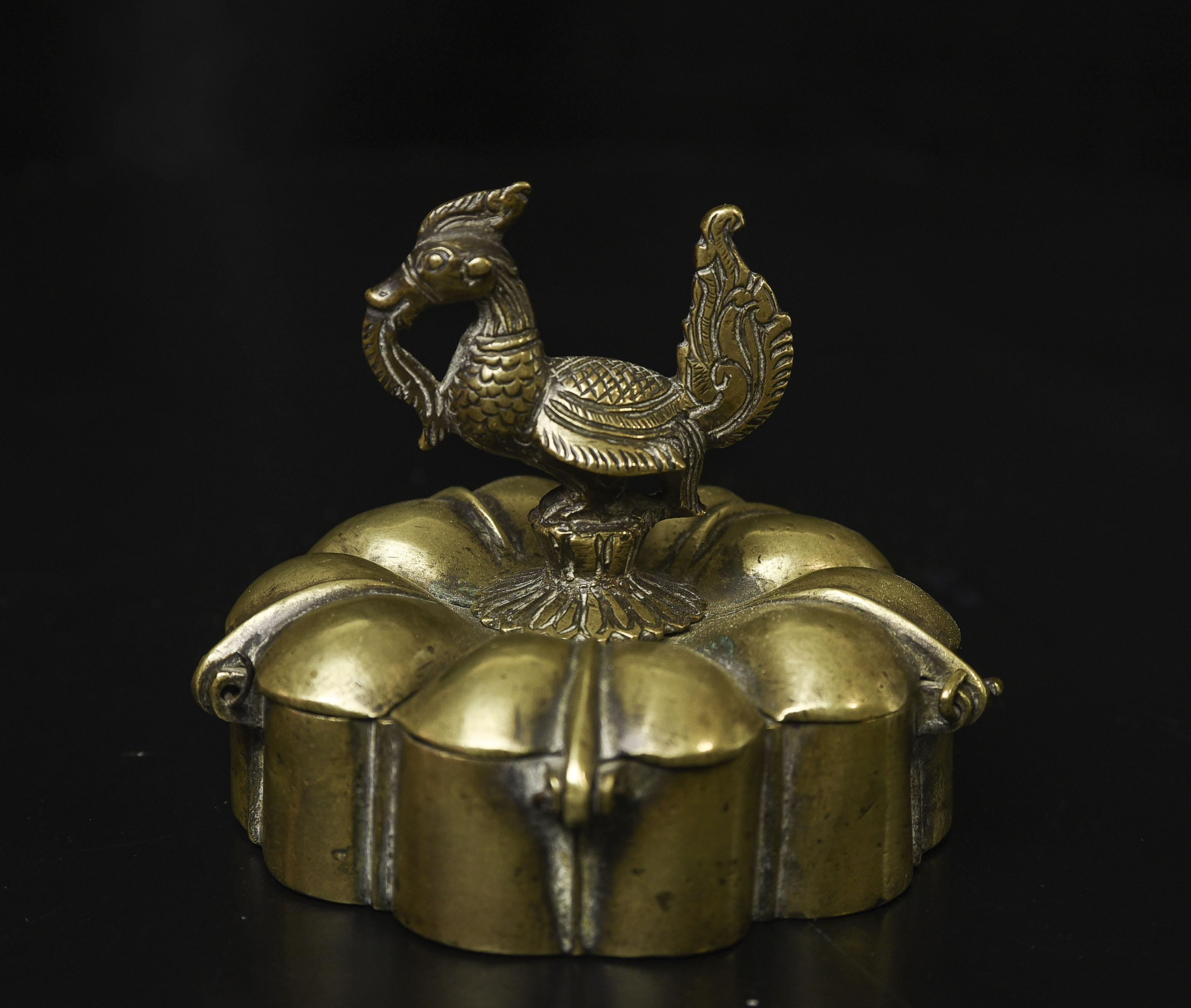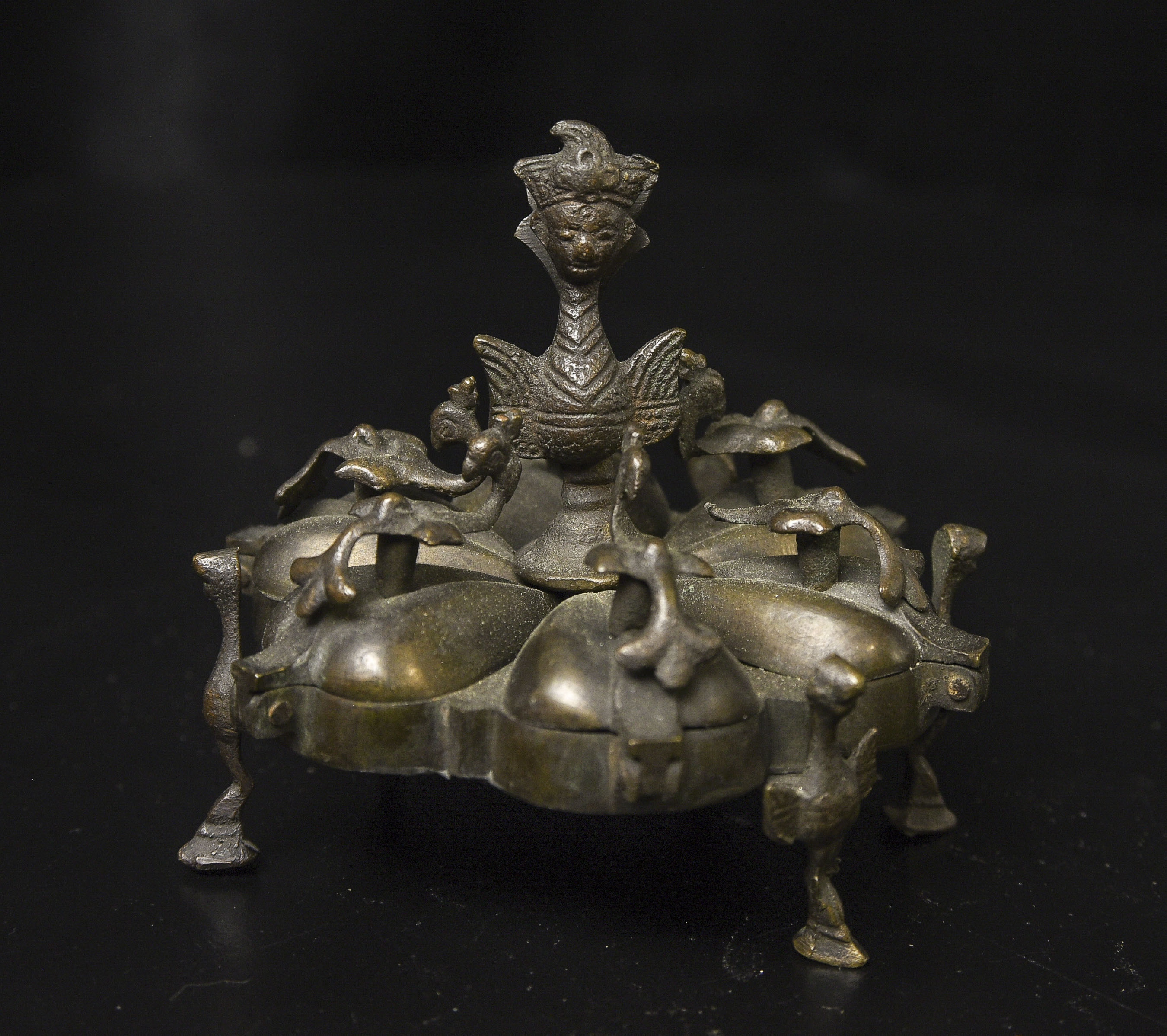 Three antique Indian bronze containers, each about 3" high, diameters of 3-1/8". Some losses as seen in the photos.