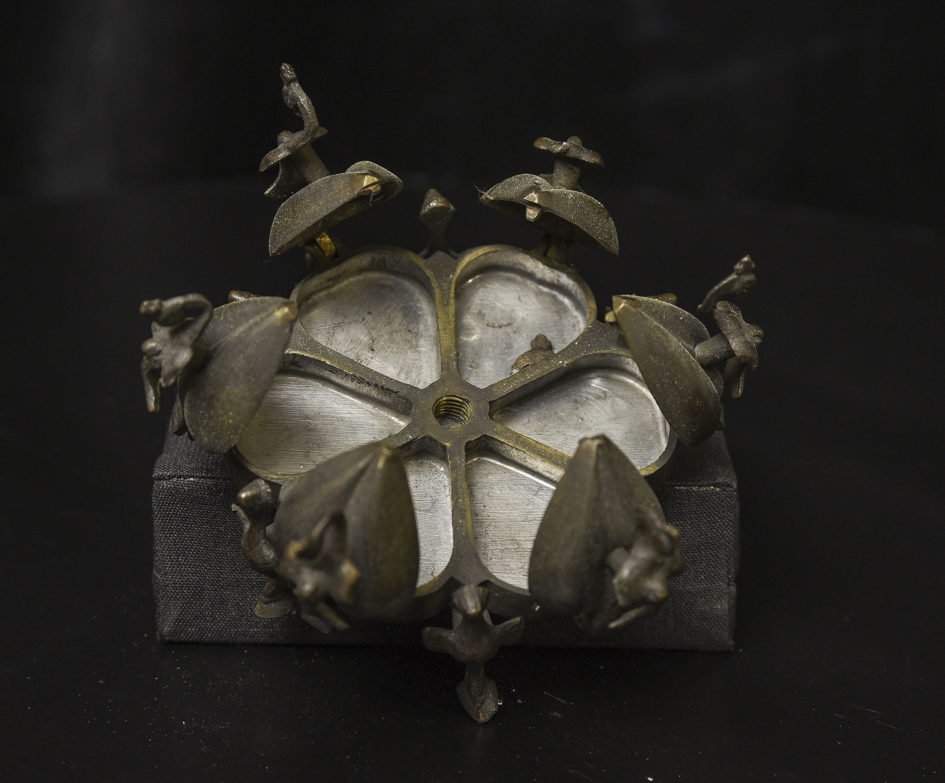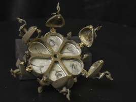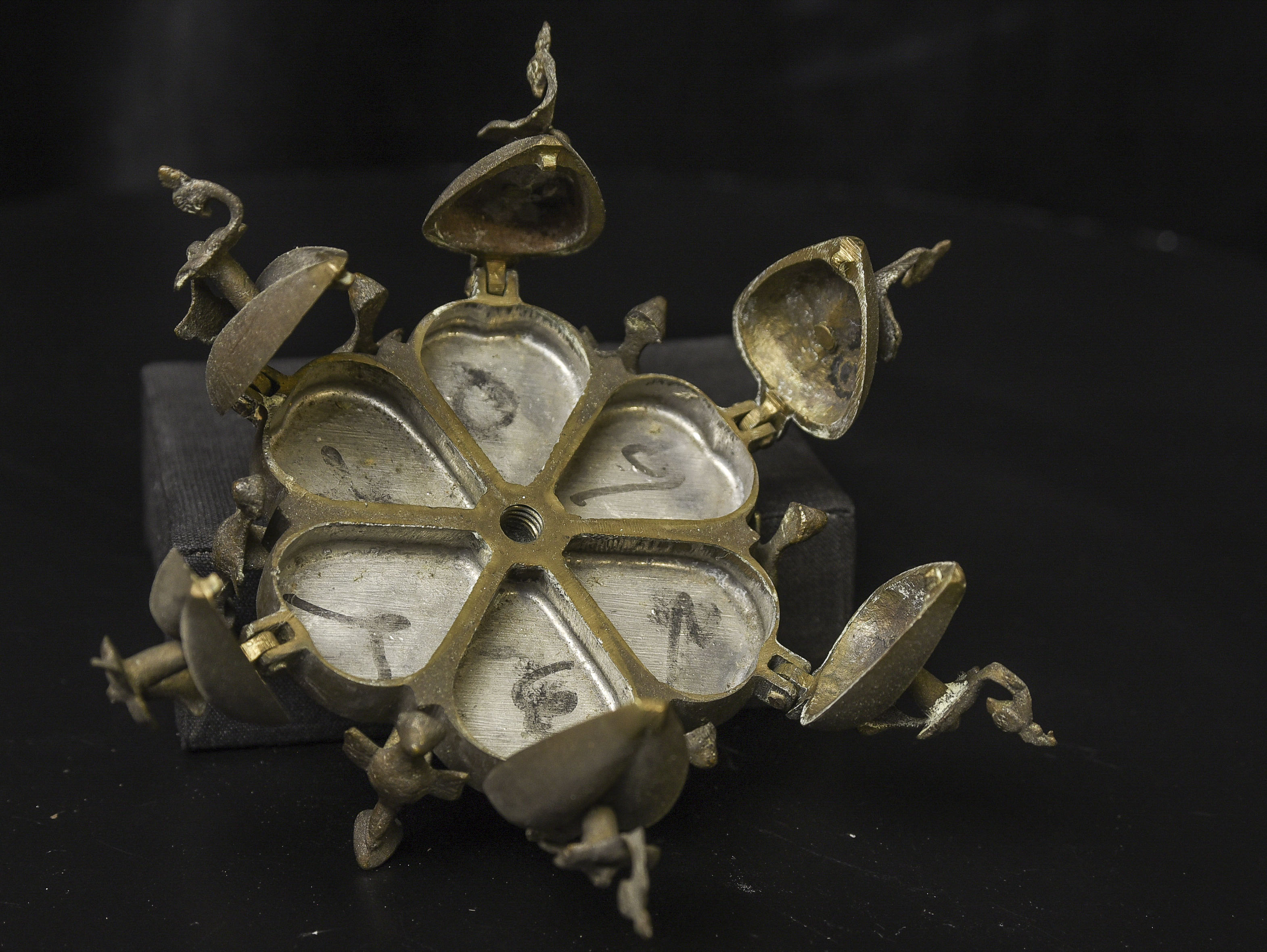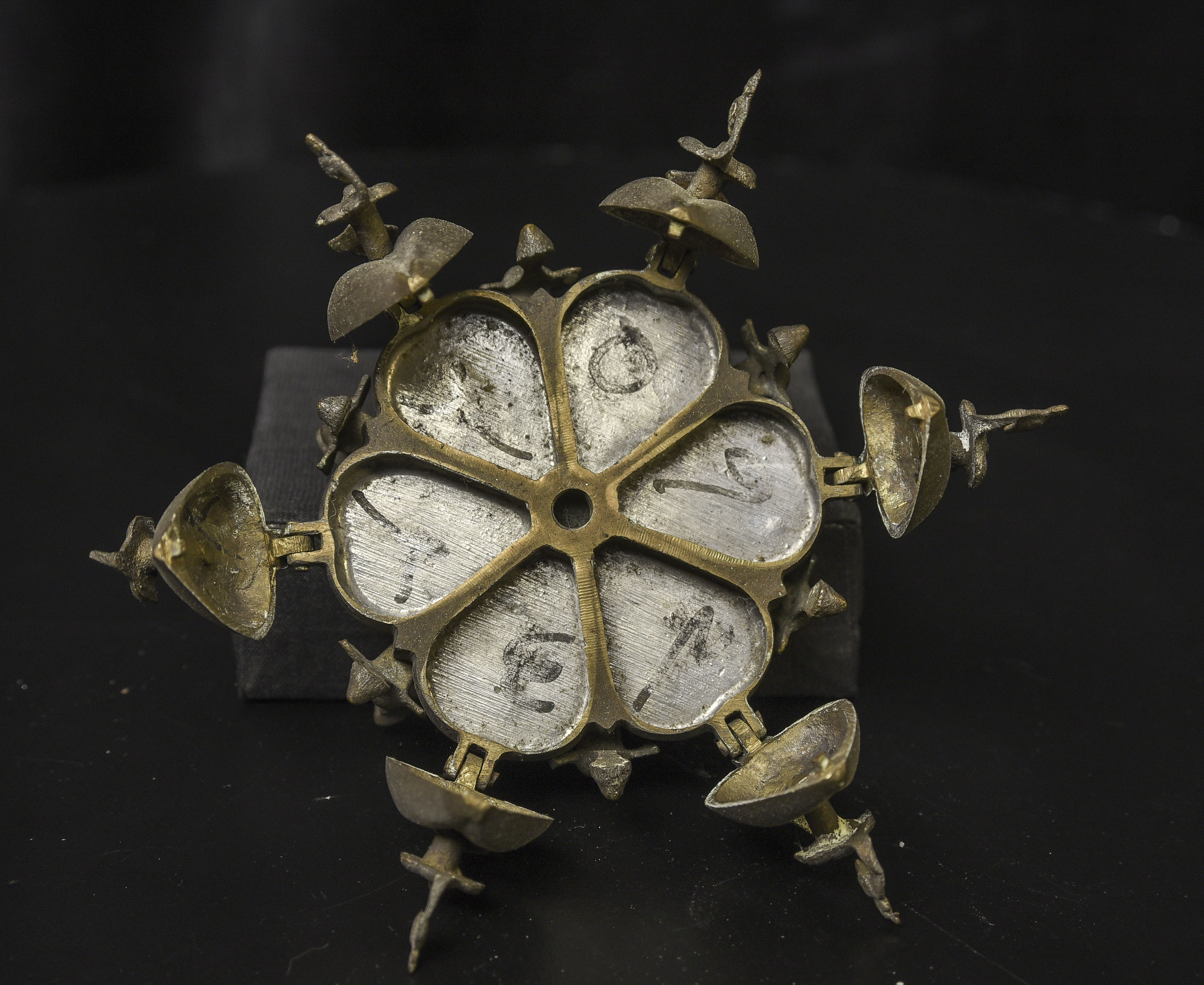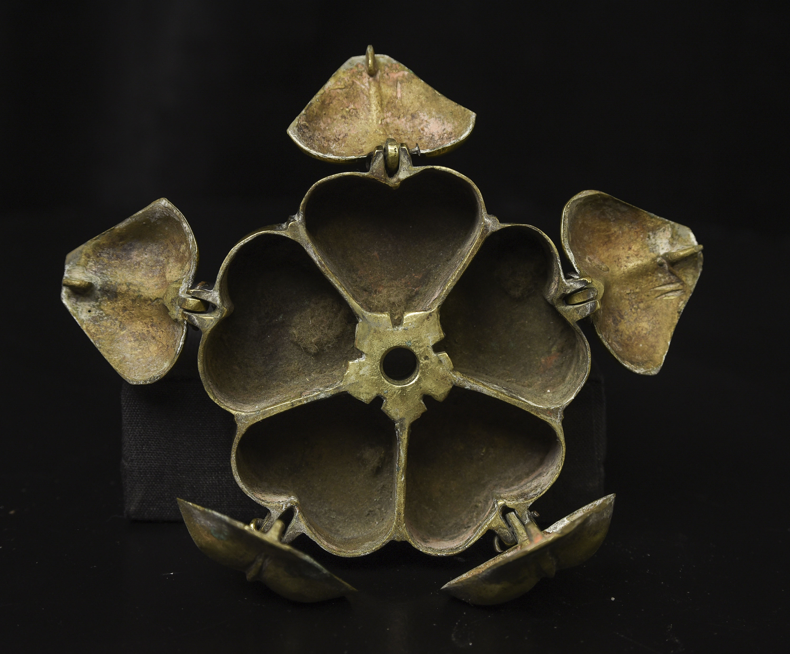 Three antique Indian bronze containers, each about 3" high, diameters of 3-1/8". Some losses as seen in the photos.