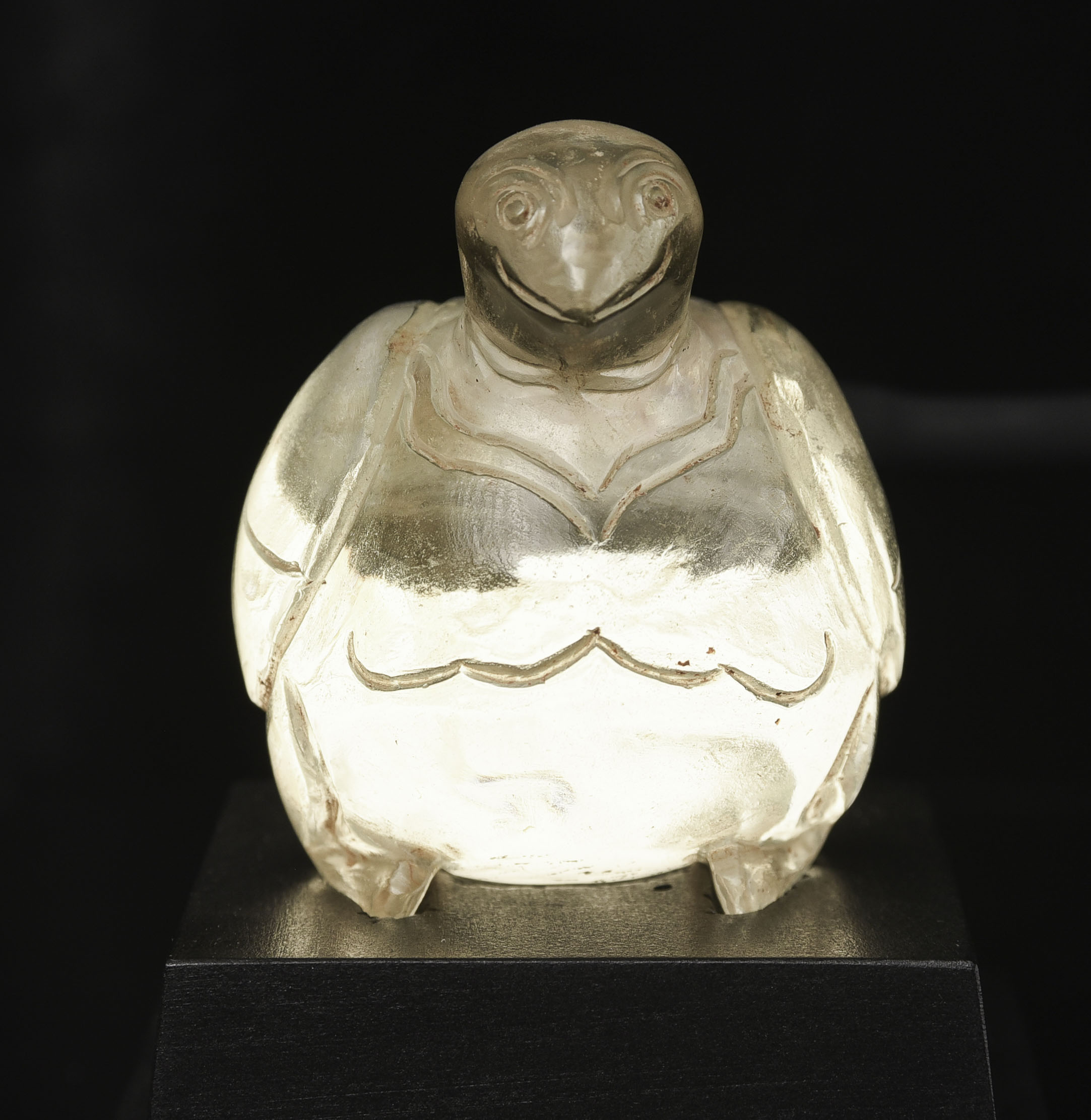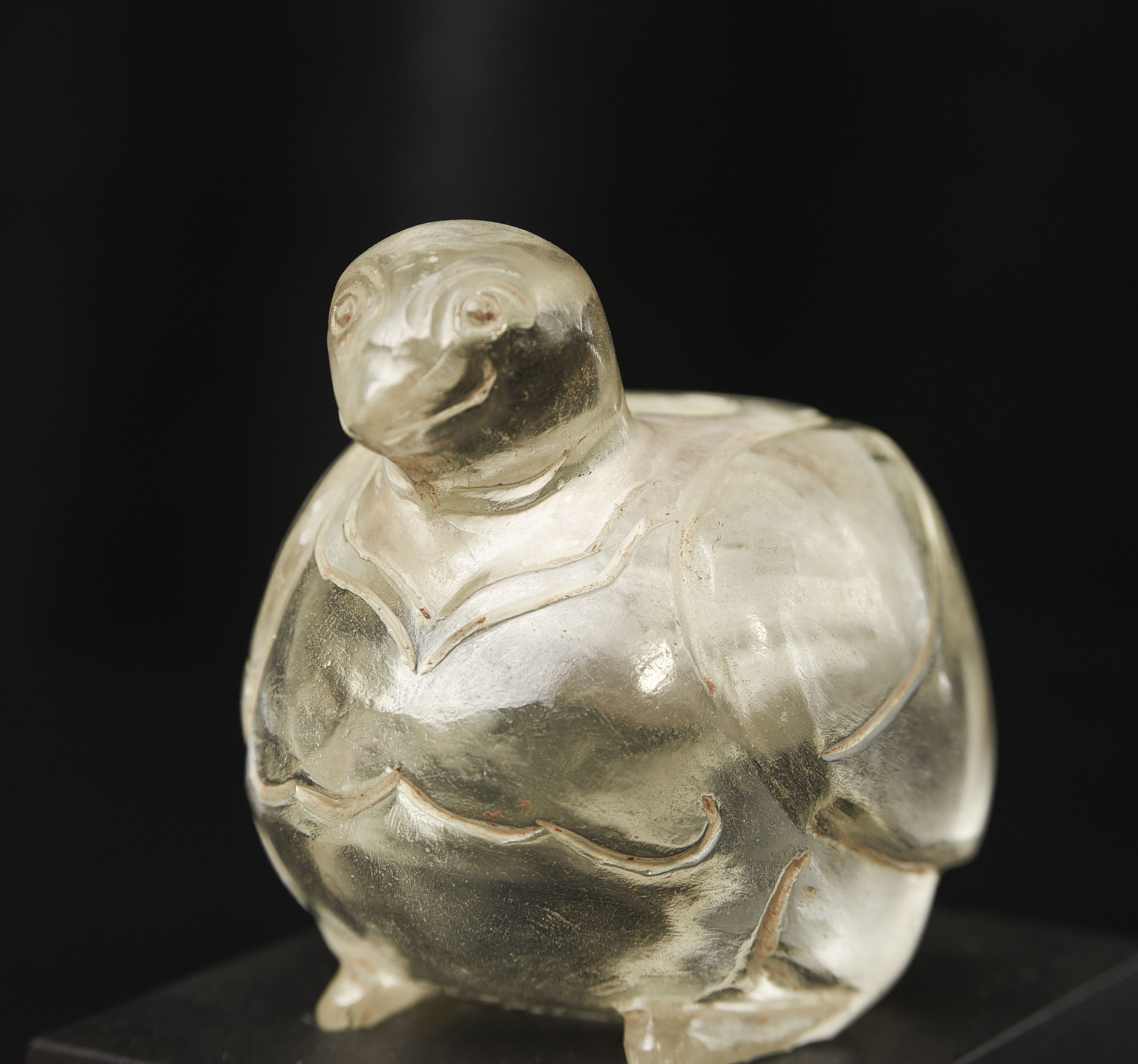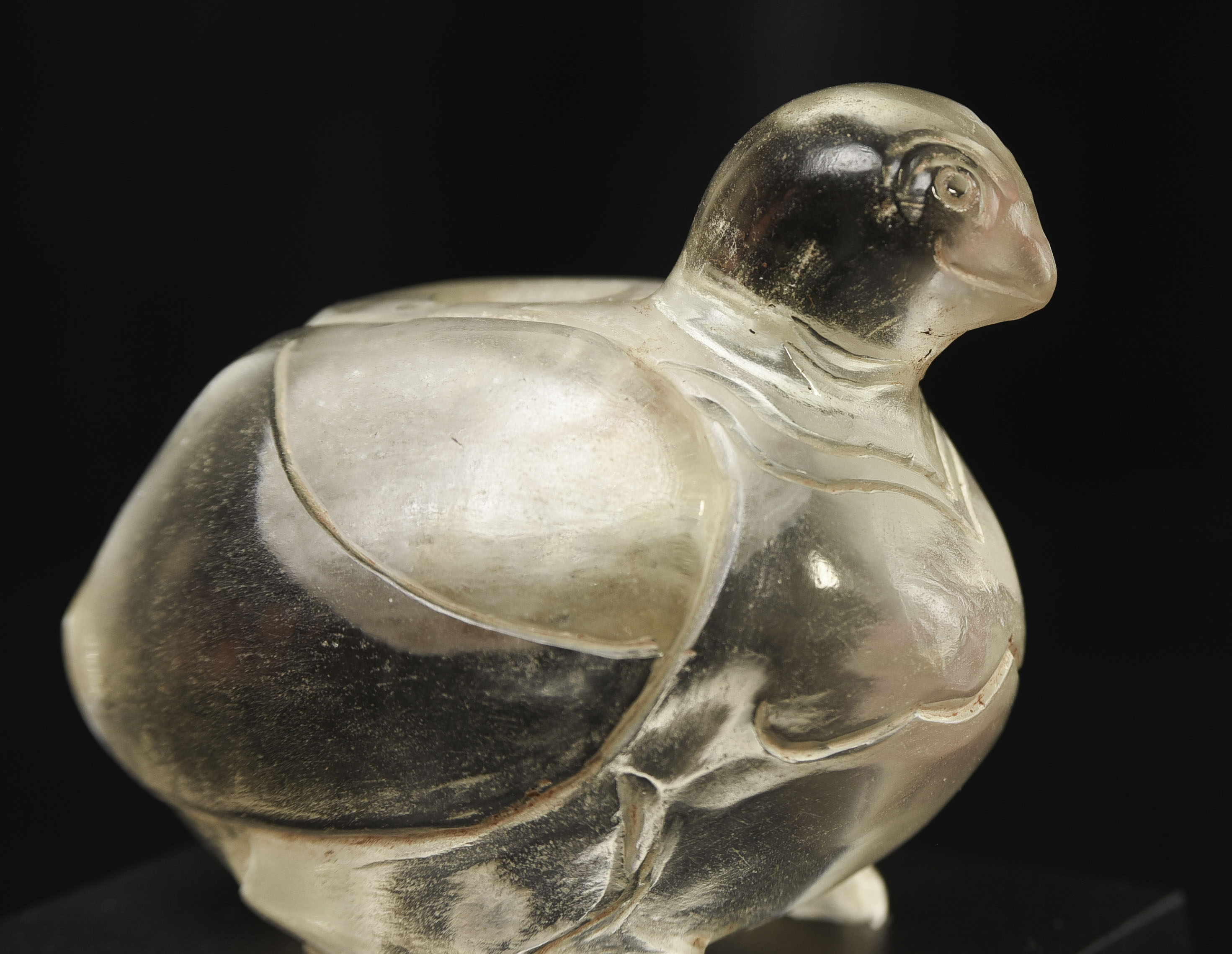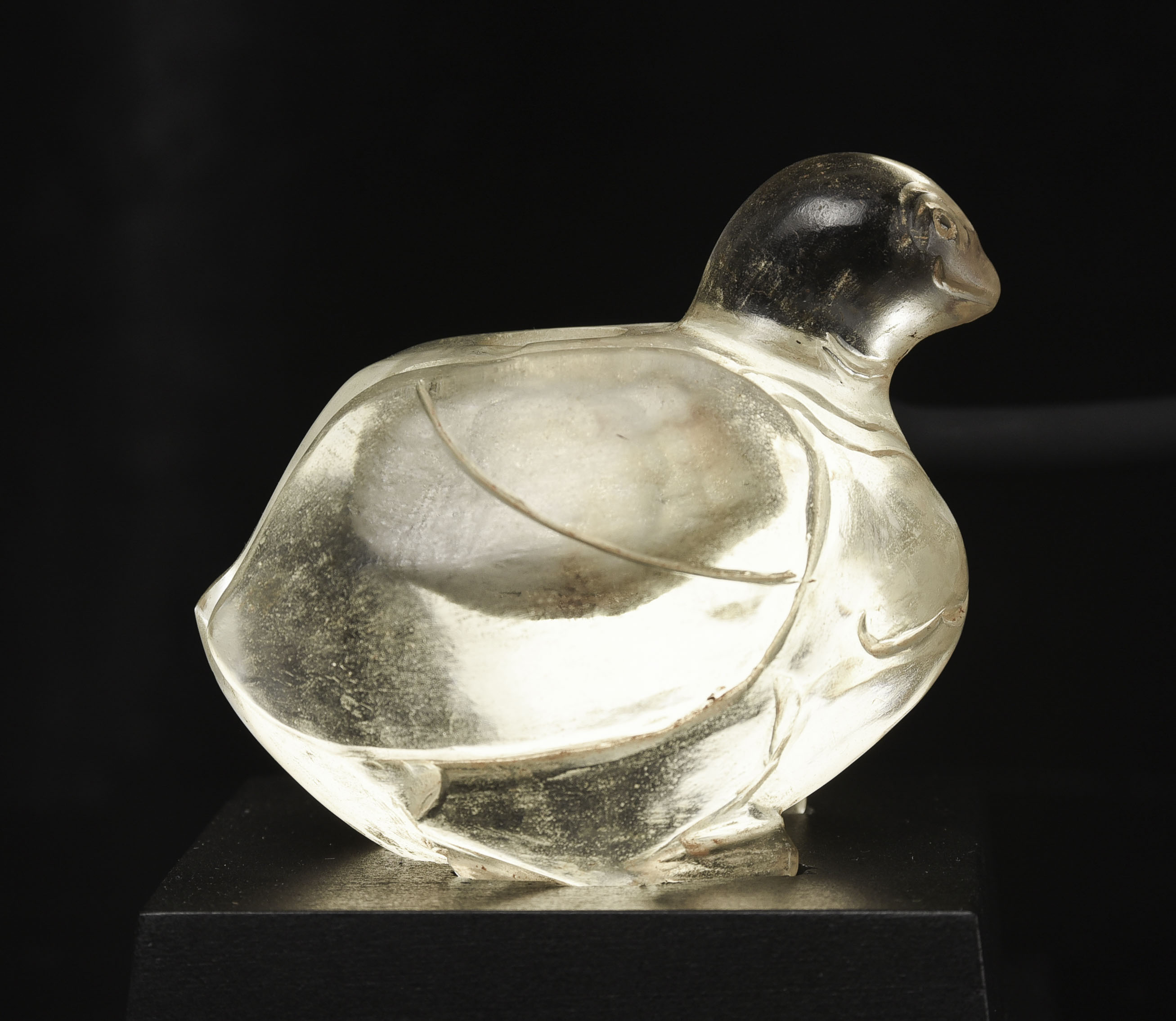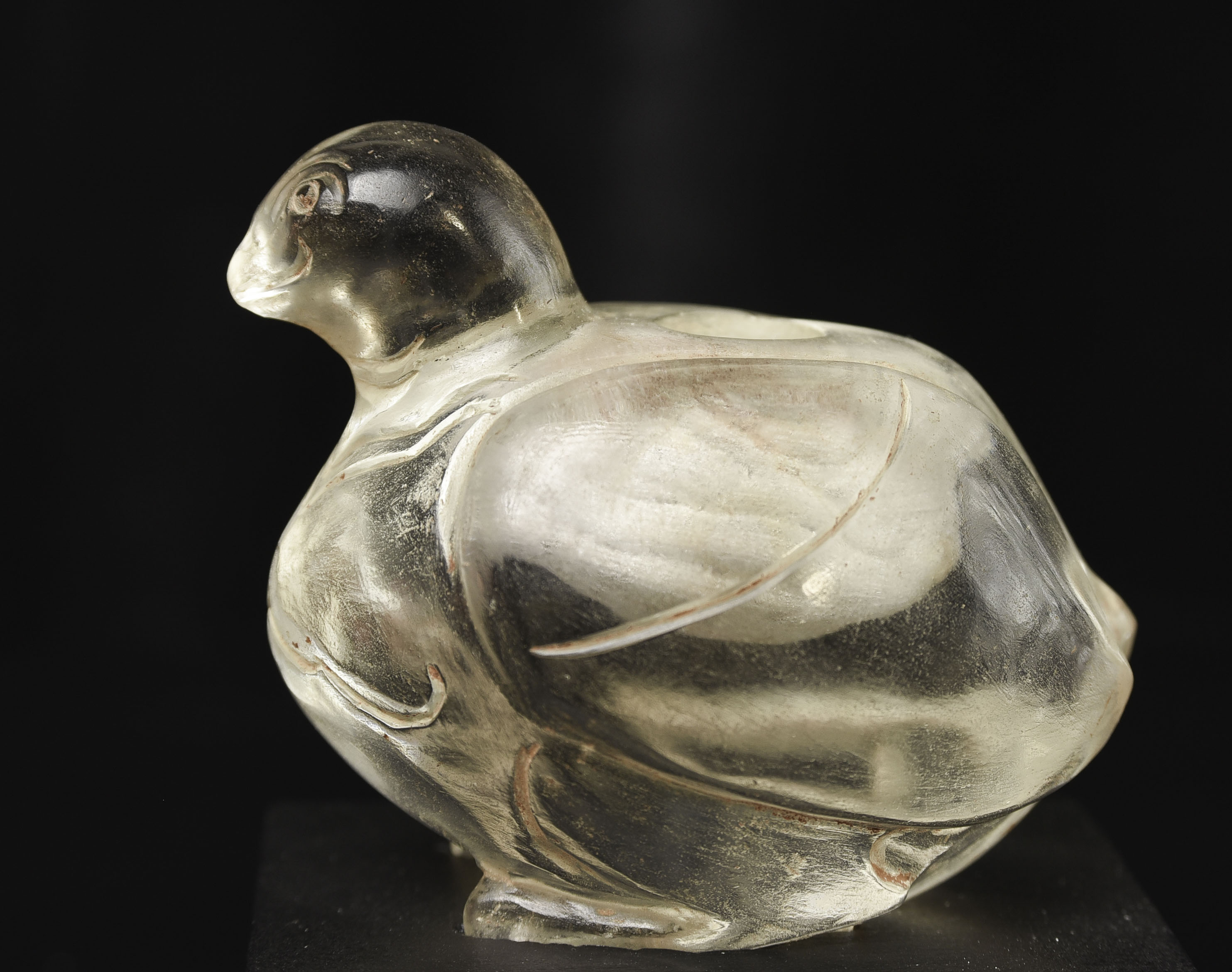 Very rare 16/17thC Bird-form crystal reliquary. Bird is 2 7/8 inches tall, 3 1/2 inches long, and 2 1/2 inches wide. The height on its custom stand is 4 3/8 inches. 345g. Excavated in North Thailand in the Hod district in the 1960s when a reservoir was going in and ancient temple ruins were being flooded. Originally would have had a gold top. Museum piece. Heavy. Carved with early tools From a world-class multi-generation collection of Thai antique Buddhist quartz crystal. The collection had to be partly sold off in the late 1990s due to the financial slowdown. I bought several-this is one of two I still have in my collection. 345g