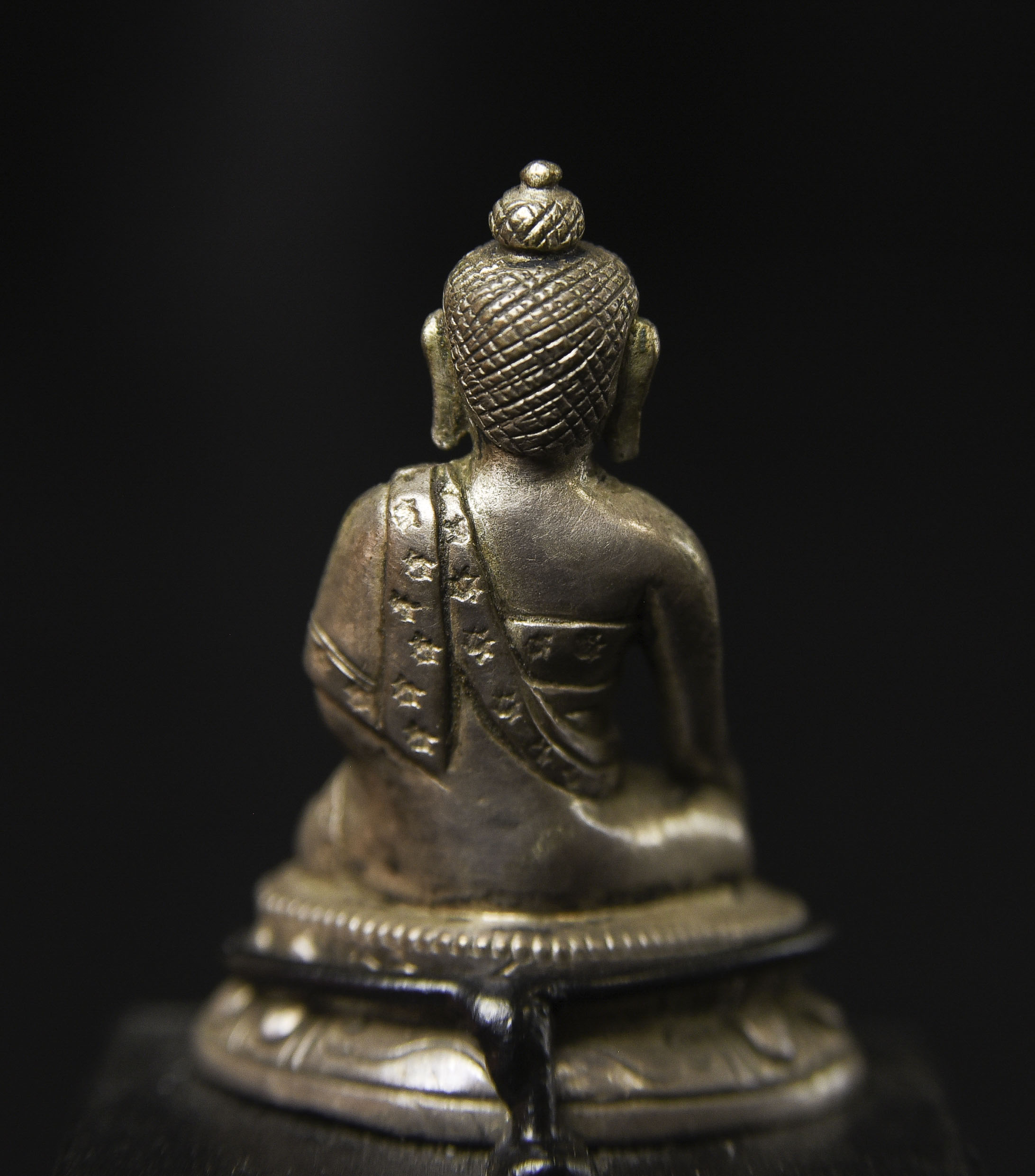 Very rare consecrated 18/19th Sino-Tibetan silver, miniature Buddha. Extremely well-sculpted and cast in nearly pure silver. Very few of this type exist, especially in this quality and material. 1 3/8 inches tall, 2 1/8 inches on a custom stand. From a San Francisco-based collection put together in the 1970s by a wealthy Japanese collector.