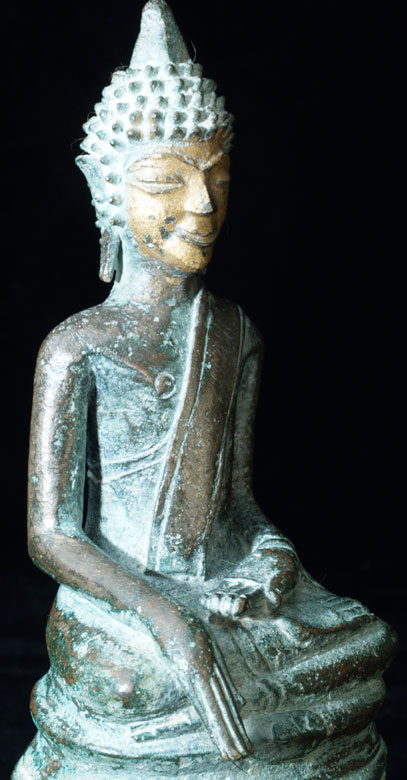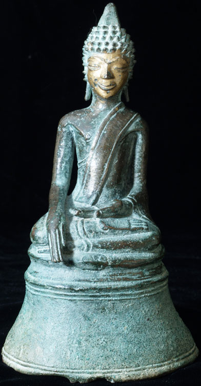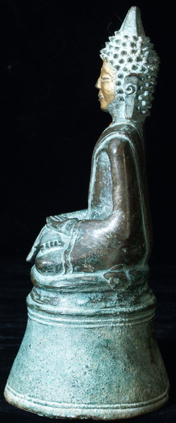 This is a very fine Laos Buddha with a gilded face. The overall form of the piece (from the bottom of the base to the top of the finial) is sculpturally balances in a beautiful way. The casting (features, fingers etc.) are much finer than on most Lao Buddhas. And finally, the face is quite special as can be seen in the photos (the photos are a little washed out- he looks better in person). He sits 6 inches tall.