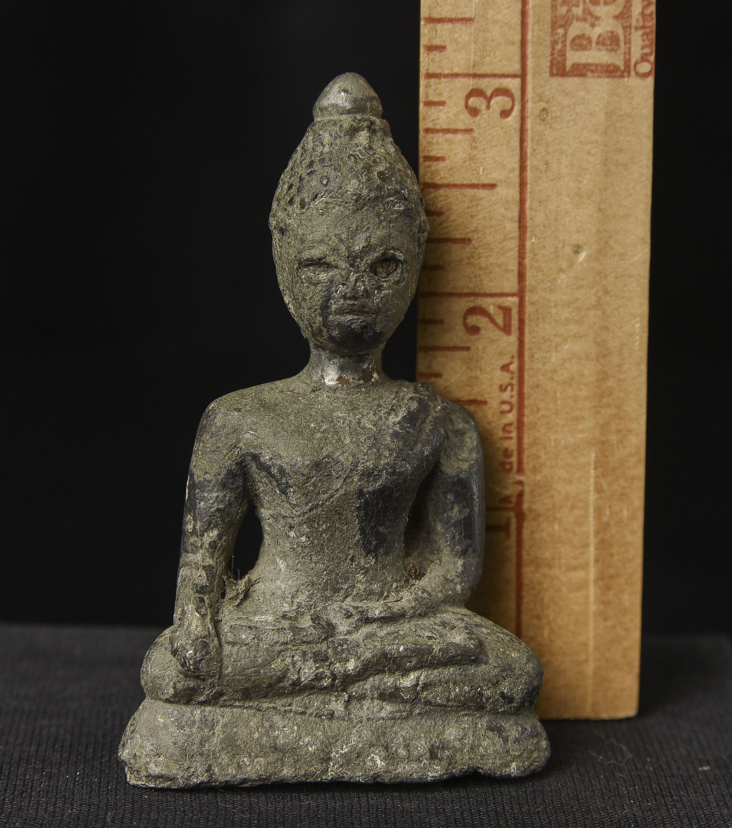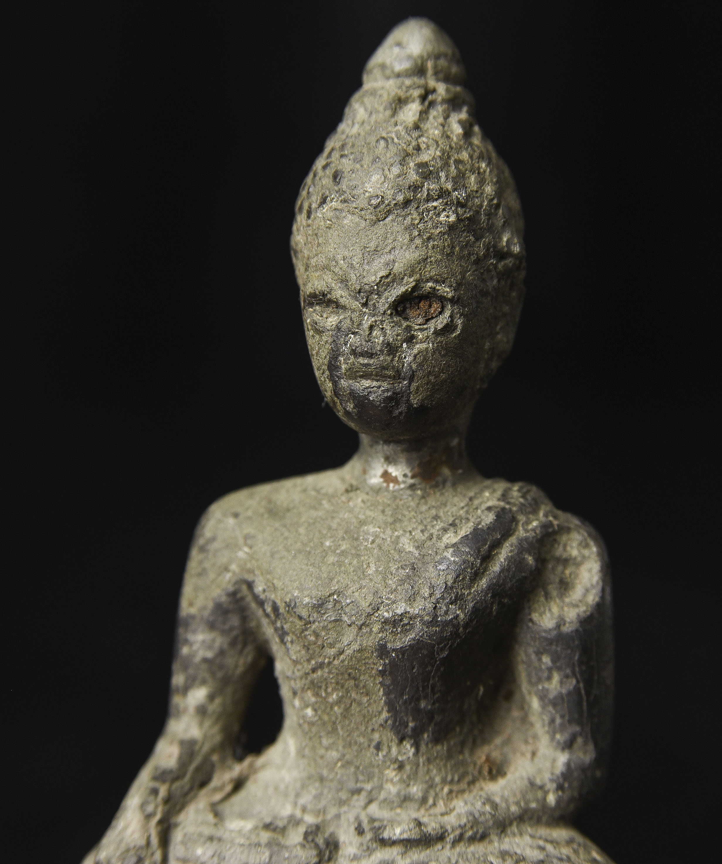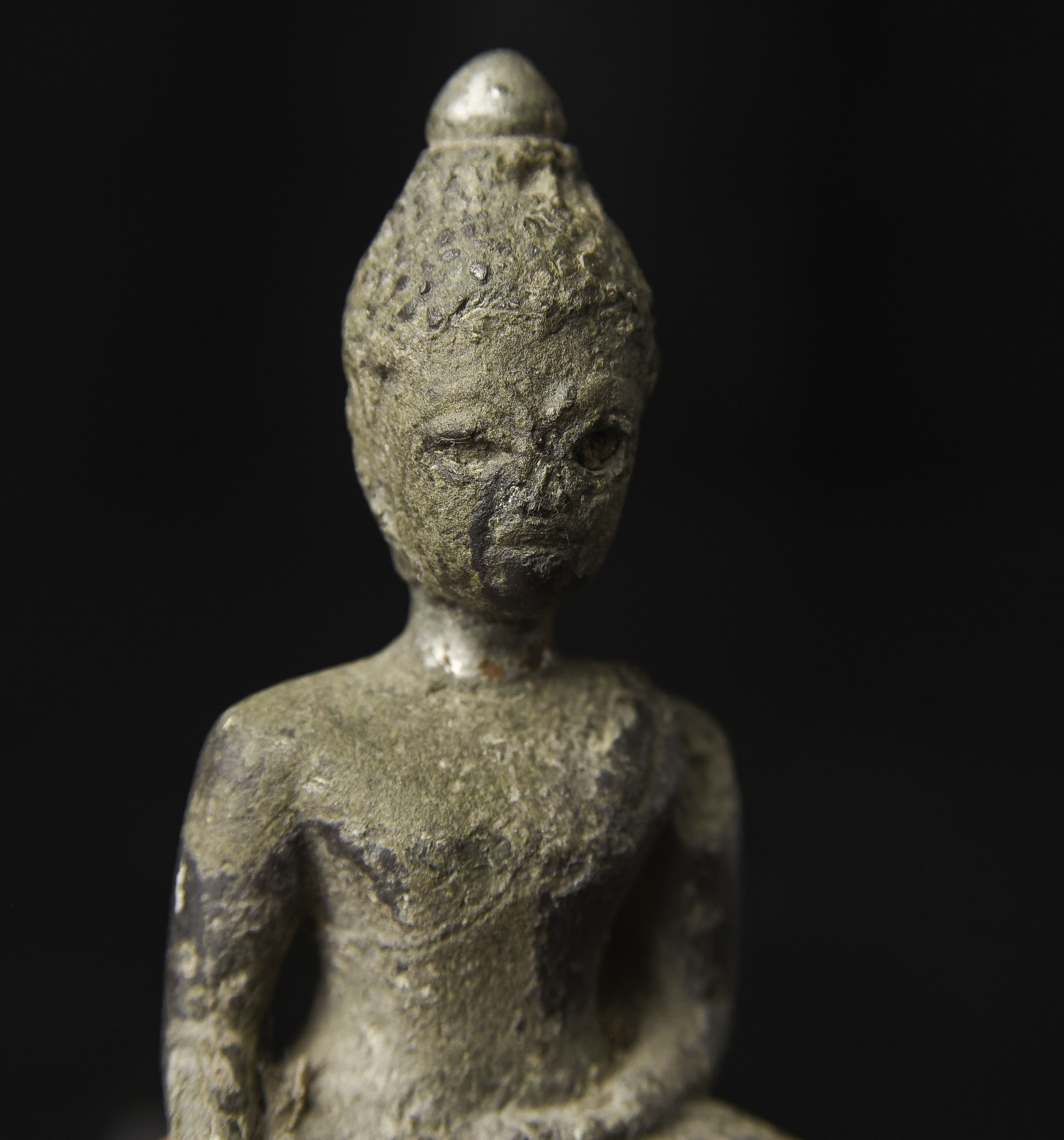 Mysteries early SE Asian Buddha, cast of a lead alloy, plus possibly silver. My guess is 14thC Northern Thailand from the ancient kingdom of Fang. The head may be made separately and added afterward, as they were joined. Haunting face. 3" tall. Domestic shipping is included. International shipping will be $35, including packing, shipping and insurance.