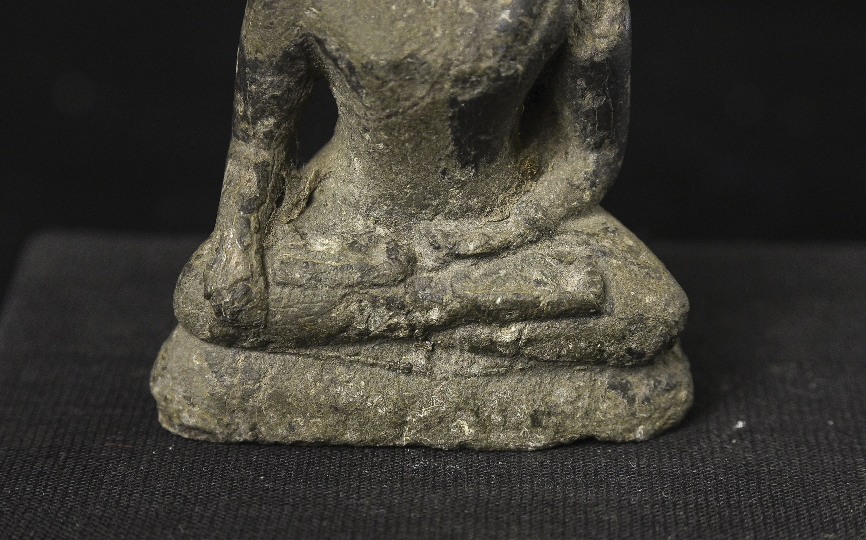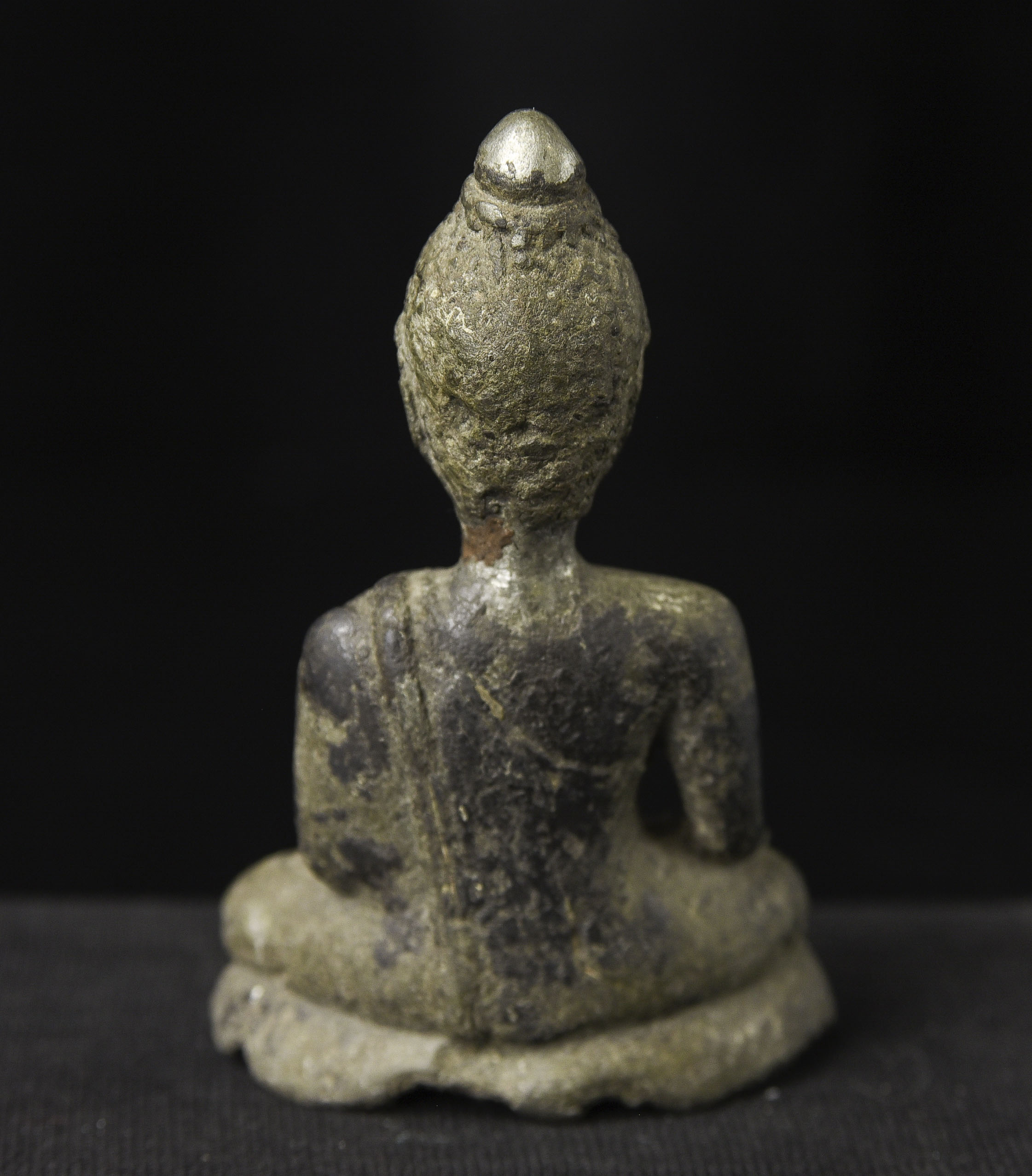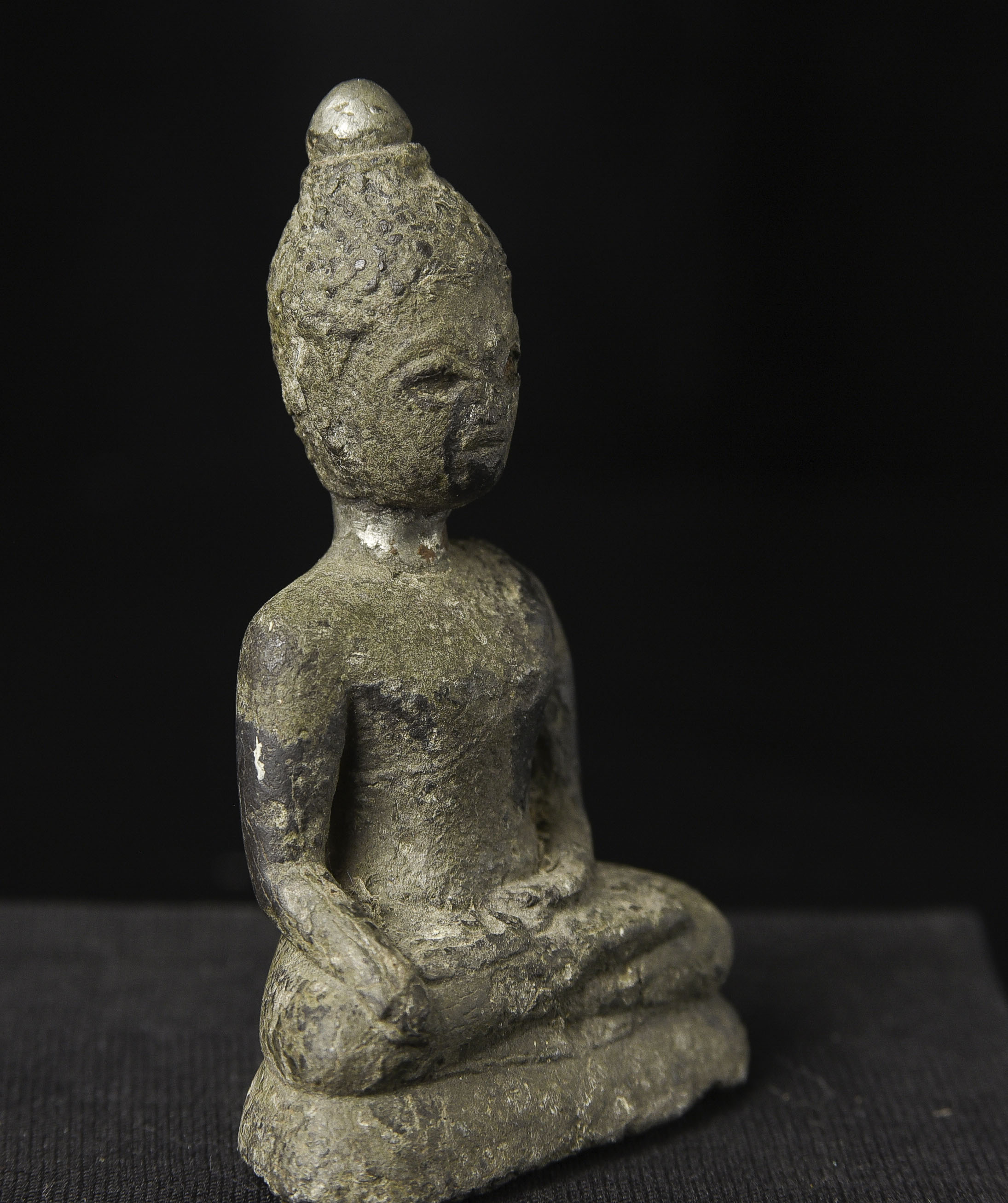 Mysteries early SE Asian Buddha, cast of a lead alloy, plus possibly silver. My guess is 14thC Northern Thailand from the ancient kingdom of Fang. The head may be made separately and added afterward, as they were joined. Haunting face. 3" tall. Domestic shipping is included. International shipping will be $35, including packing, shipping and insurance.