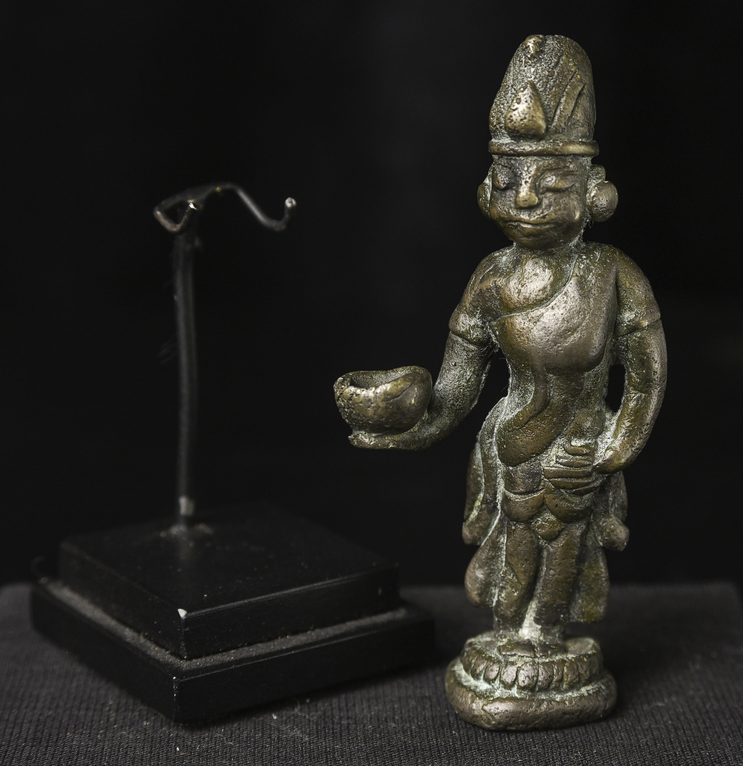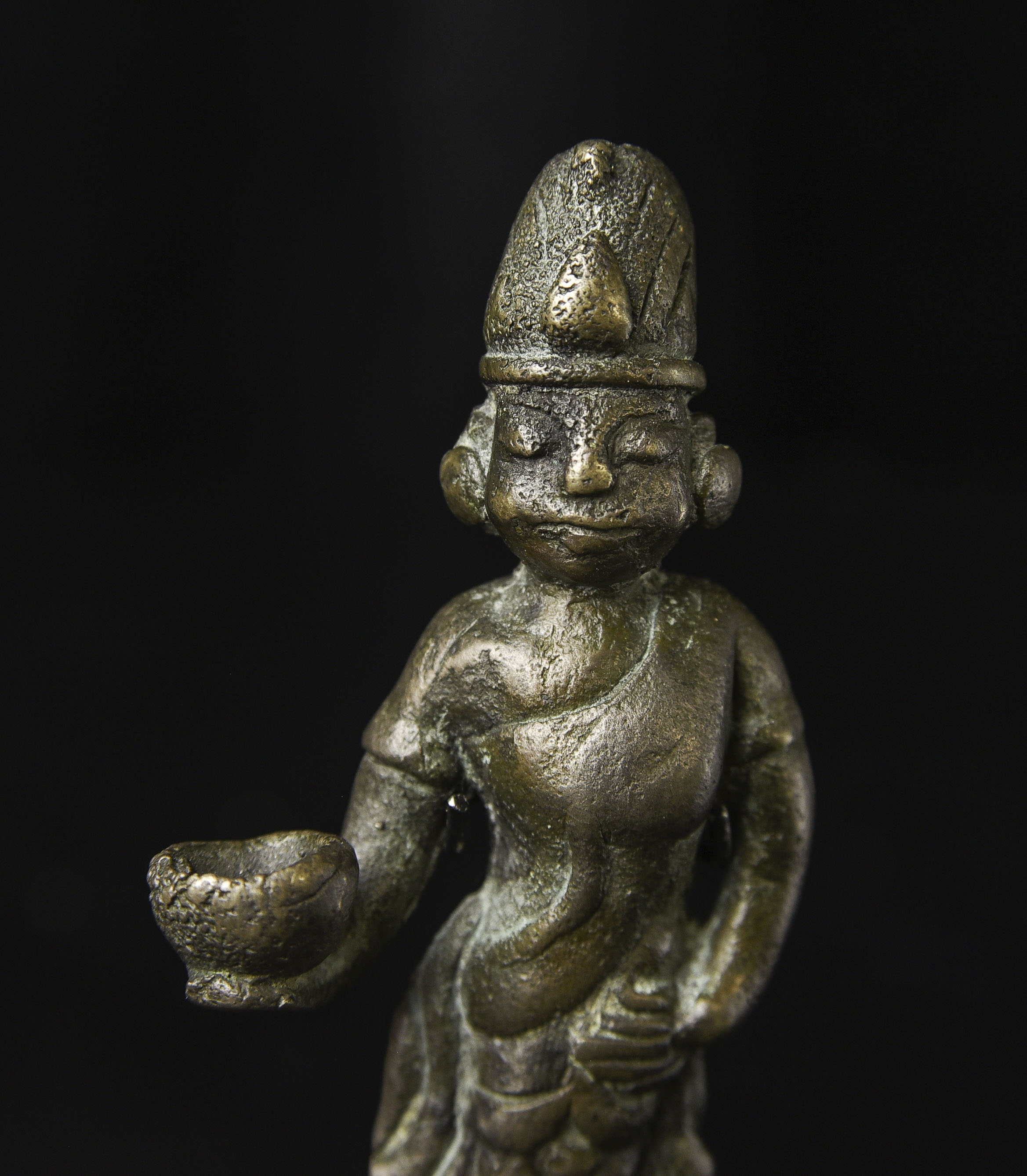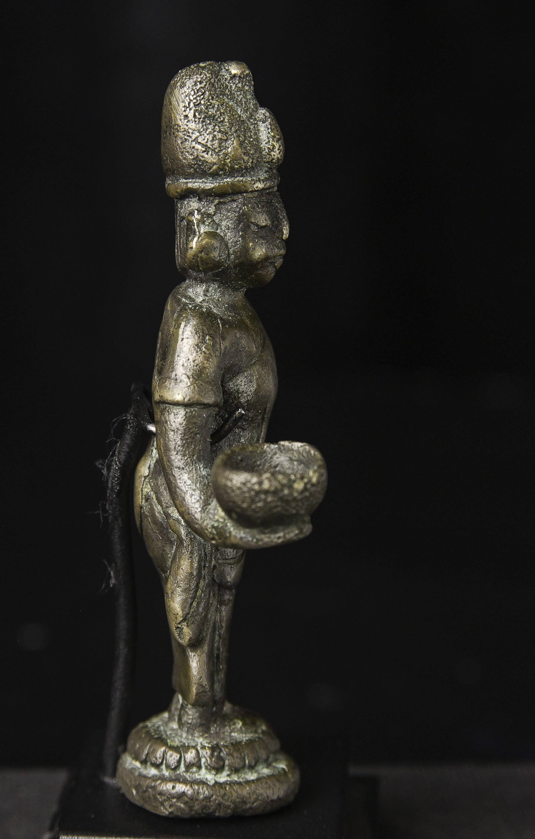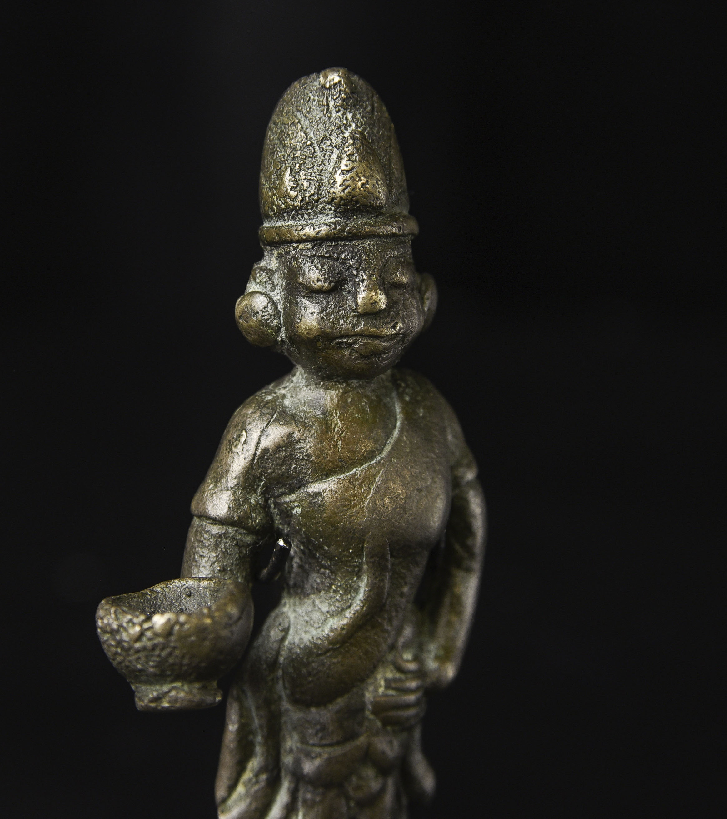 Solid cast bronze wearing Burmese palace clothes, possibly signifying royal character with an offering bowl. Looks to be a pre pagan piece, and 1,000 plus years old. A personal favorite for 30 years. Stands 3.25 inches tall, 3 5/8 on a custom stand. Very rare type.